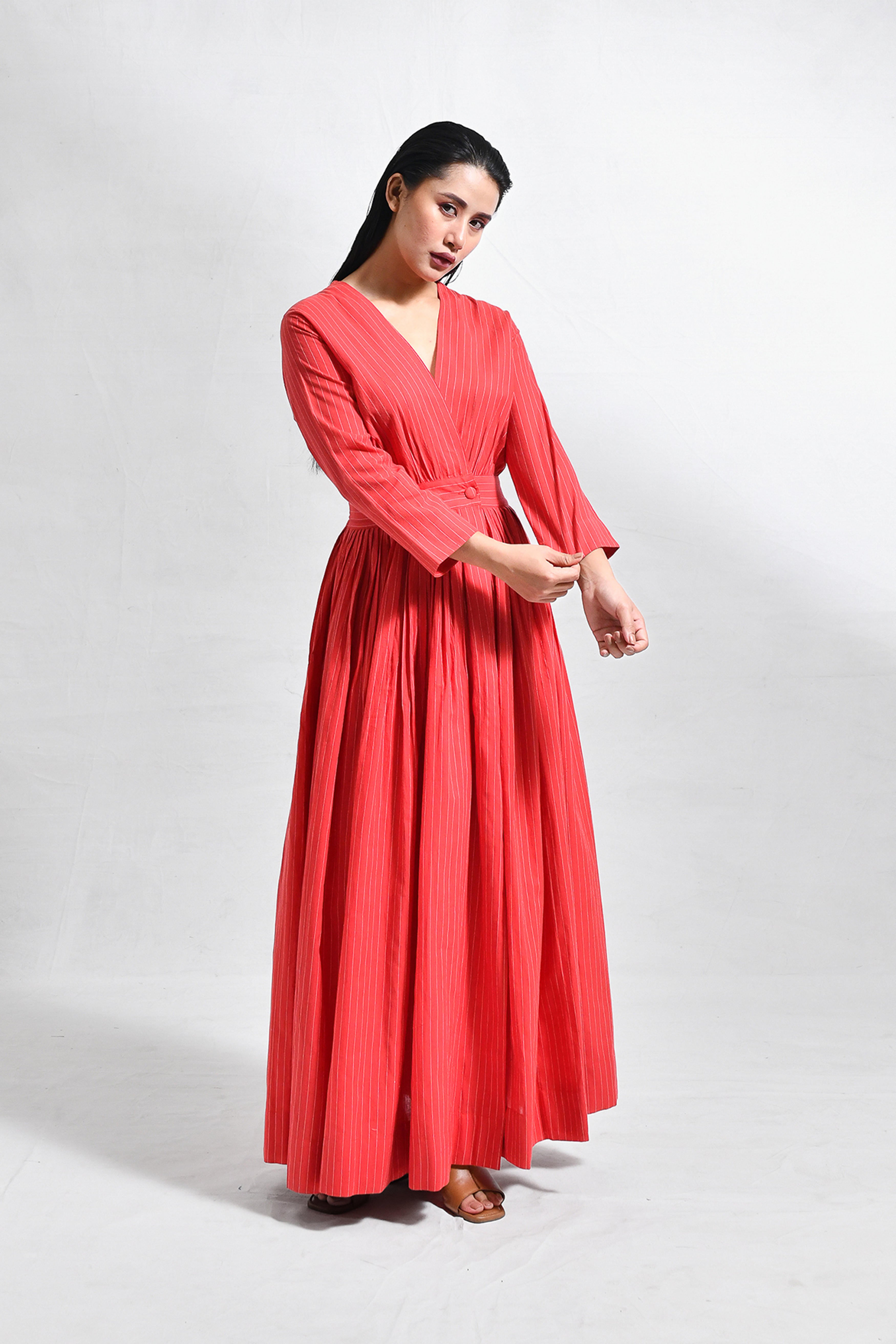 Handwoven from the finest khadi, this pinstriped floor-length dress offers the softness and comfort of cotton. Designed with a front wrap overlap and double-button closures, it offers versatility to be worn as a dress or styled as an overlay. Side pockets add functionality, while intricate pinch gathers at the waist create a graceful, flared silhouette. Model is 5'5, wearing a Size M.