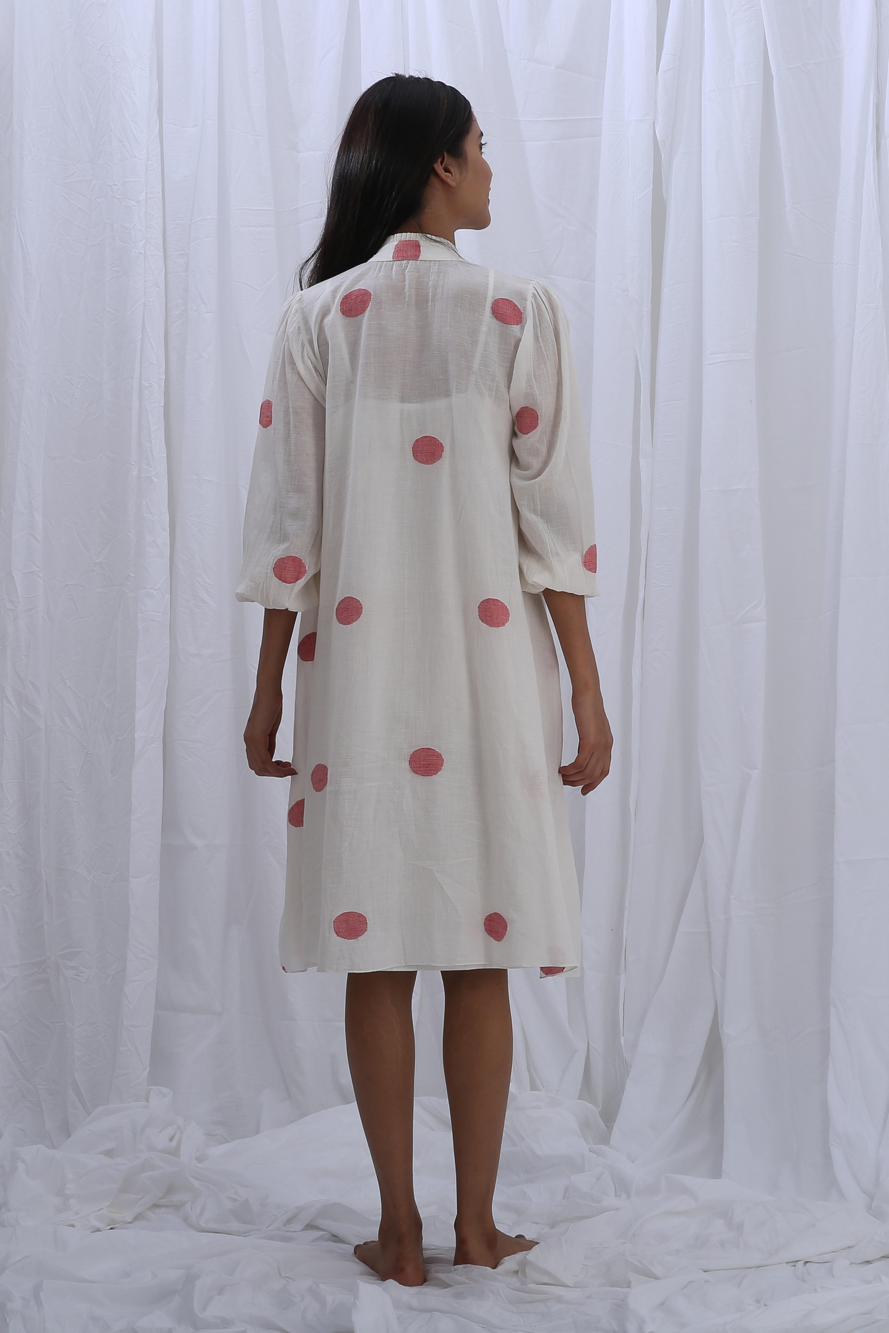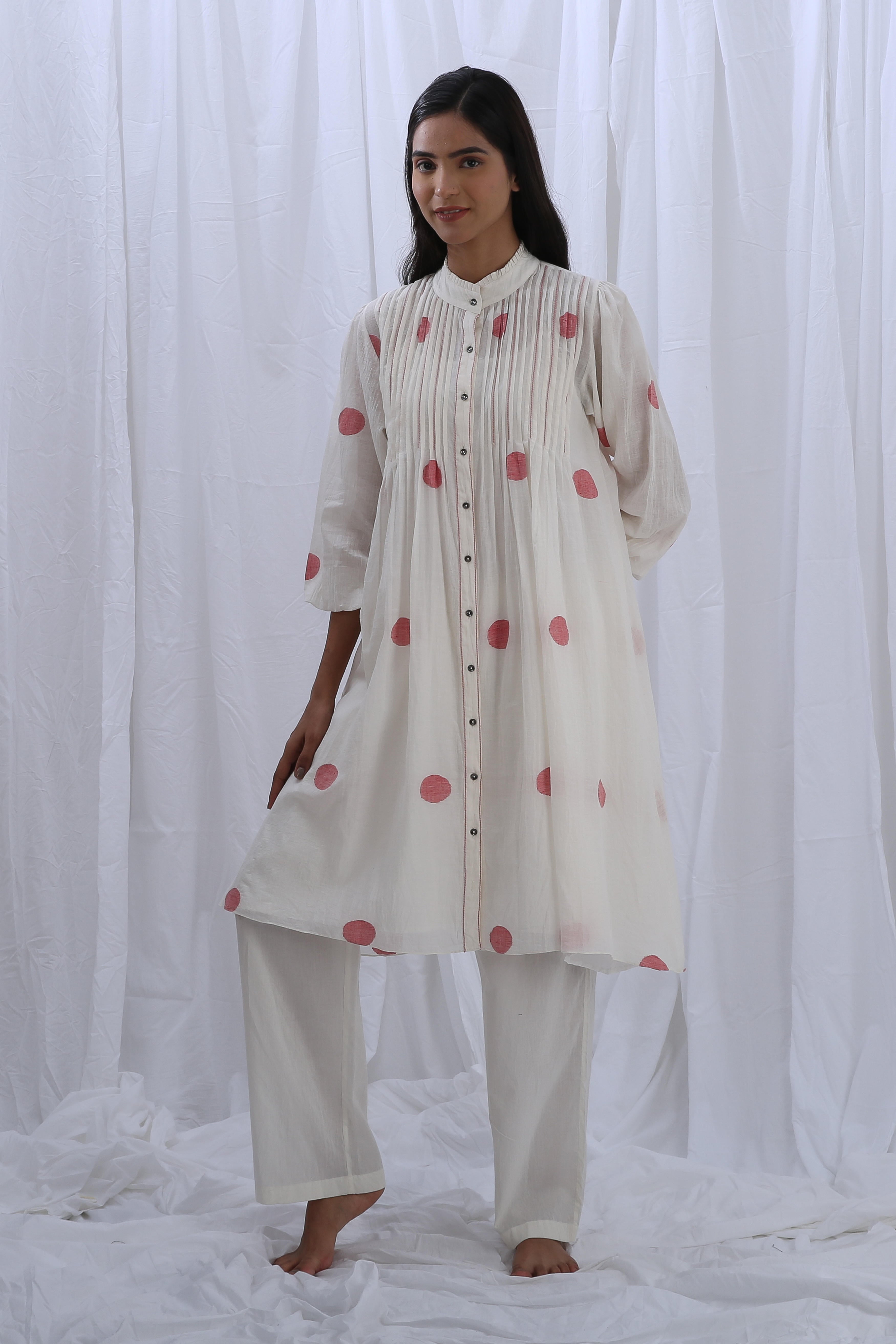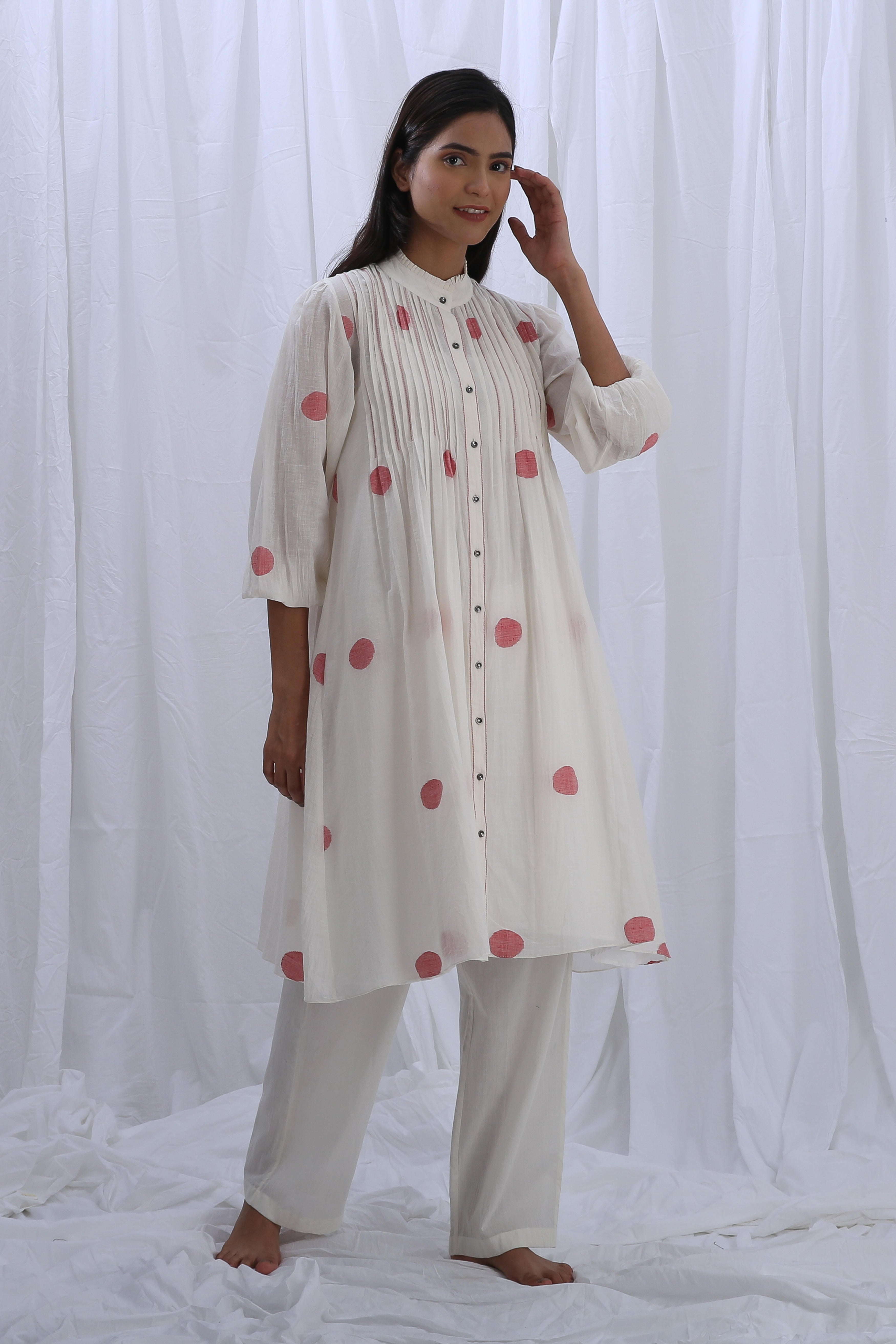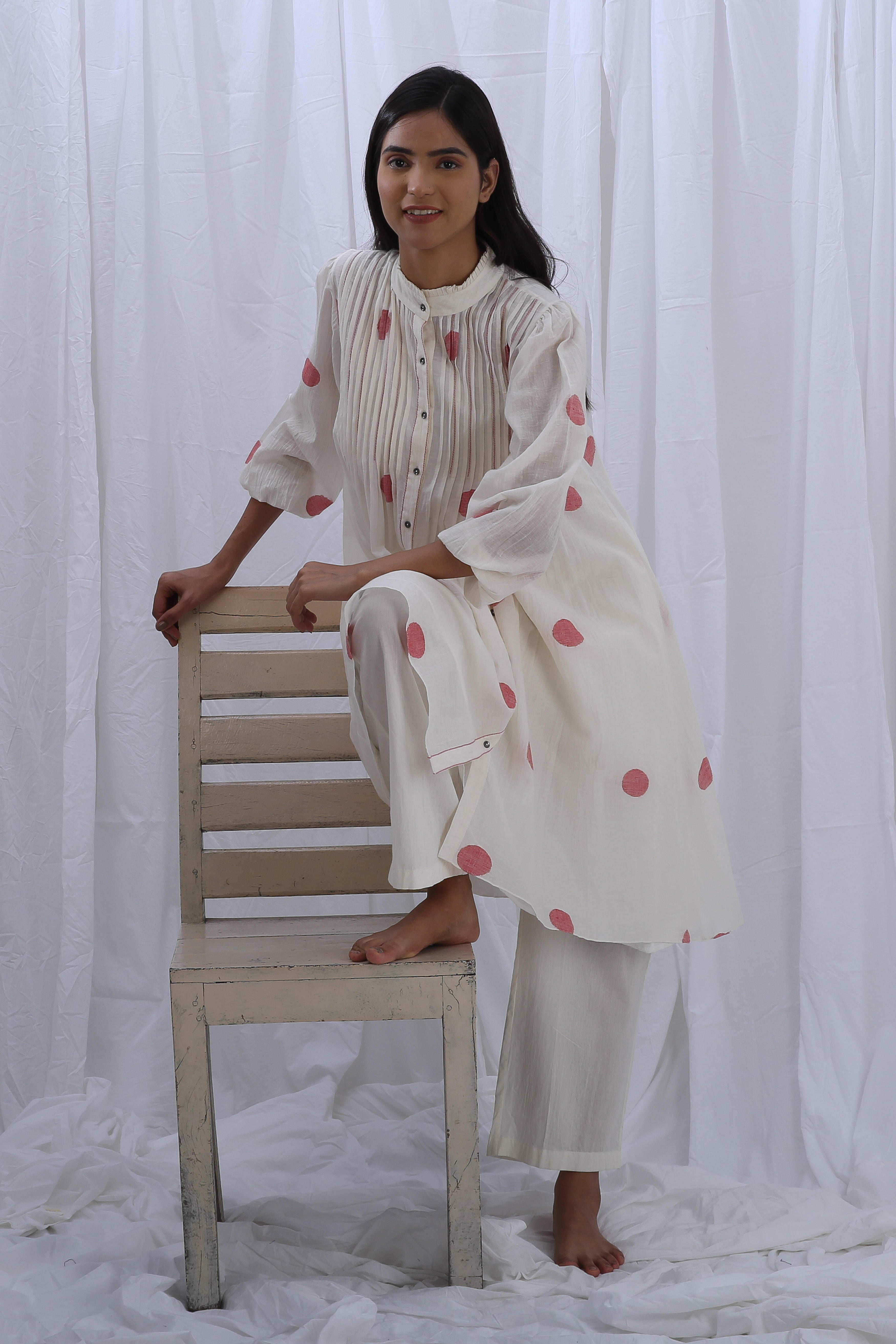 This stunning Handloom Cotton set in Bright White and Light Red Polka features intricate machine embroidery in the Pintuck part, adding a delicate touch of craftsmanship. The Top Length is 44 inches, and the Bottom Length is 38 inches, creating a flattering silhouette. The top comes with a Slip for comfort and elegance. Our model, standing at 5'8", is wearing a size S.