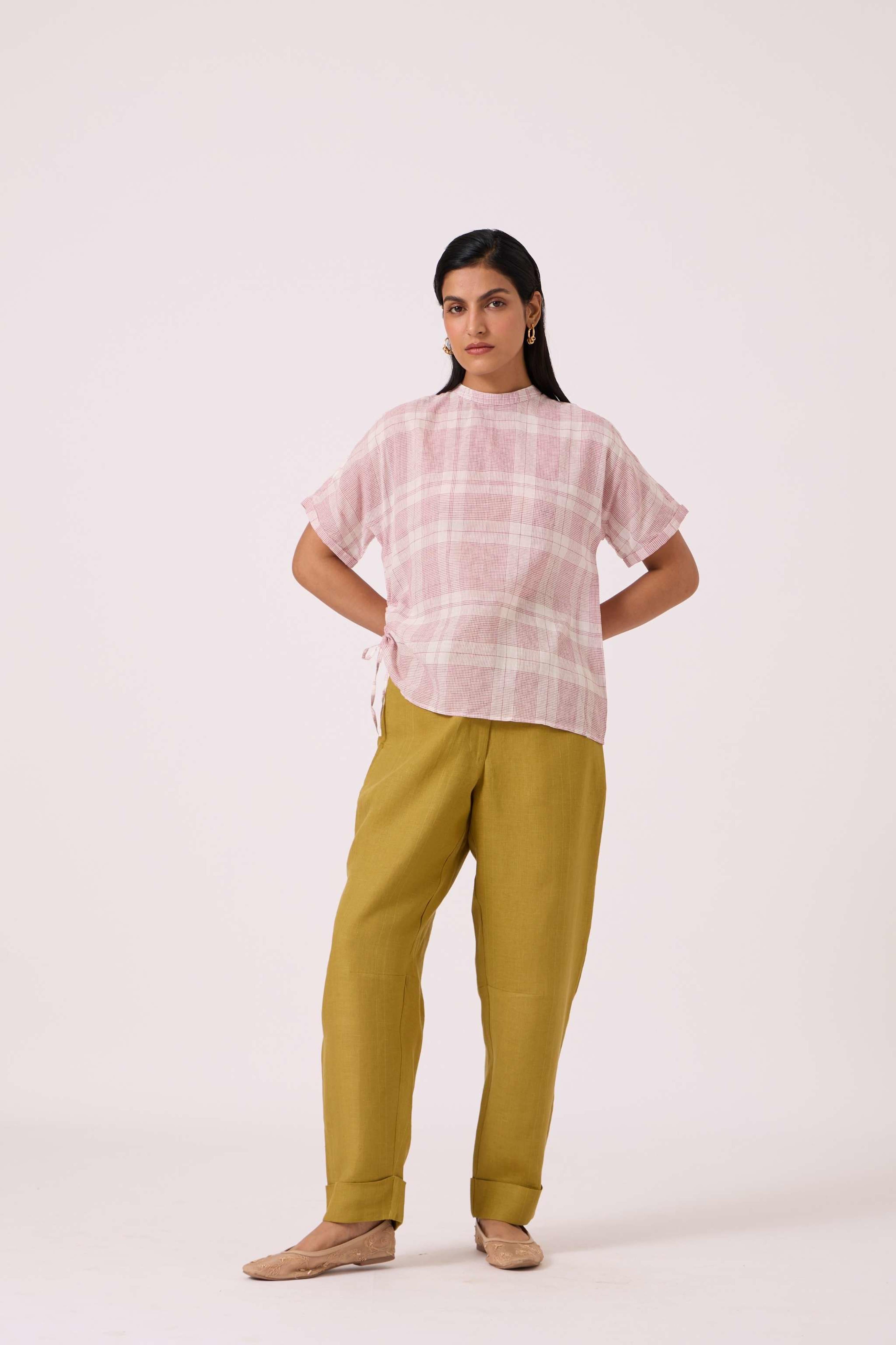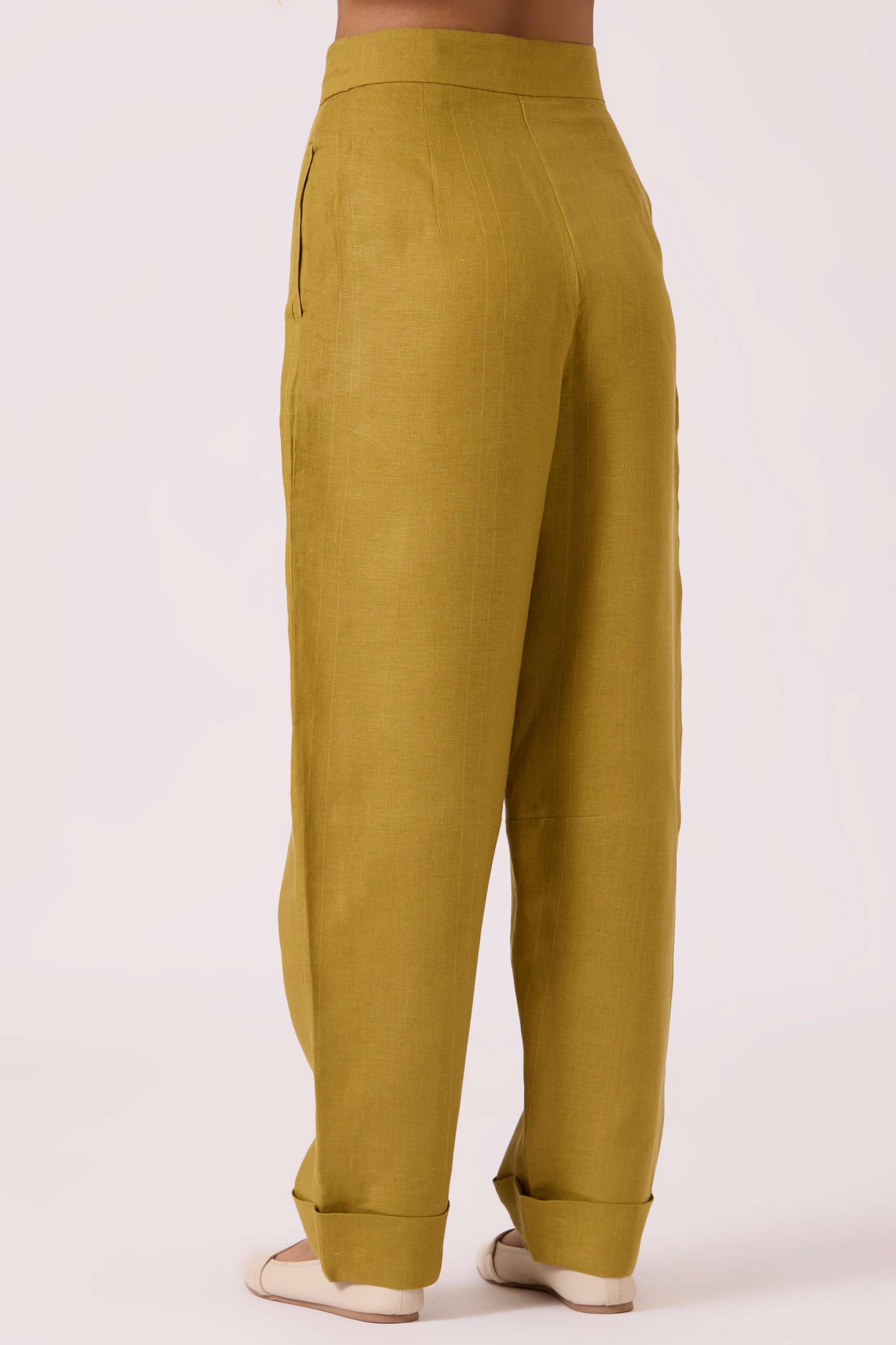 This pair of *relaxed-fit pants* features a *mid-rise* and a unique *barrel silhouette*. The design includes a *dart detail at the knee* and a *wide folded hem*. Practicality is added with *in-seam welt pockets* and a *zip fly with button fastening*. The model, Chhavi, is 5'6" and is wearing a size XS.