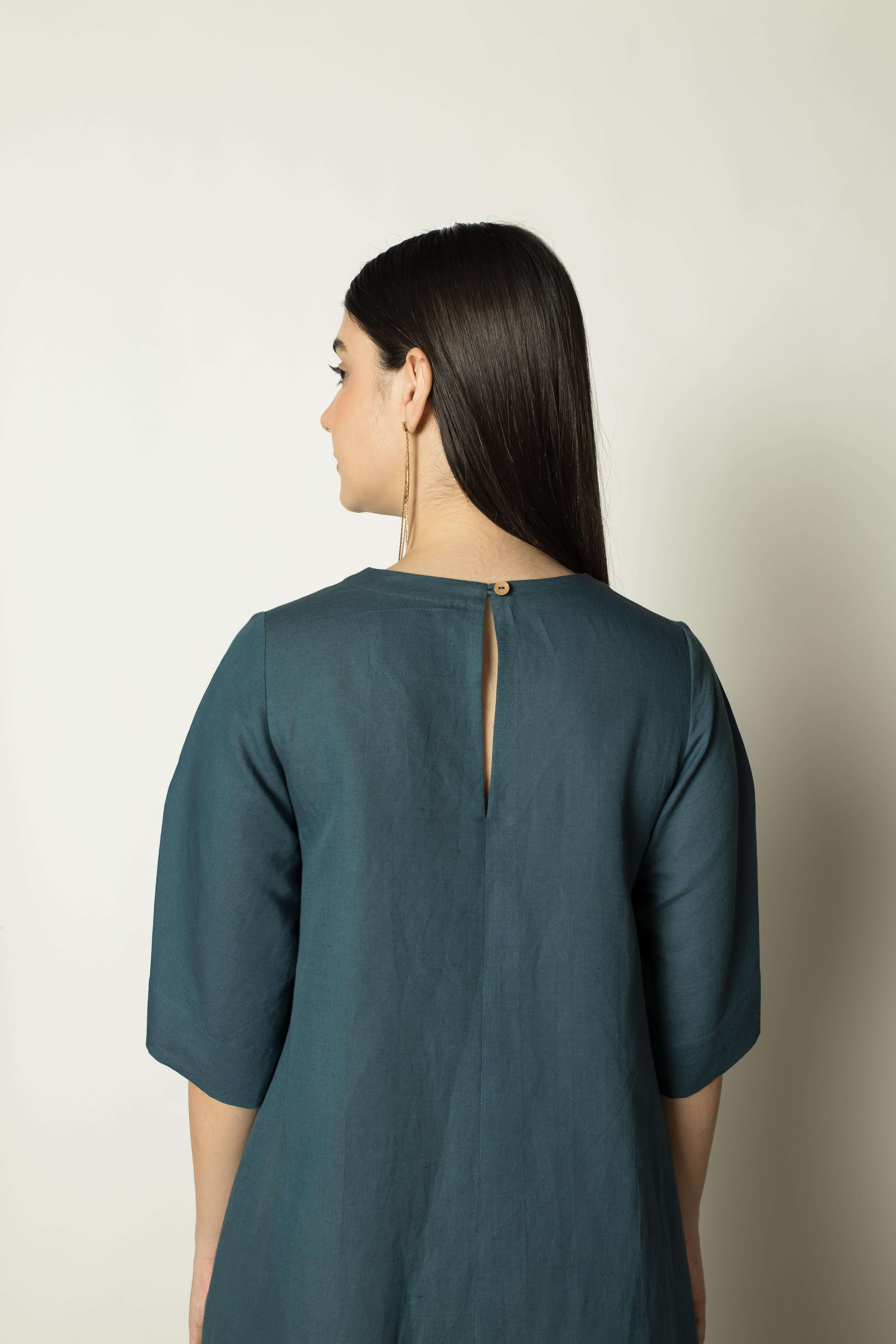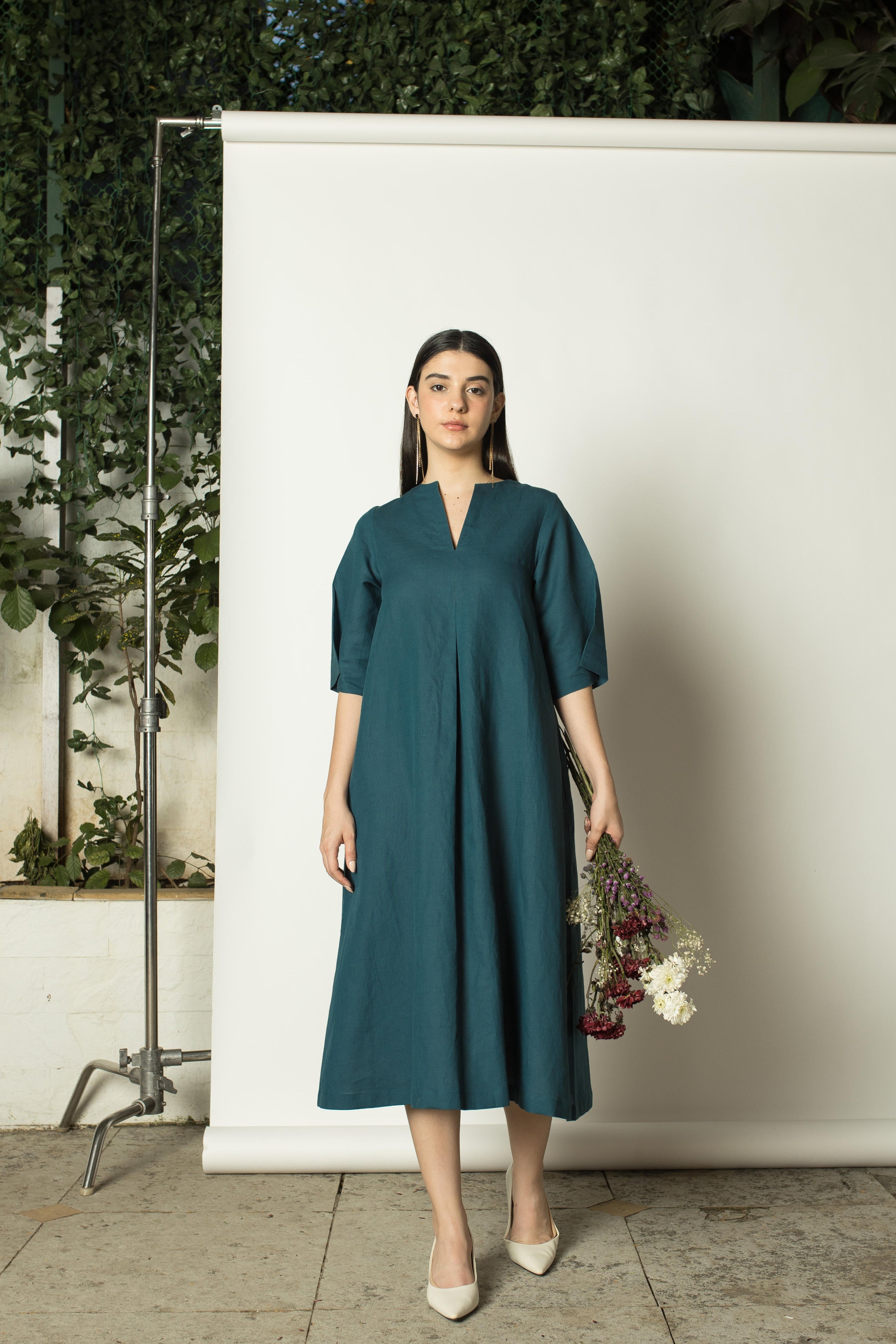 Designed with a maxi length, this dress is featured with a high UV neckline. It has an inverted box pleat at the front that adds volume to the A-line shape. It has elbow length sleeves elevated to complete the floaty silhouette.
