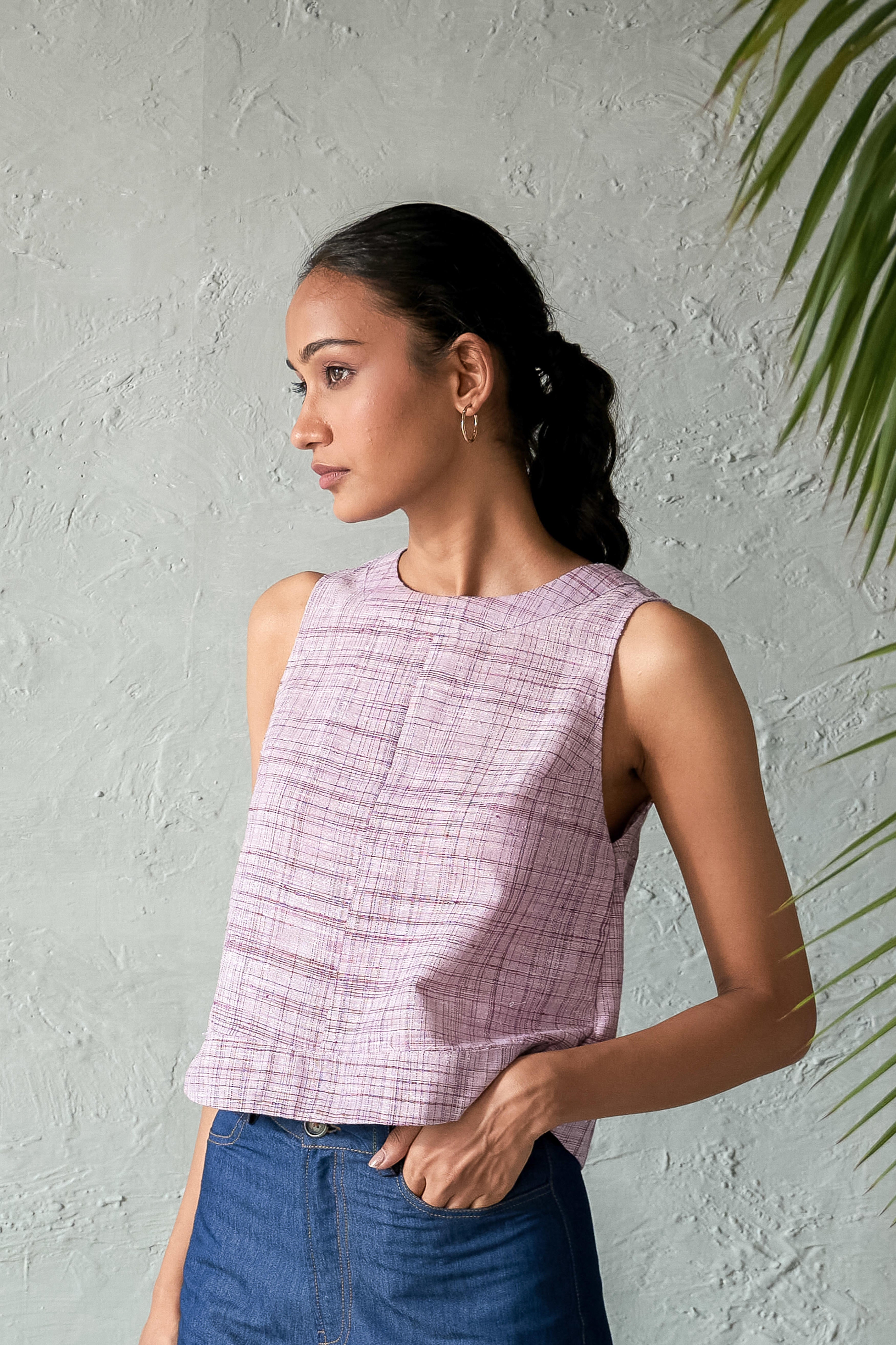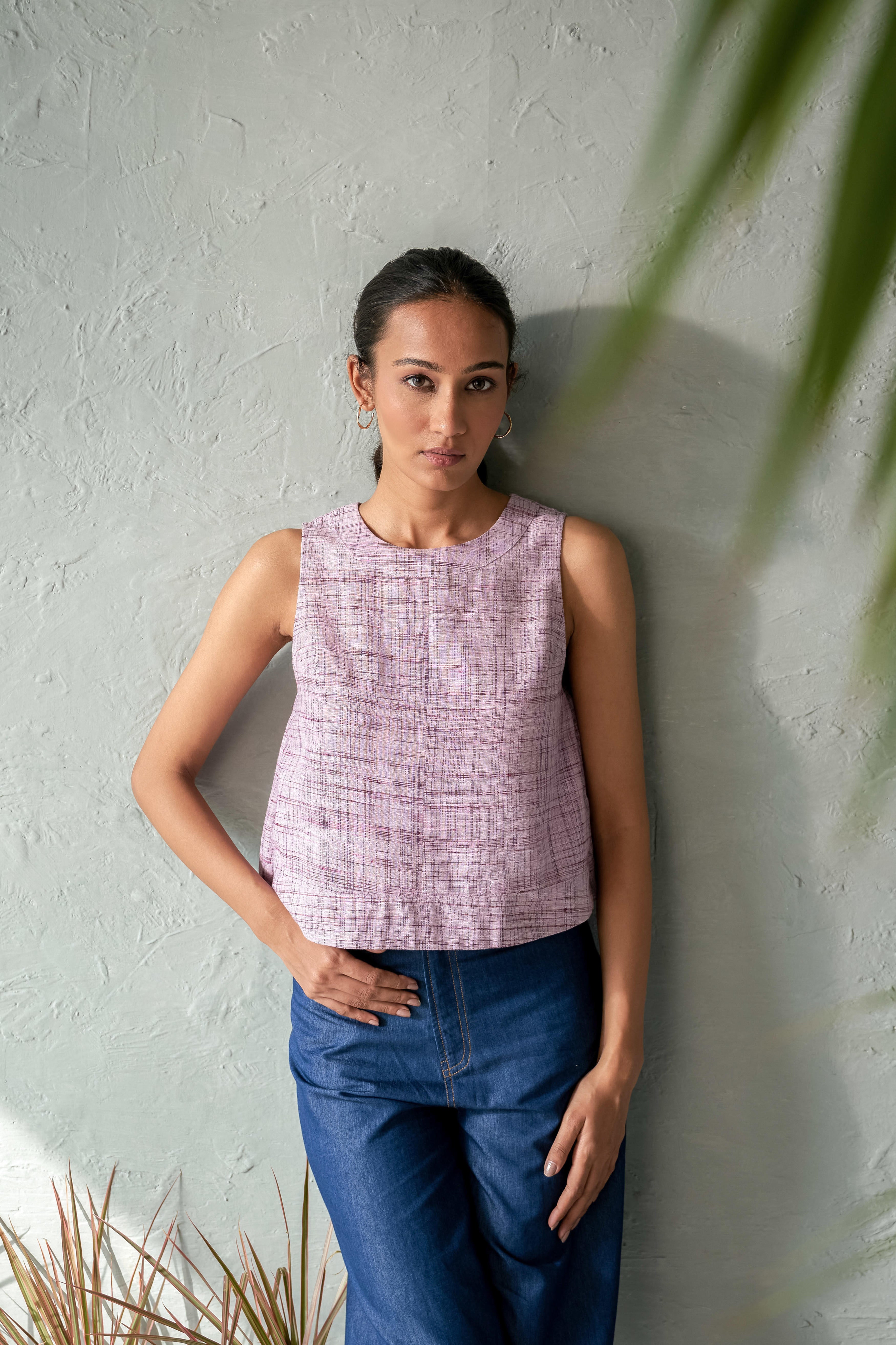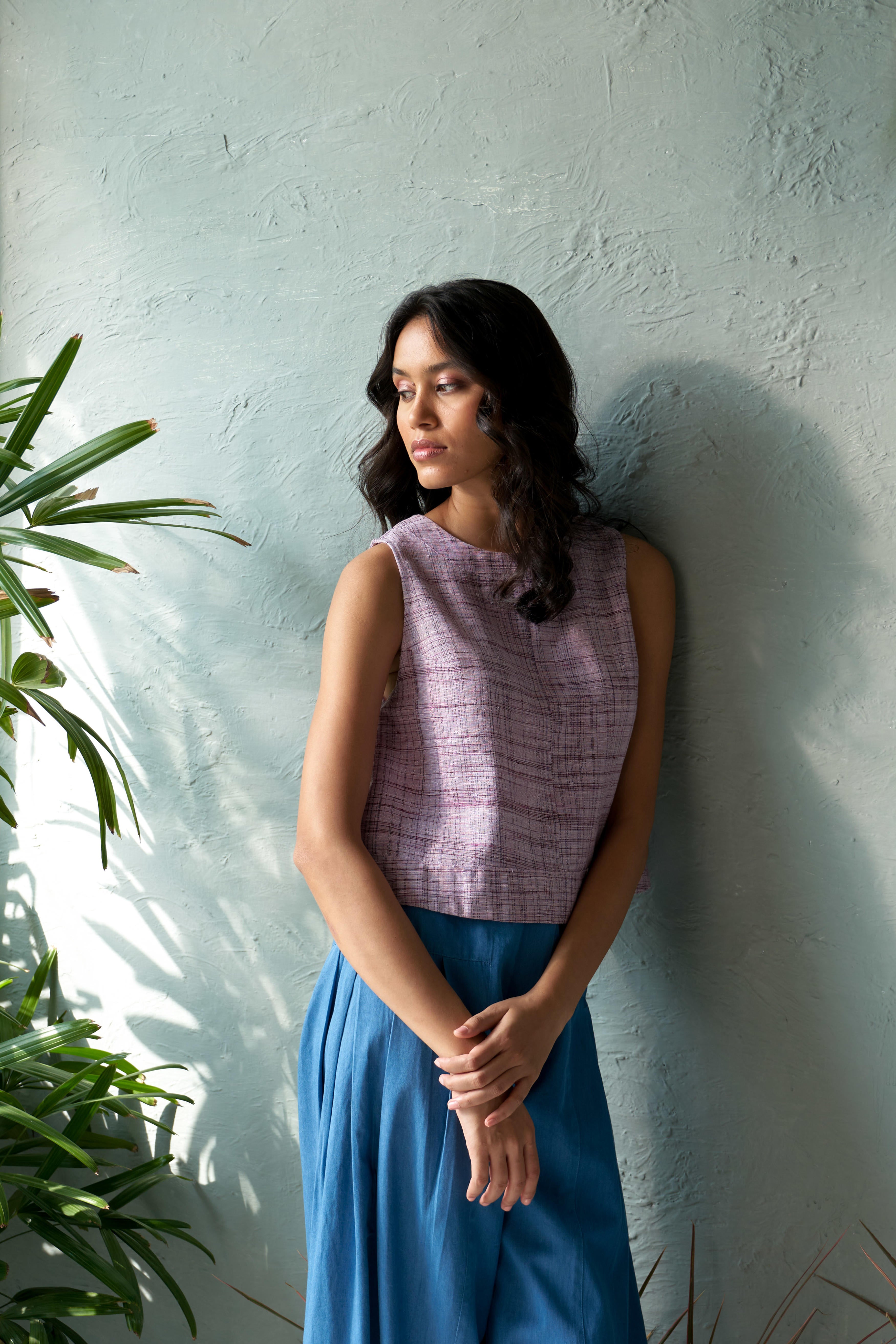 An A-line crop top crafted in textured cotton fabric with stitch detailing around the neckline, hem, and front adds a subtle yet stylish touch to a classic silhouette. The A-line shape flares slightly from the top, offering a flattering fit that enhances comfort and movement. The intricate stitching provides a unique, handcrafted vibe, making this piece stand out. This crop top can be paired with high-waisted jeans, skirts, or trousers, creating a balanced look. It's perfect for casual outings or can be dressed up with accessories for a more polished appearance.