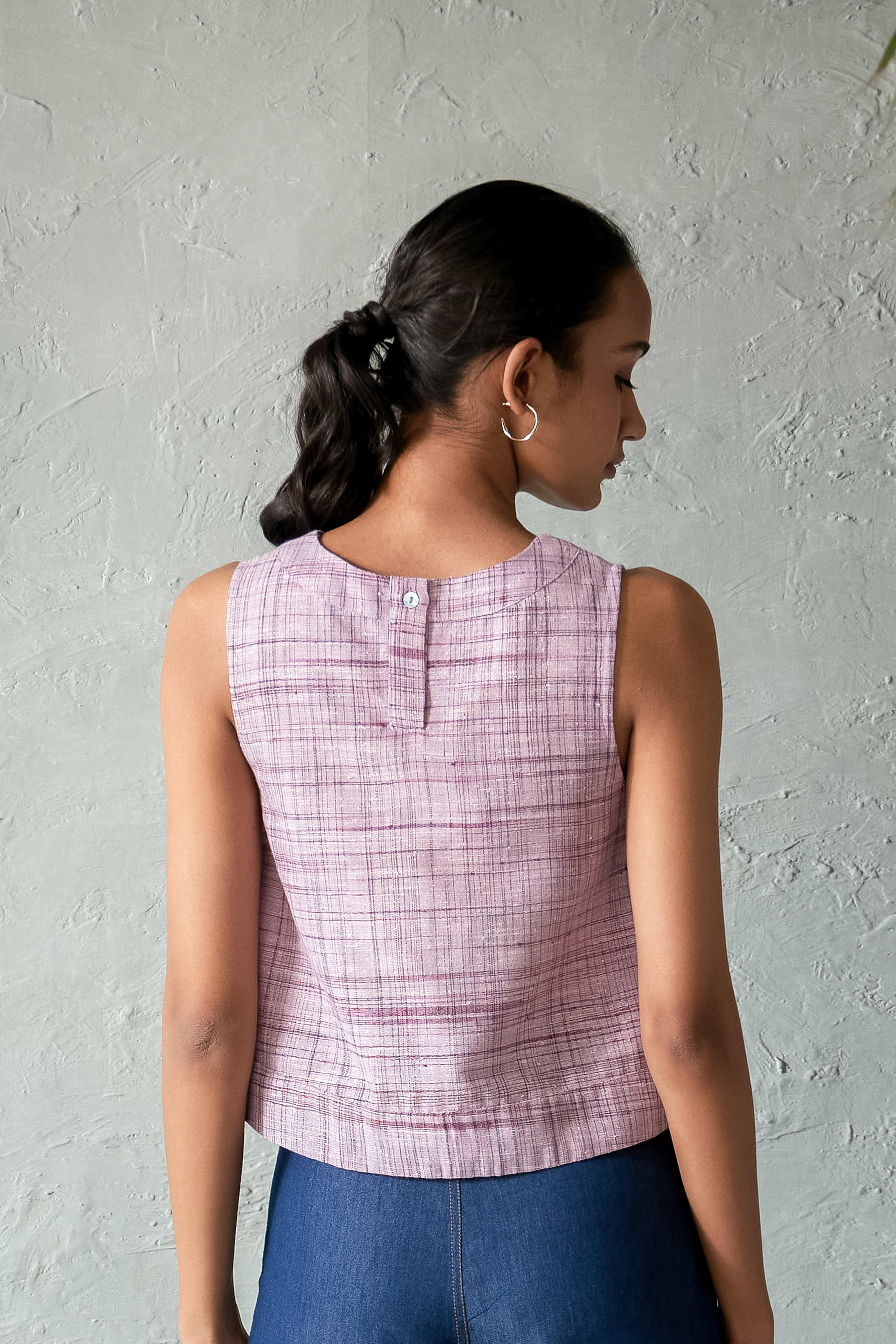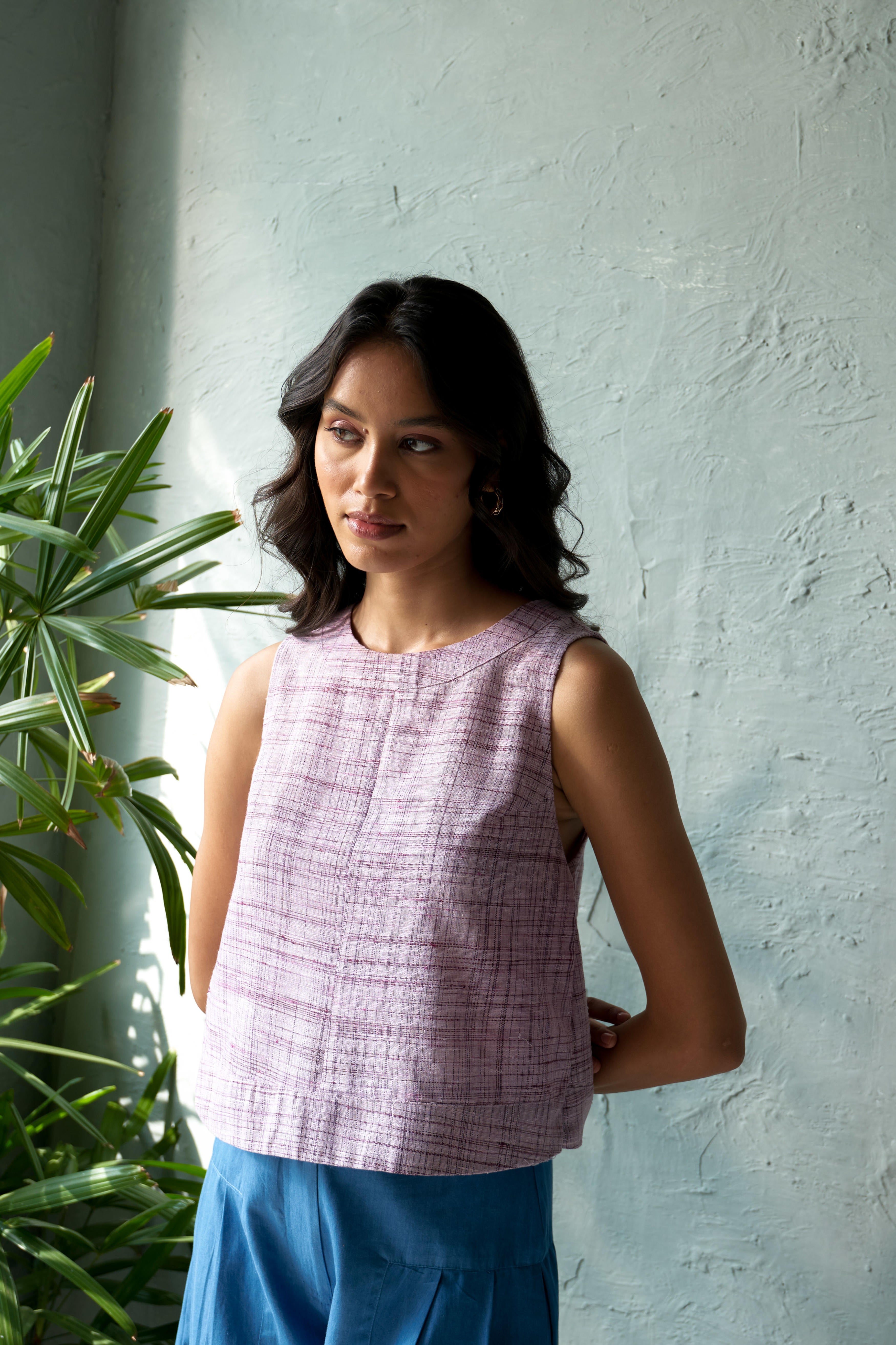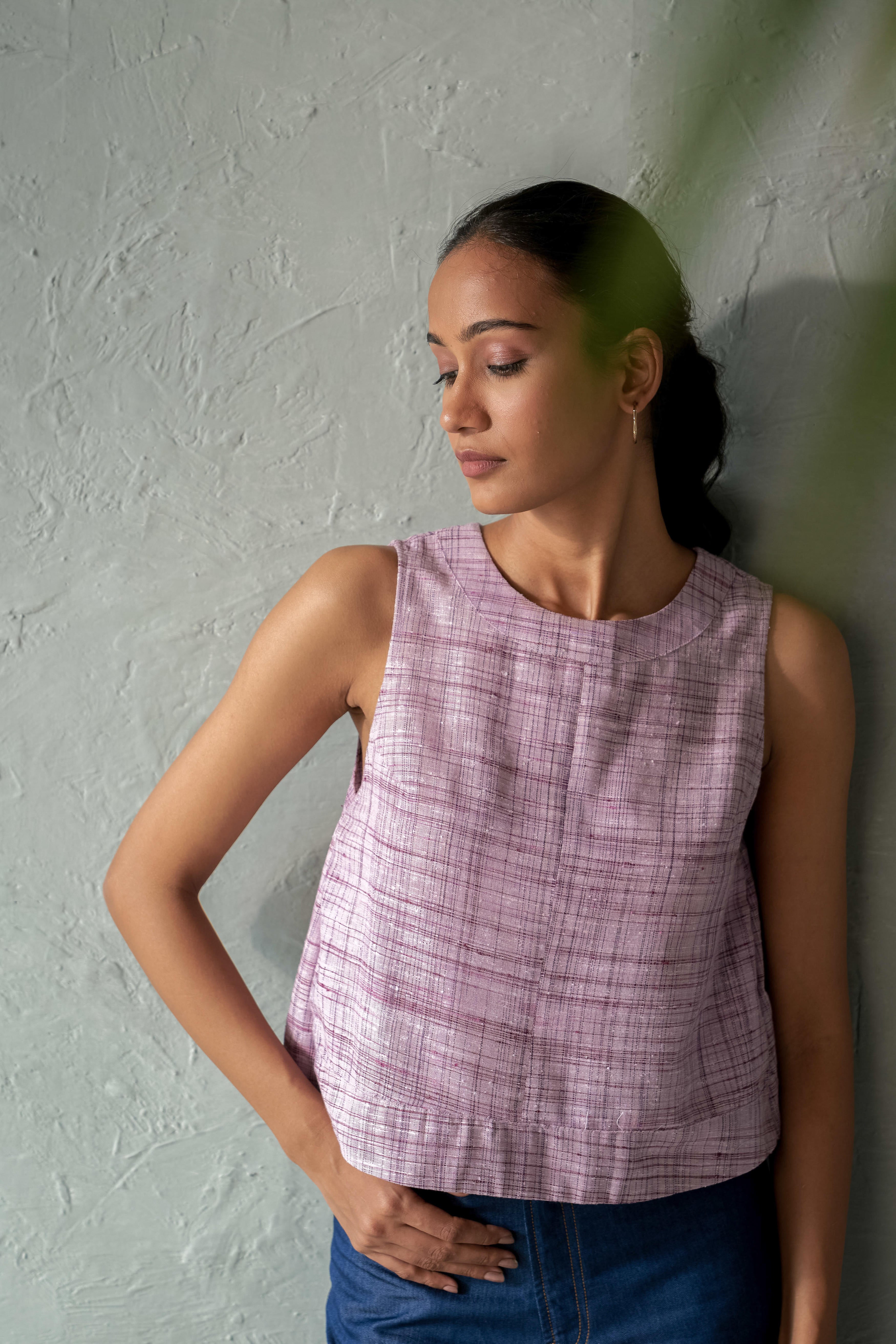 An A-line crop top crafted in textured cotton fabric with stitch detailing around the neckline, hem, and front adds a subtle yet stylish touch to a classic silhouette. The A-line shape flares slightly from the top, offering a flattering fit that enhances comfort and movement. The intricate stitching provides a unique, handcrafted vibe, making this piece stand out. This crop top can be paired with high-waisted jeans, skirts, or trousers, creating a balanced look. It's perfect for casual outings or can be dressed up with accessories for a more polished appearance.