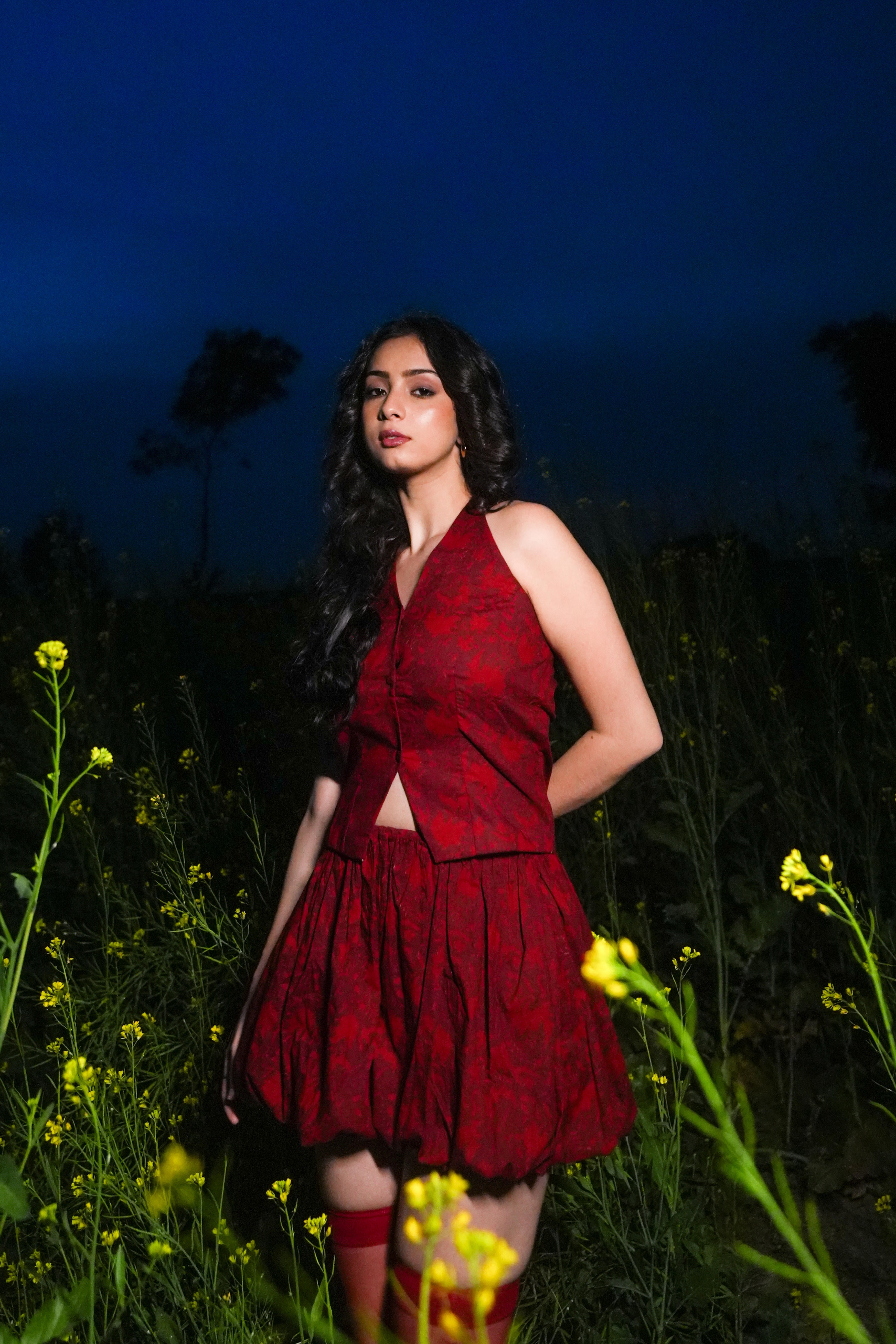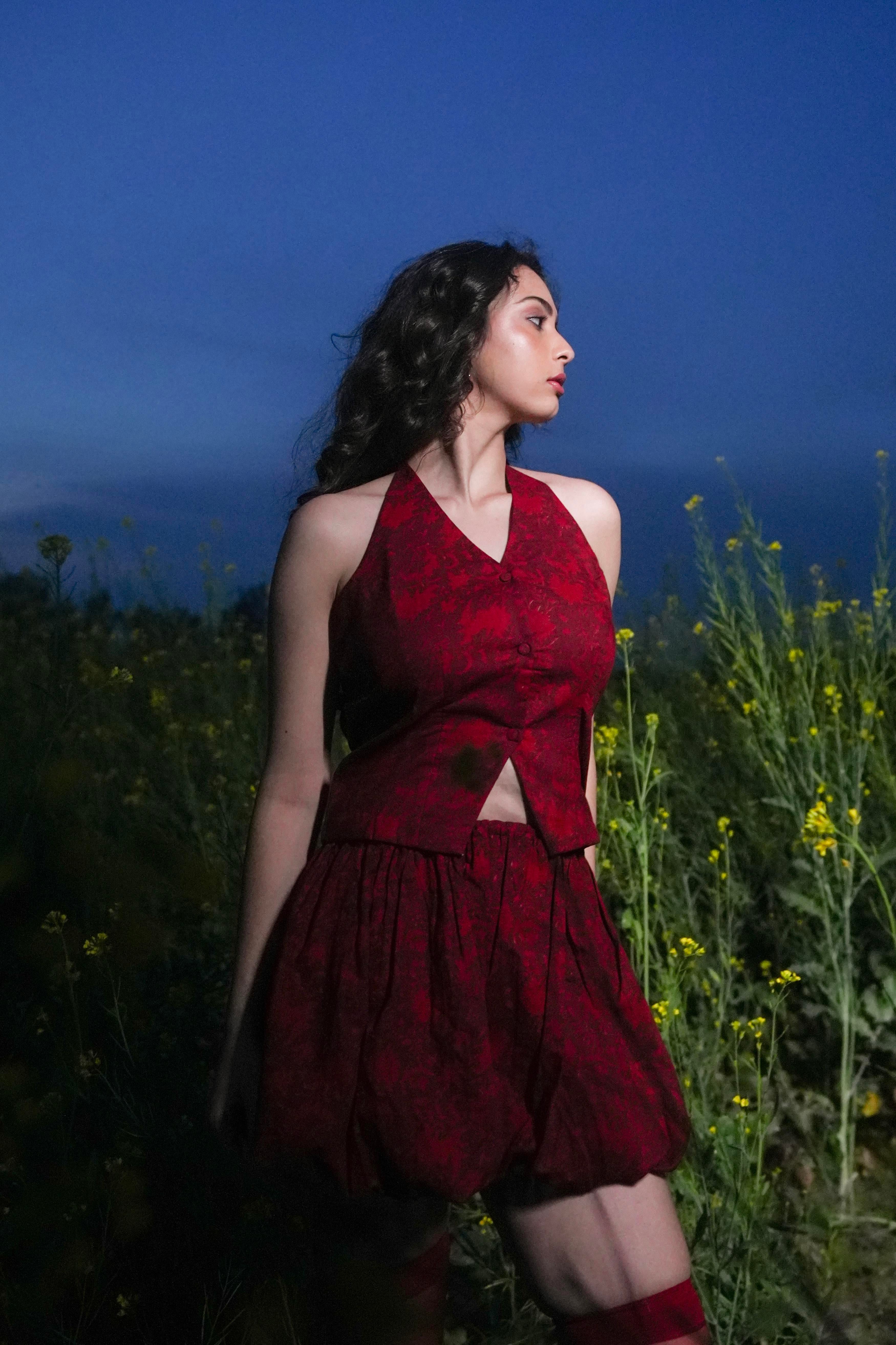 The Plume Balloon Skirt is all lightness and lift — a mini that floats just away from the body while keeping a clean, tailored waist. Soft gathers fall from the waistband into a rounded, cloud-like hem, and the deep crimson floral surface adds rich yet quiet texture. It is an easy statement piece for dressing up or down.