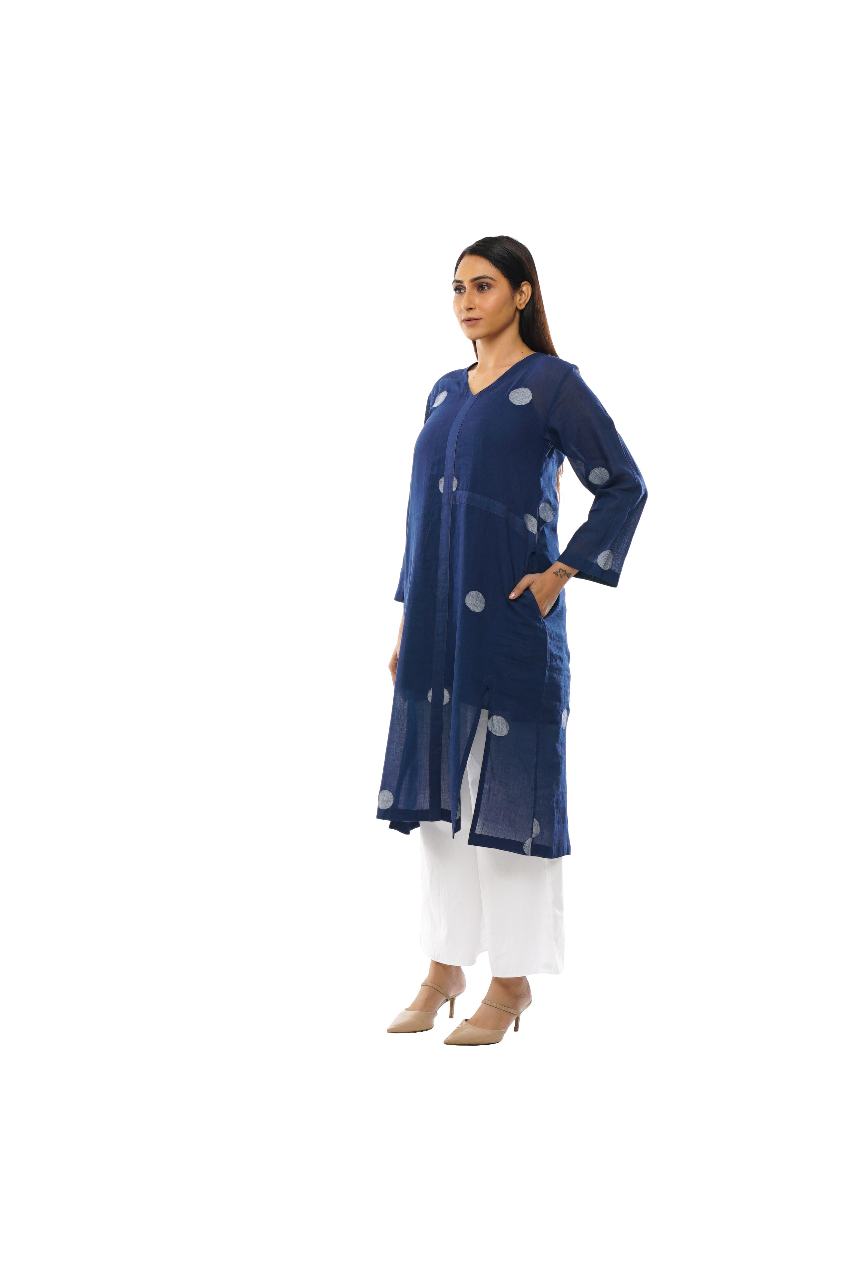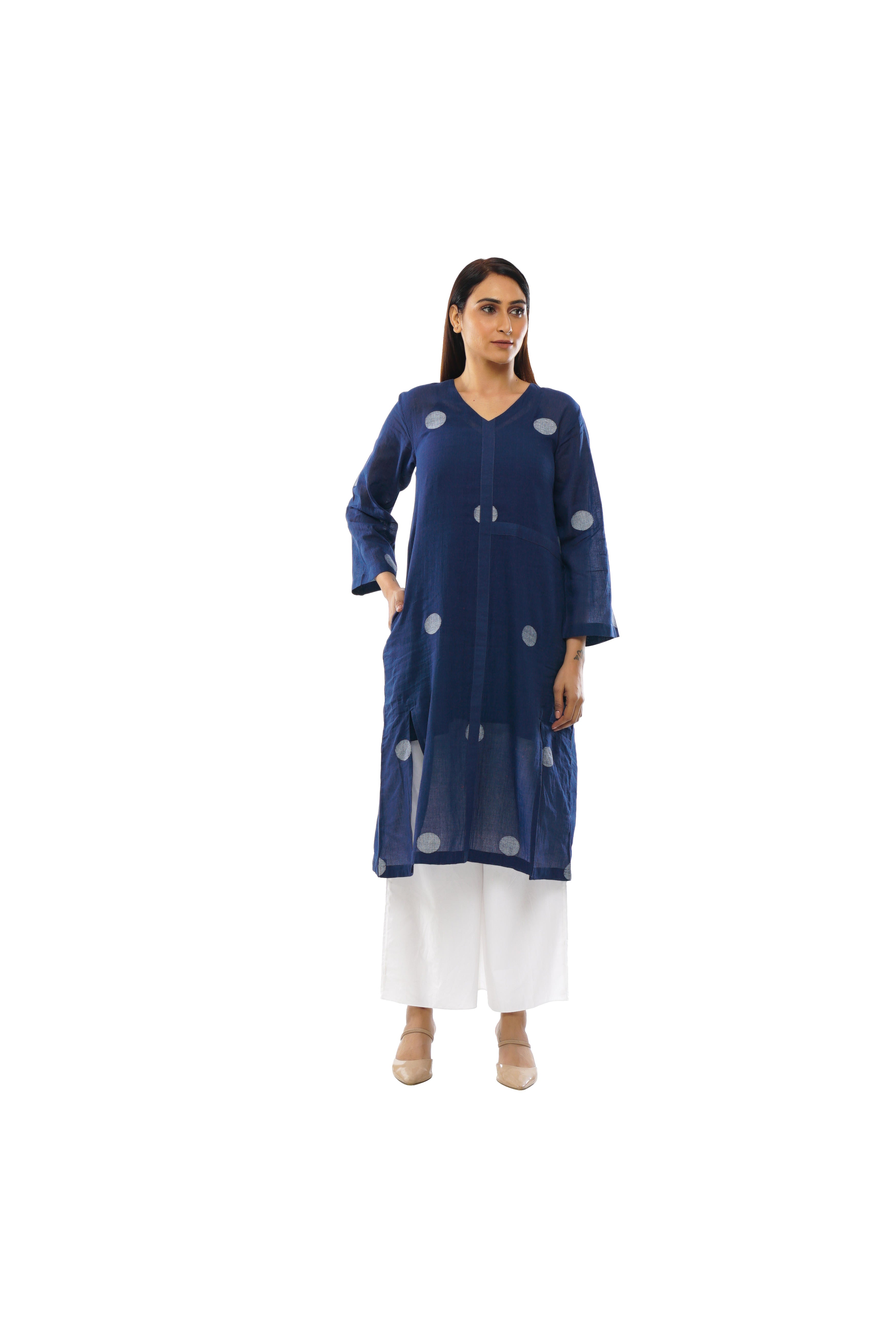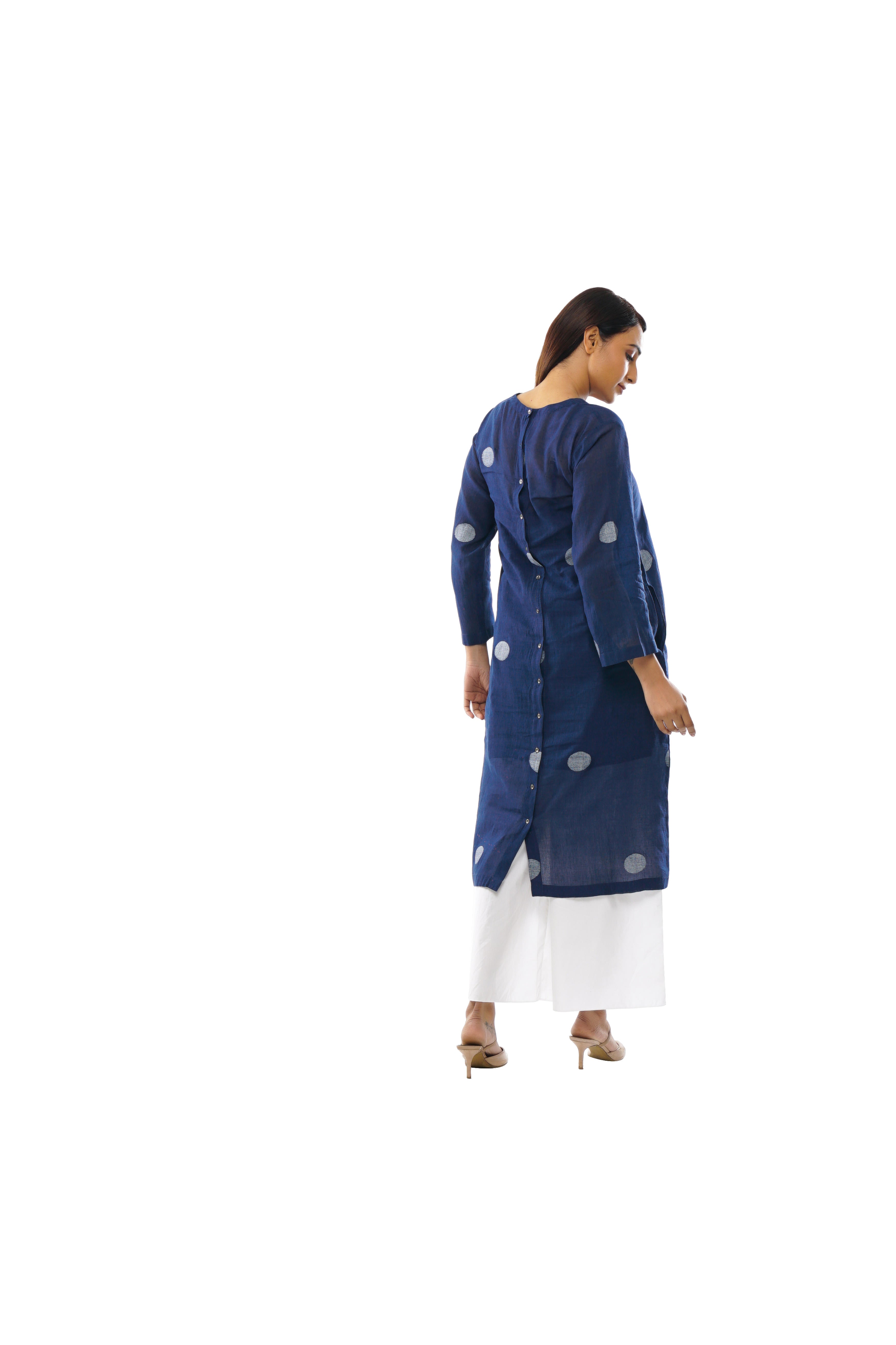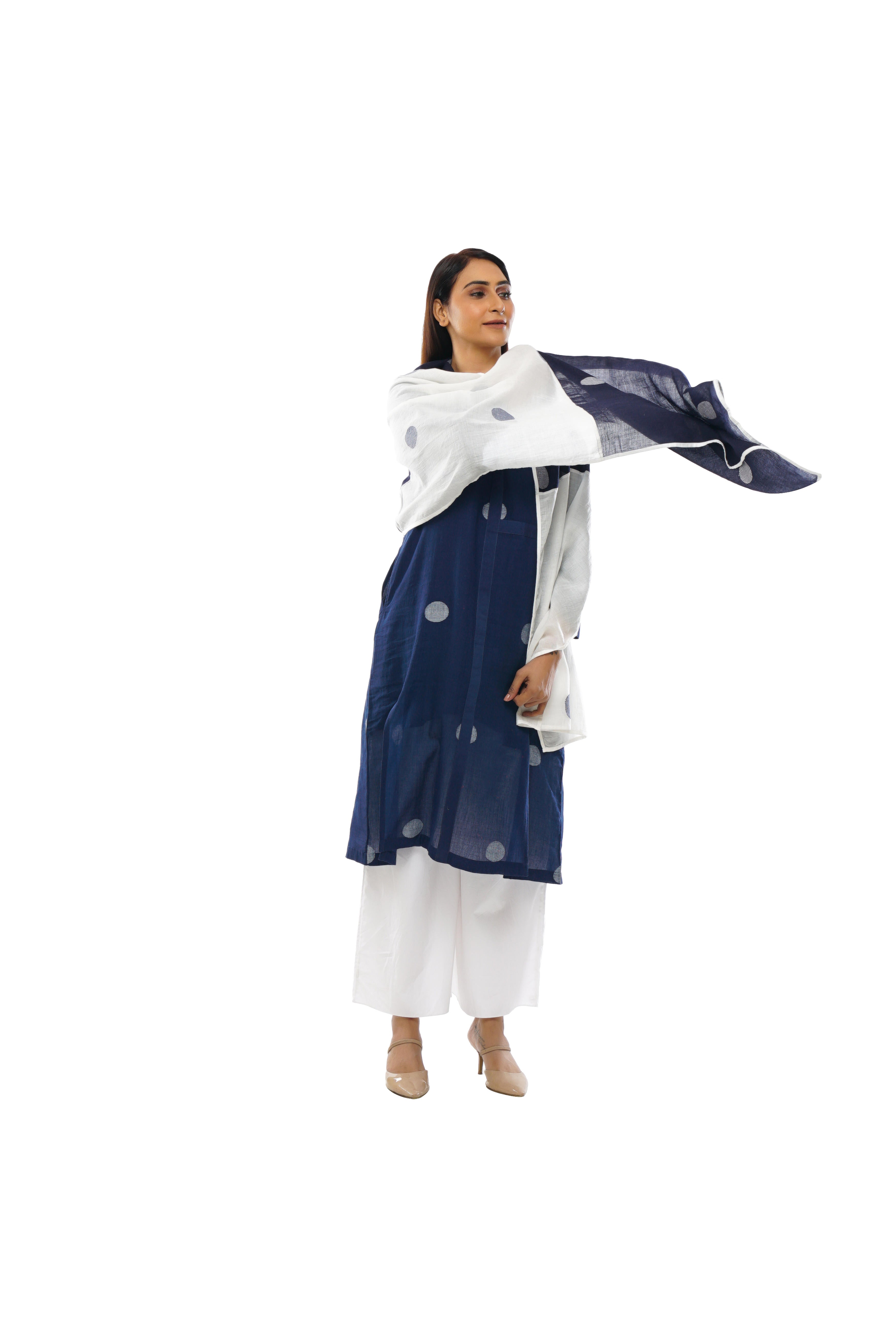 This sophisticated Navy Blue Four-Piece Set combines tradition and elegance. Crafted from premium handwoven fabric, the kurta has a back-open design and front slit, complemented by white pants, a delicate white dupatta with navy details, and an inner slip for added comfort and coverage.