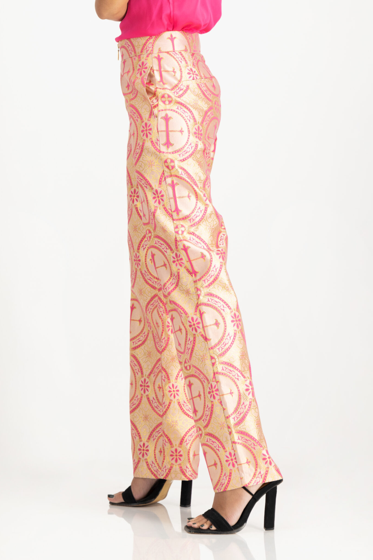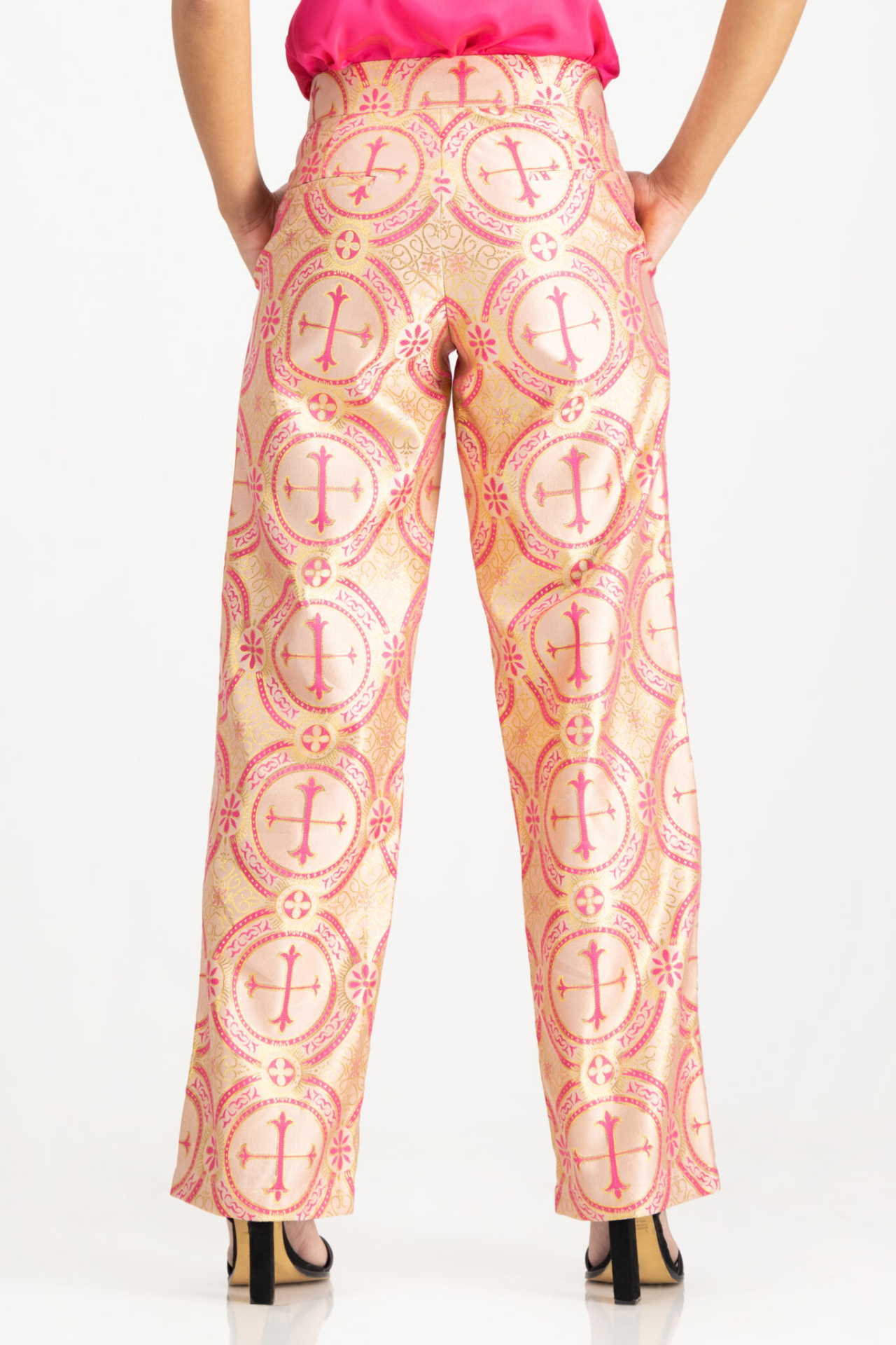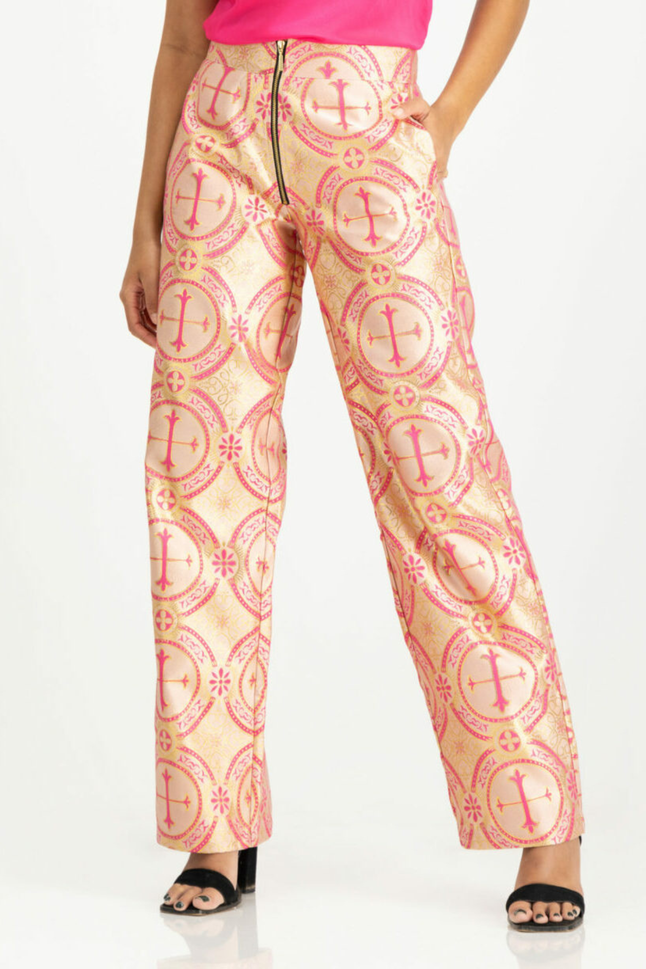The brocade pope pants is a luxurious and stylish bottom piece that adds a touch of opulence to any outfit. Made from intricately woven brocade fabric, these pants feature rich textures and often come in vibrant or metallic hues. Their tailored fit and refined design make them perfect for dressing up on special occasions or adding a sophisticated flair to everyday looks. With their exquisite detailing and timeless appeal, brocade pants are a versatile choice for those seeking an elevated and distinctive fashion statement.