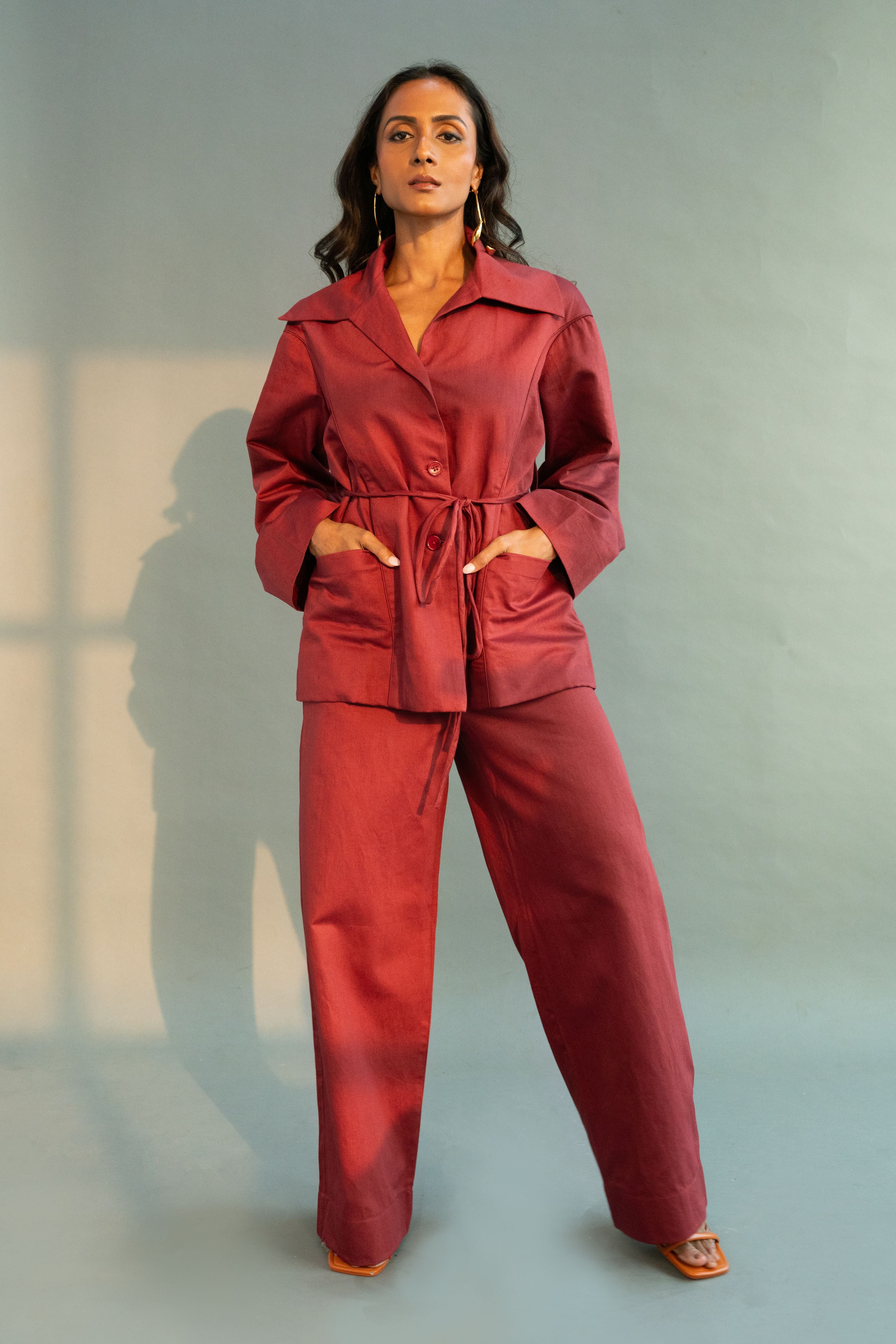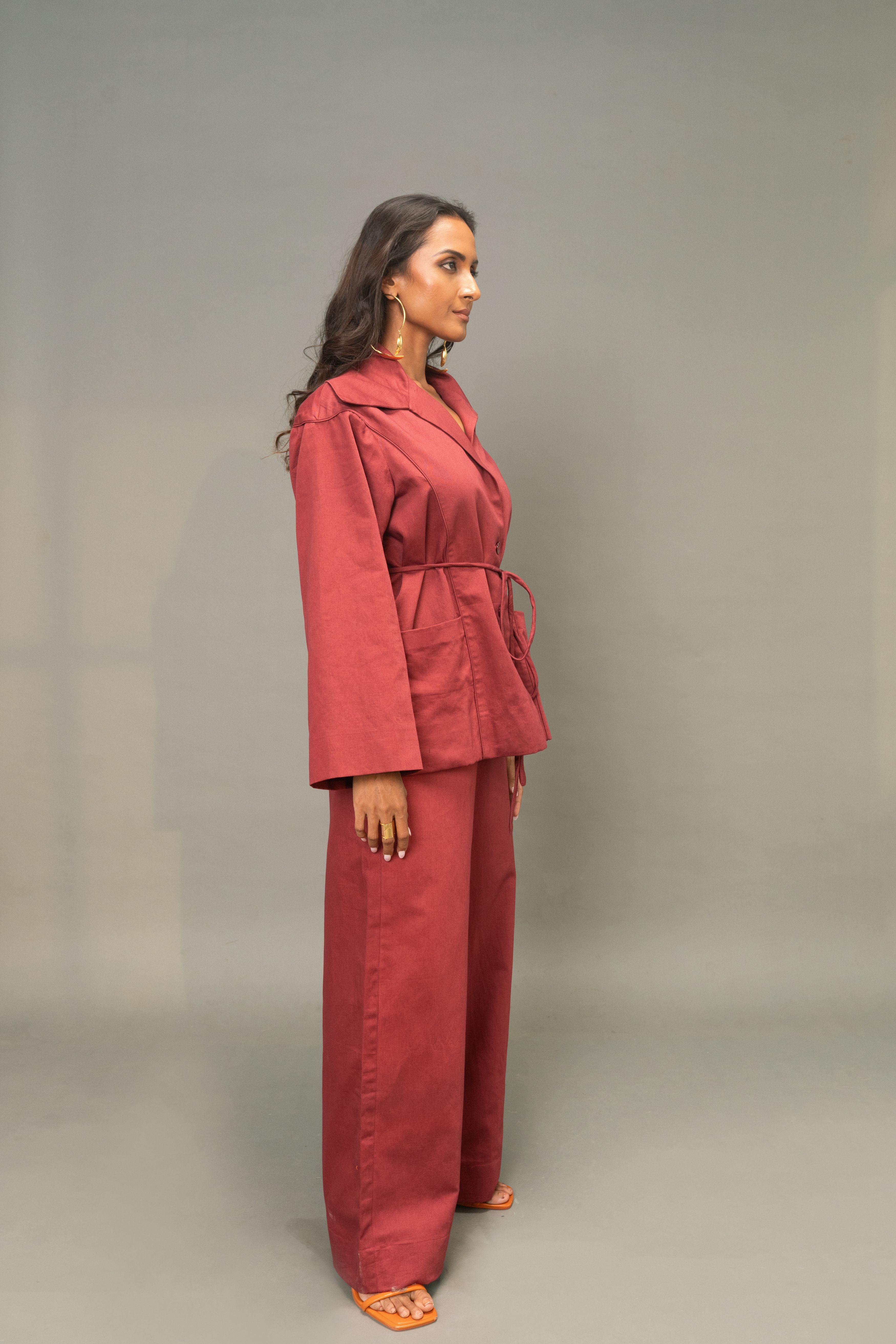 Oversized blazer with drop shoulders and two front patch pockets. Its fully lined and comes with a 2 button opening and a thin belt to cinch the waist. It is paired with wide-legged full length pants that also have side pockets. Wear it as a set with a bandeau of your choice or mix and match with favourite pieces from your wardrobe.