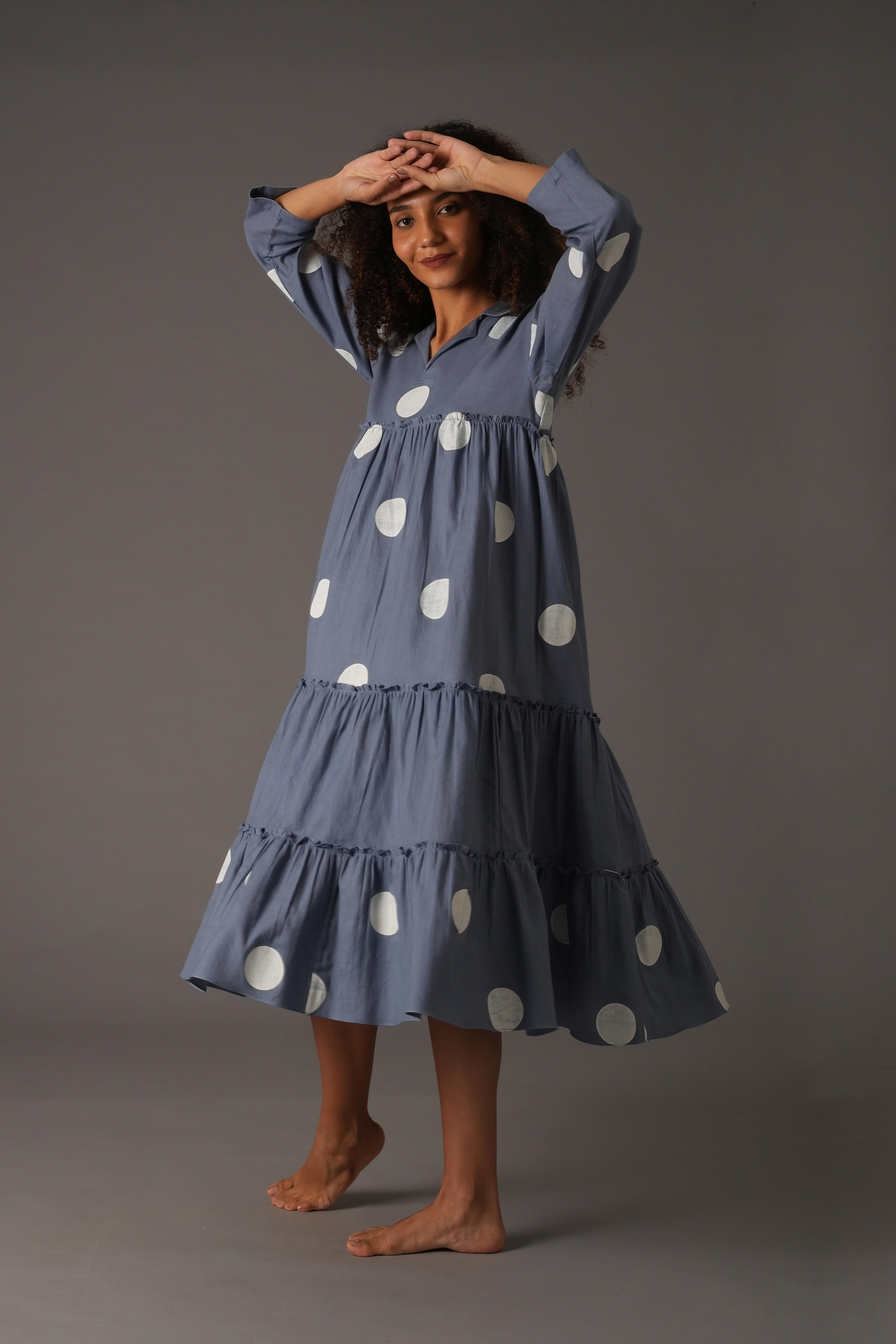 This Twill Cotton Dress in Powder Blue offers a perfect blend of comfort and style. With a 44-inch full length and 17-inch long sleeves, it features a 2-piece collar style for a refined look. The frill detail on each panel adds a touch of femininity, and the bright white polka dots make it playful yet elegant. The loose fit ensures ultimate comfort and effortless chic. Our model, 5'8" tall, is wearing a size S.