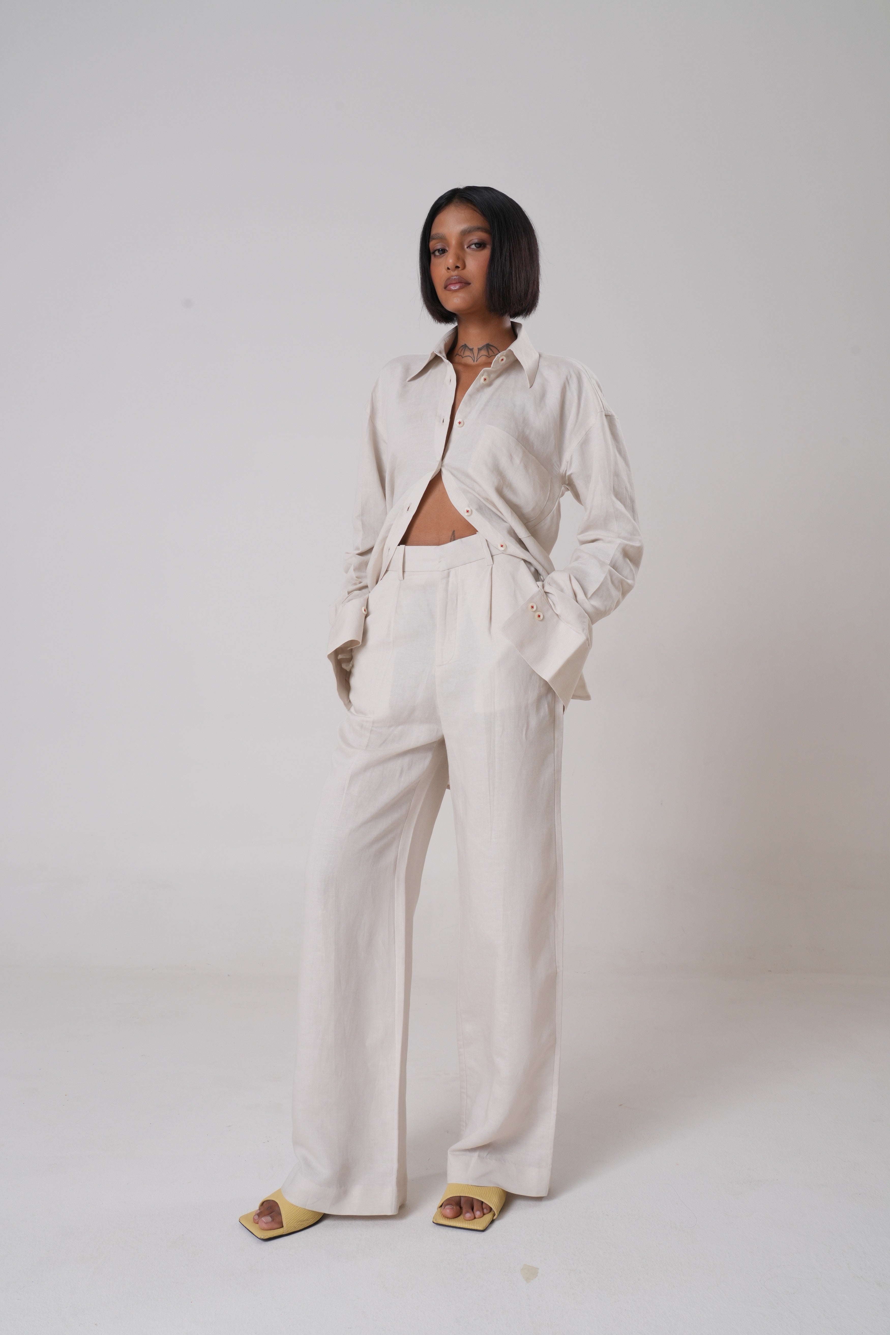 High waist linen straight pants made with single pleat detail and a metal hook fastening and has a criss cross red thread detail on the back pocket
