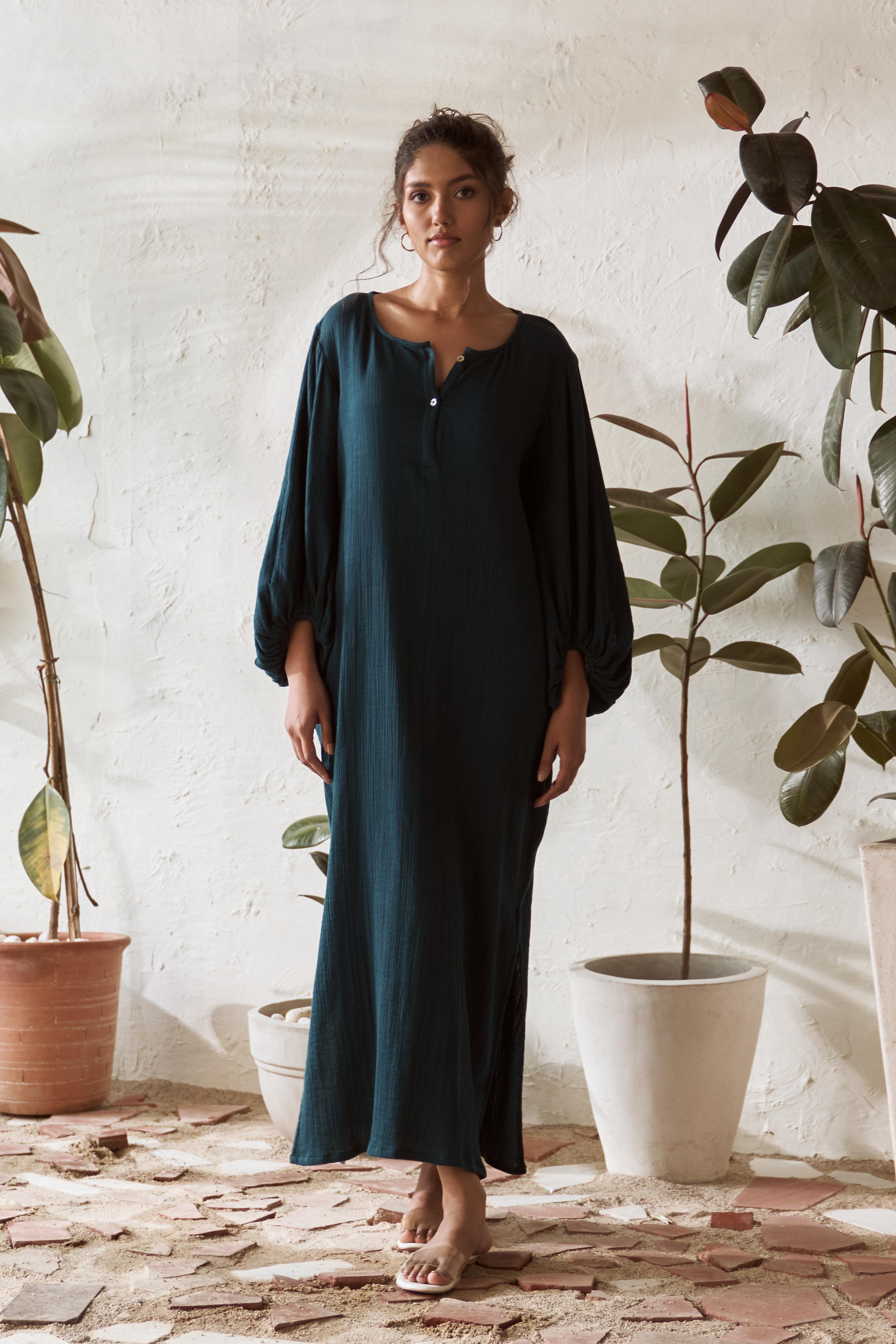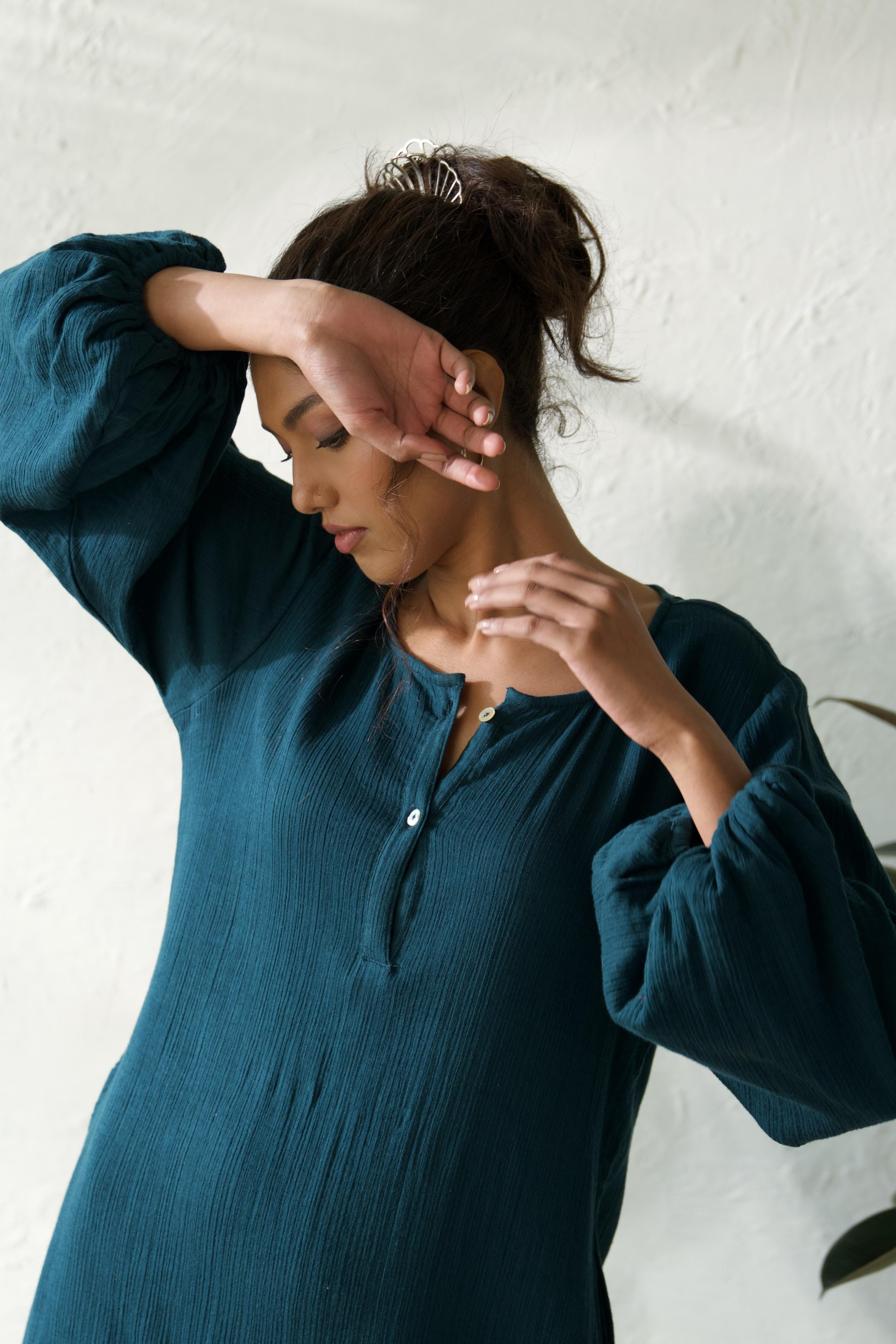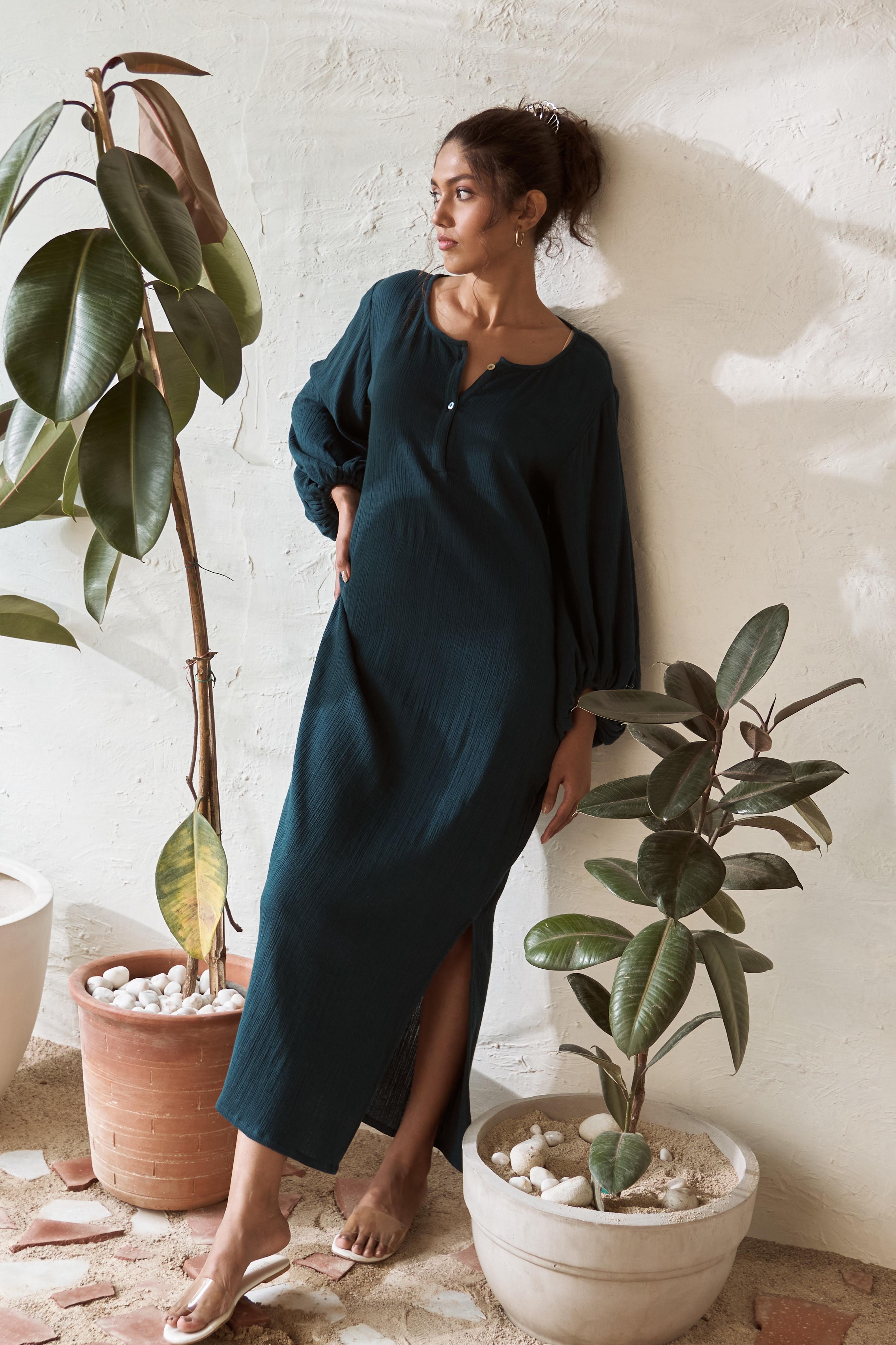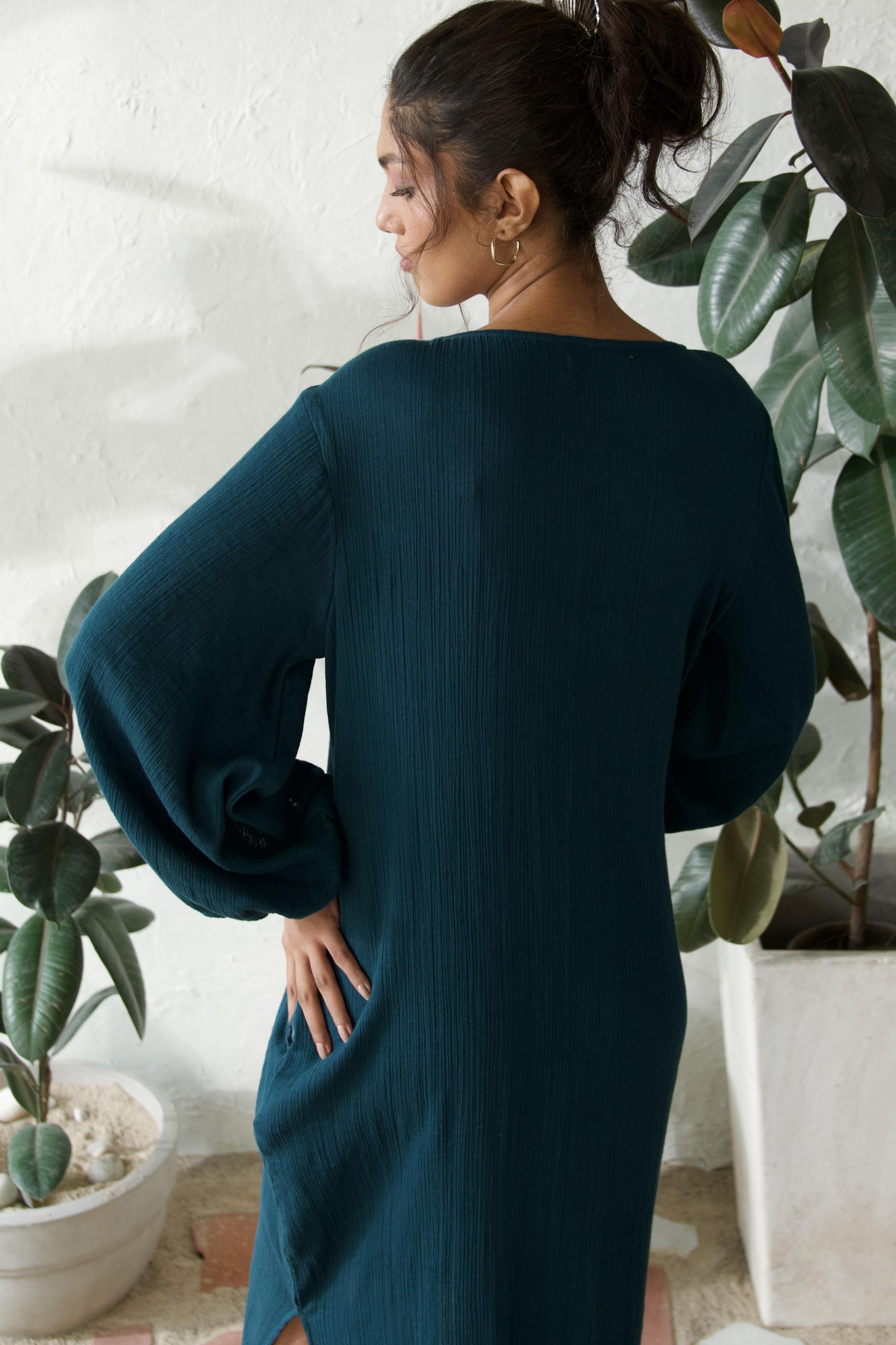 Step into effortless style with this crinkled, mid-length dress that brings a touch of boho charm to your wardrobe. The playful balloon sleeves give it a carefree, free-spirited vibe, while the crinkled texture adds a relaxed, lived-in feel. Designed for those easy-breezy days, this dress flows beautifully, making it perfect for everything from casual outings to simply lounging around. It's that go-to piece when you want to feel comfortable yet stylish, with just the right amount of laid-back elegance.