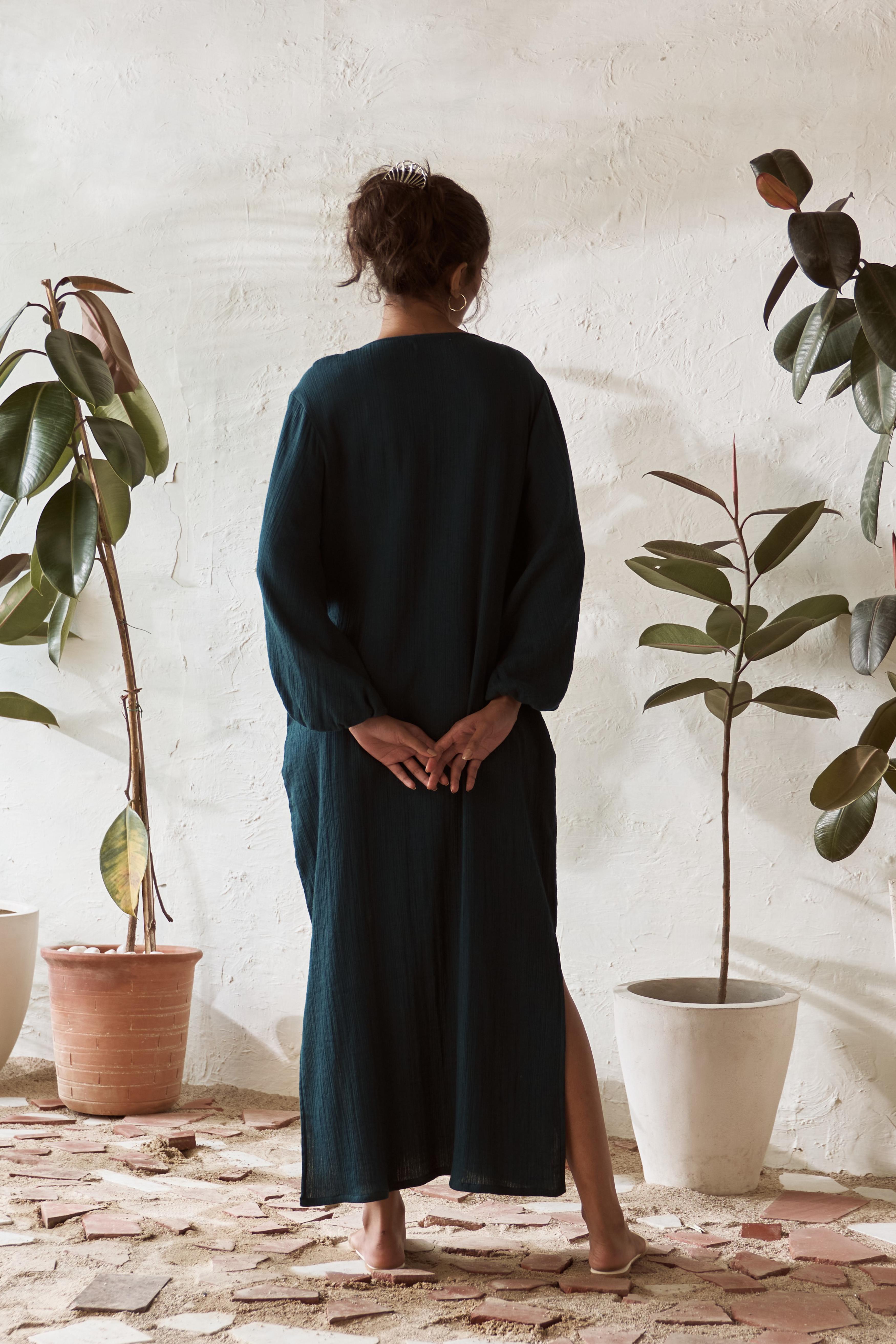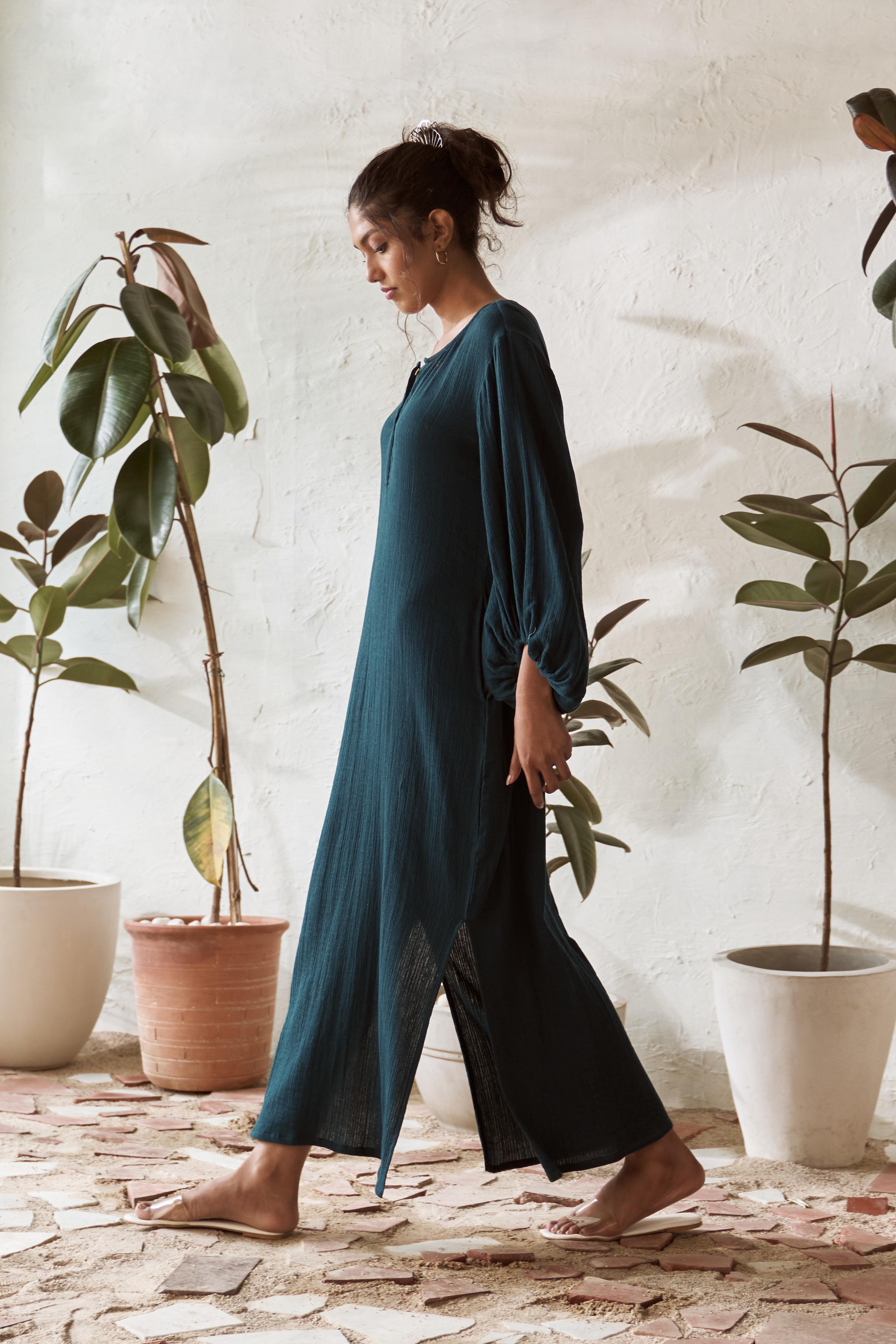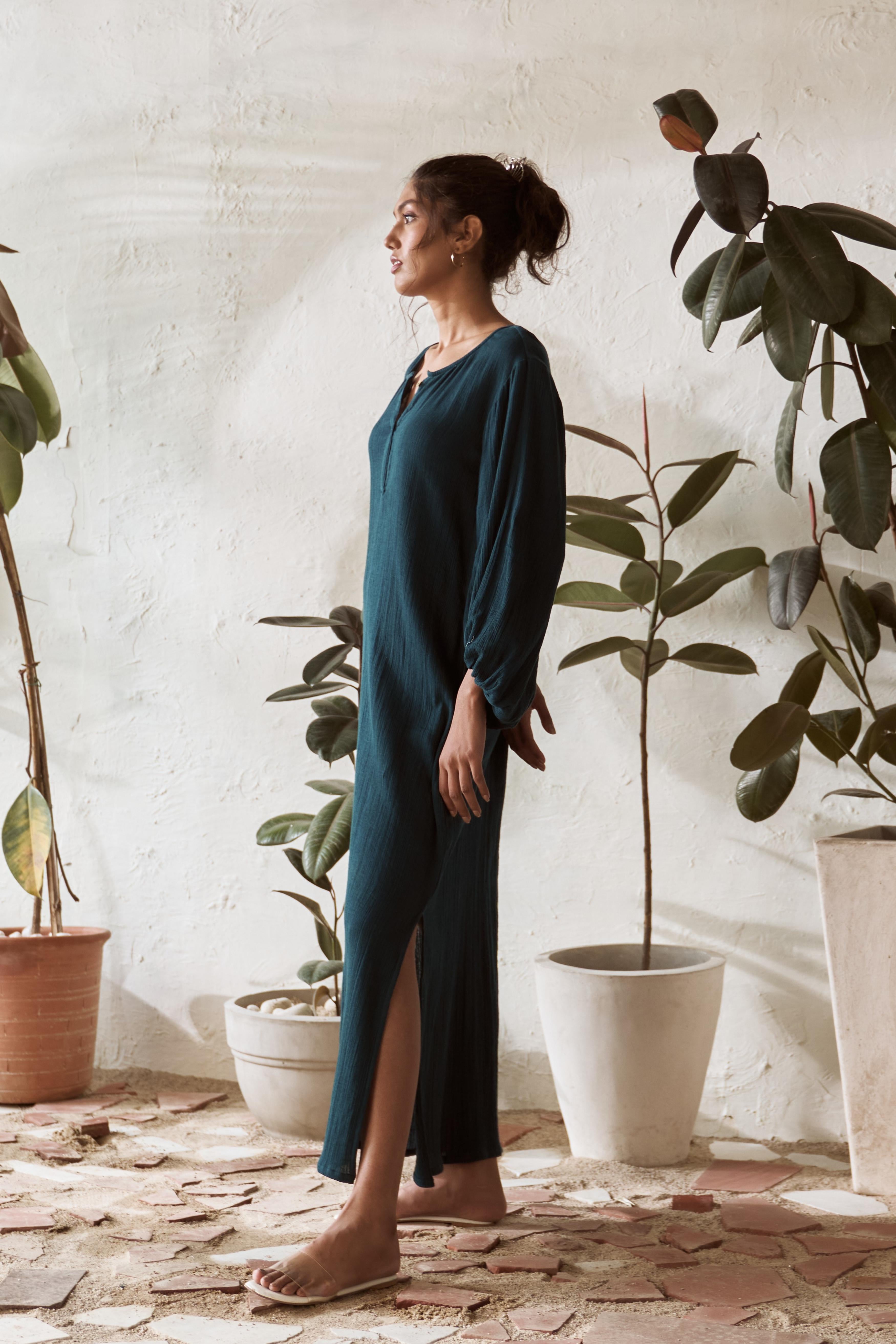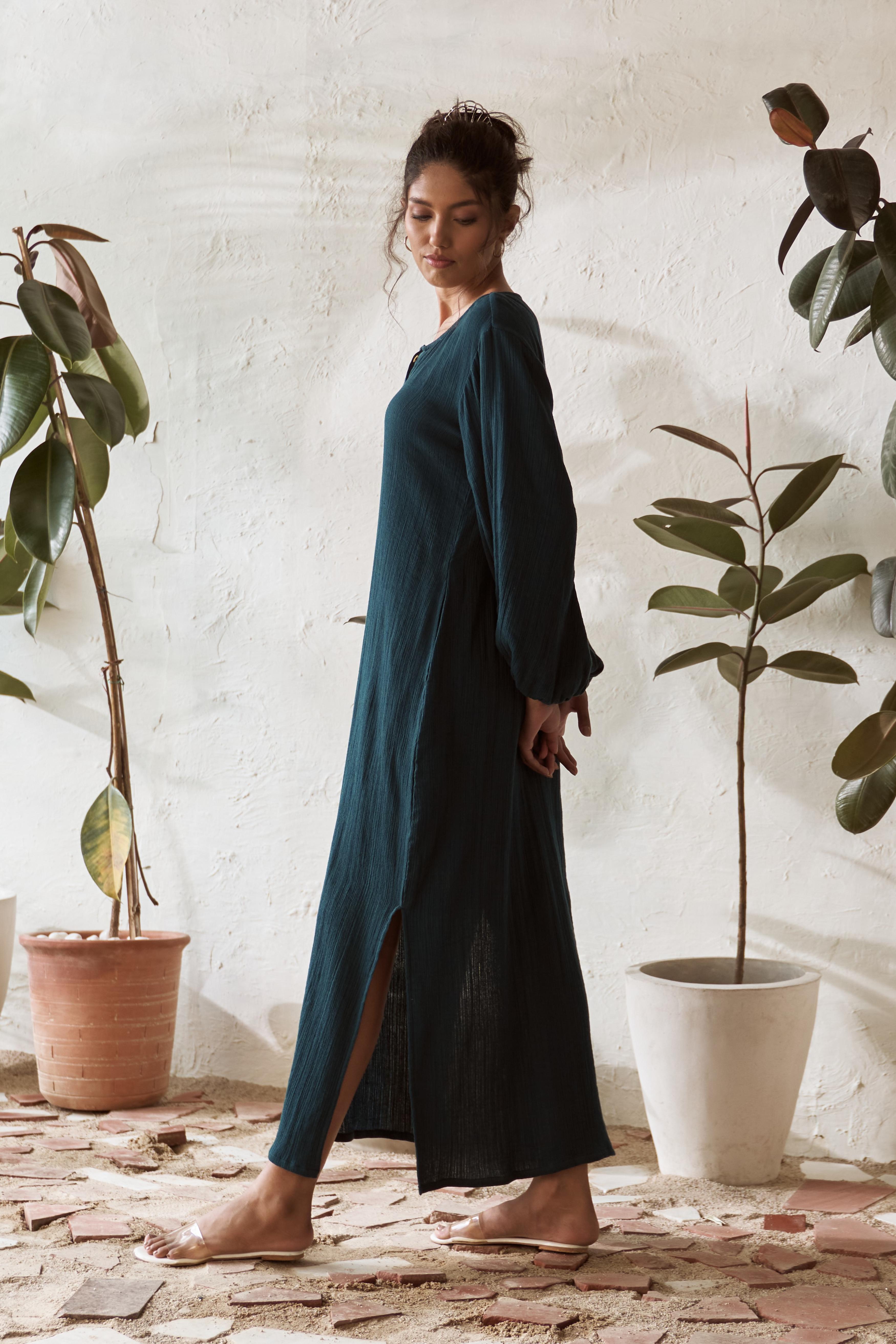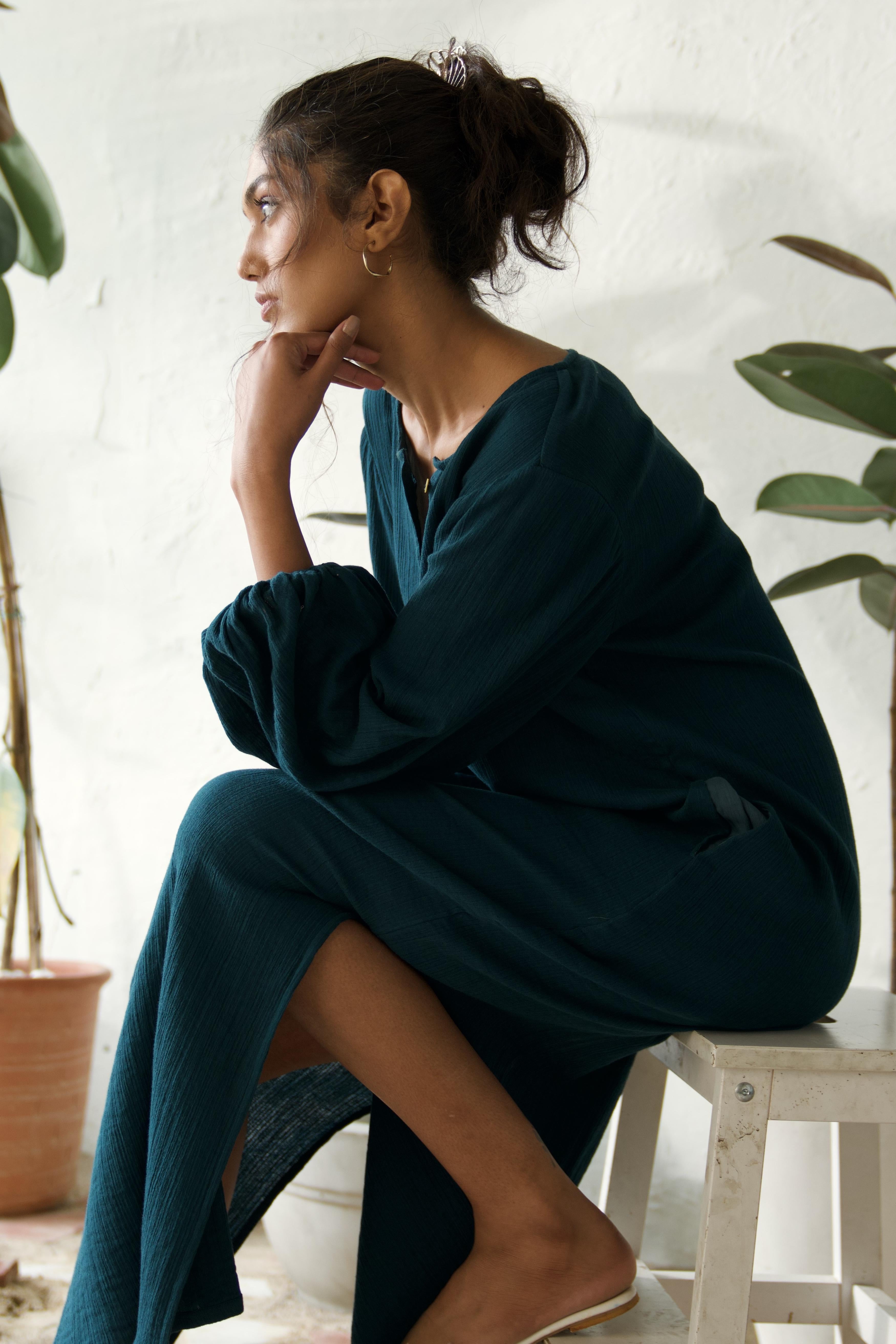Step into effortless style with this crinkled, mid-length dress that brings a touch of boho charm to your wardrobe. The playful balloon sleeves give it a carefree, free-spirited vibe, while the crinkled texture adds a relaxed, lived-in feel. Designed for those easy-breezy days, this dress flows beautifully, making it perfect for everything from casual outings to simply lounging around. It's that go-to piece when you want to feel comfortable yet stylish, with just the right amount of laid-back elegance.