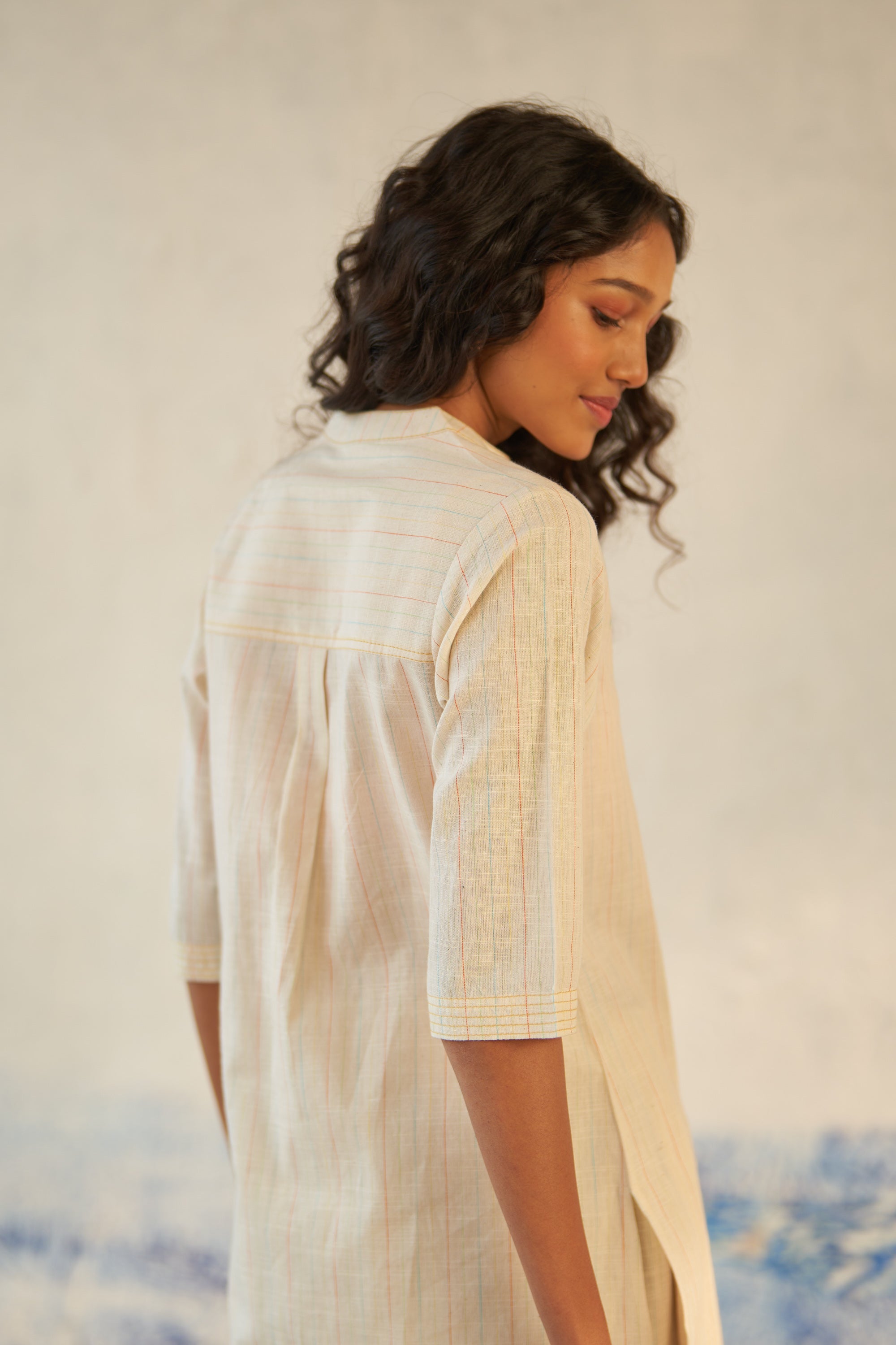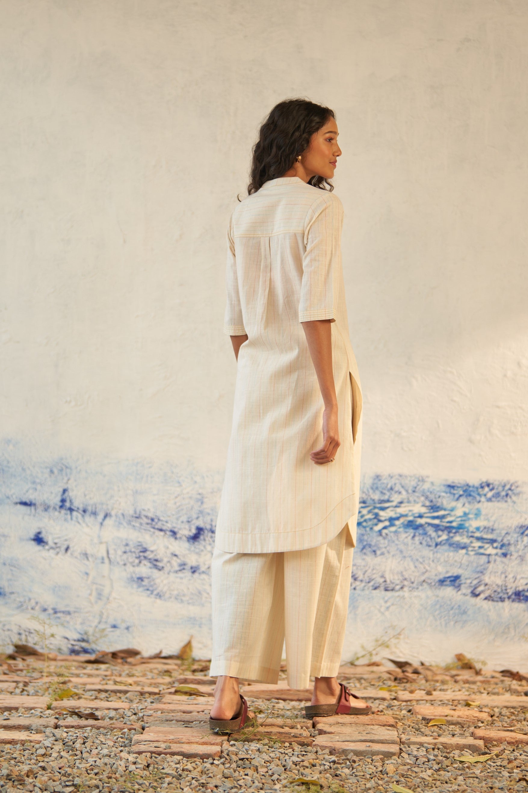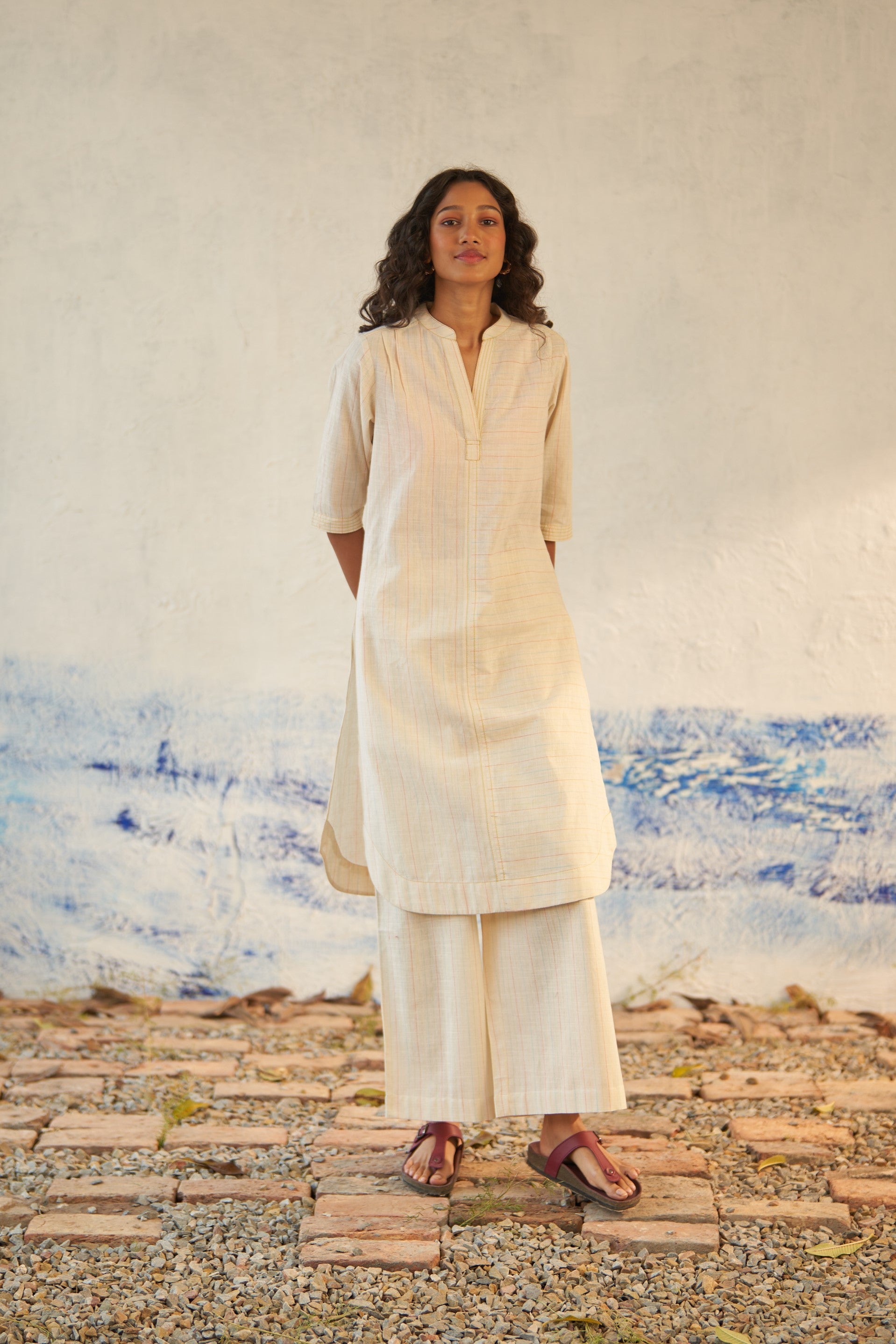 Crafted from lightweight cotton stripe, this versatile coord set is tailored for comfort and ready for exploration on-the-go. With its relaxed yet stylish design, featuring a round hem and a band collar transitioning into a V neckline, along with playful blue stitch detailing throughout, this set effortlessly enhances your look. The addition of pleated bottoms ensures maximum comfort, allowing you to roam freely and embrace every adventure with a cool and laid-back vibe.