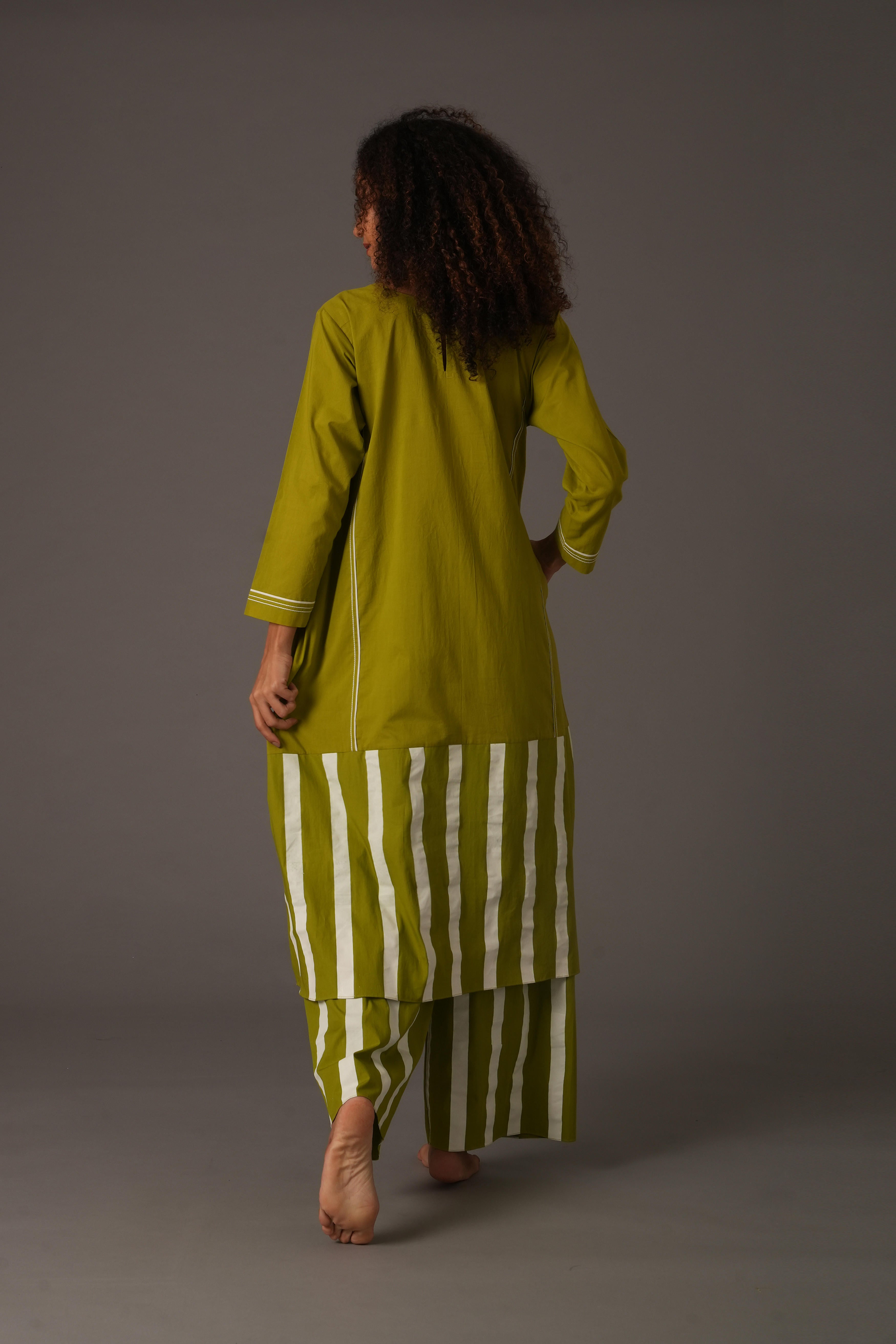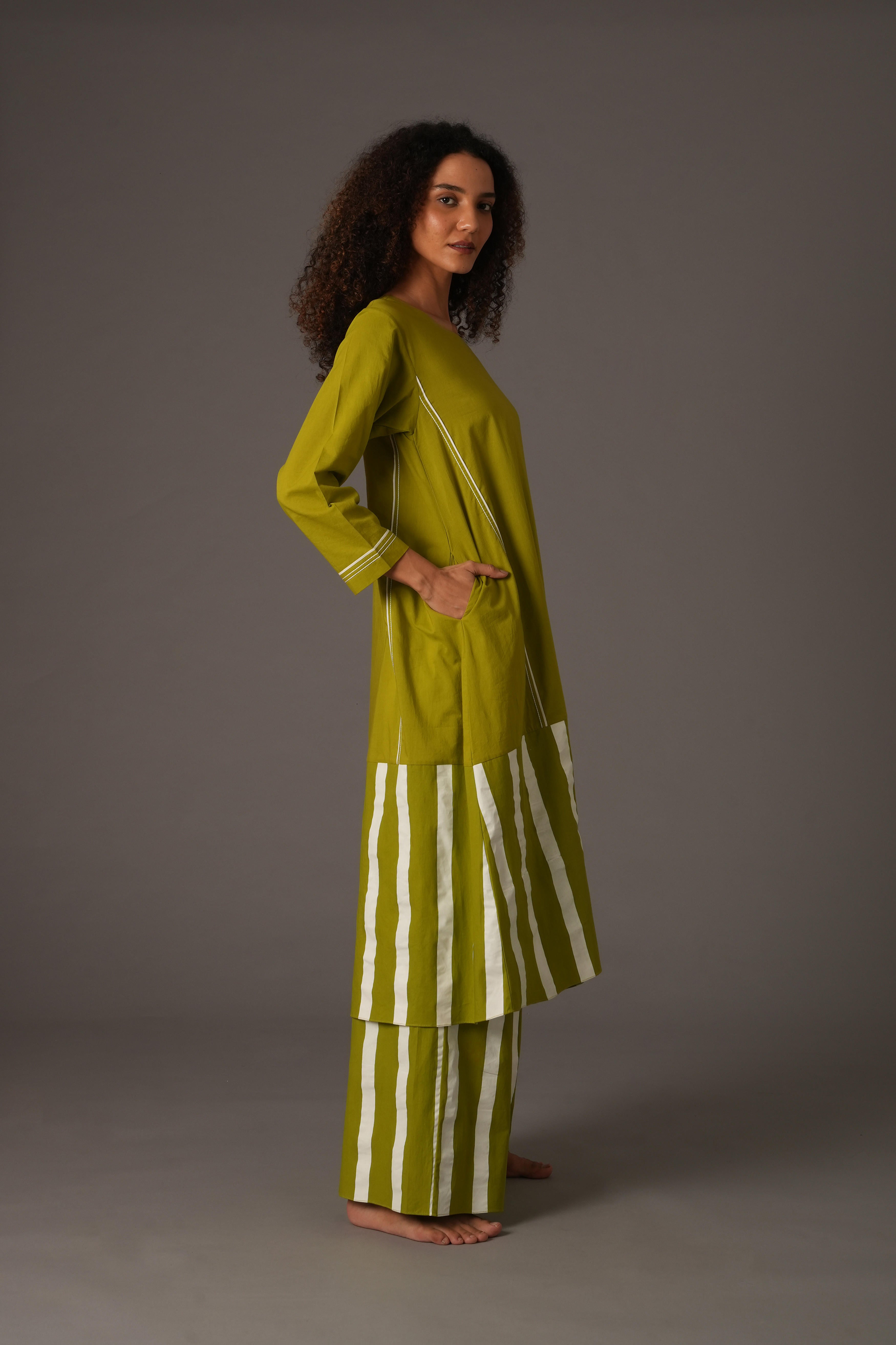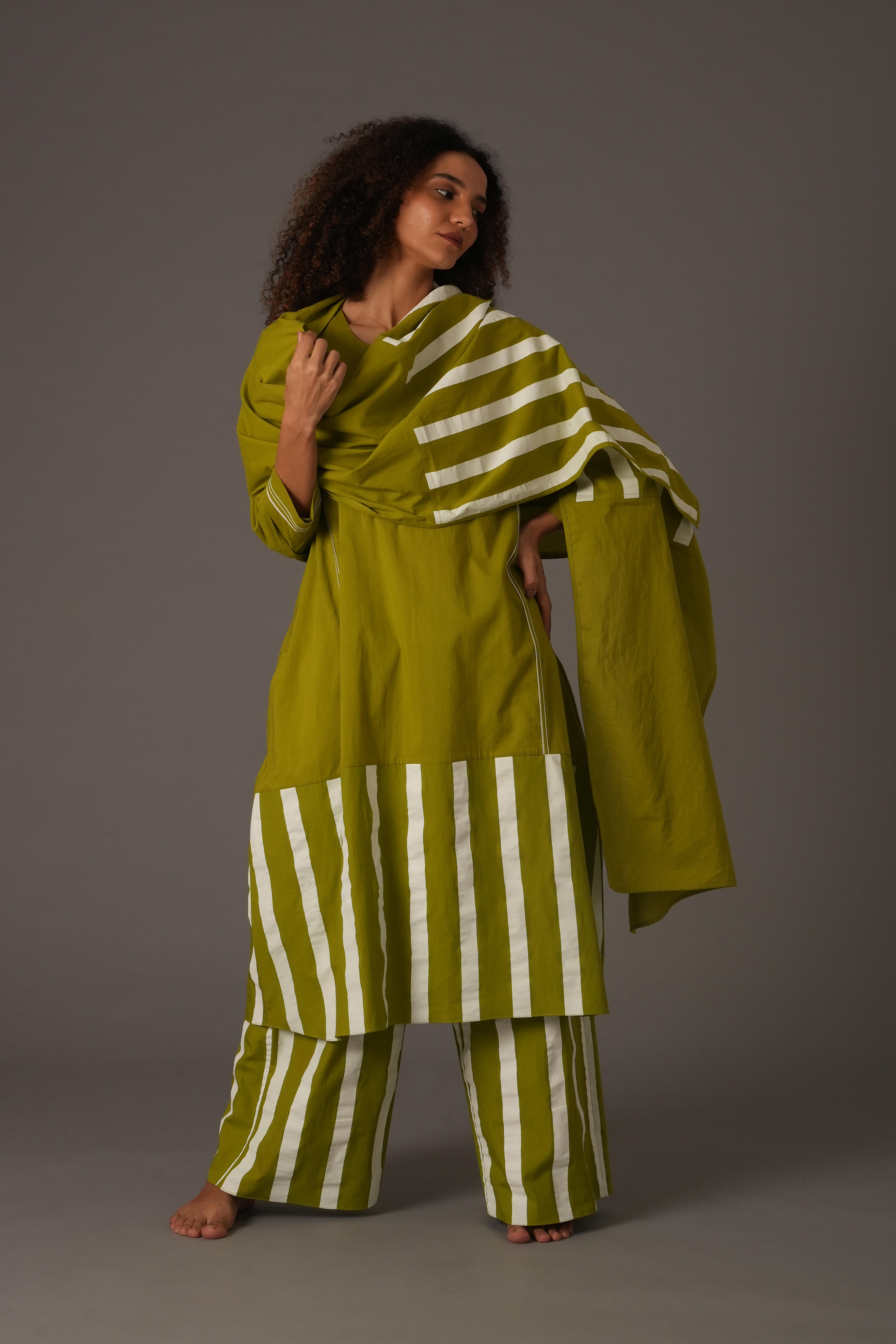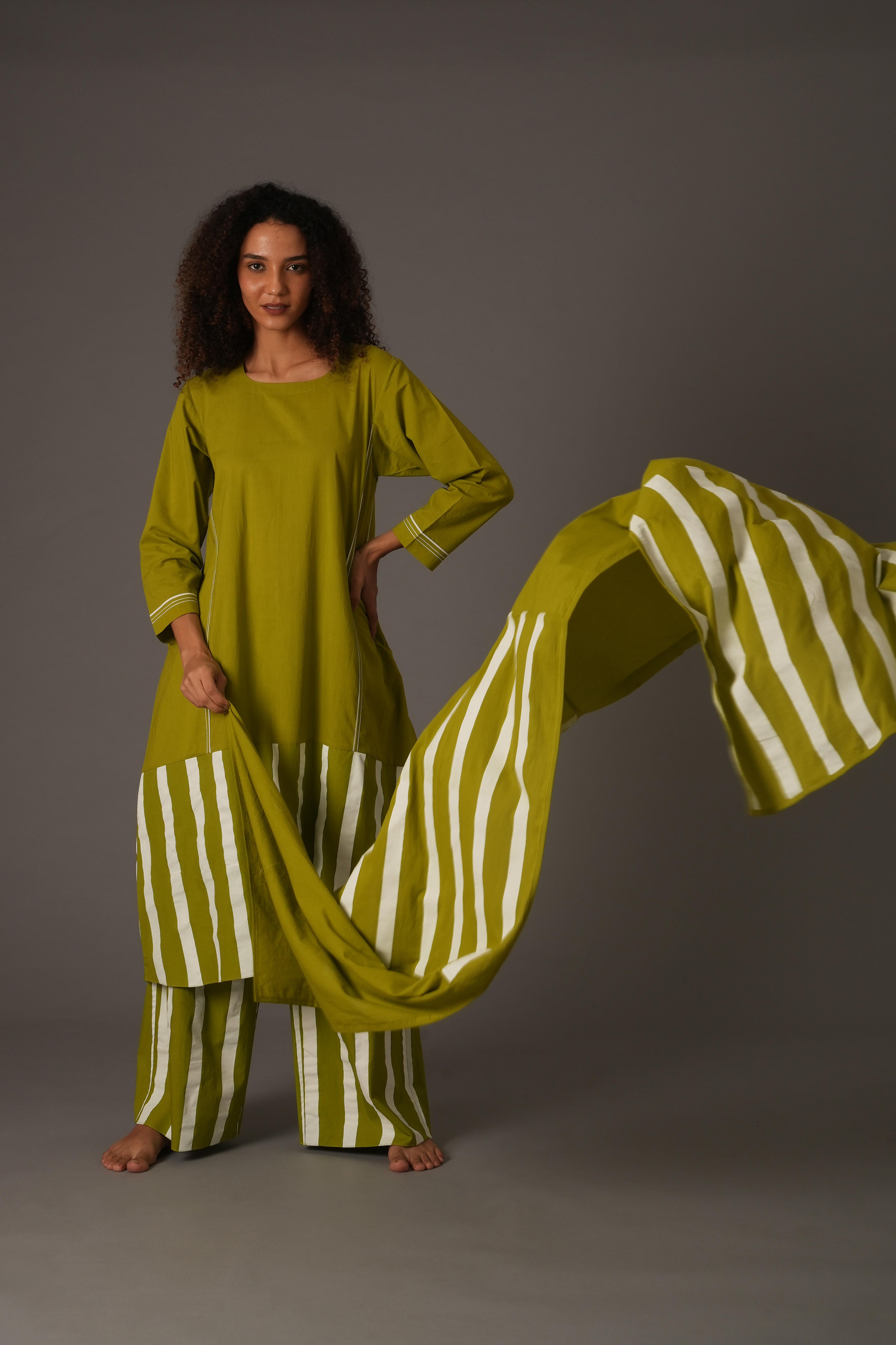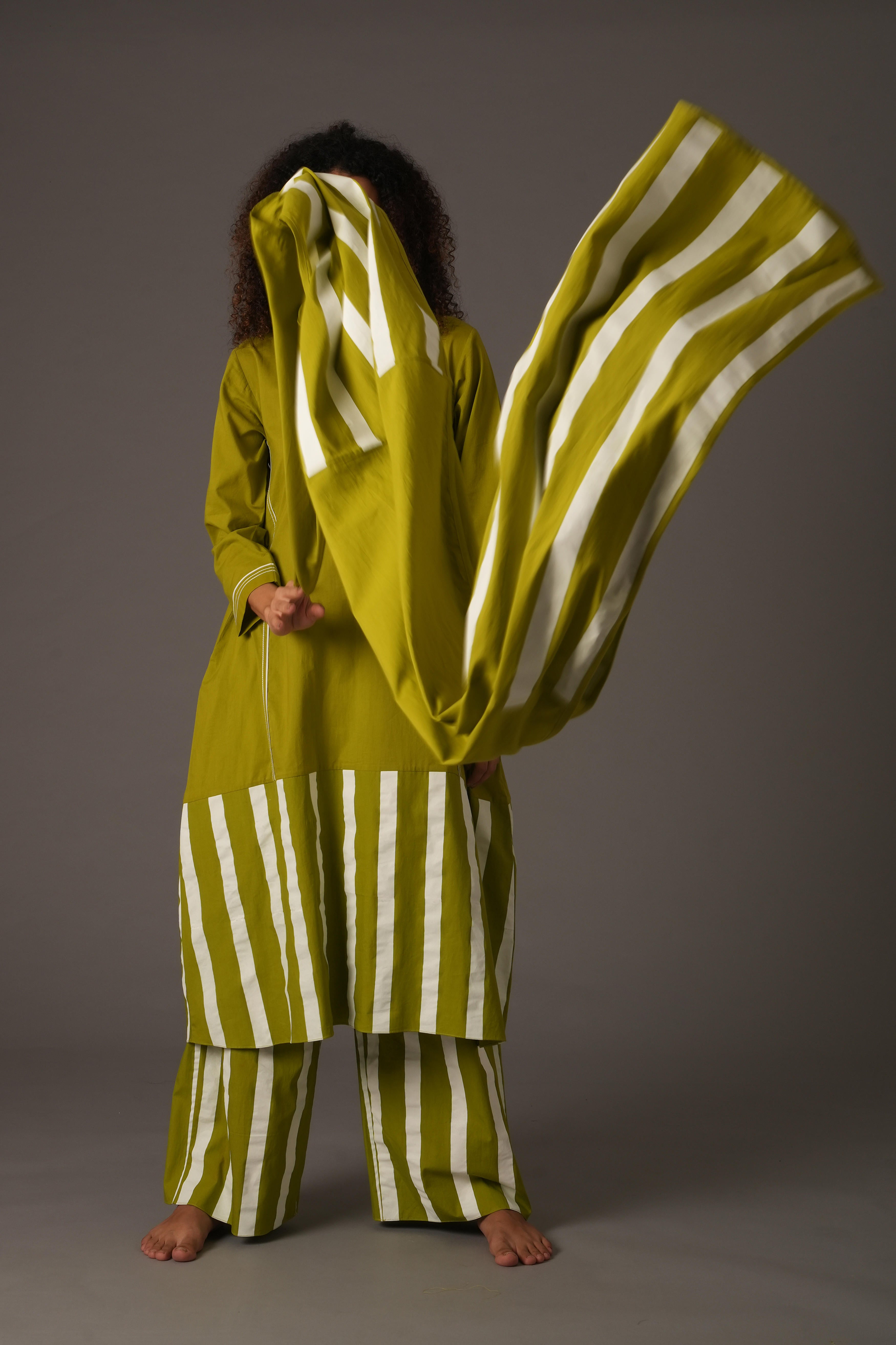 This Mul & Poplin set in a vibrant green features a 44-inch full-length dress, 38-inch pants, and an elegant scarf. The 19-inch long sleeves are accented with 1.25-inch stripes for a modern touch. The loose fit provides comfort and breathability, while the scarf (with a length of 82 inches and width of 25 inches) completes the chic look. Our model, standing 5'8", is wearing a size S.