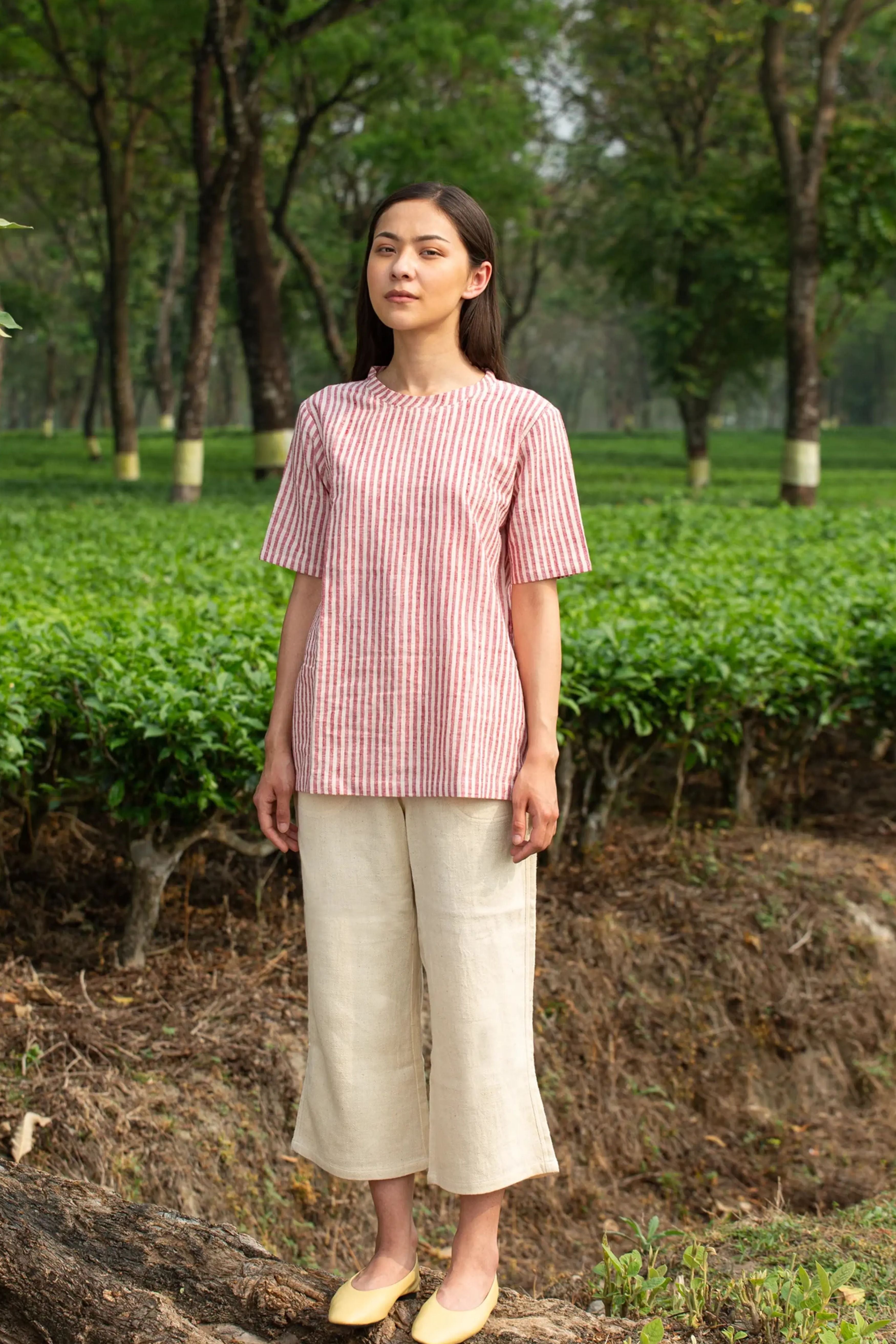We believe that thoughtfully designed clothing should stand the test of the time and make your every day special. This minimalistic top pays homage to the classic Red & White stripes and gives you opportunities to express your personal style in a subtle way. The neckline is round but flattering. The sleeves are sharp and the side slit button up detailing is functional and pretty. The hemlines are long and short to make it edgy yet comfortable when you bend down.
