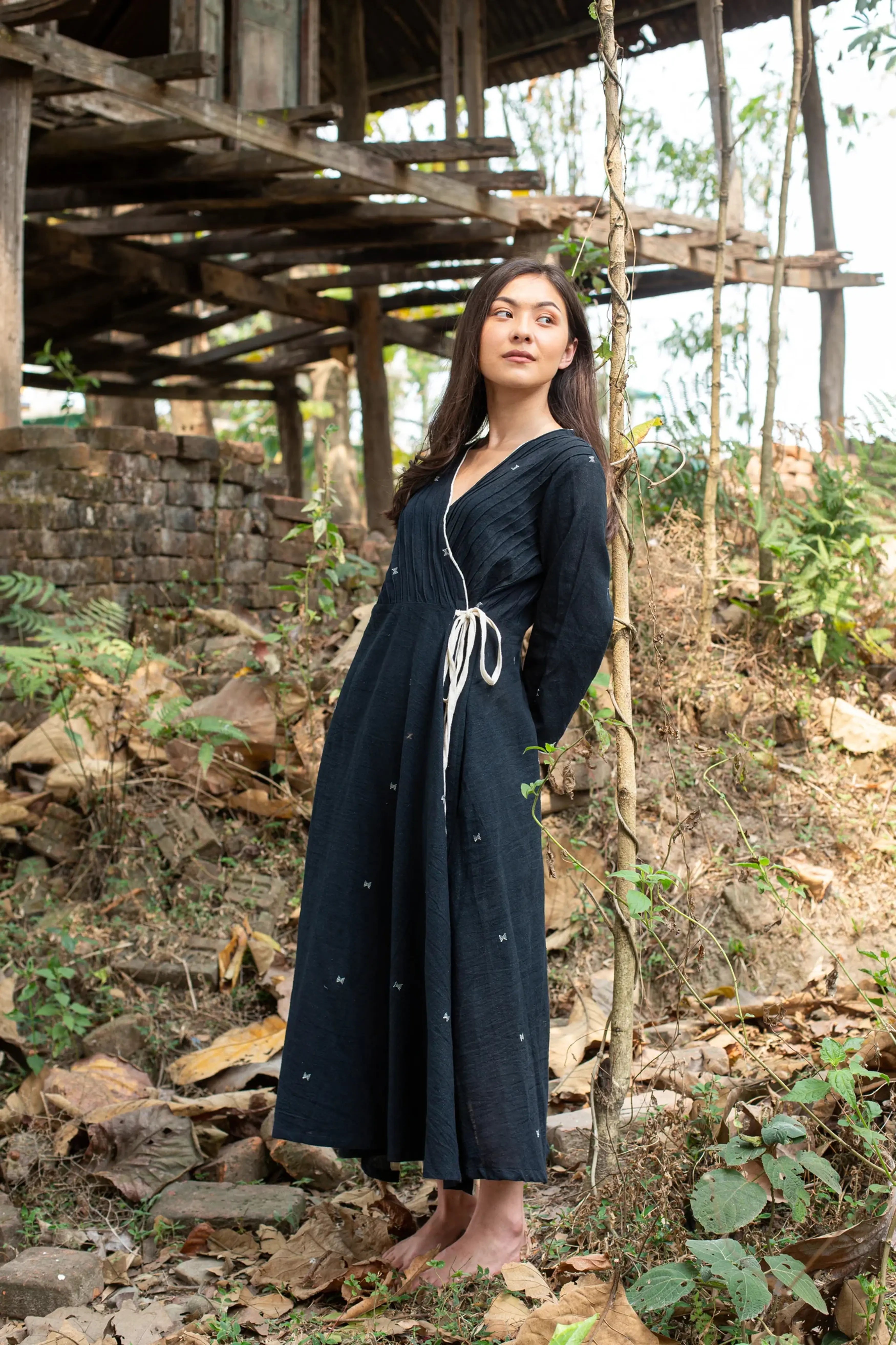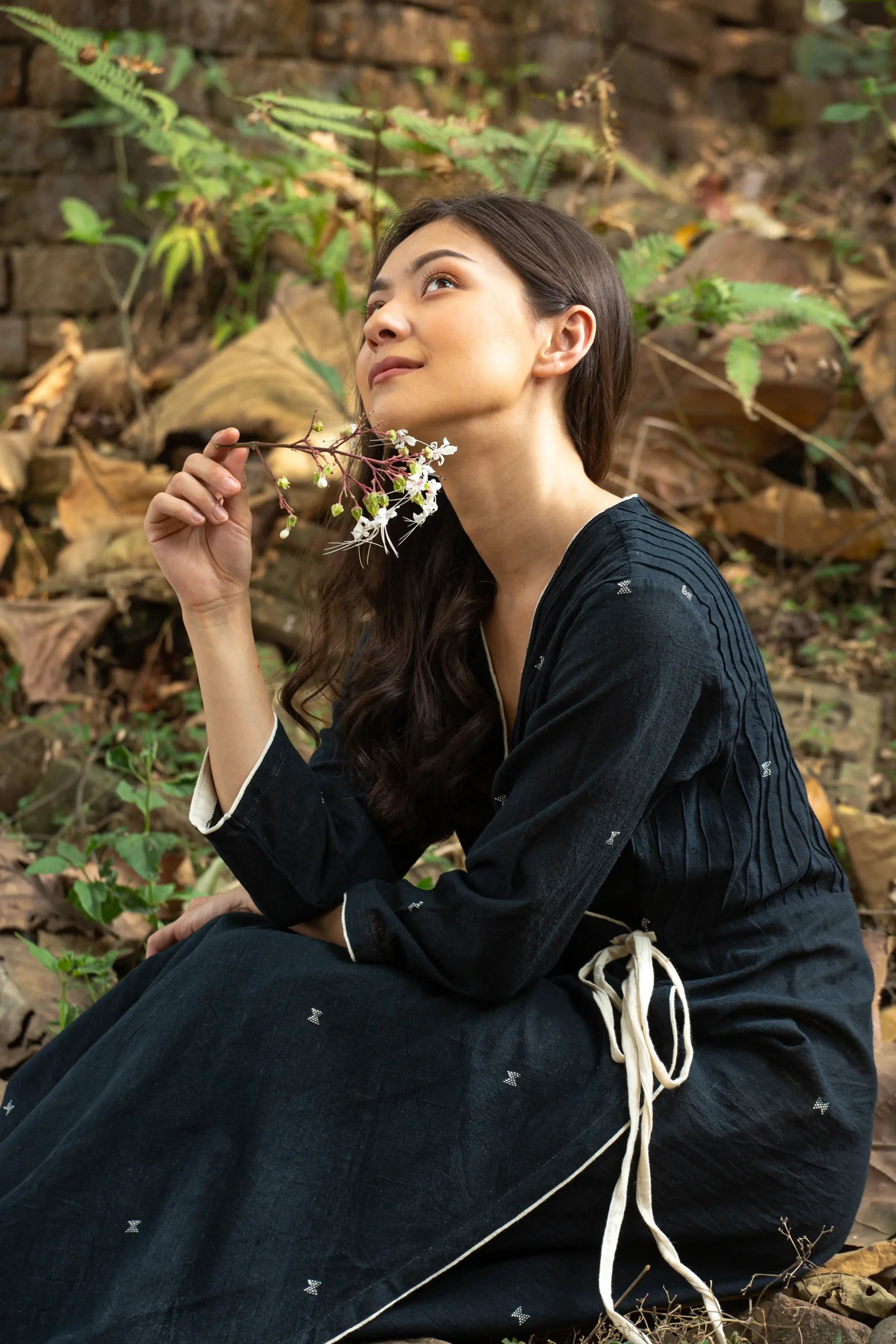 The Tiri Tiri dress is a black wrap-style dress that falls to a midi length, reaching just below the knees. A key feature is the intricate **pintex detailing** on the left side of the bodice, creating a pleated texture. The dress has long sleeves and features delicate **Kutchi buti** (small embroidered motifs) scattered across the bodice. It is cinched at the waist with a **contrasting beige tie belt**, which wraps around the body and ties in a bow at the waist, adding a pop of color to the otherwise neutral garment. The neckline is a classic V-neck, created by the wrap style. The overall aesthetic is elegant and comfortable.