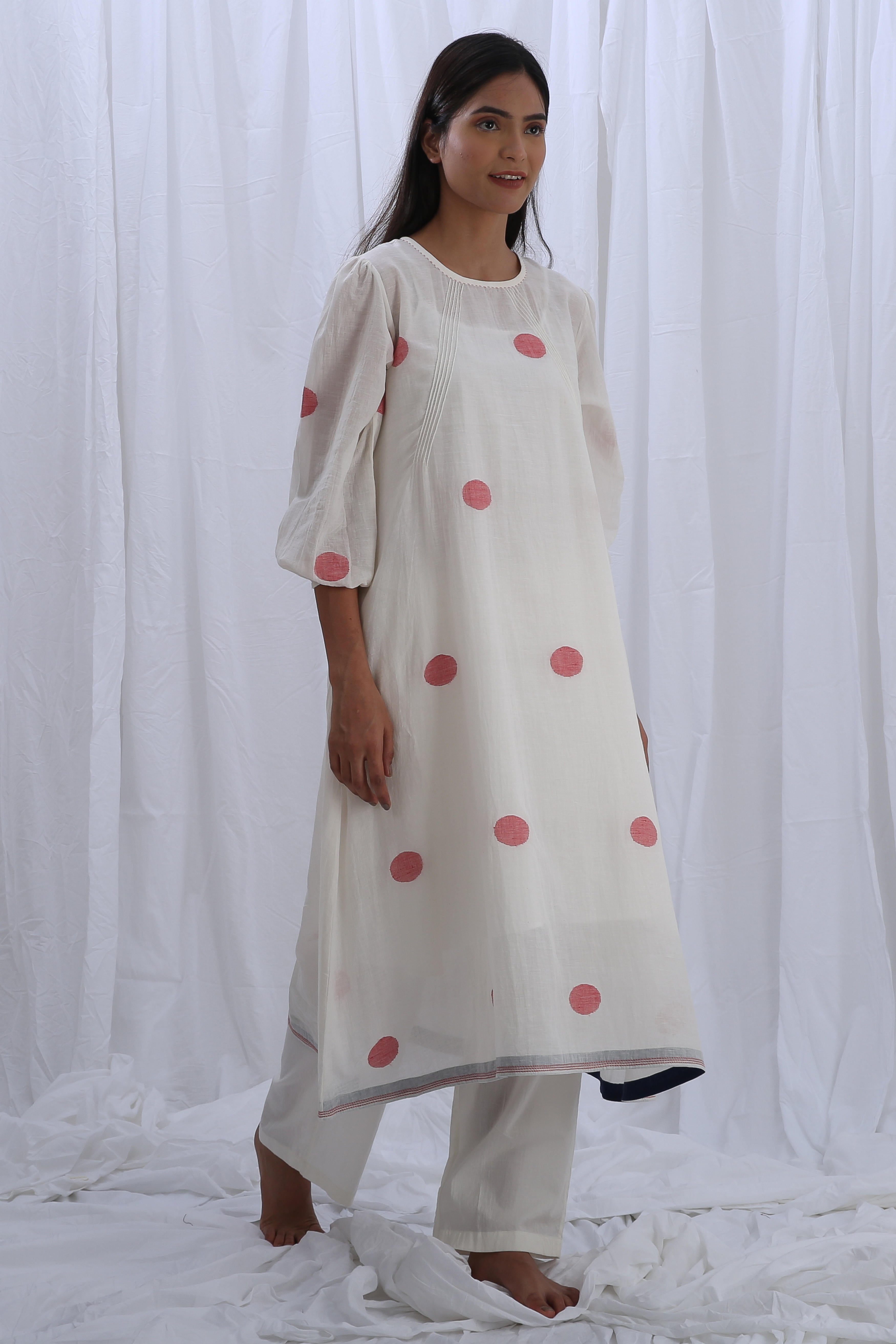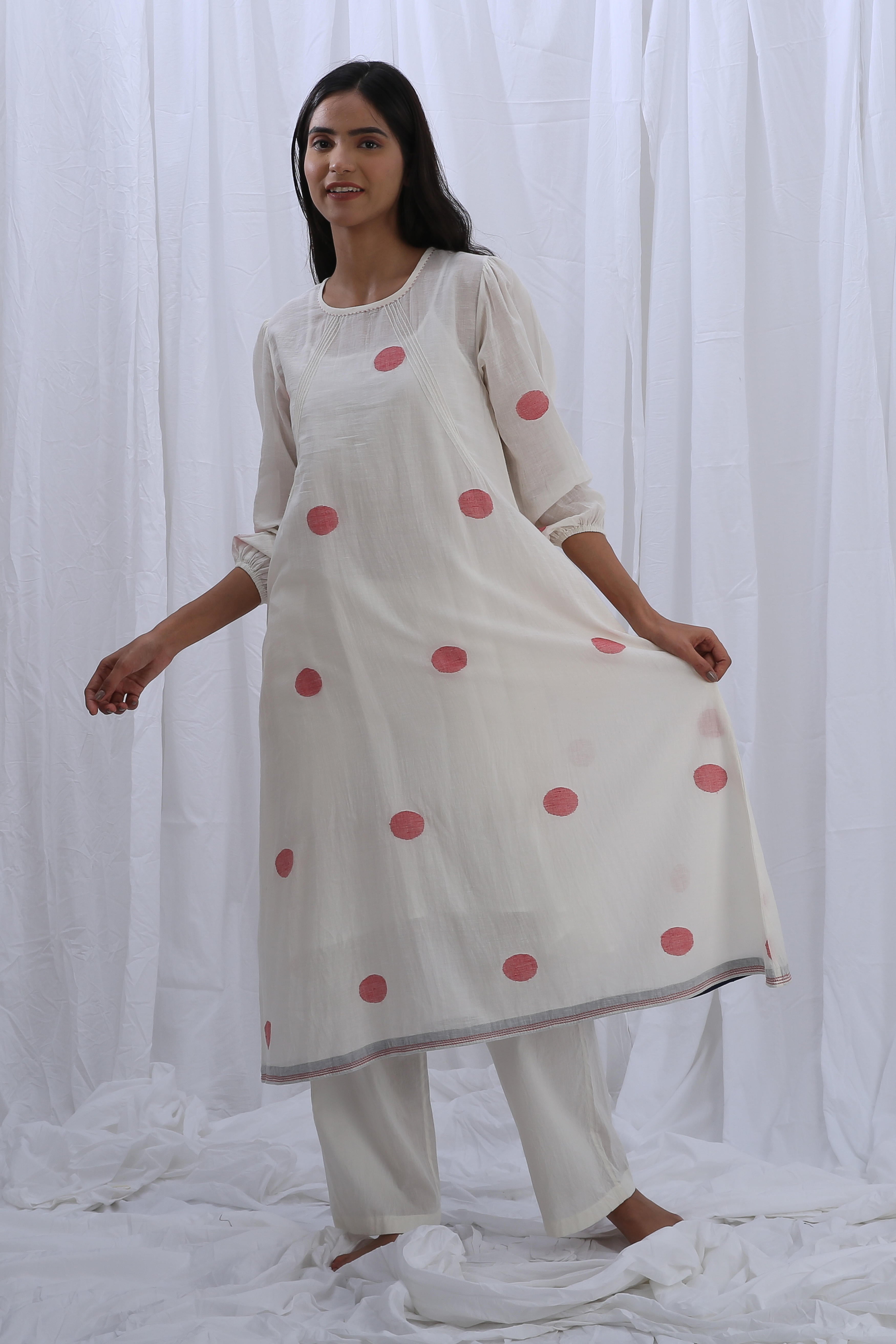 This elegant Handloom Cotton set in Bright White and Light Red Polka features piping and full embroidery on the bottom, giving it a chic and refined look. The Dress Length is 44 inches, and the Bottom Length is 38 inches. It also comes with a Slip for added comfort and style. Our model, who is 5'8", is wearing a size S.