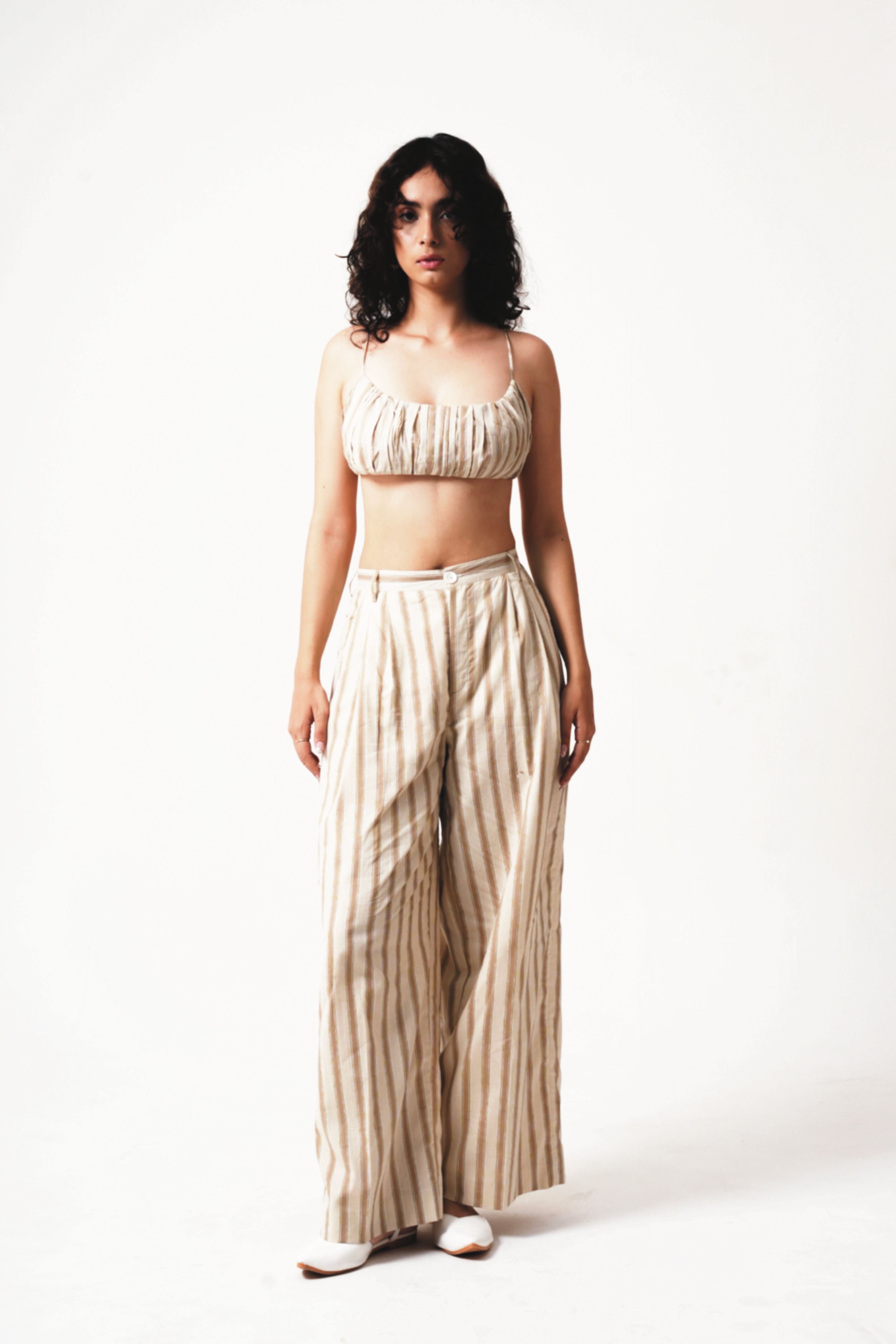 This cropped top balances structure with softness, featuring a sculpted fit, rounded neckline, and intricate front pleating. The airy, lightweight fabric drapes beautifully, while subtle vertical stripes lend a timeless appeal. Perfect for pairing with high-waisted trousers or layering under a blazer for a polished touch. Model is 5'8 and is wearing a size XS