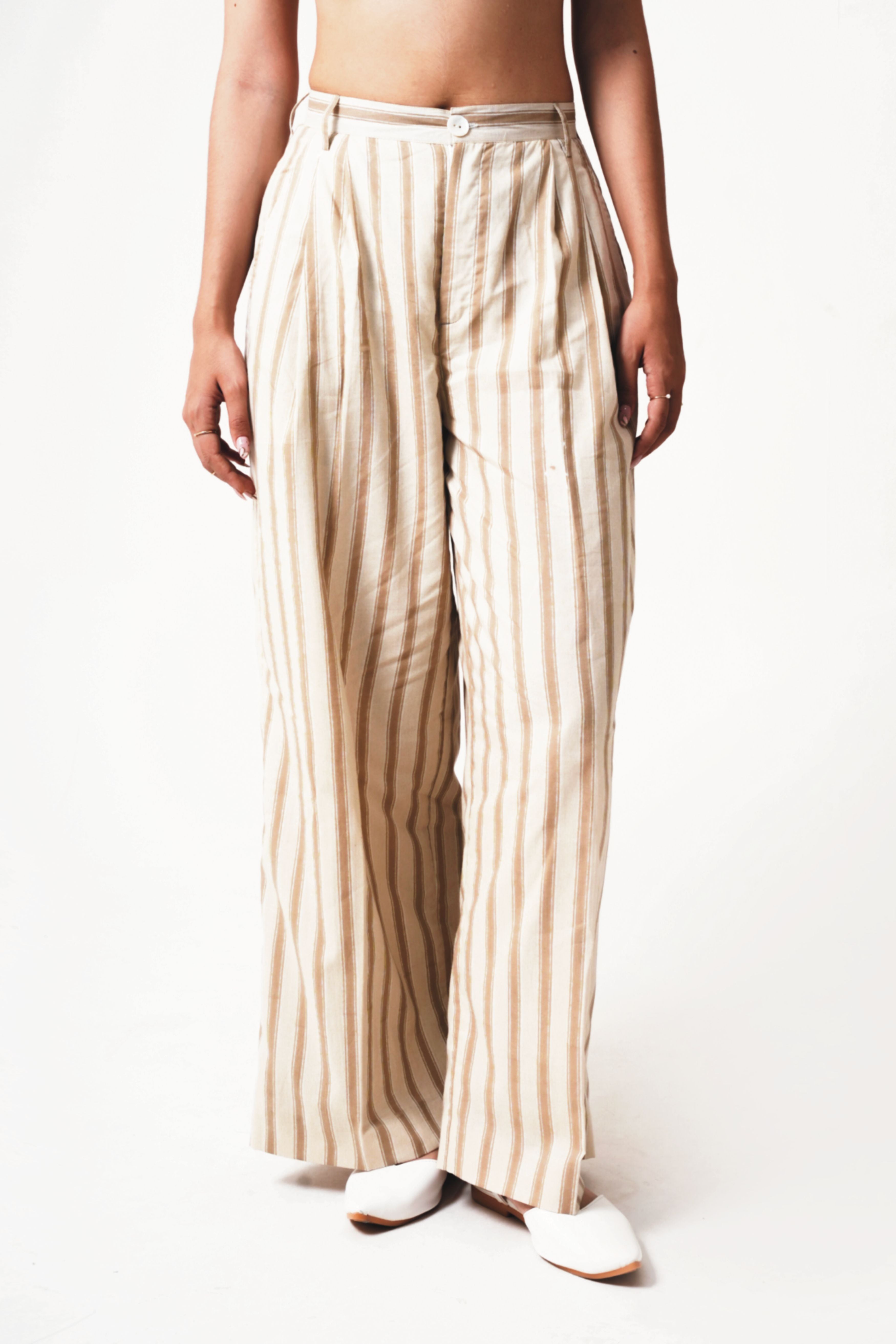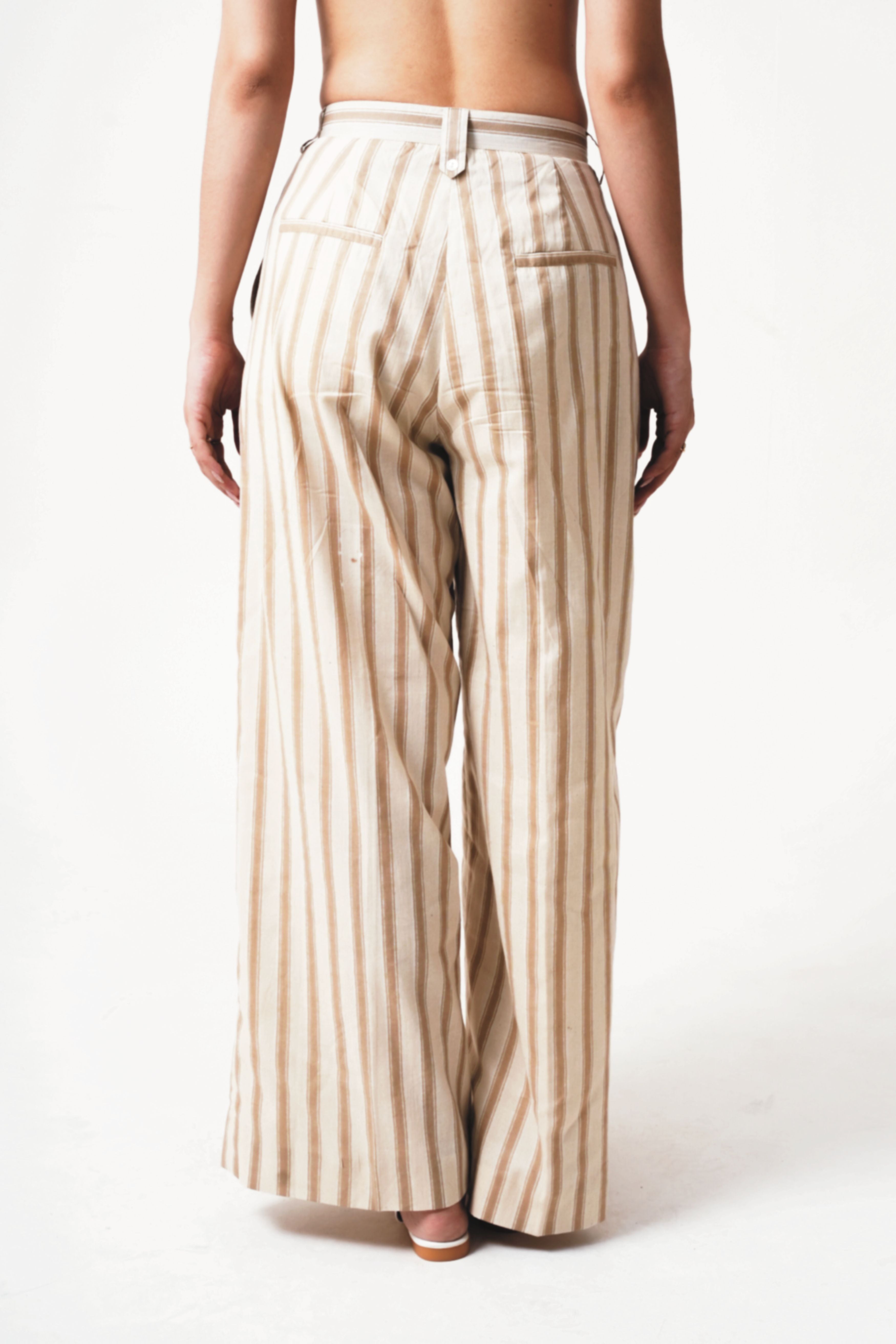These wide-leg pants offer a seamless fusion of comfort and elegance. Crafted from airy, lightweight fabric, they drape beautifully, allowing for effortless movement. The relaxed fit is complemented by an elastic waistband at the back, ensuring both style and ease. A subtle striped pattern enhances their refined aesthetic, making them the perfect match for the coordinating blazer or a versatile standalone piece. Model is 5'8 and is wearing a size XS
