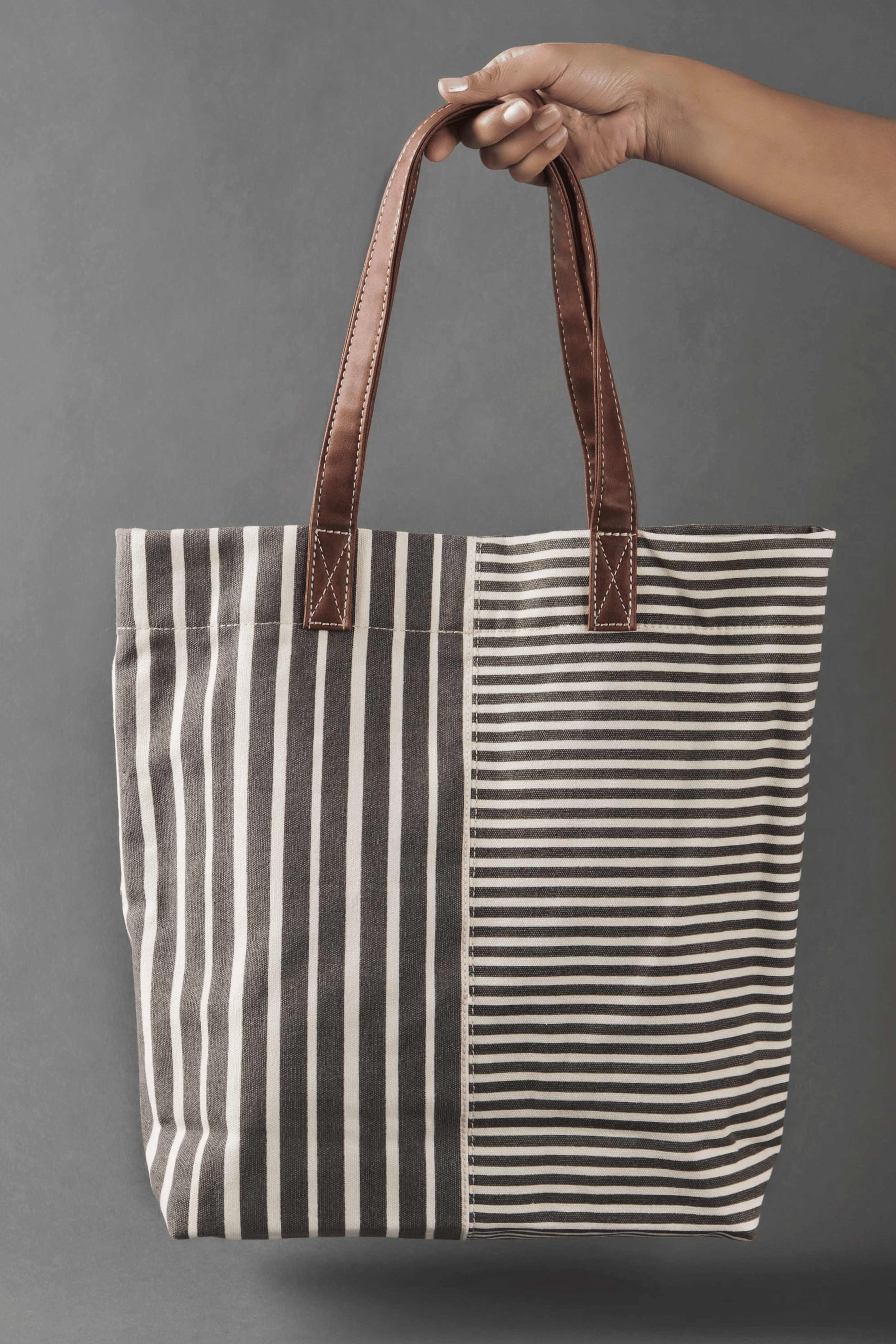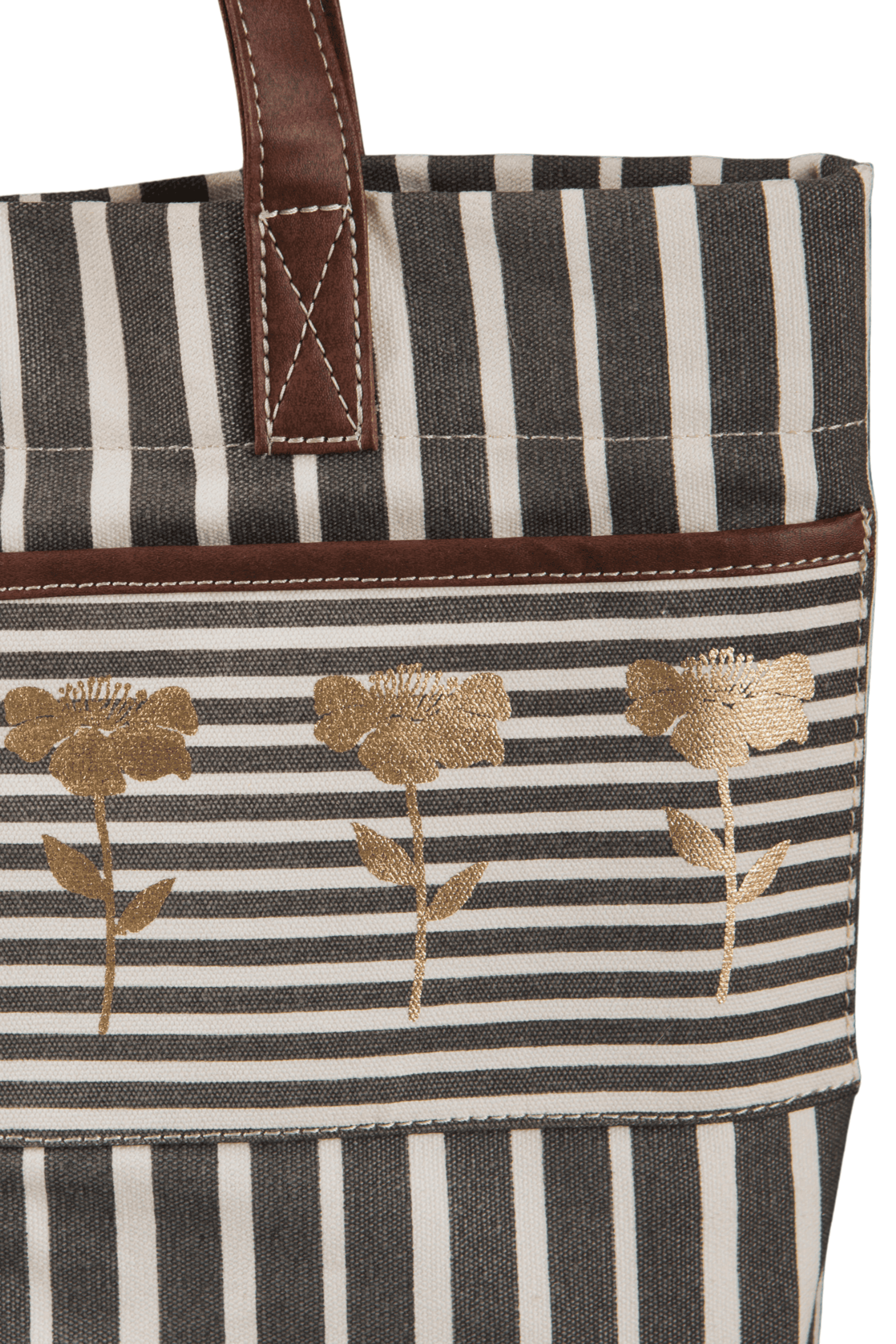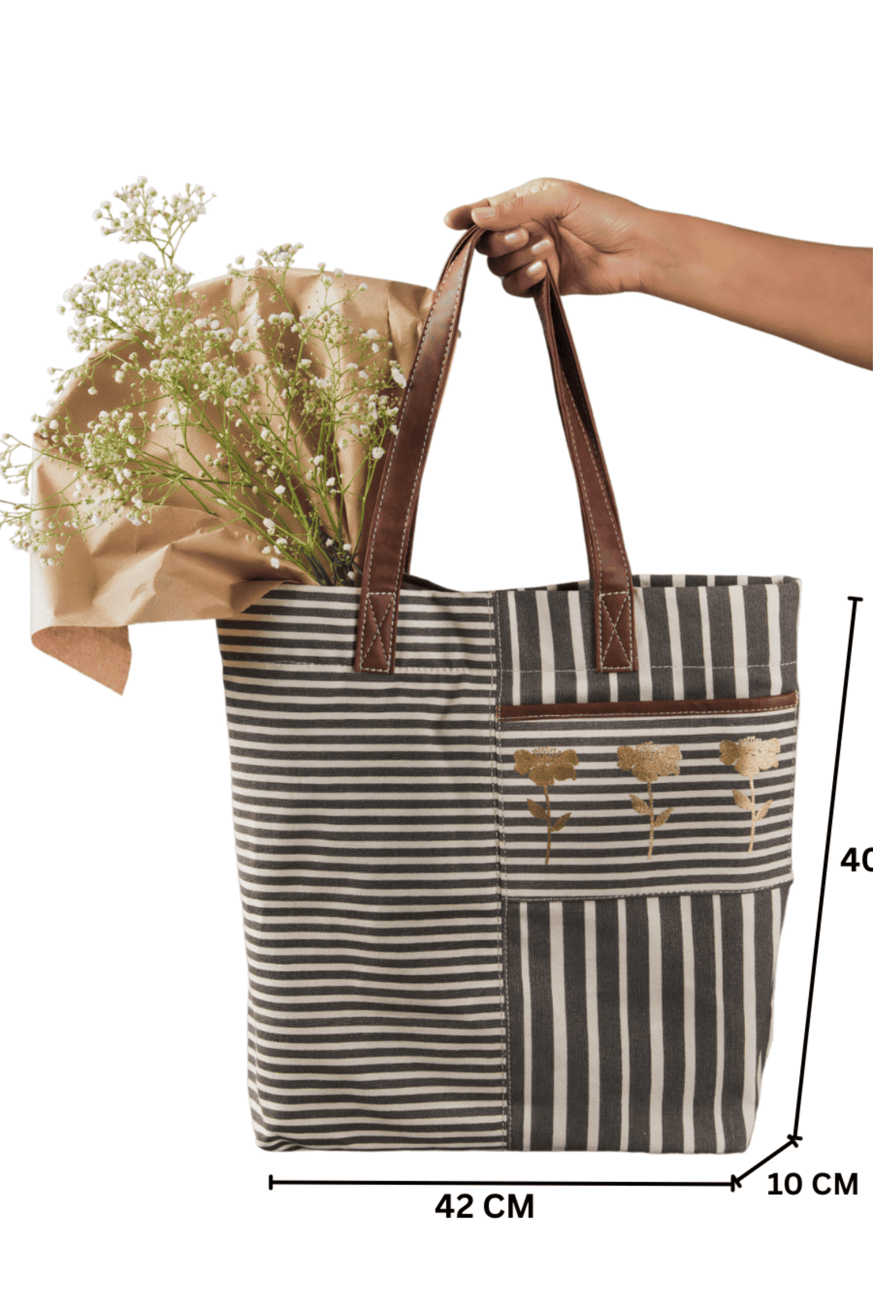 Constructed from durable and eco-friendly canvas material, this retro stripe tote bag is built to withstand the demands of your everyday life. Its sturdy construction ensures it can carry your essentials effortlessly, whether you're heading to the office, running errands, or enjoying a day at the beach. Features retro stripe design with gold floral print on the front and faux leather straps - perfect blend of fashion and practicality. The spacious interior of the tote bag provides ample room to accommodate your belongings. From books, laptops, and gym gear to groceries, picnic supplies, or a change of clothes, this bag has you covered. The large main compartment is complemented by convenient laptop compartment and an inner pocket with zipper closure, perfect for organizing smaller items like keys, wallets, or your phone. Bag closure is revised from snap button to zipper(YKK metal zip) closure as per customer's feedback.