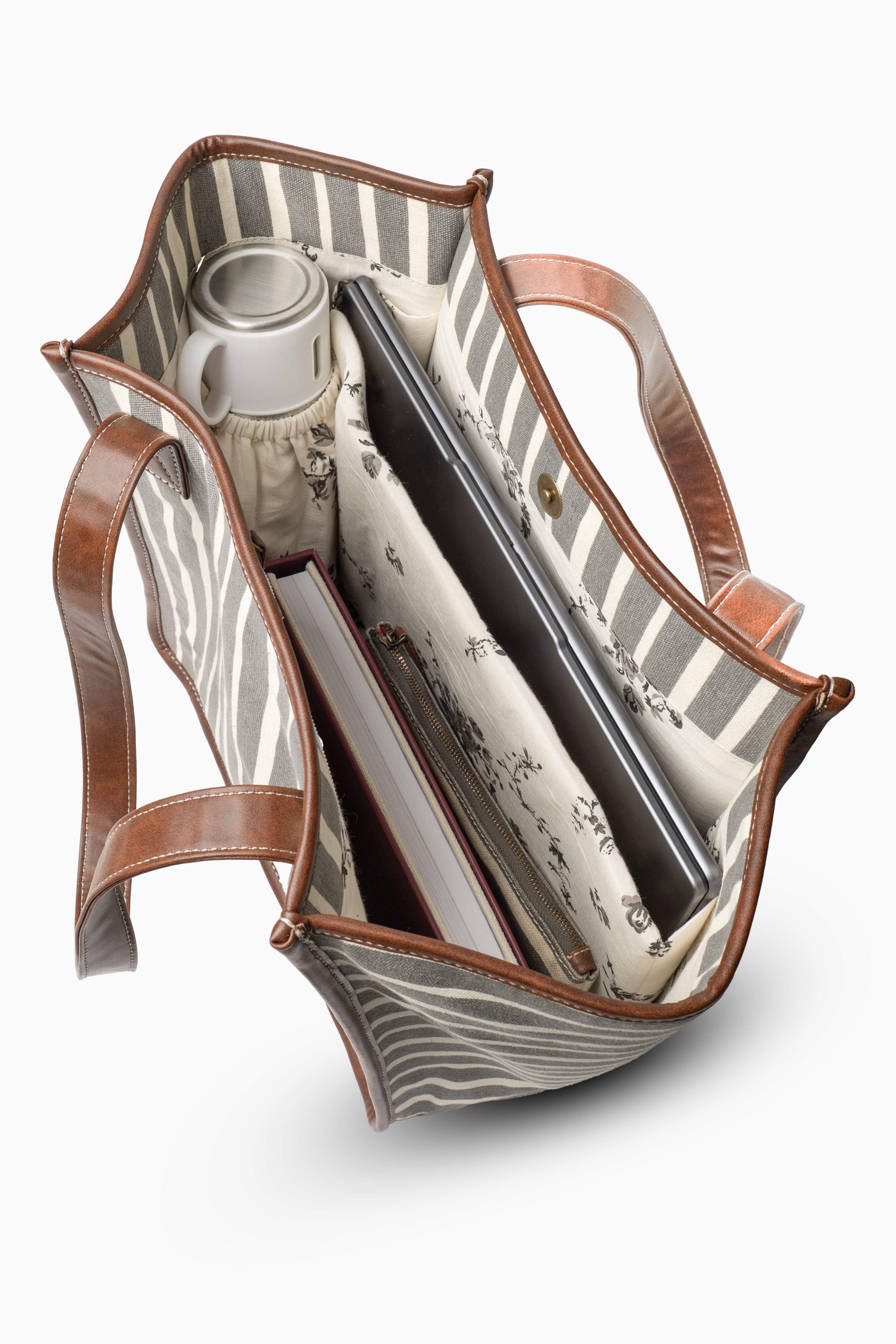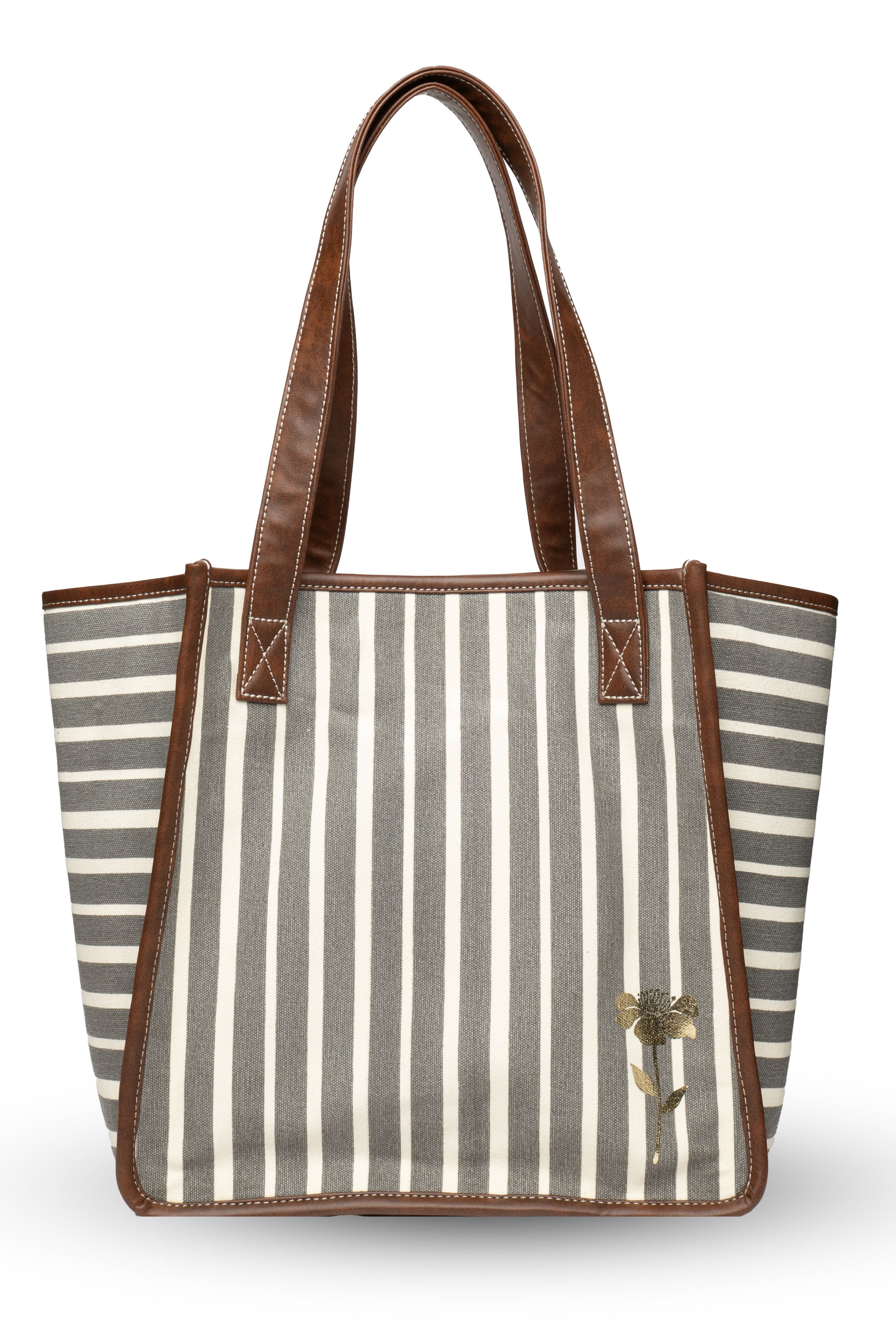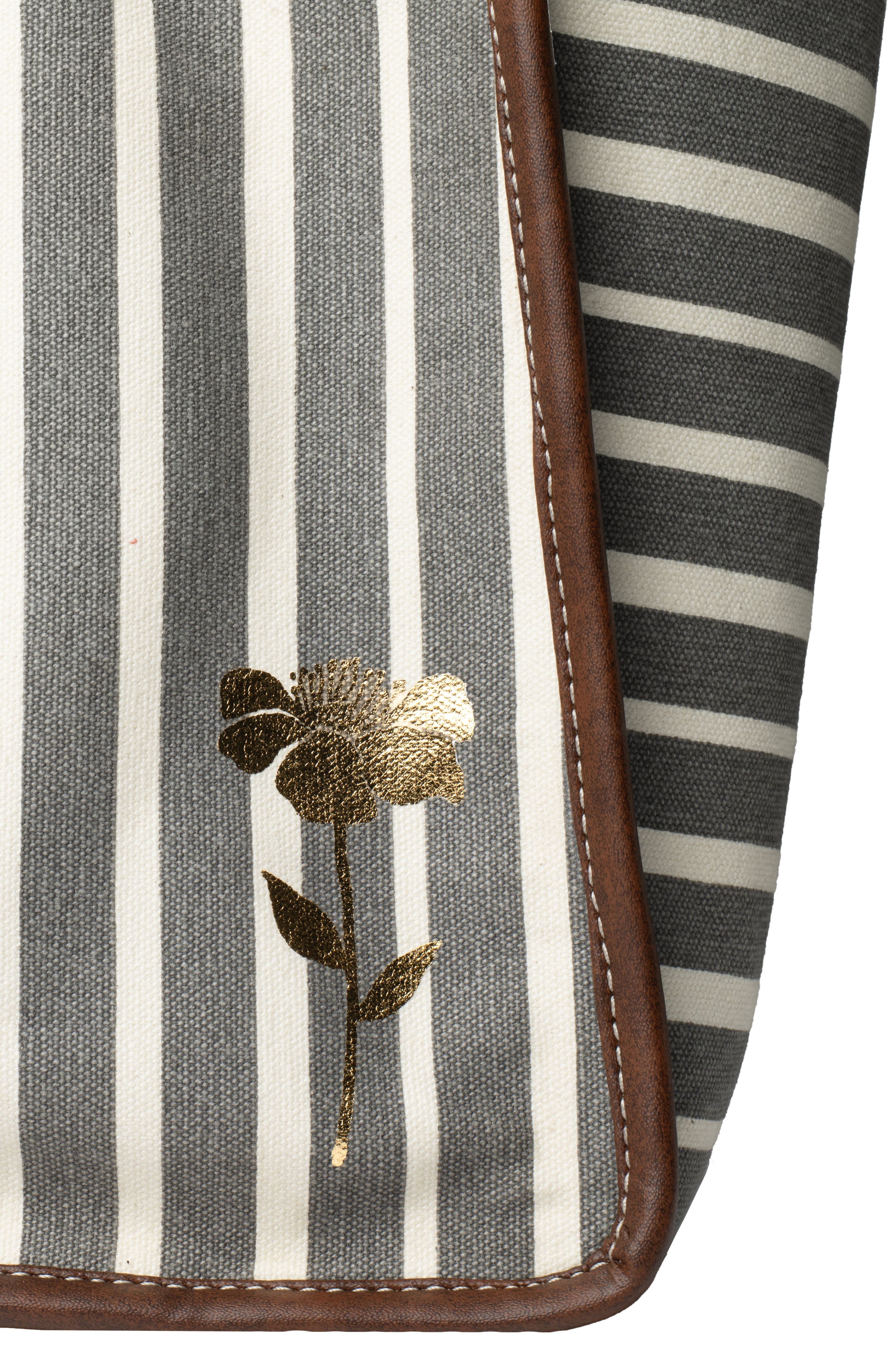 Designed for the modern woman on the go, this Retro Stripe Work Tote blends everyday functionality with elegant detailing. Crafted from 100% cotton canvas in a timeless stripe pattern, it is accentuated with a gold foil floral motif on the front, giving it a refined yet contemporary appeal. Key features: 1. Built-in padded laptop compartment (fits upto 14" laptop) & bottle holder 2. One inside zip pocket for valuables 3. Faux leather shoulder handles for comfort & durability 4. Printed cotton lining for a stylish touch