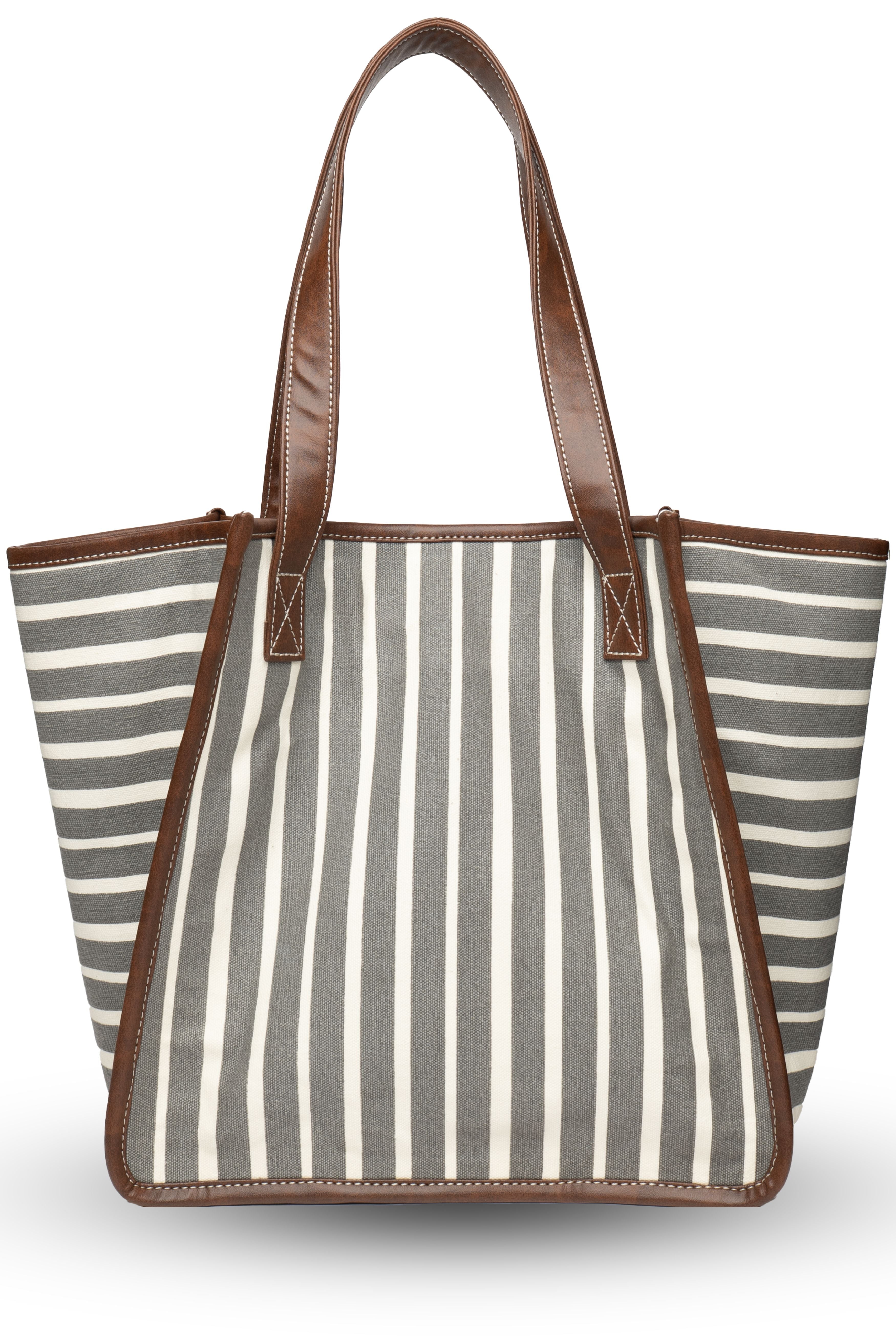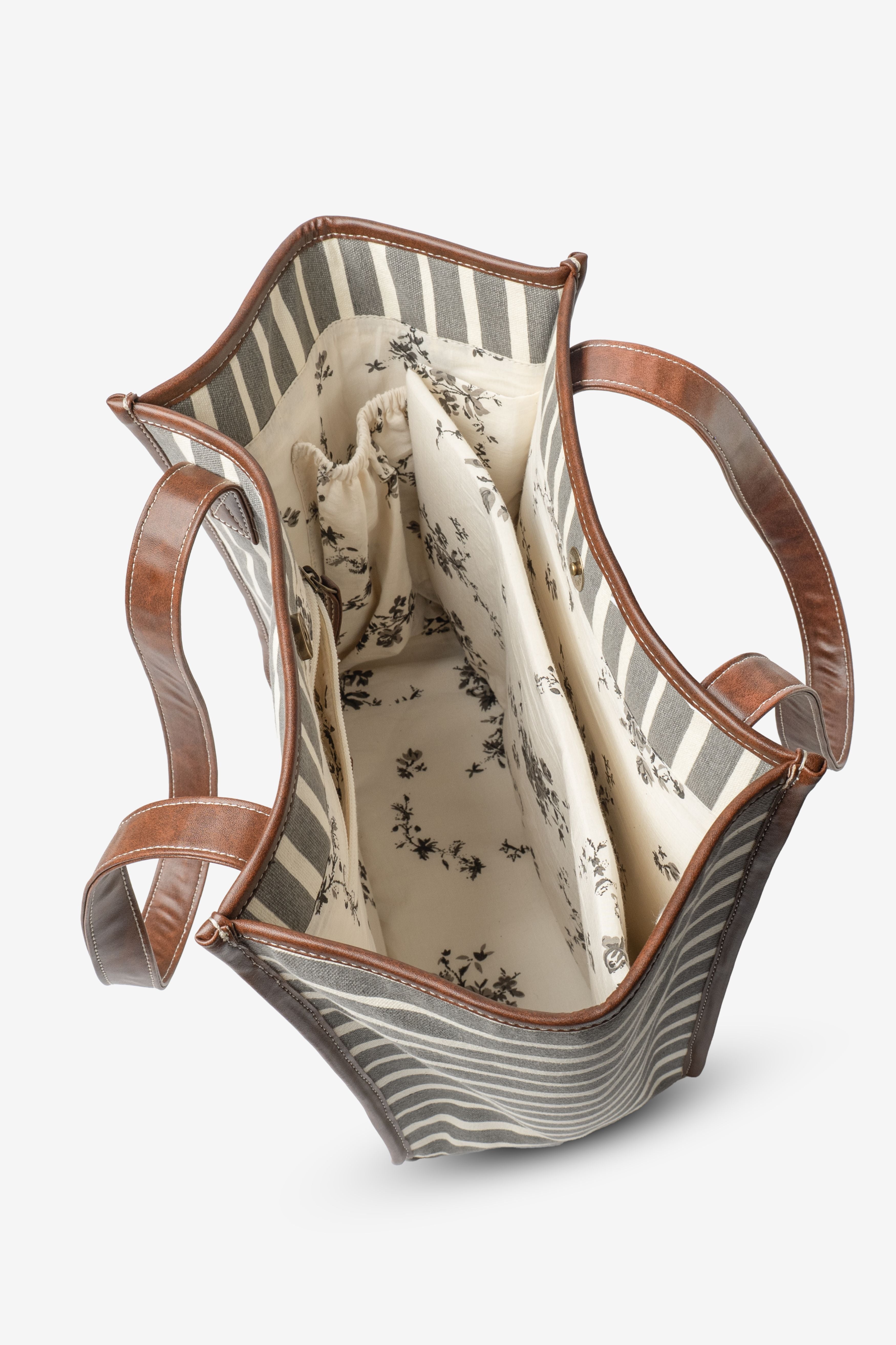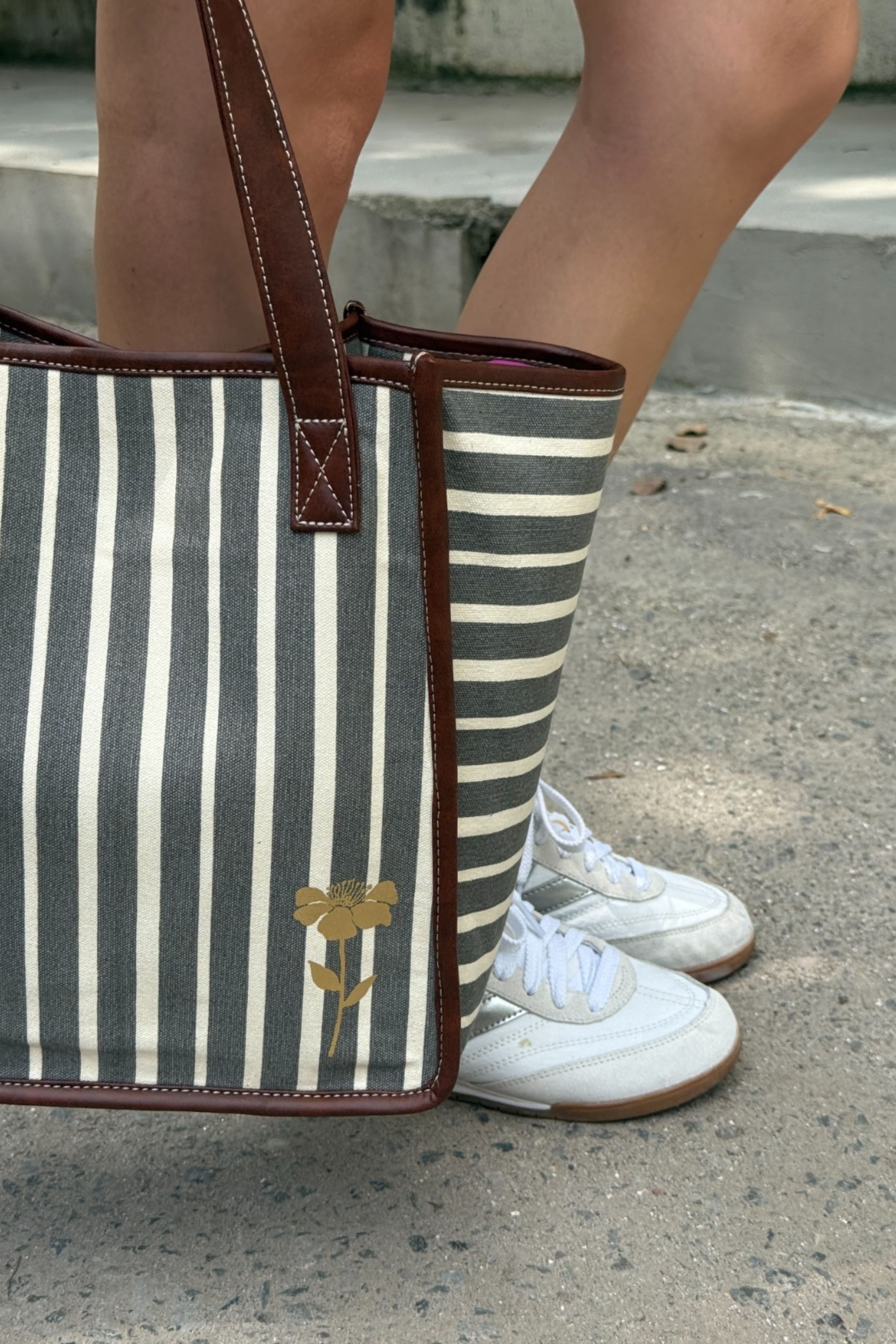 Designed for the modern woman on the go, this Retro Stripe Work Tote blends everyday functionality with elegant detailing. Crafted from 100% cotton canvas in a timeless stripe pattern, it is accentuated with a gold foil floral motif on the front, giving it a refined yet contemporary appeal. Key features: 1. Built-in padded laptop compartment (fits upto 14" laptop) & bottle holder 2. One inside zip pocket for valuables 3. Faux leather shoulder handles for comfort & durability 4. Printed cotton lining for a stylish touch