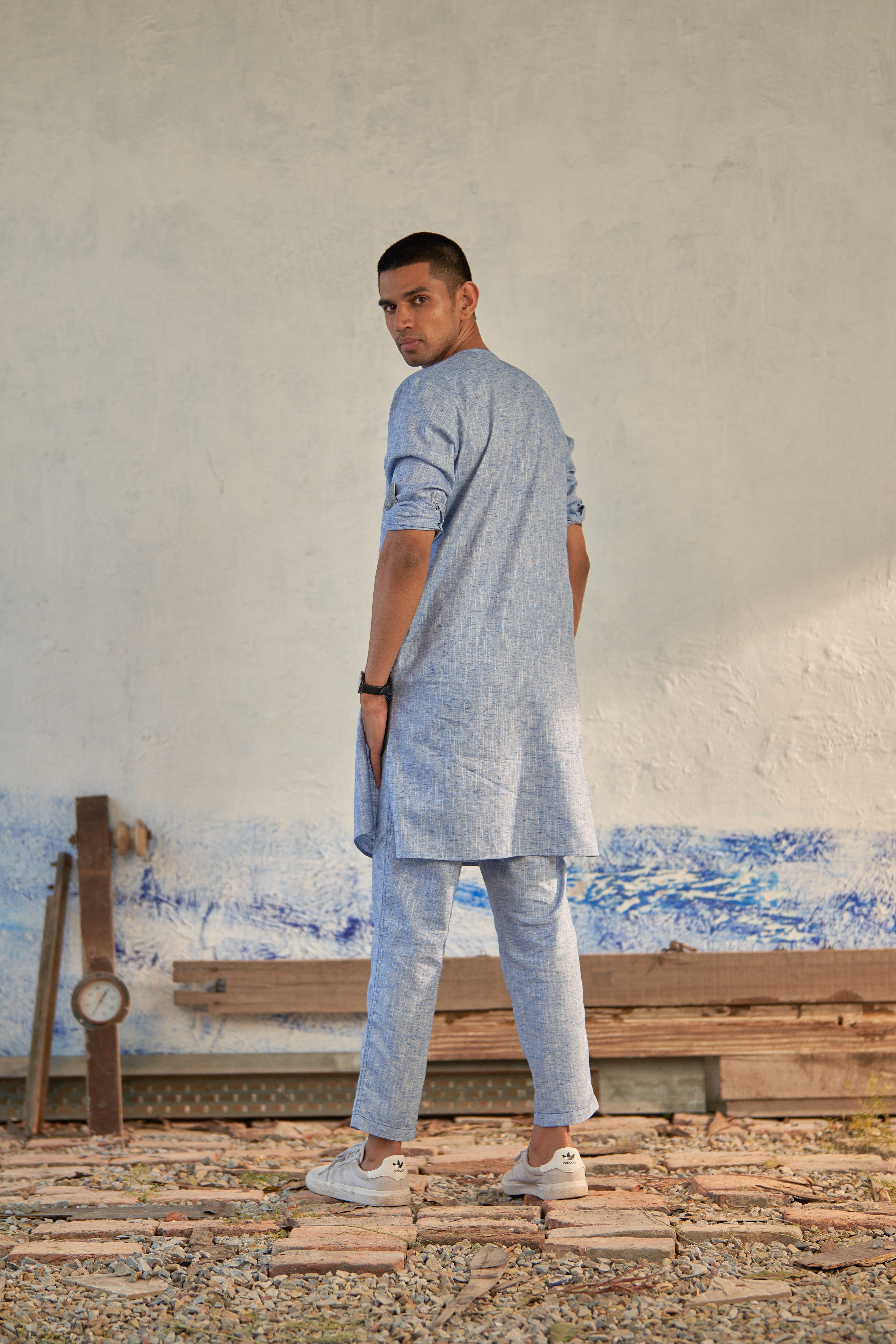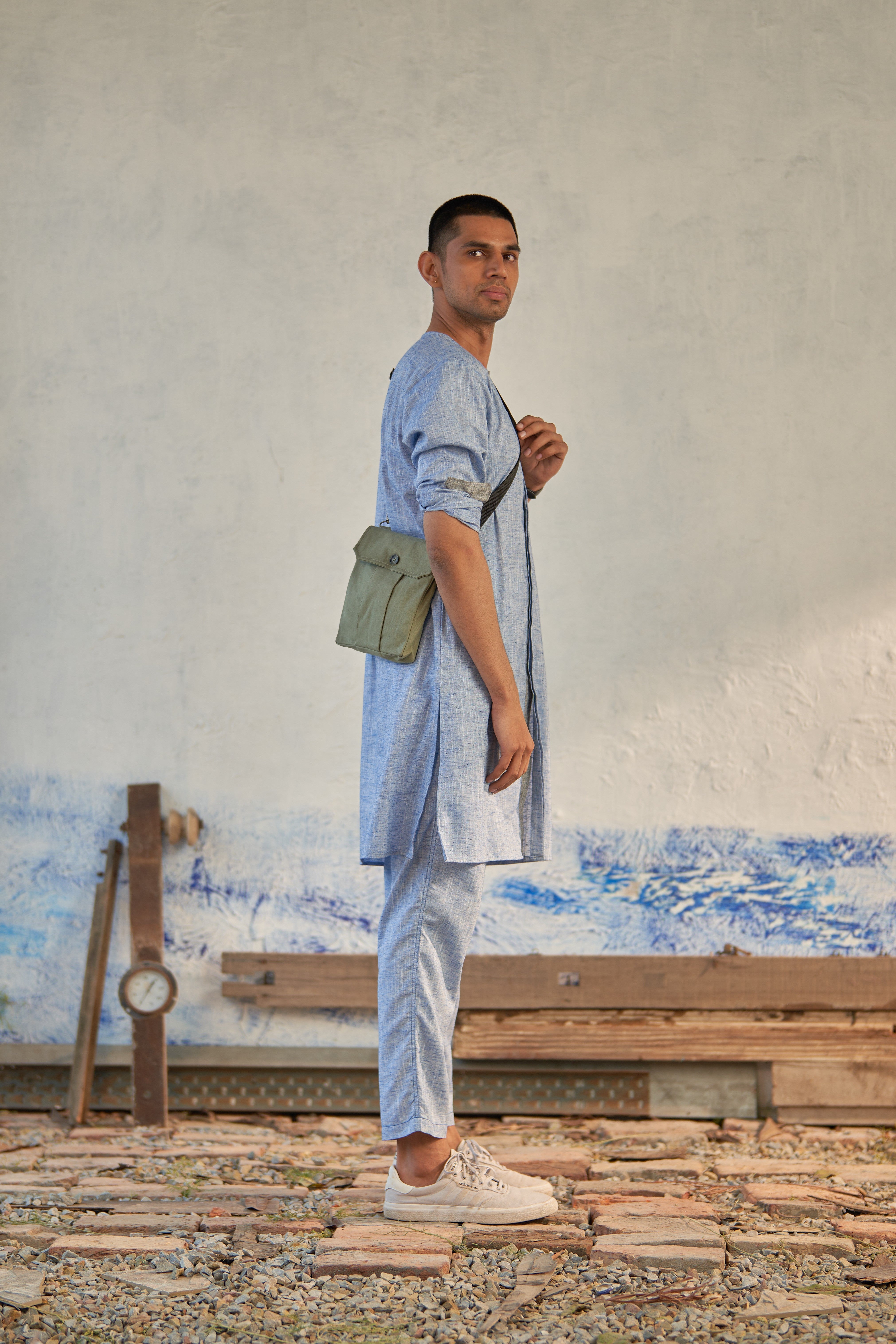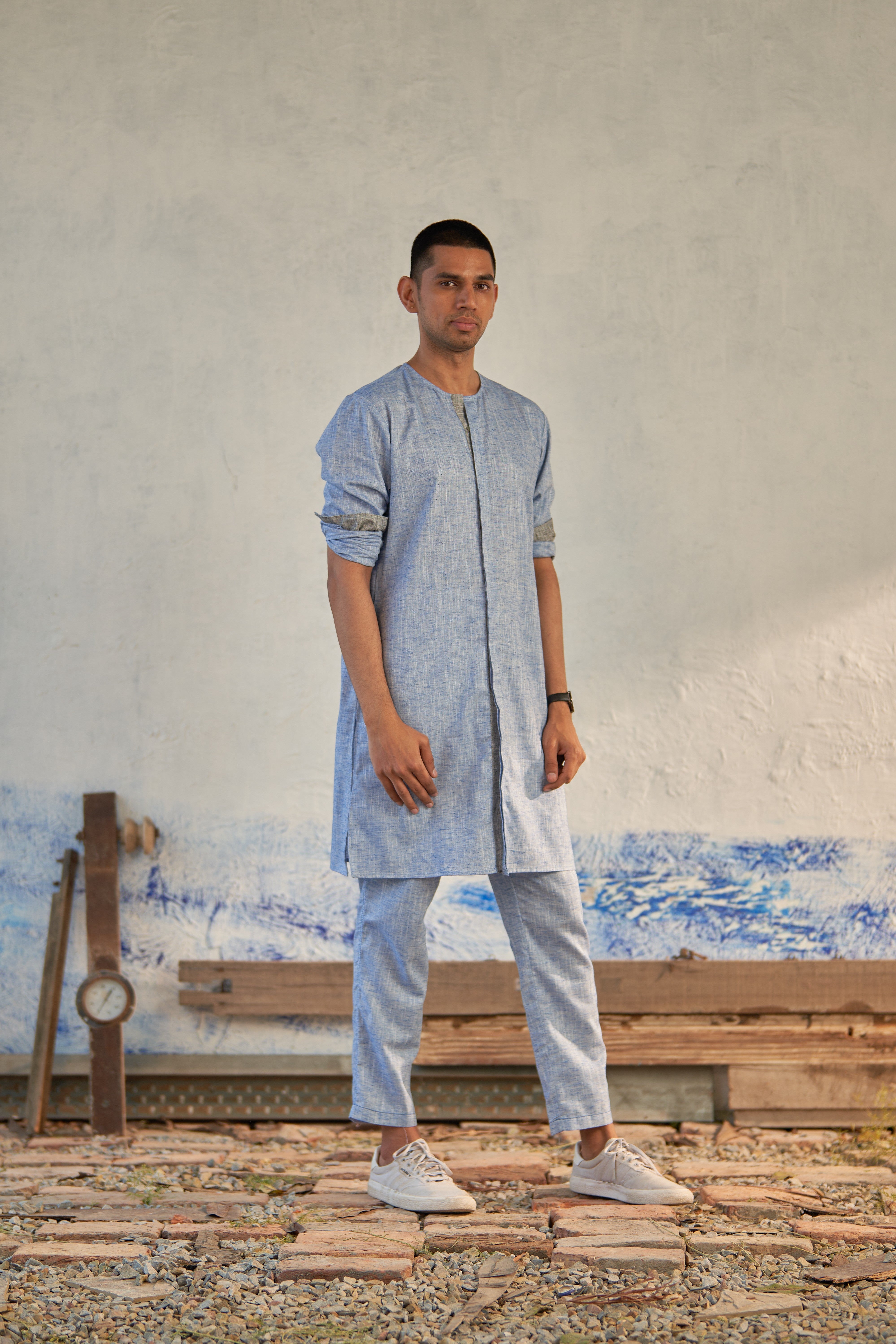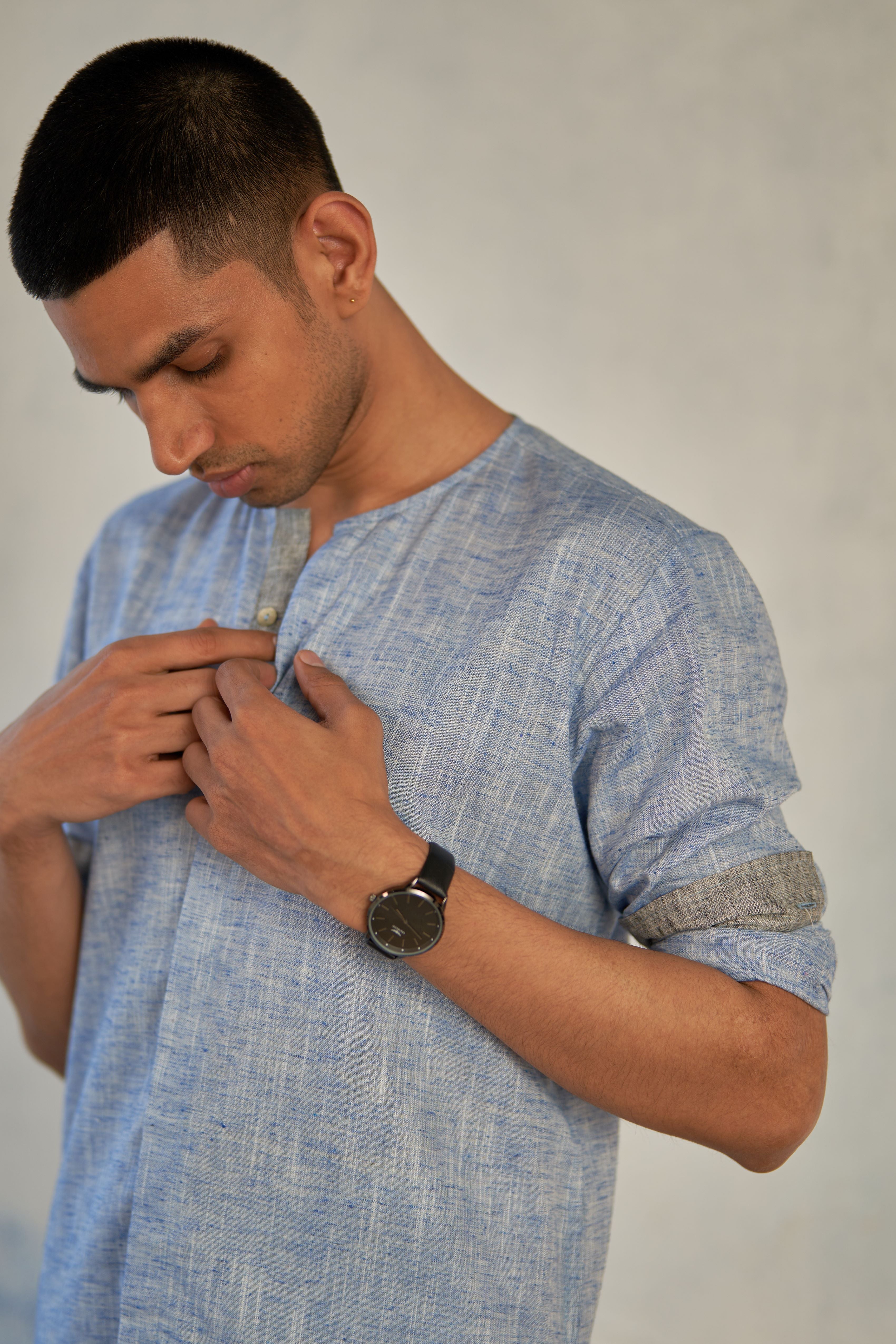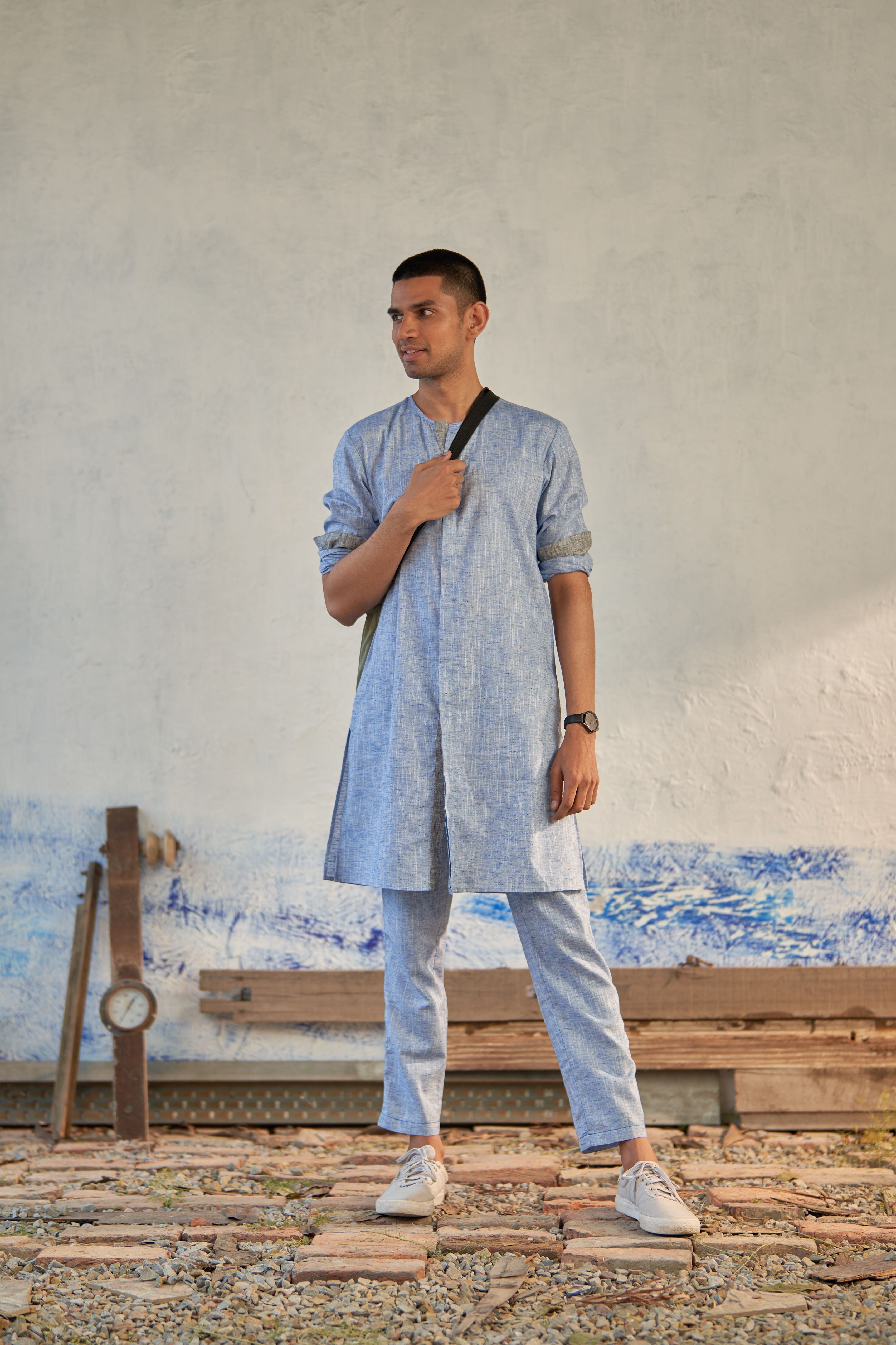 A relaxed yet refined piece that's anything but average. This kurta is poised to become the signature style staple in your wardrobe. Its no-collar design, contrasting color peeking from the stylish long placket that conceals the buttons within, exudes sophistication with a modern twist. Whether paired with pyjamas for a formal yet contemporary look or with joggers for an urban expedition.