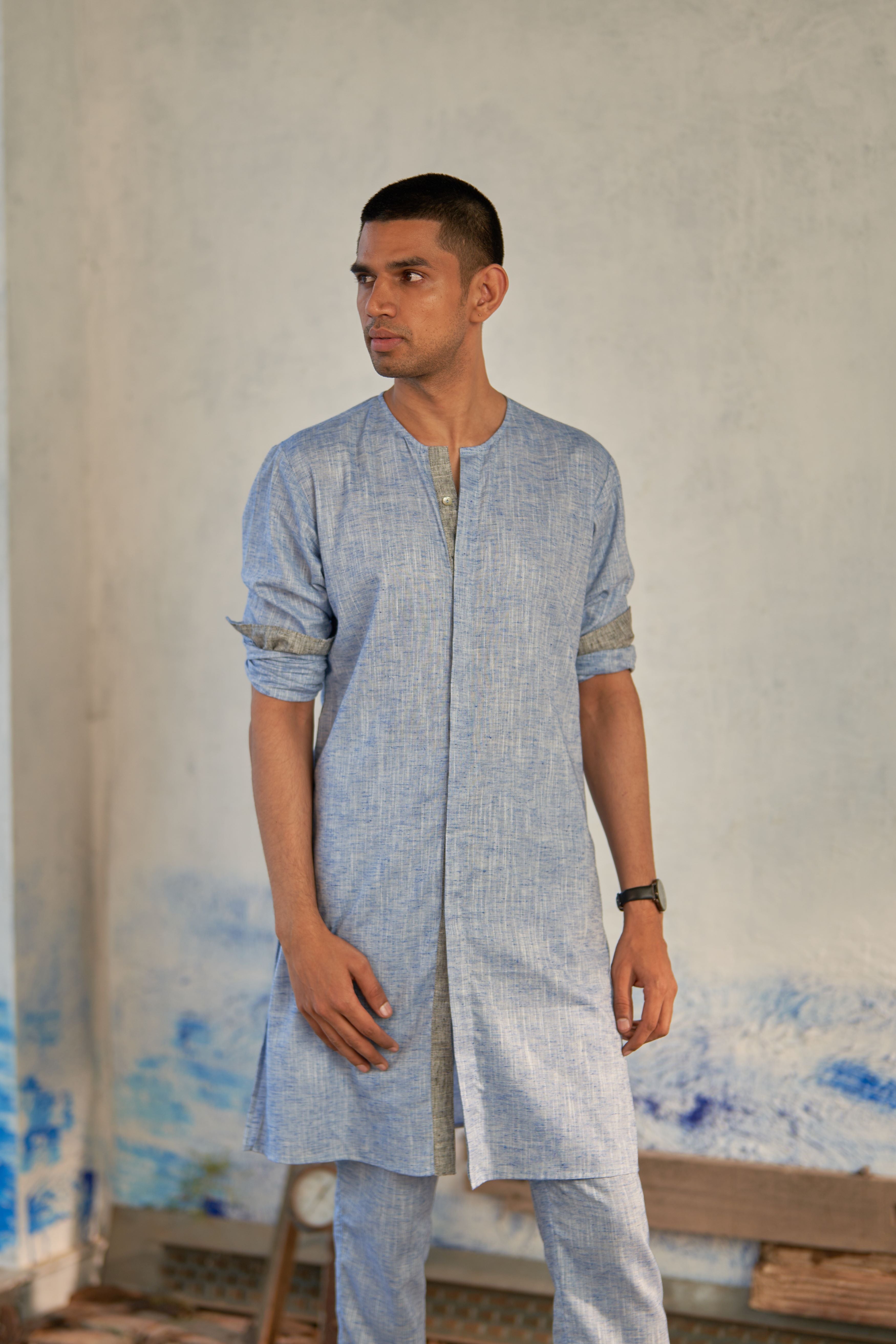 A relaxed yet refined piece that's anything but average. This kurta is poised to become the signature style staple in your wardrobe. Its no-collar design, contrasting color peeking from the stylish long placket that conceals the buttons within, exudes sophistication with a modern twist. Whether paired with pyjamas for a formal yet contemporary look or with joggers for an urban expedition.