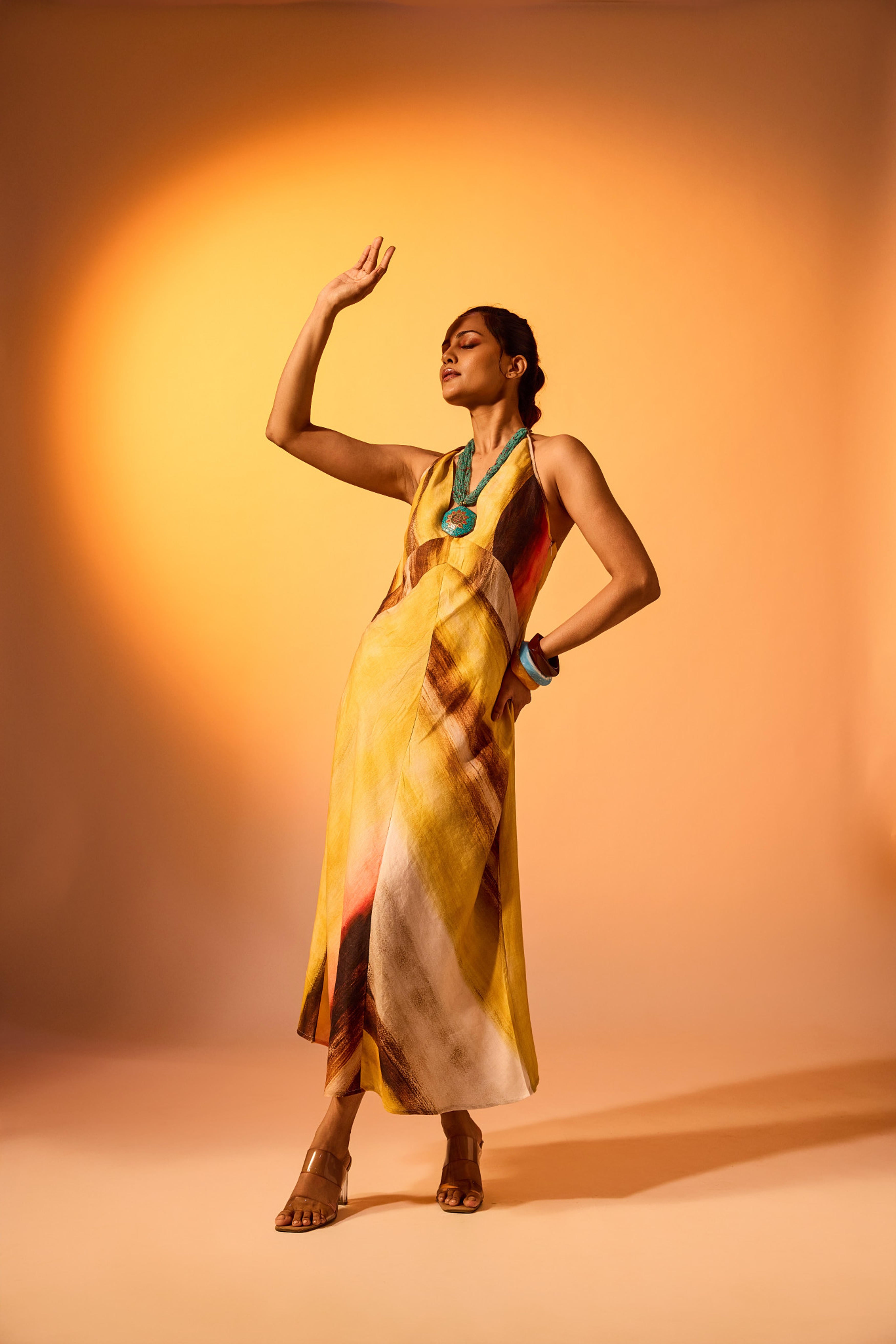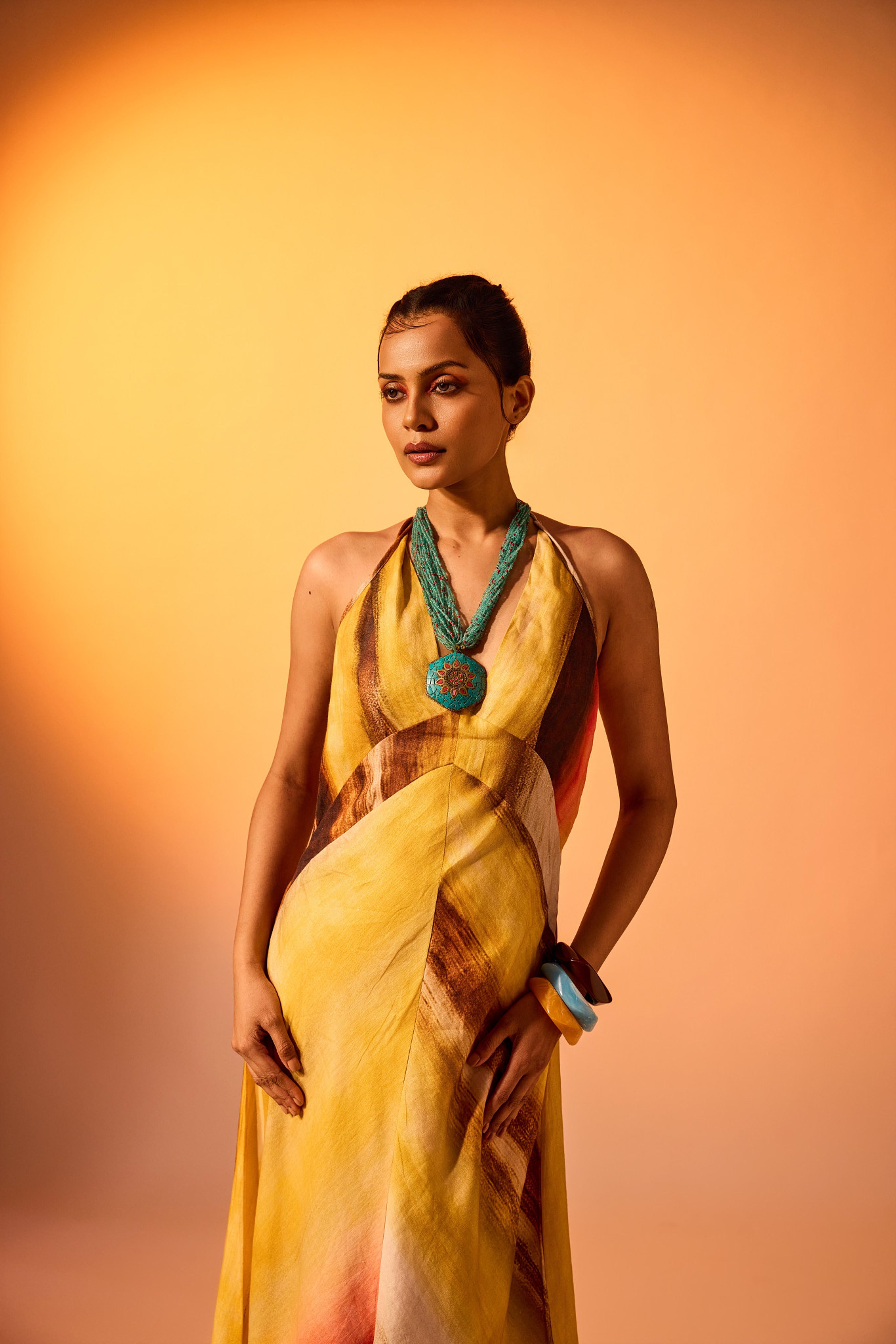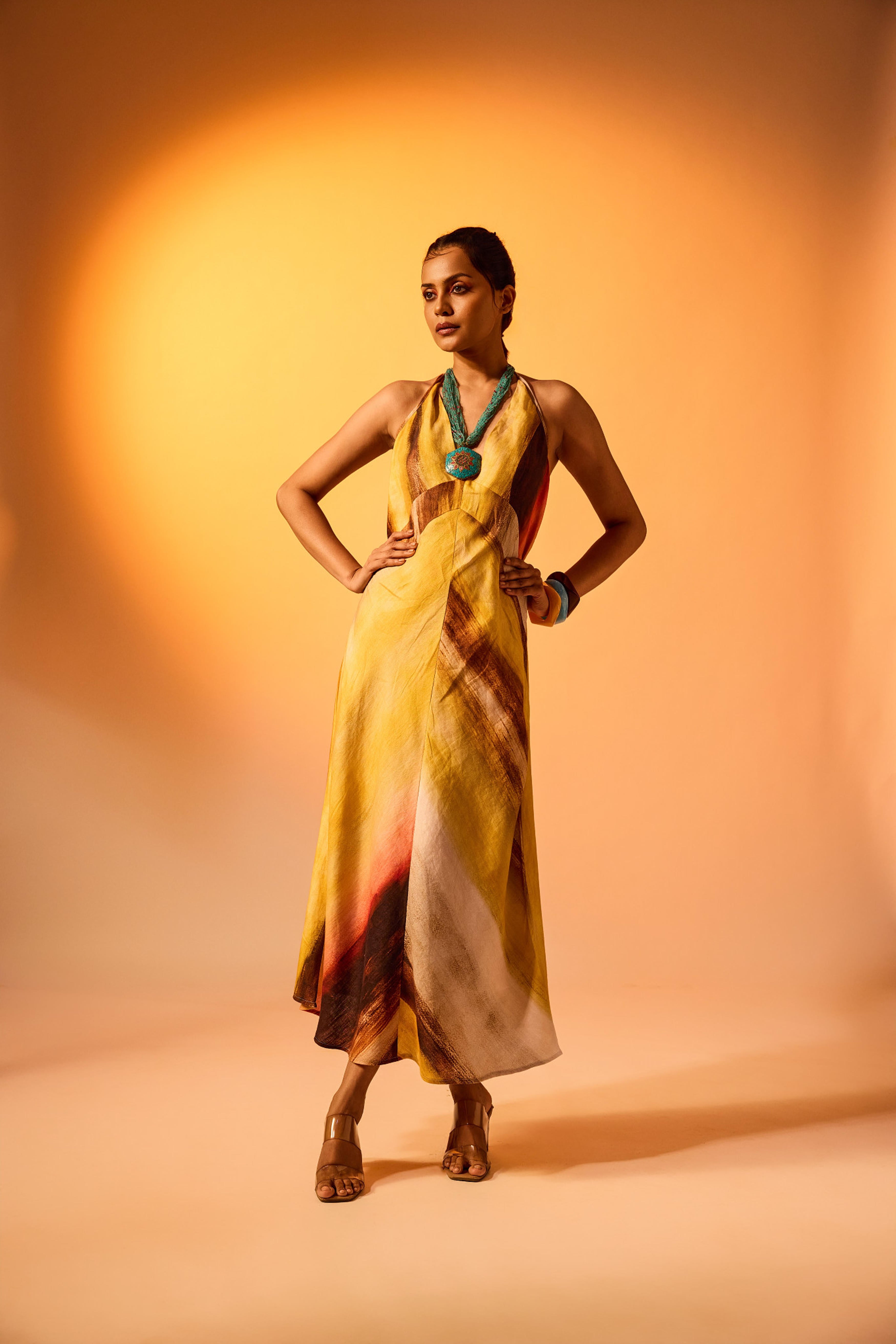 The Riddhi Dress in Solaris captures effortless grace with a modern, free-spirited silhouette. Made from 100% linen, this halter-neck dress features a fluid A-line cut that flatters with its ease of movement. The neckline gathers into a delicate tie-up at the back, while the flowing length creates a refined yet playful look. The Solaris colour story radiates with golden yellows, fiery crimsons, deep browns, and soft neutrals, in organic, painterly strokes that evoke the warmth of a summer sunset. Ideal for daytime celebrations or relaxed evening soirees, the Riddhi Dress balances comfort with striking visual impact.