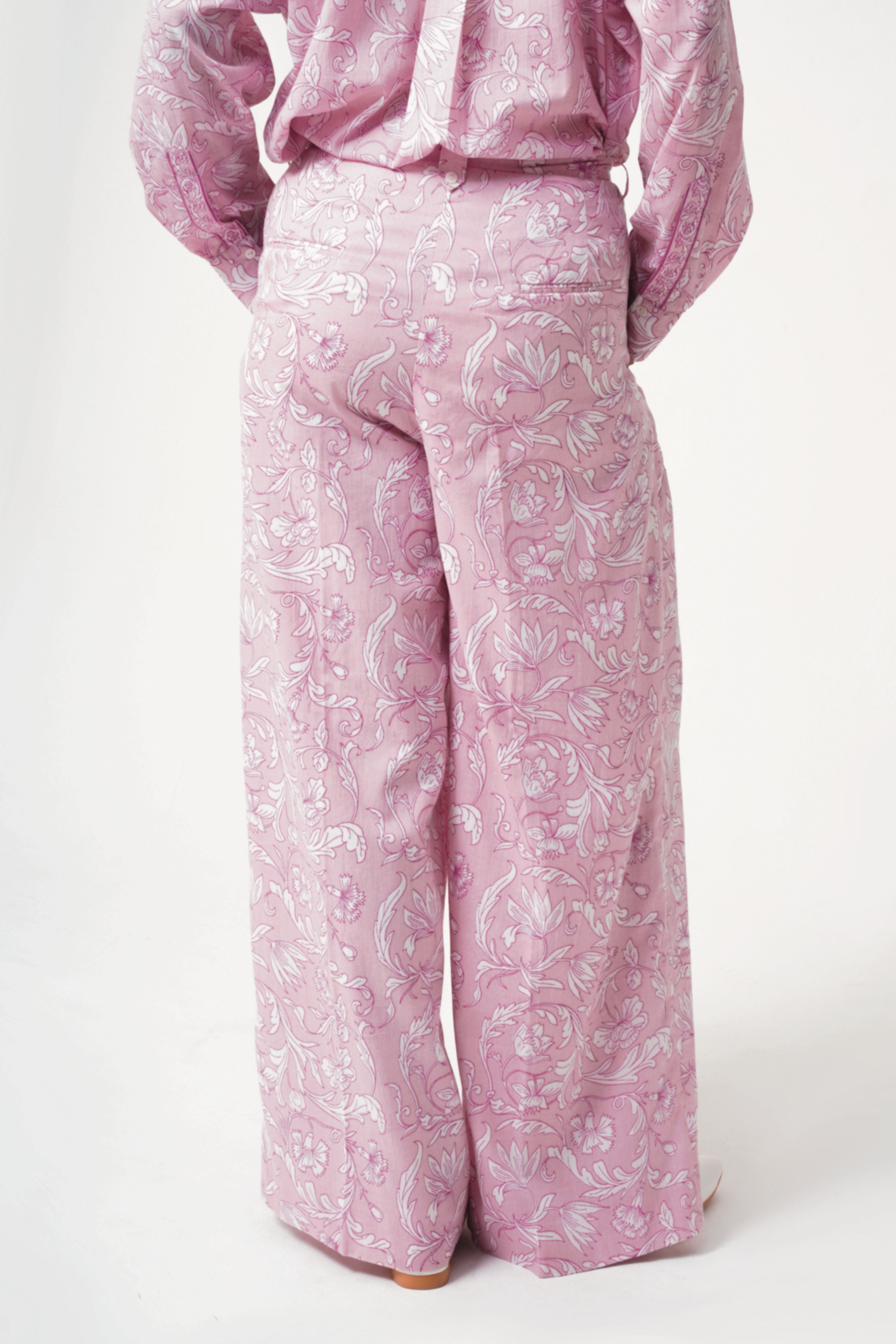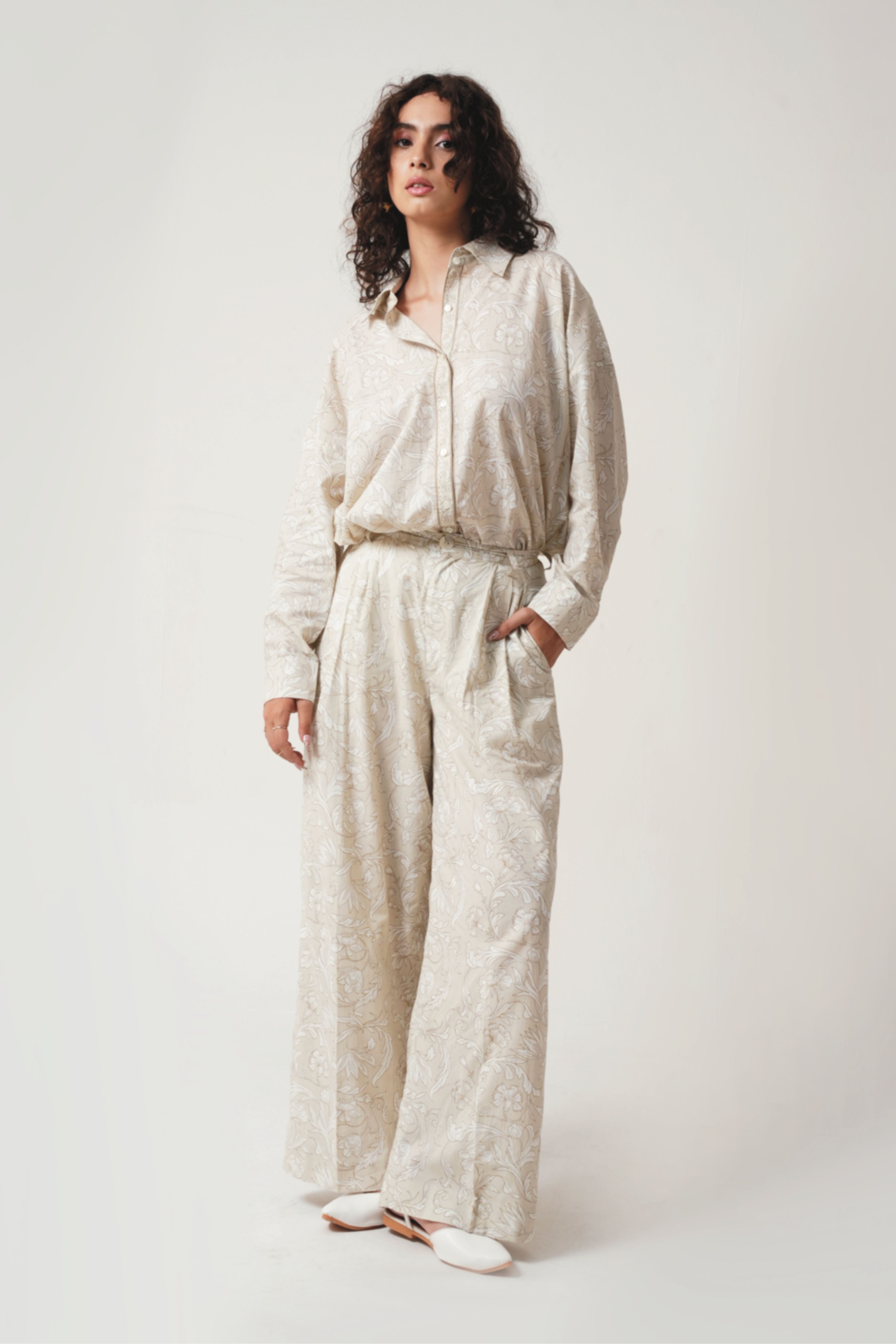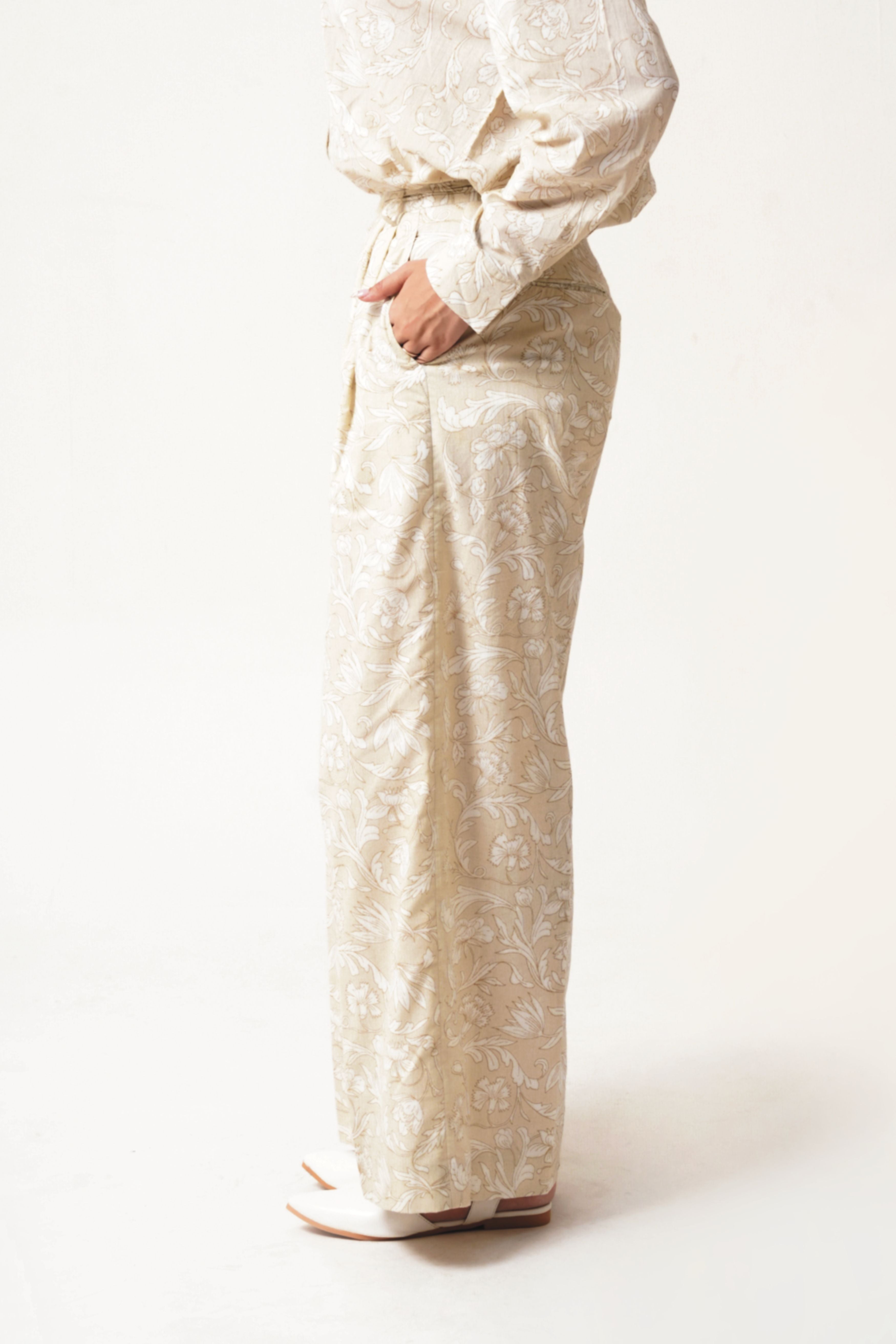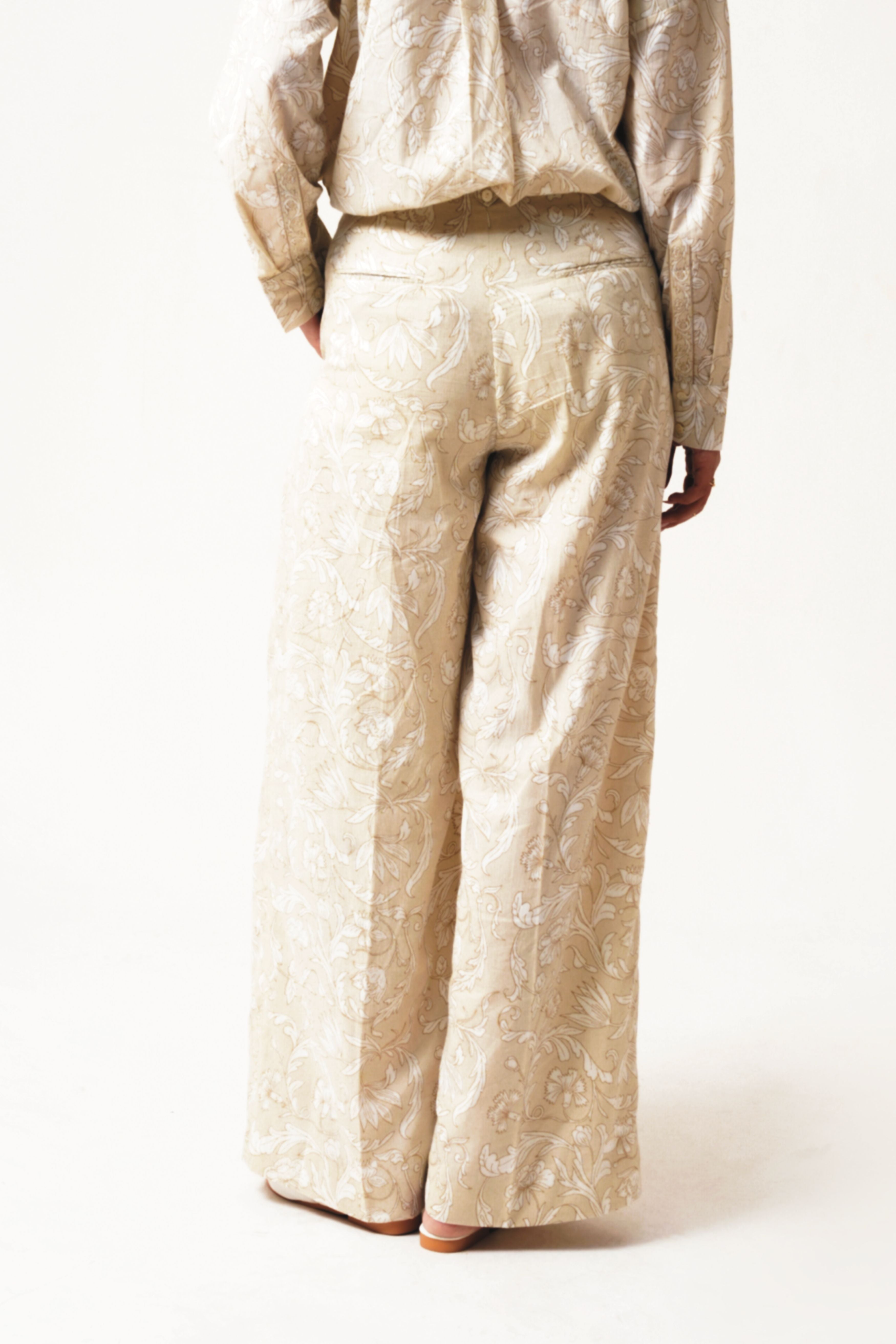 These wide-leg pants offer a seamless fusion of comfort and elegance. Crafted from airy, lightweight fabric, they drape beautifully, allowing for effortless movement. The relaxed fit is complemented by an elastic waistband at the back, ensuring both style and ease. A subtle floral pattern enhances their refined aesthetic, making them the perfect match for the coordinating shirt or a versatile standalone piece. Model is 5'8 and is wearing a size XS