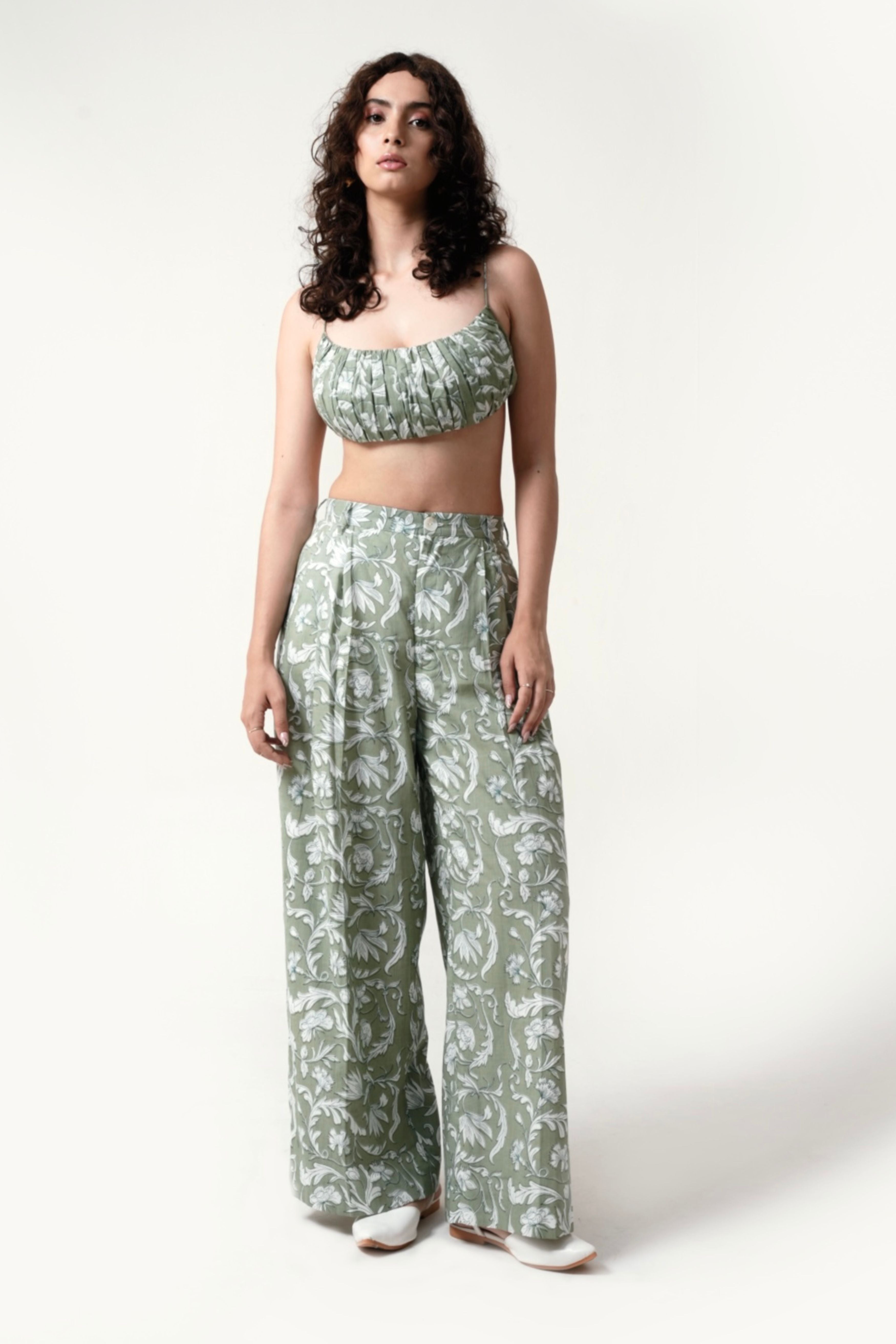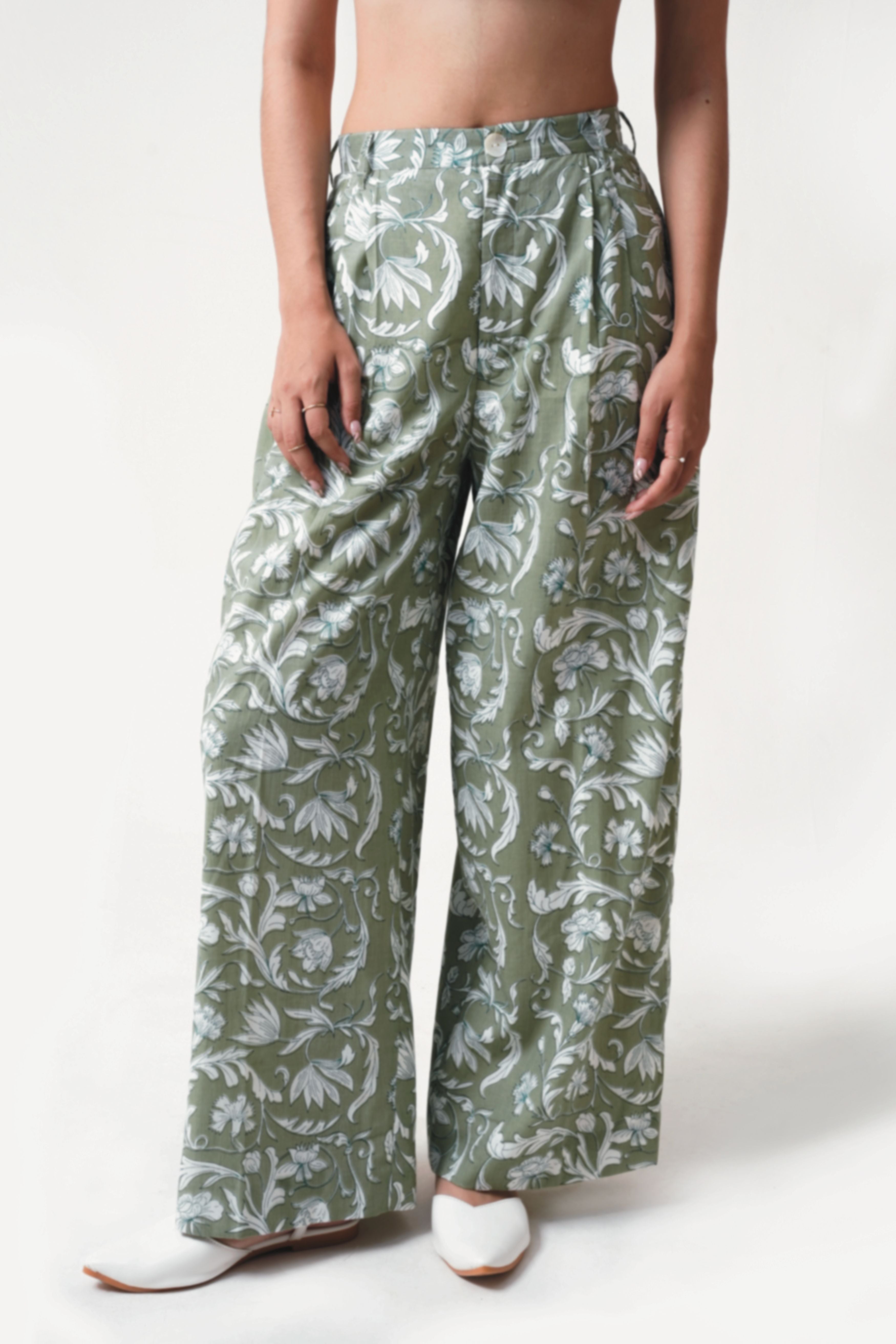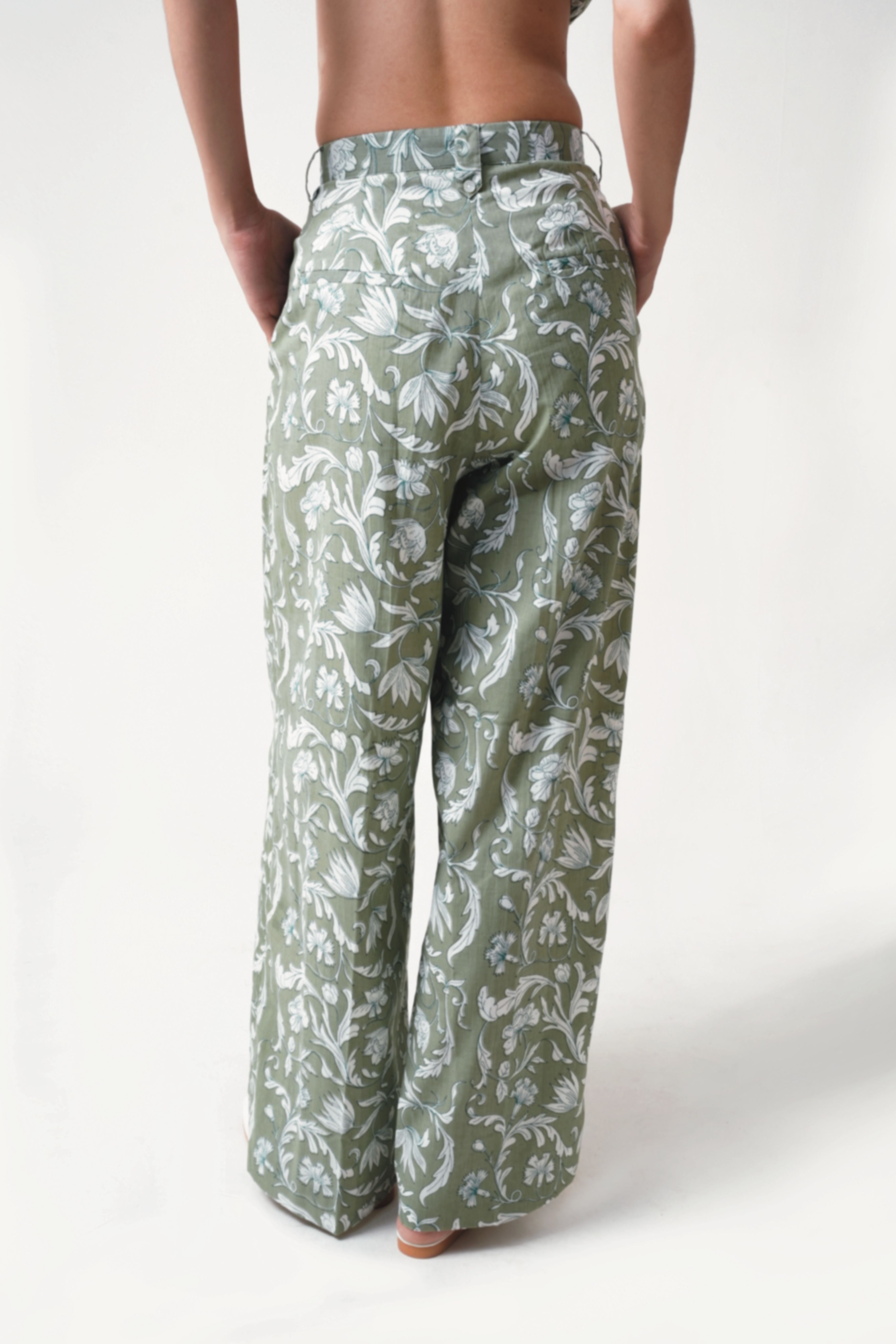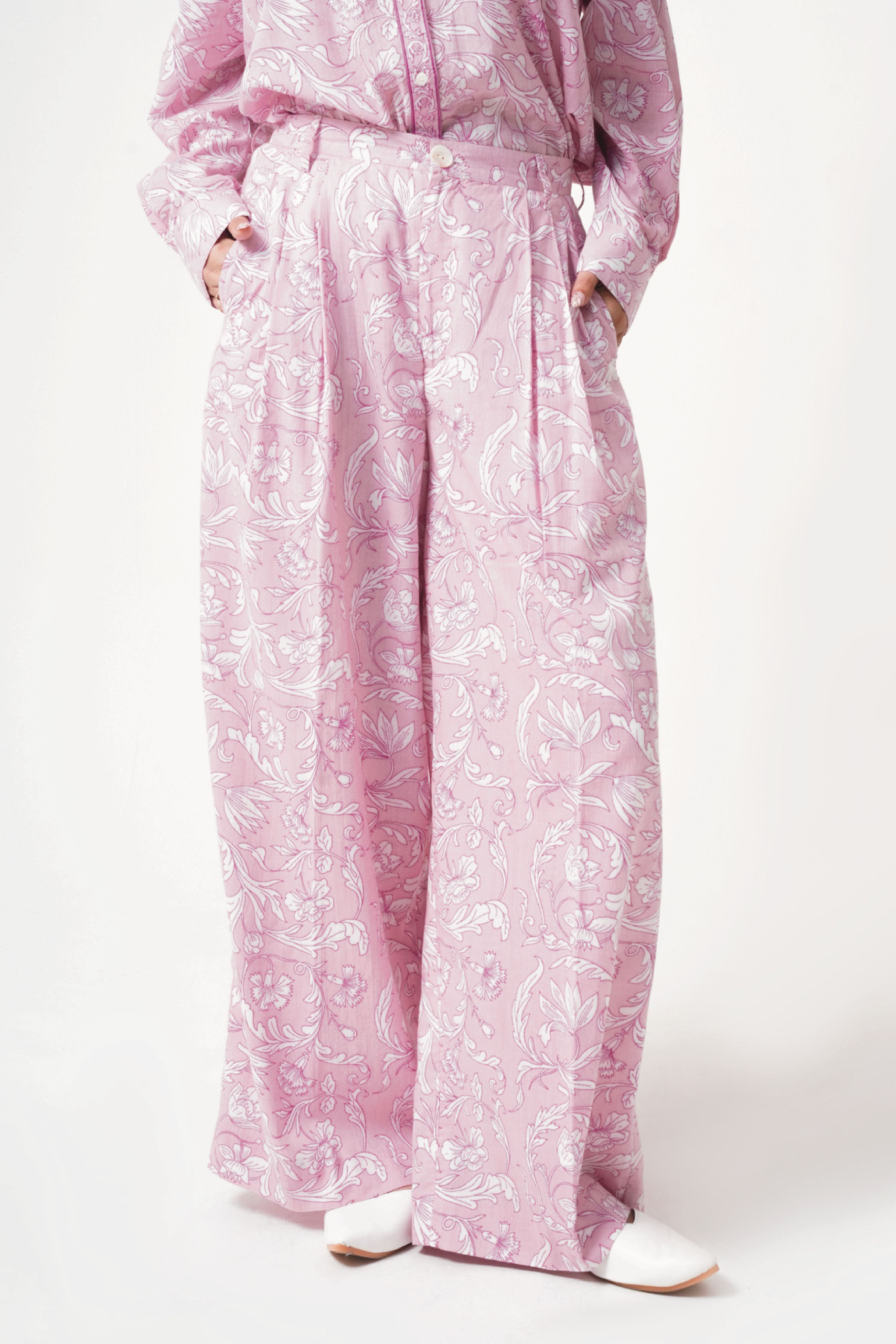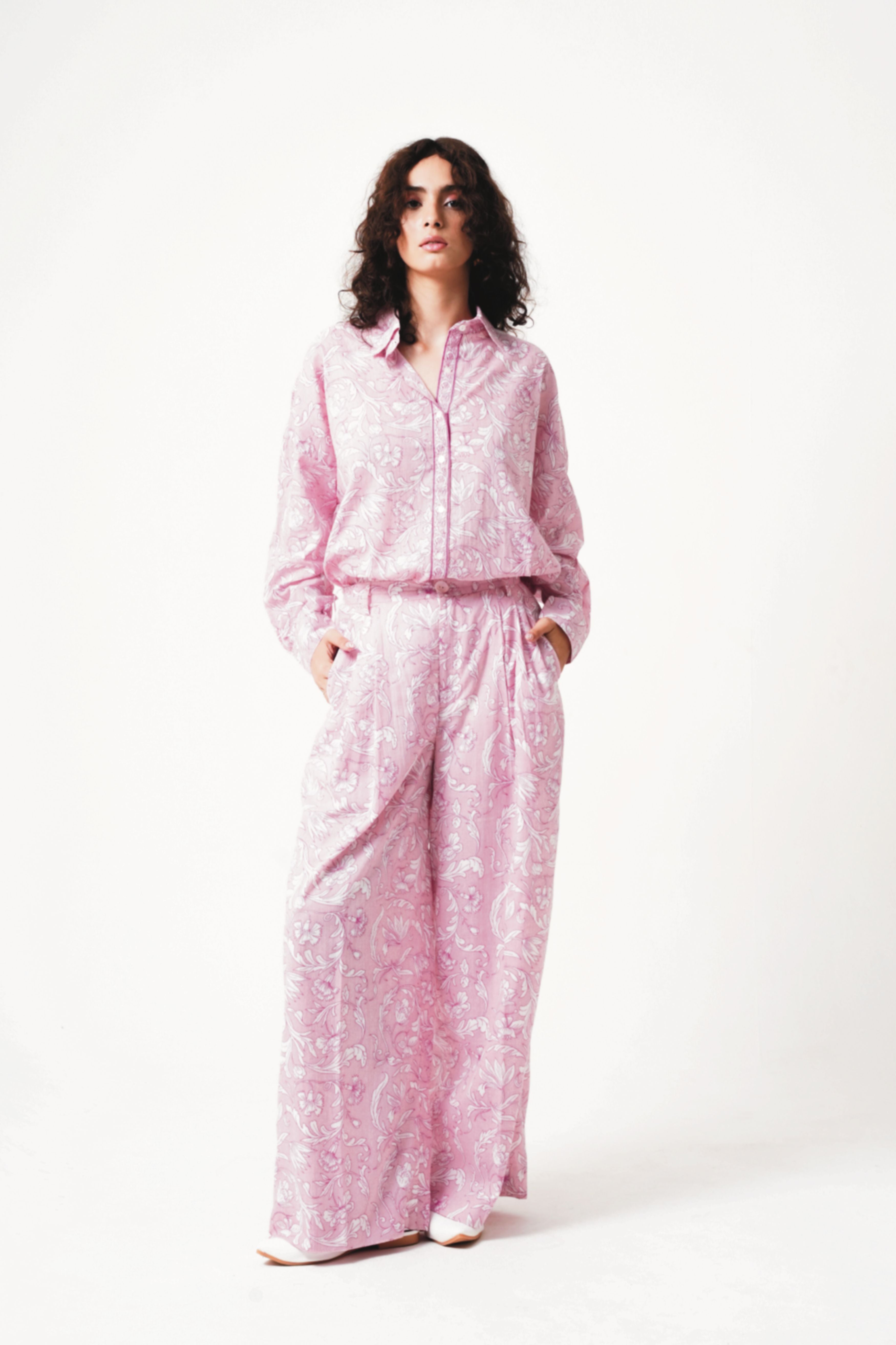 These wide-leg pants offer a seamless fusion of comfort and elegance. Crafted from airy, lightweight fabric, they drape beautifully, allowing for effortless movement. The relaxed fit is complemented by an elastic waistband at the back, ensuring both style and ease. A subtle floral pattern enhances their refined aesthetic, making them the perfect match for the coordinating shirt or a versatile standalone piece. Model is 5'8 and is wearing a size XS