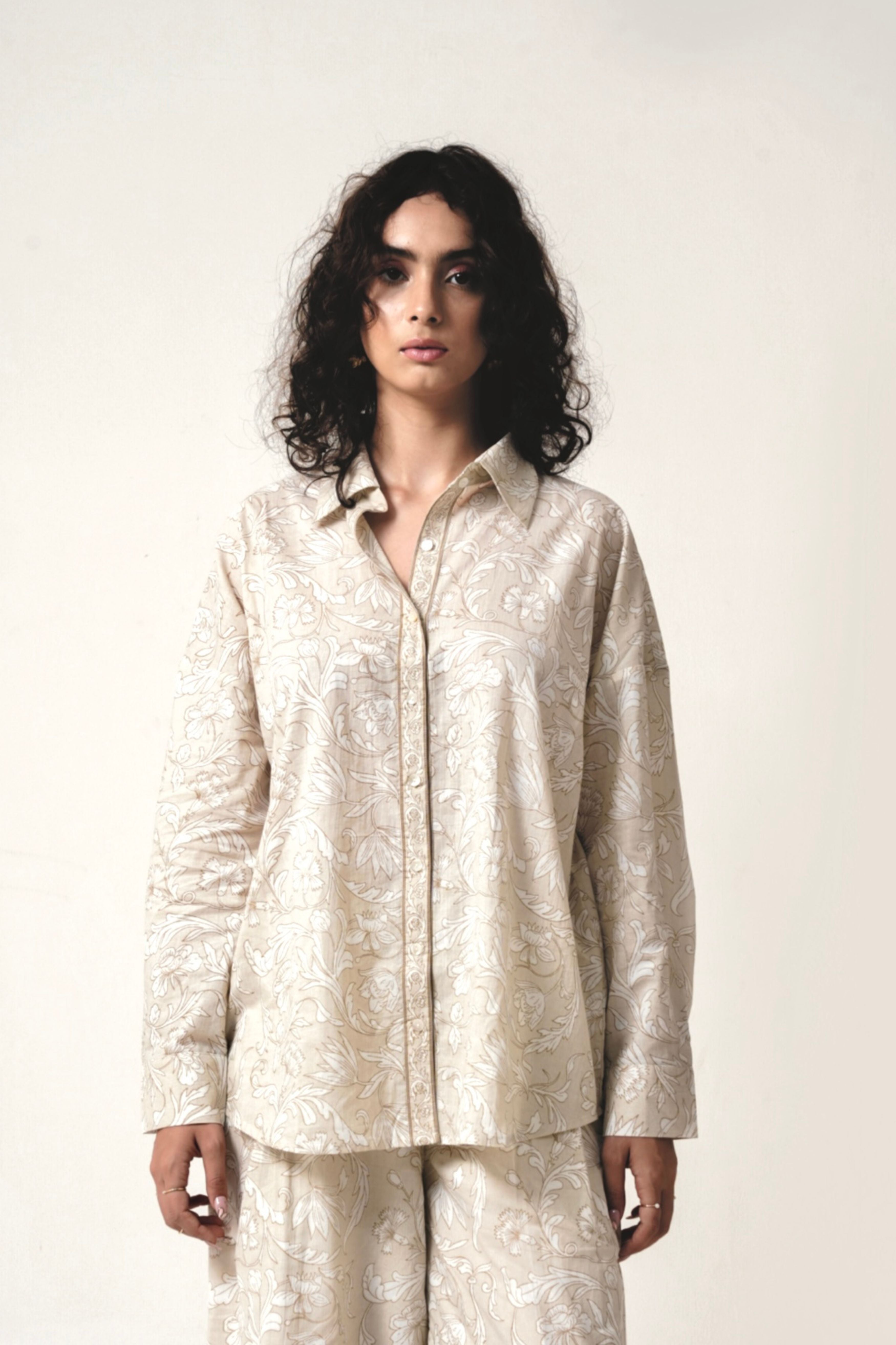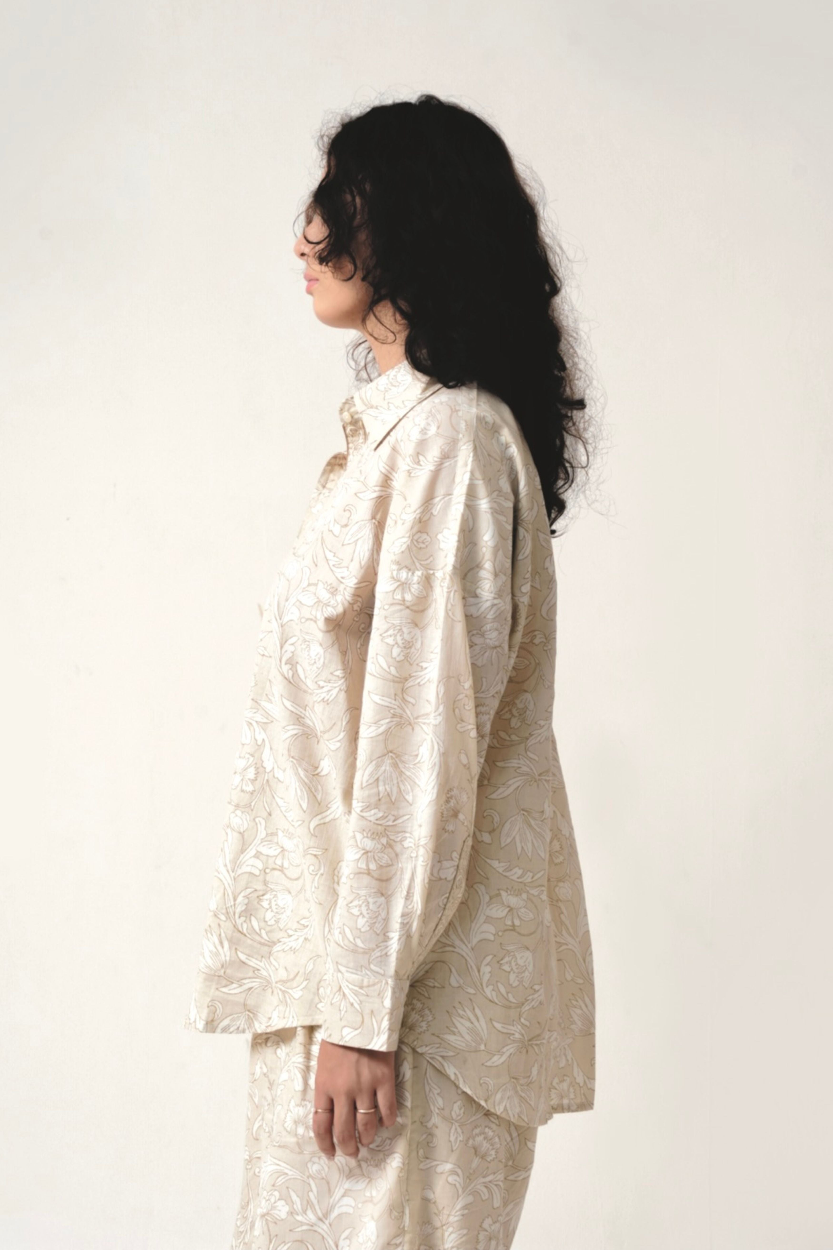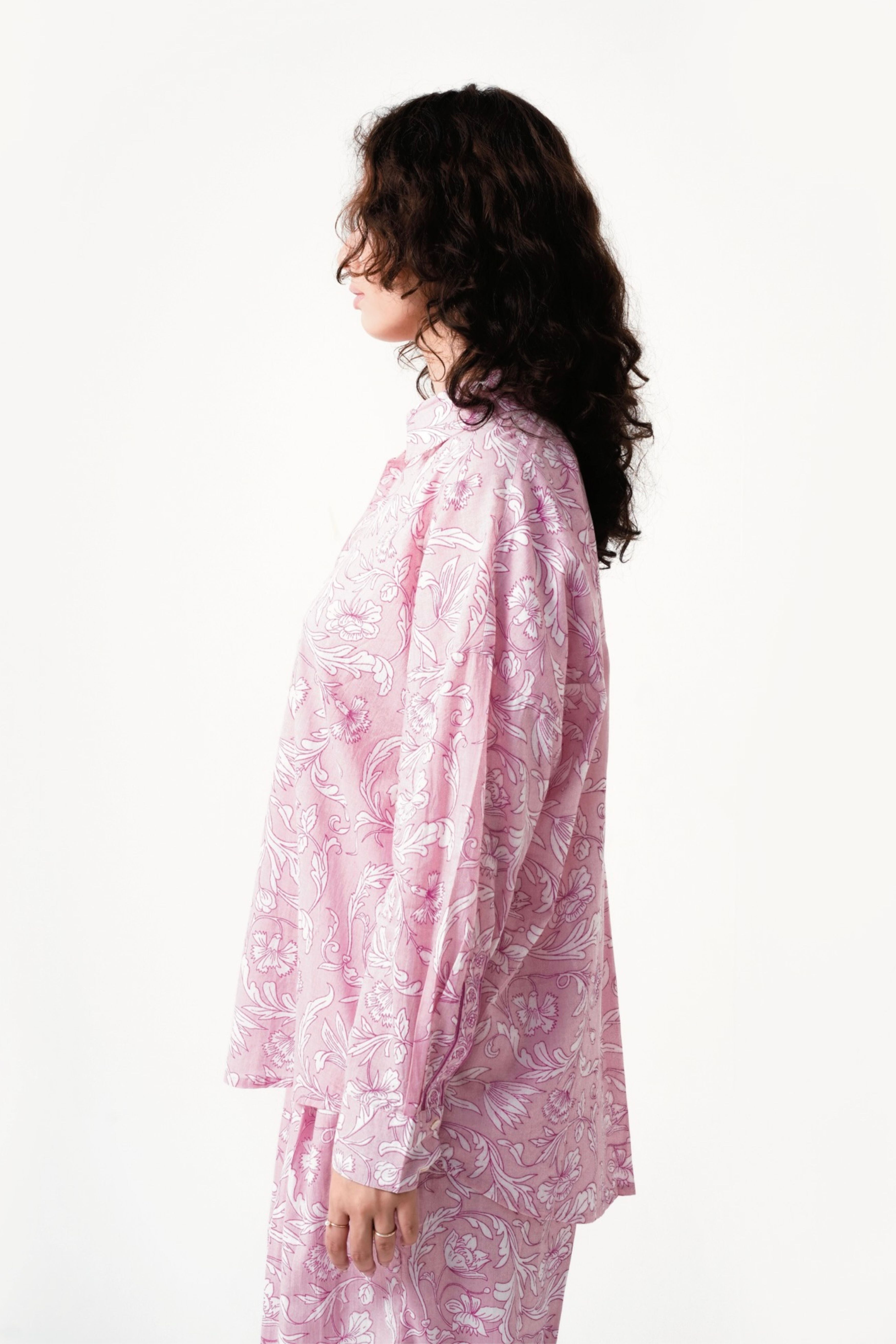 A timeless staple reimagined, this long-sleeve shirt combines classic tailoring with contemporary charm. The fluid drape of the fabric enhances its relaxed fit, while the buttoned front allows for versatile styling. Style it loosely over wide-leg pants for a relaxed vibe, or tuck it into high-waisted bottoms for a structured finish. Model is 5'8 and is wearing a size XS