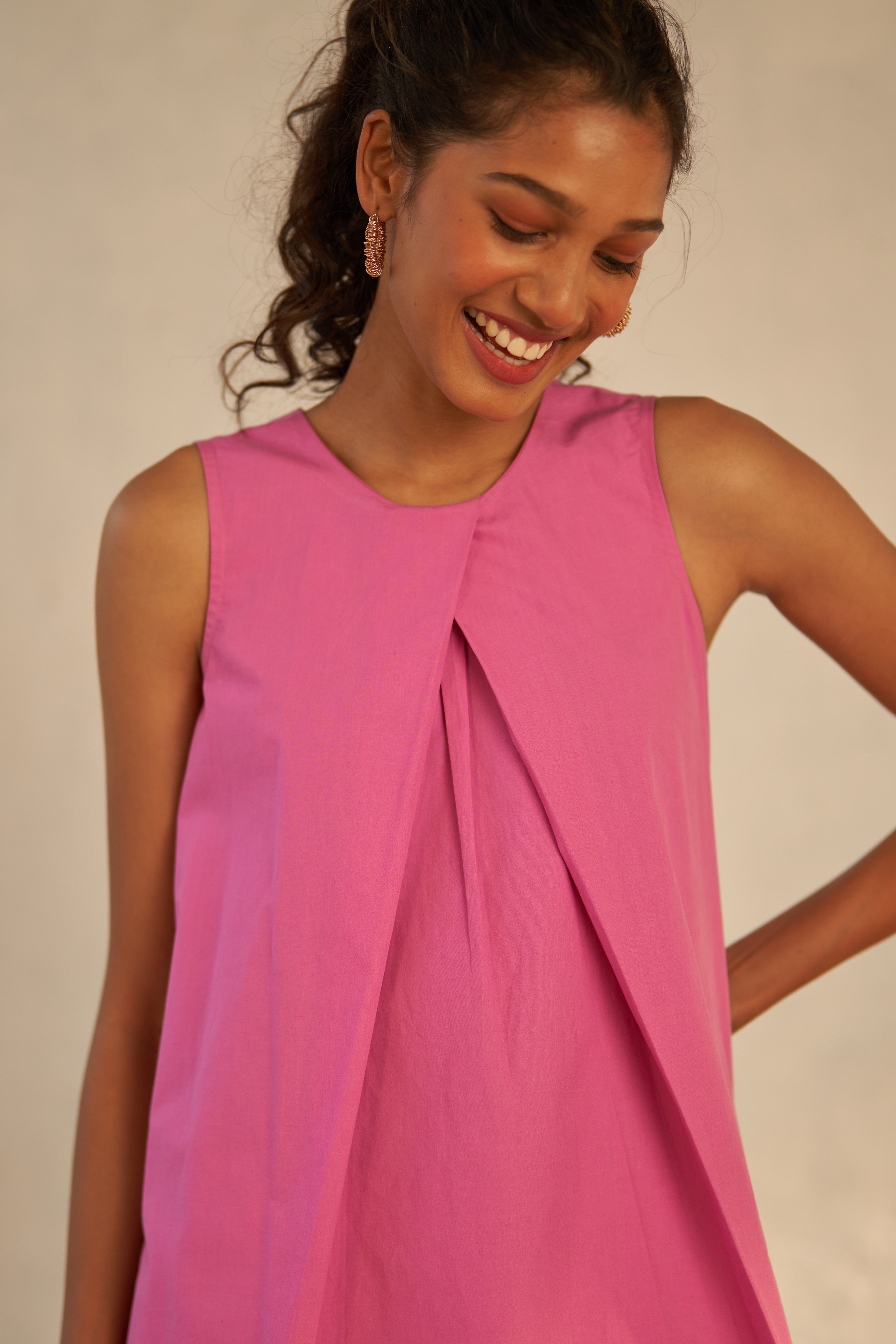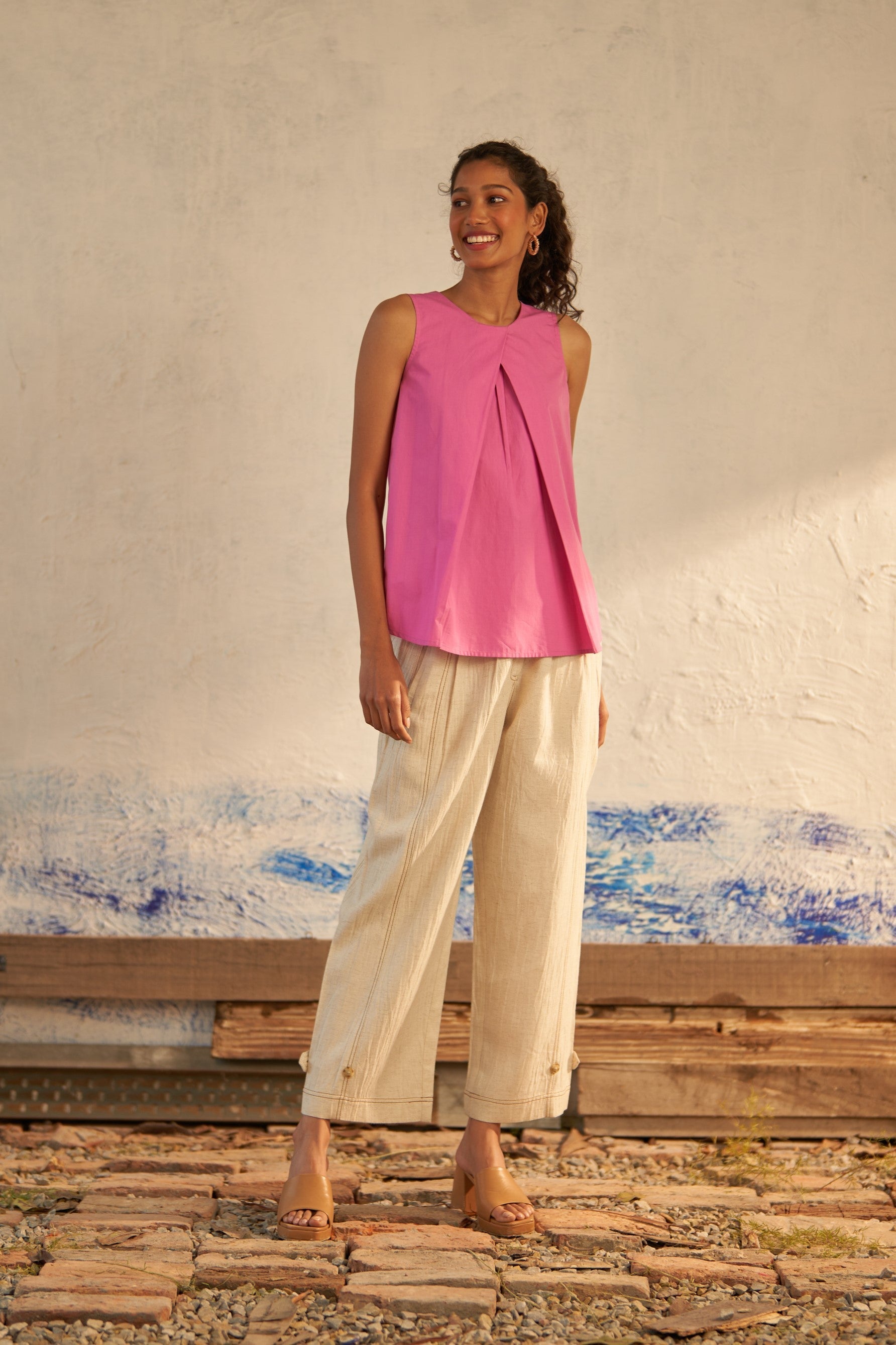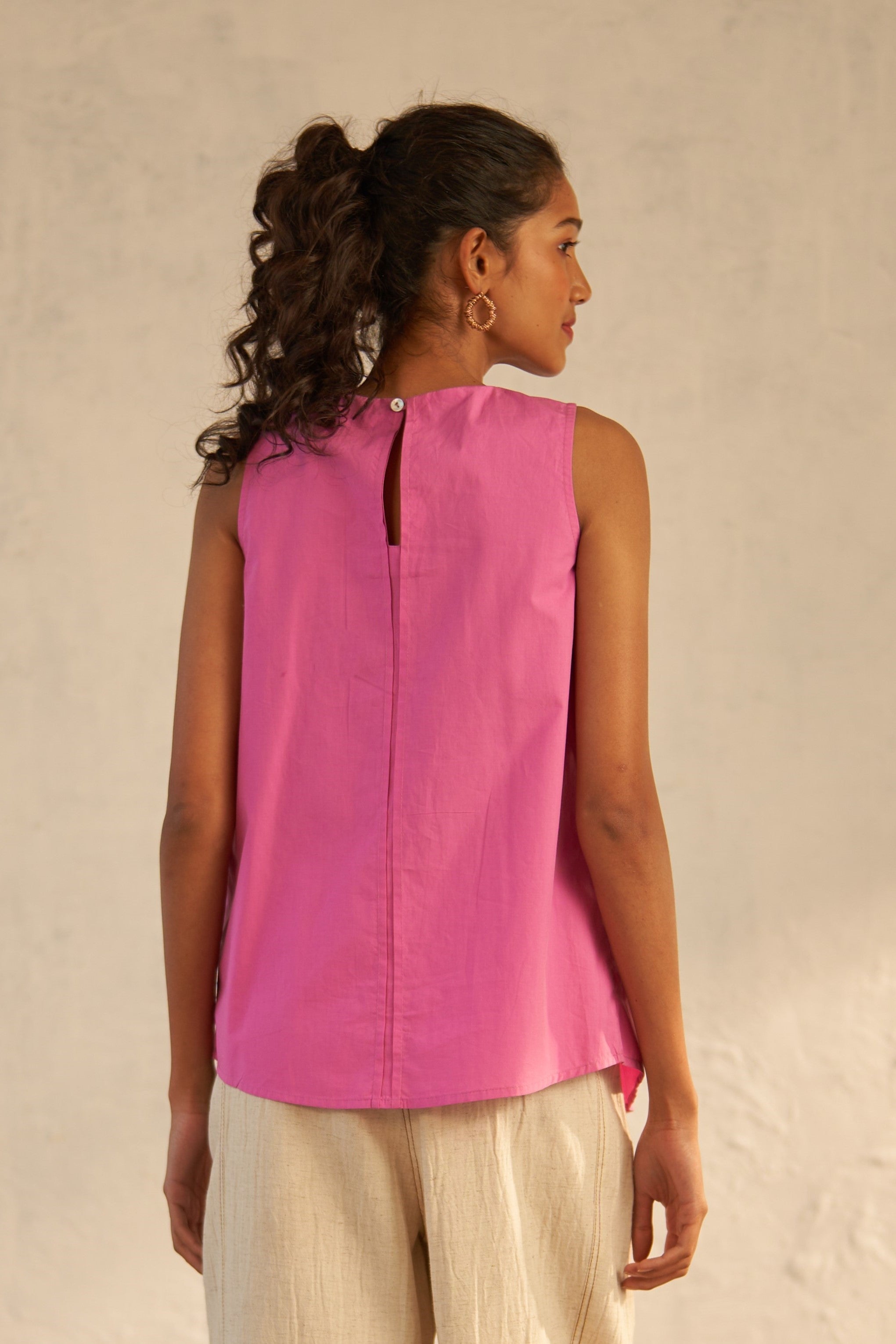 This rouge pink sleeveless top is a versatile choice that effortlessly transitions from day to night. Crafted from premium cotton poplin fabric, it features a twisted neckline that creates a graceful draped effect. Pair it with our crushed flex loop pants for an effortlessly chic look.
