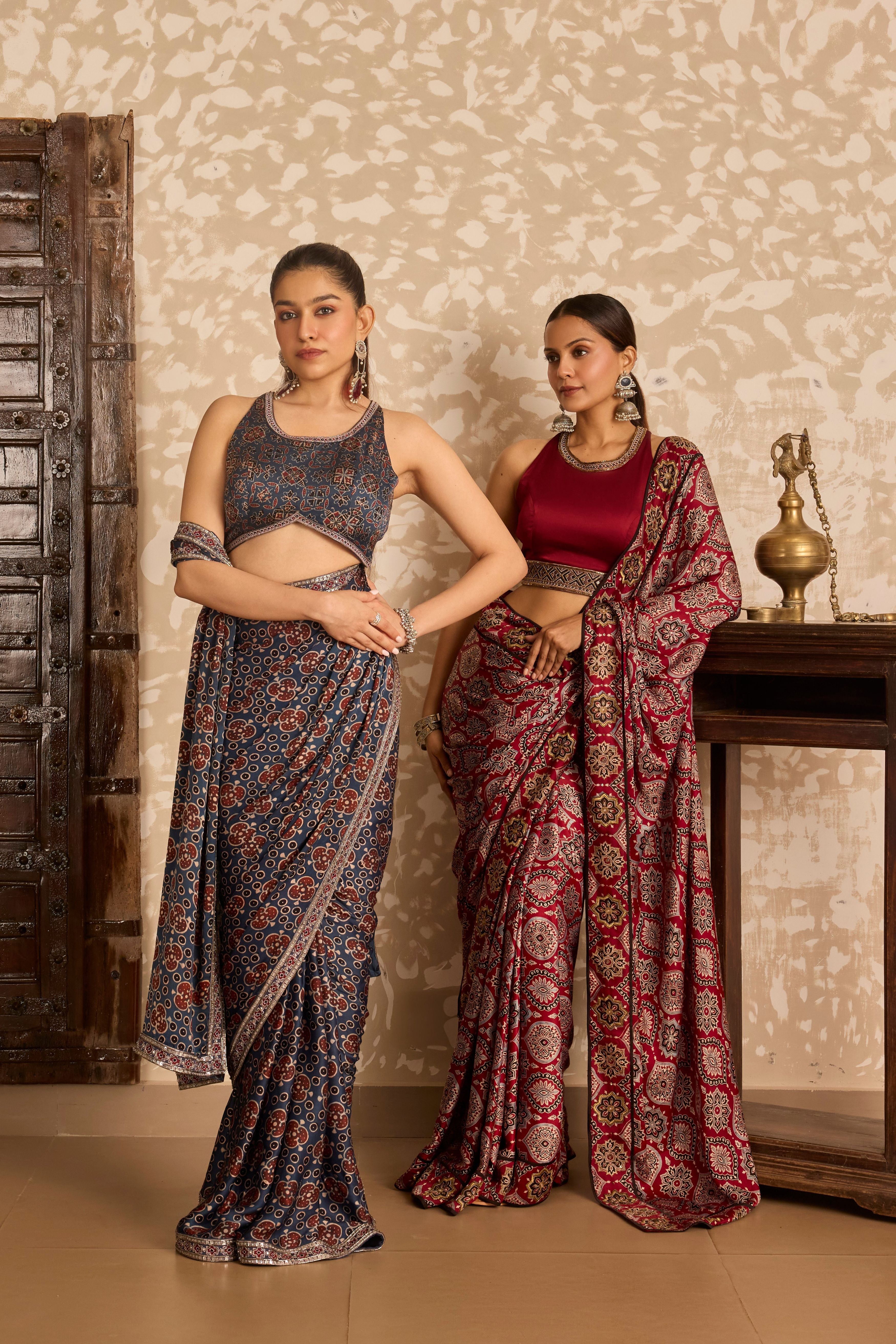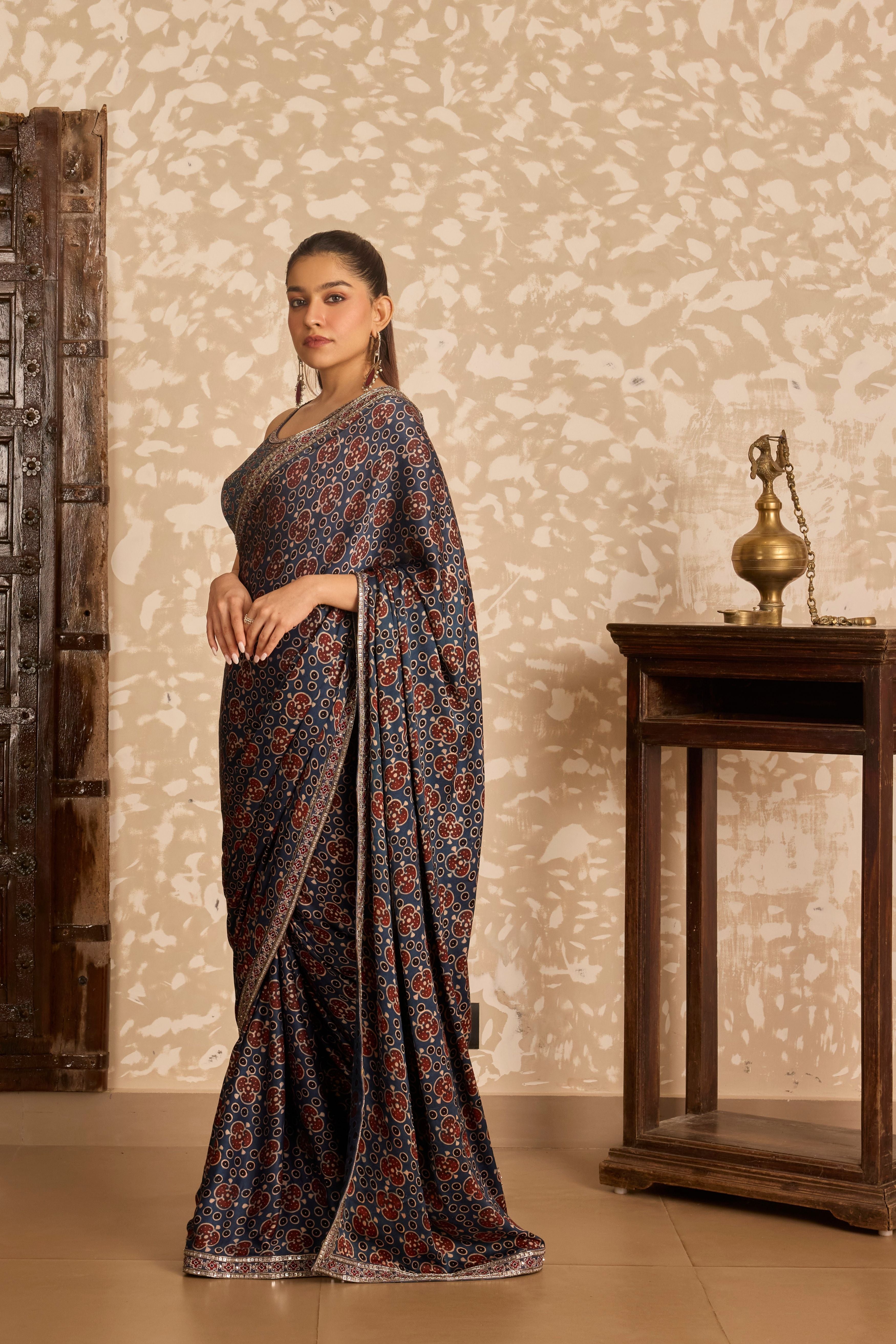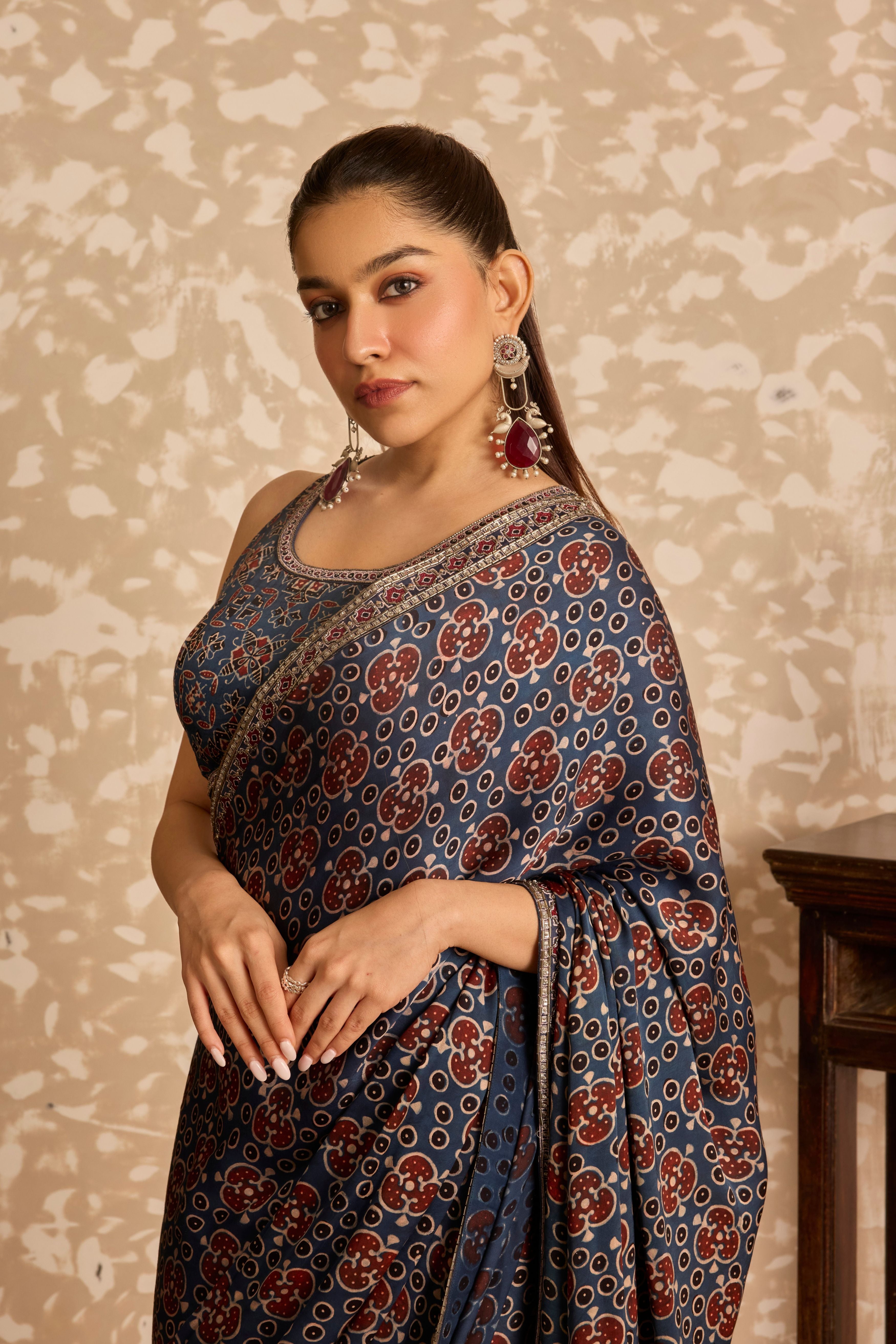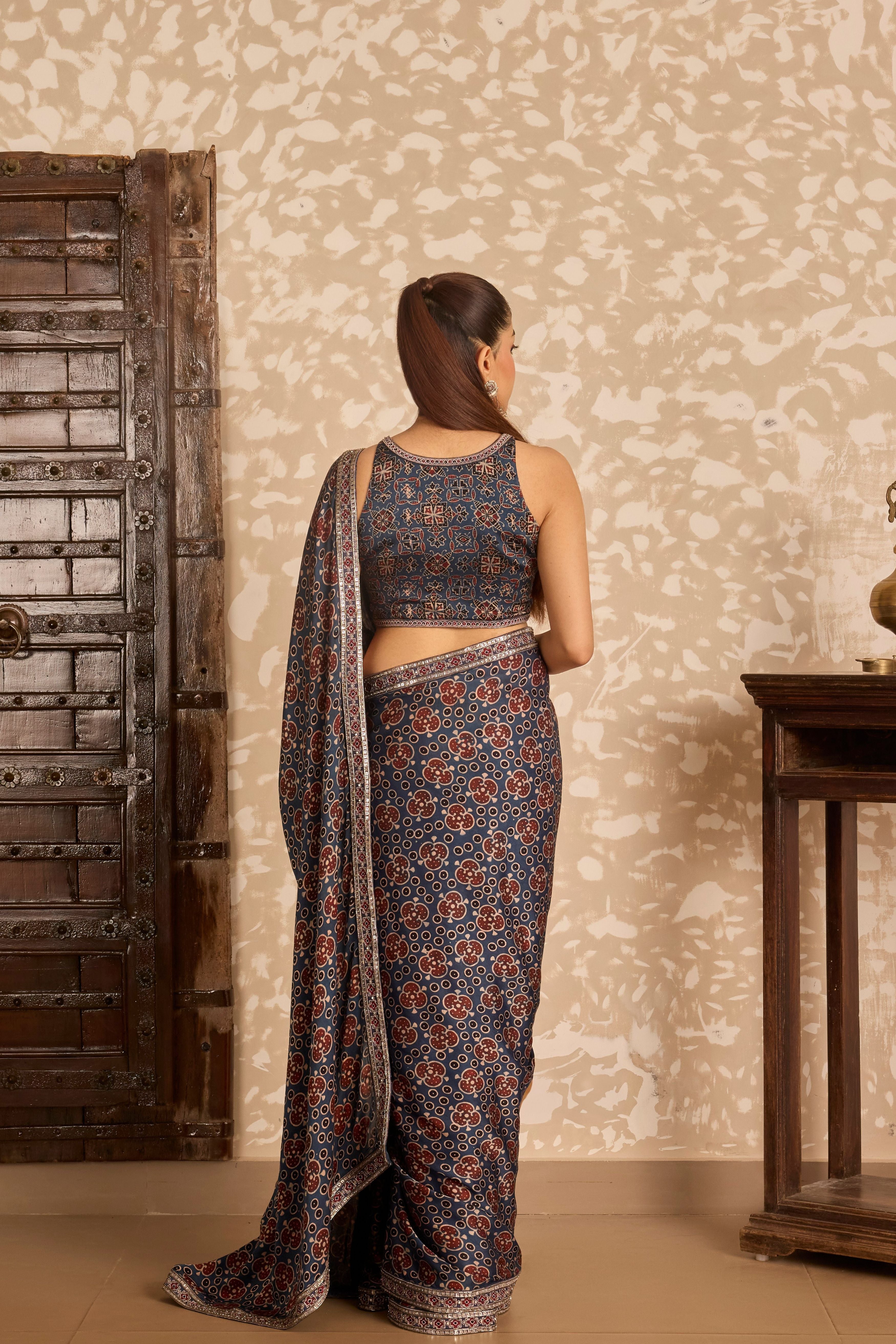 Blue Ajrakh saree featuring machine and silver hand-embroidered borders along the pallu. Paired with a contrasting Ajrakh-printed blouse, finished with machine and silver hand embroidery on the neckline and hem, secured with a side zip fastening. Handcrafted by Gujarat’s skilled artisans, the set highlights Ajrakh printing — a meticulous sixteen-step process of washing, dyeing, printing, and drying with natural dyes. Each motif makes the ensemble truly unique, ideal for festive occasions, weddings, and trousseau.