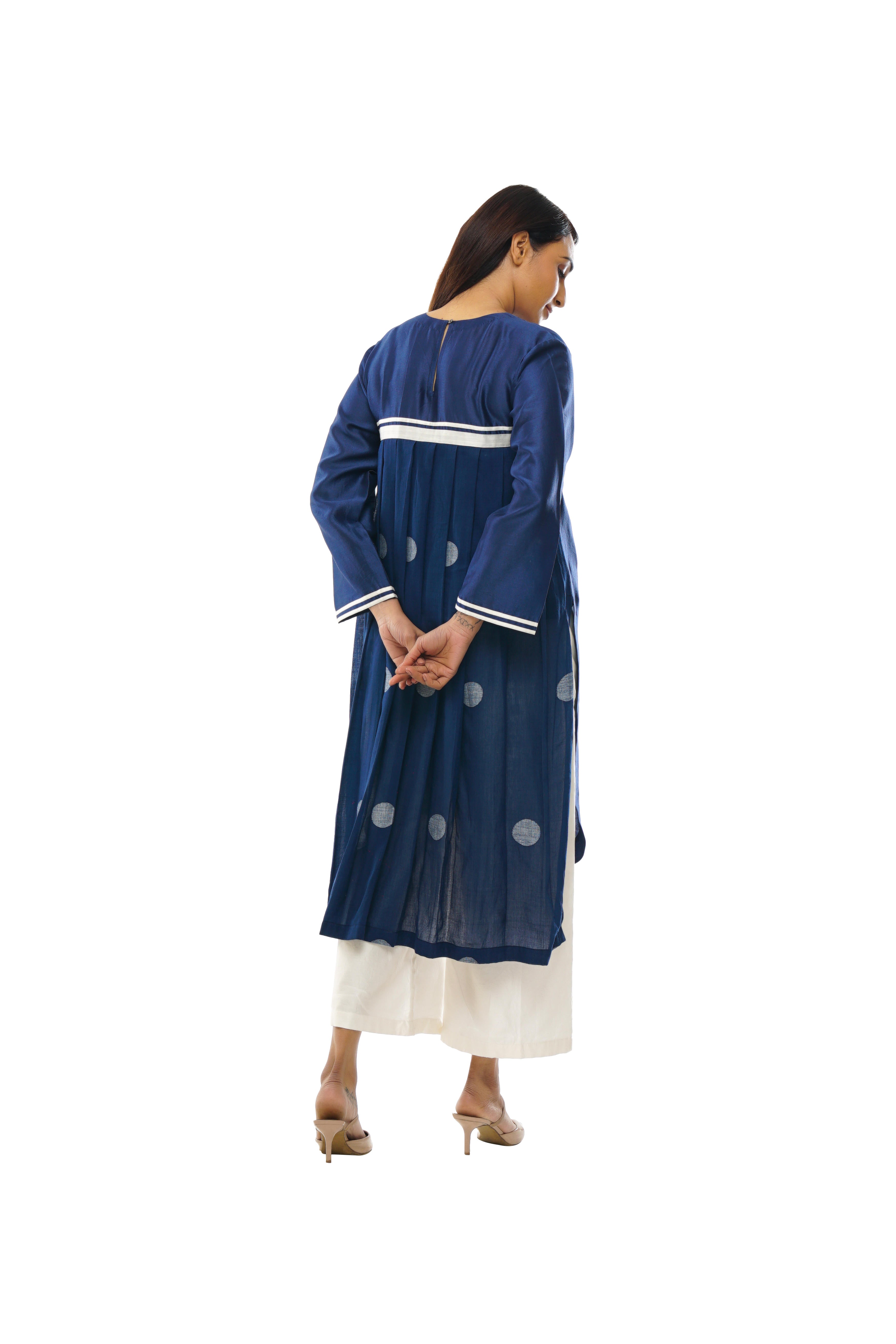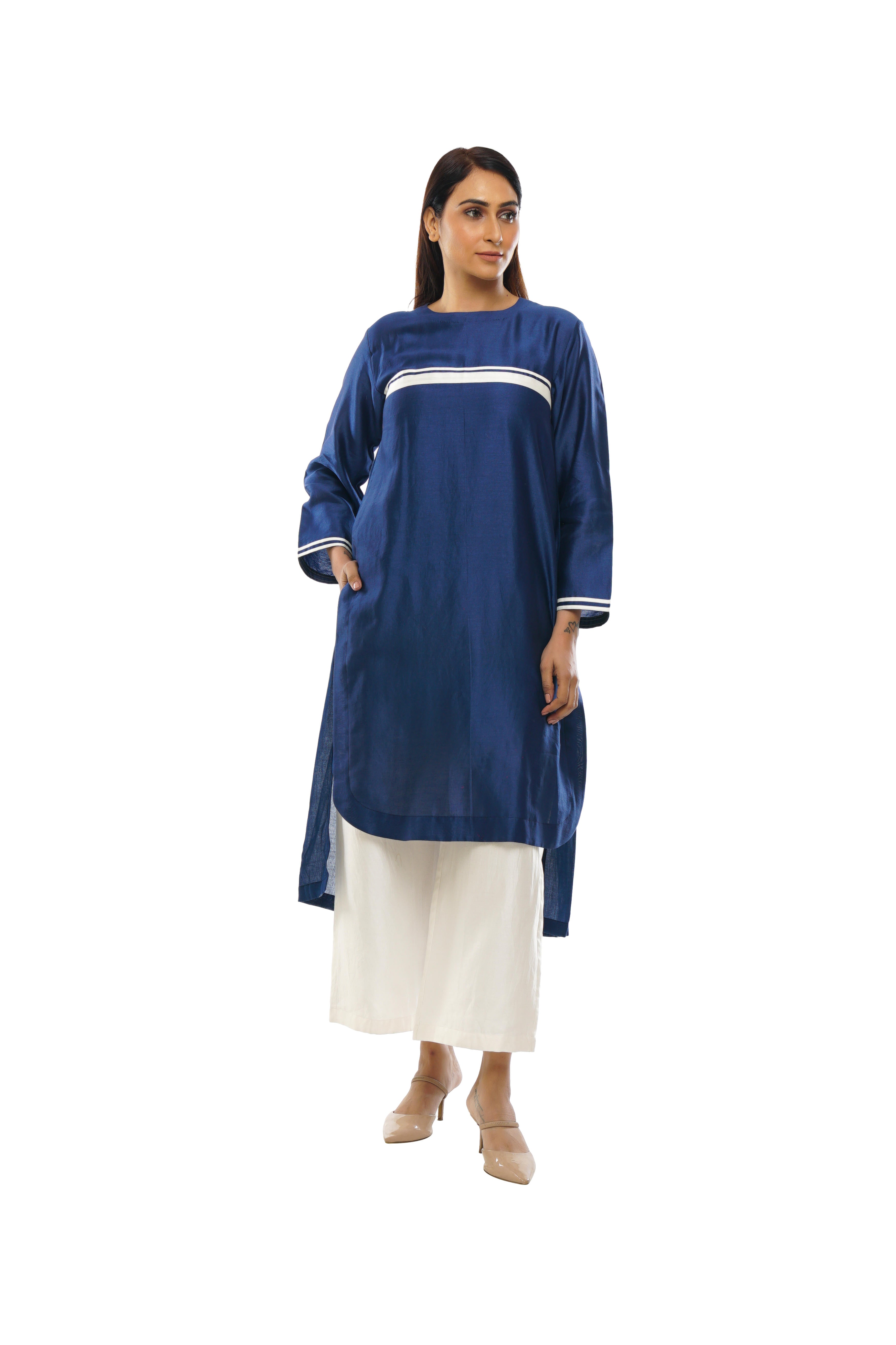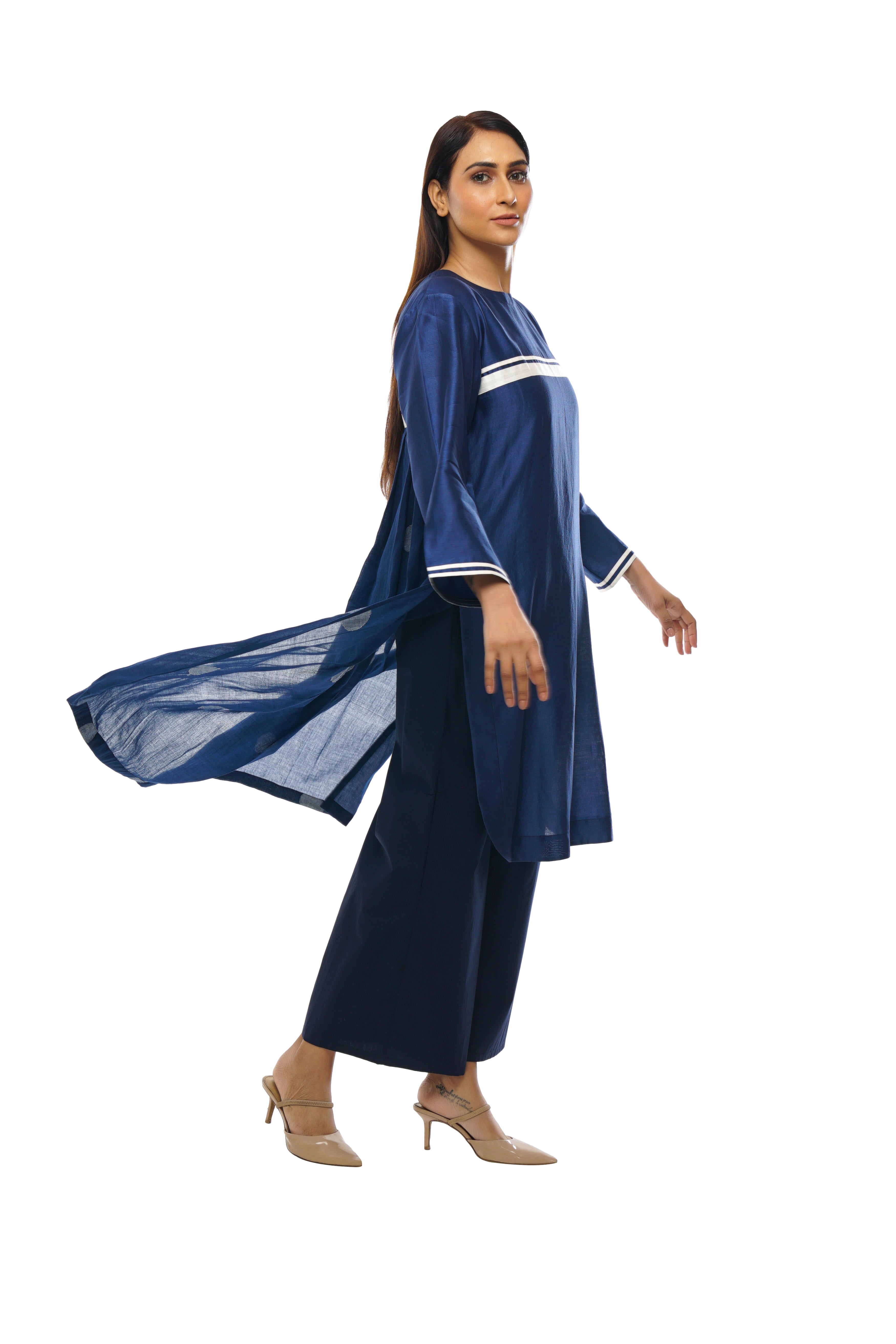 A refined take on structured silhouettes — this navy blue kurta suit features a sharp round neck, contrast detailing, and soft pleats at the back for added fluidity. Crafted in a rich blend of chanderi silk and handwoven cotton, the set with a slip is paired with ivory bottoms and a matching dupatta, making it a versatile pick for both festive moments and elegant everyday wear.