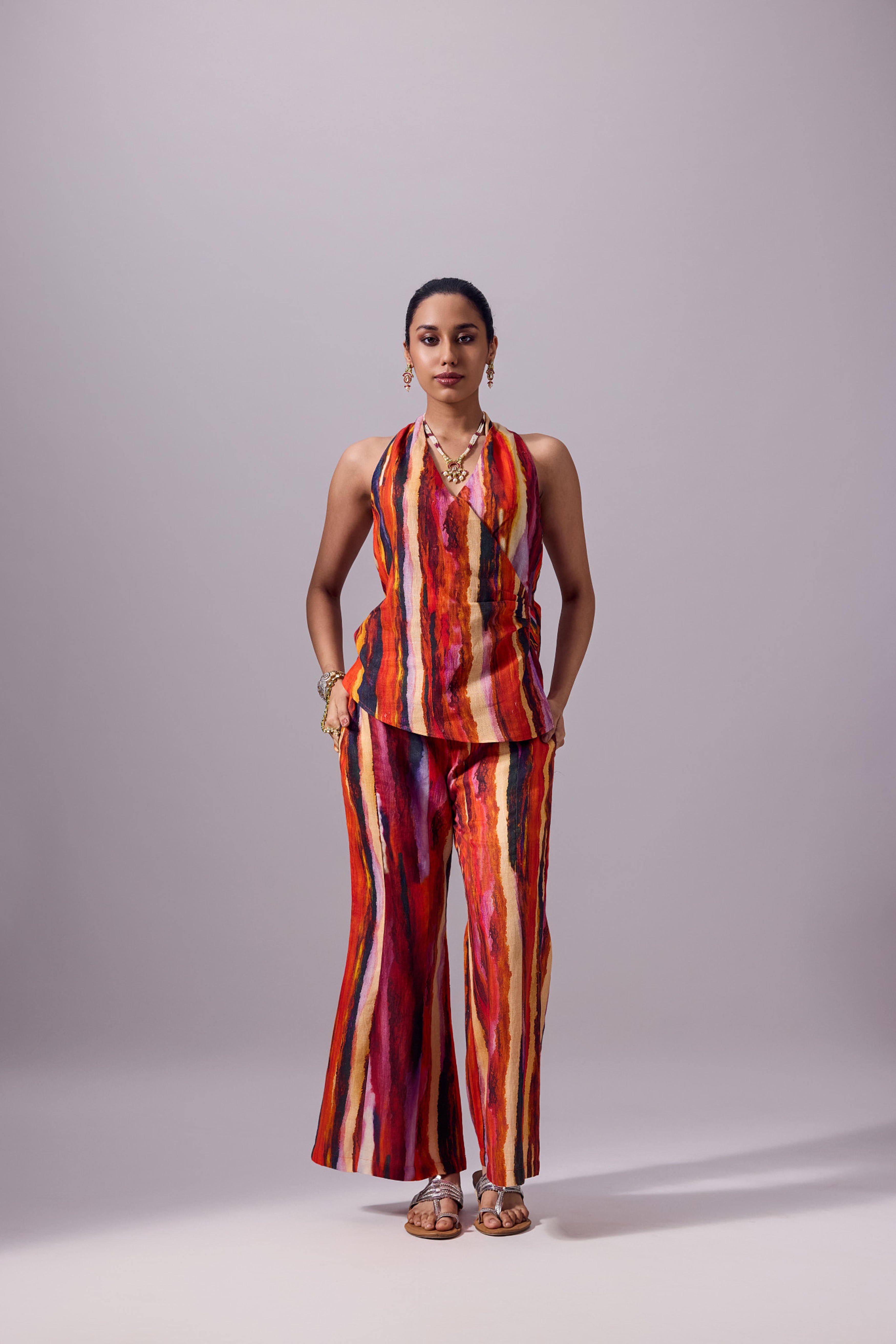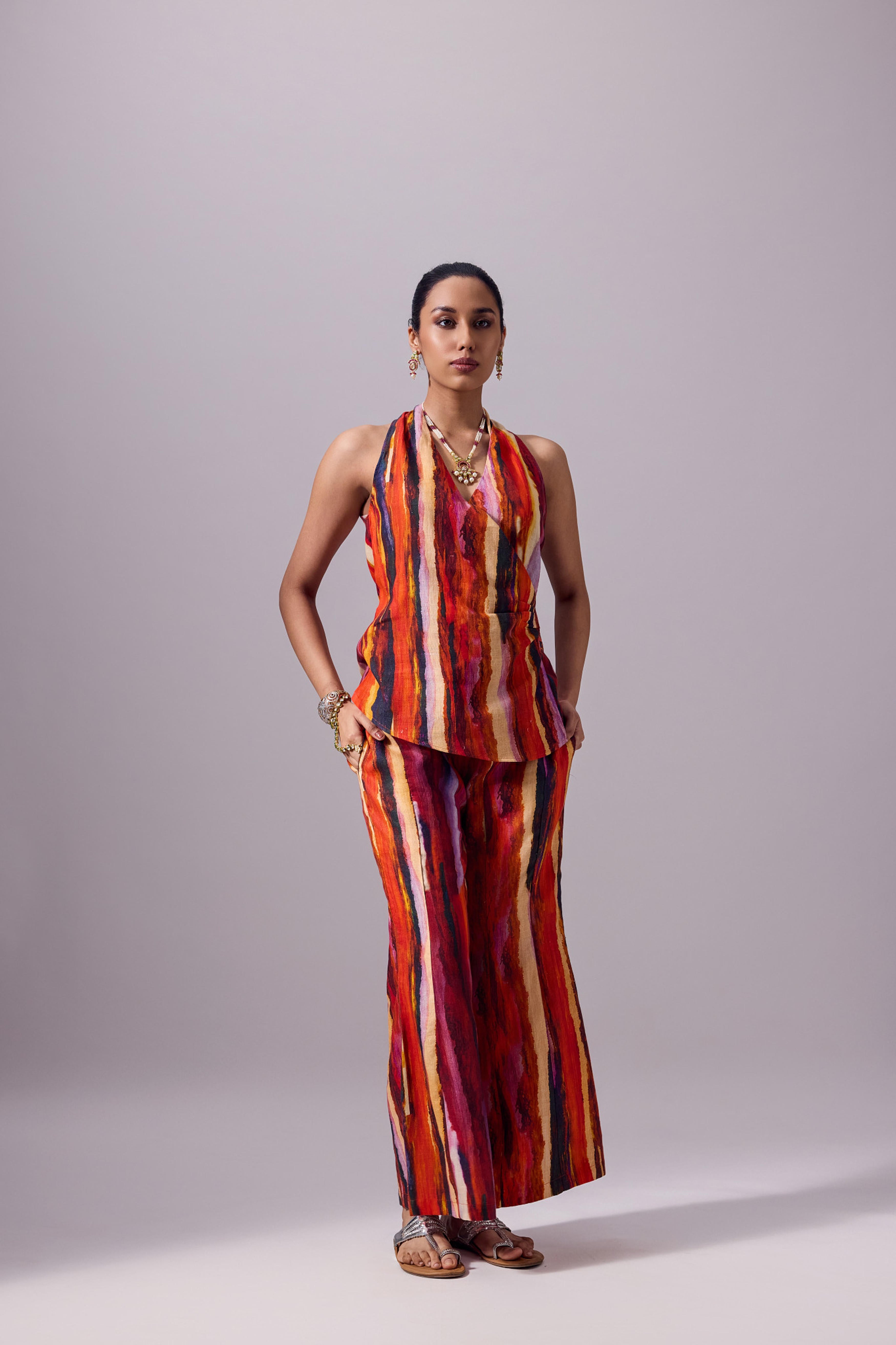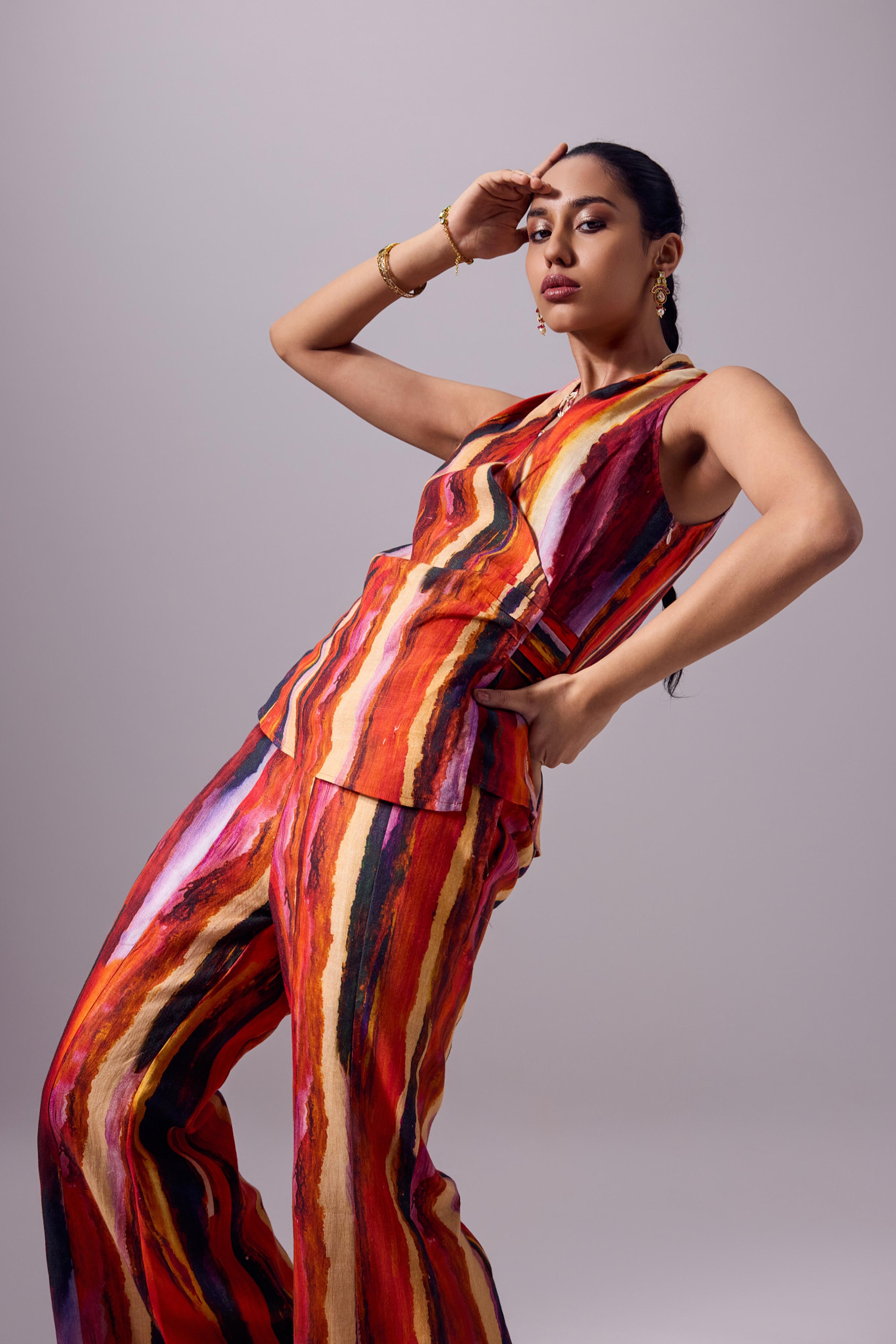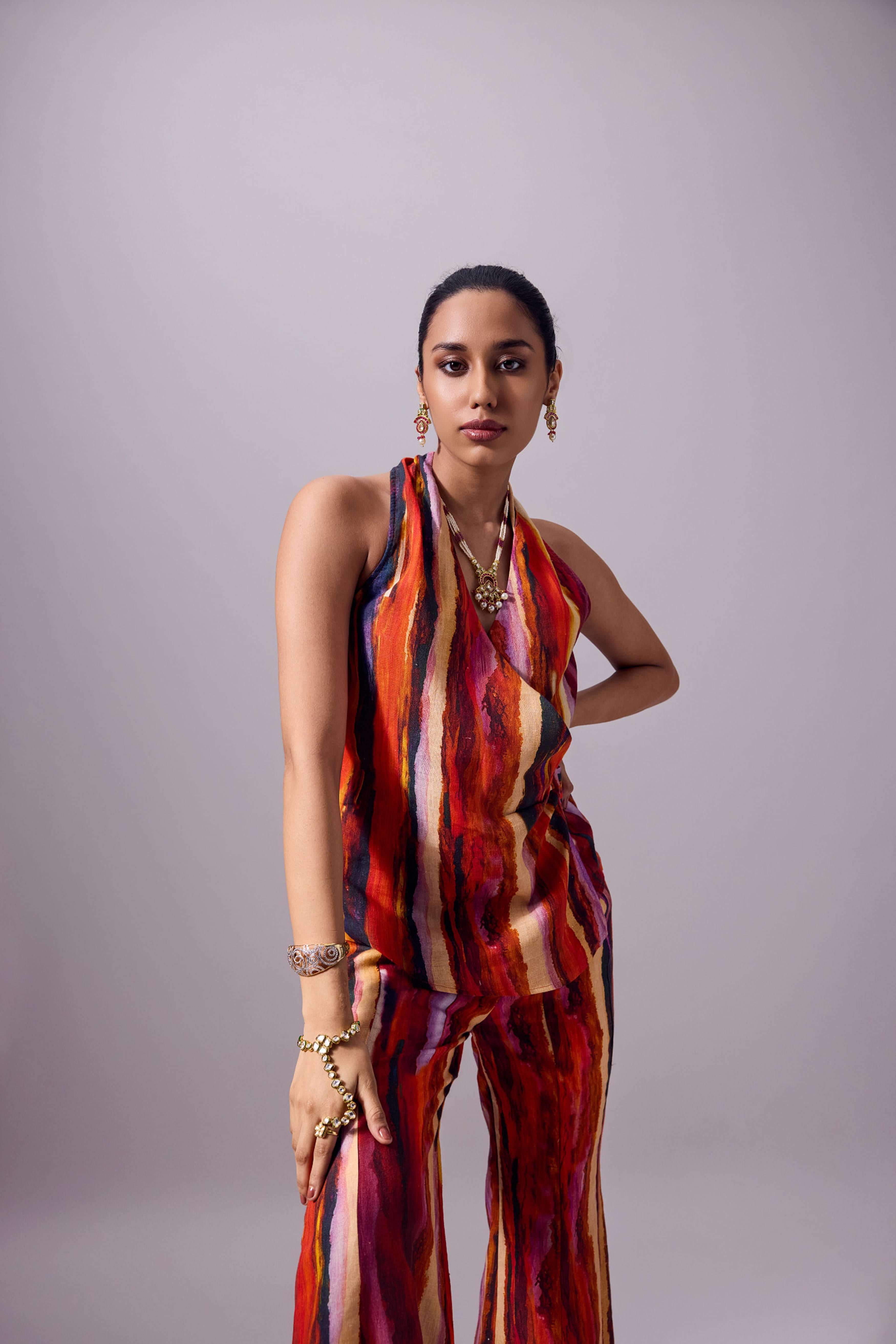 The Ruchi Set in Ember is a bold, contemporary co-ord that embodies striking vibrancy with functional ease. Crafted in 100% pure linen, this two-piece set includes a halter-wrap style top paired with flared trousers, designed to celebrate structure and flow. The Ember palette blends fiery reds, sun-kissed oranges, and deep purples in painterly brushstrokes, making it a standout ensemble. Ideal for festive brunches, cocktail evenings, or destination weddings, this set transitions seamlessly from traditional celebrations to modern soirées.
