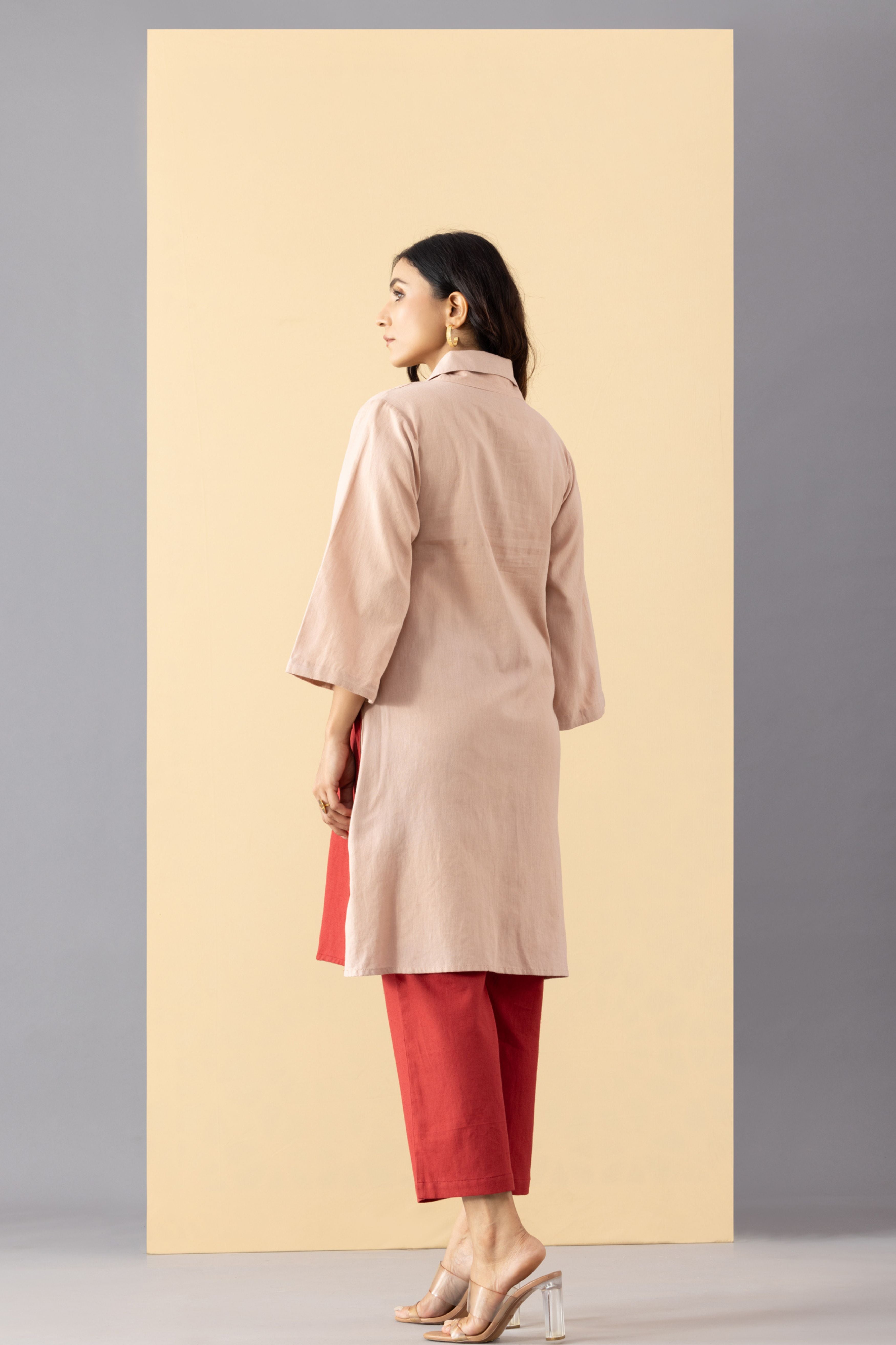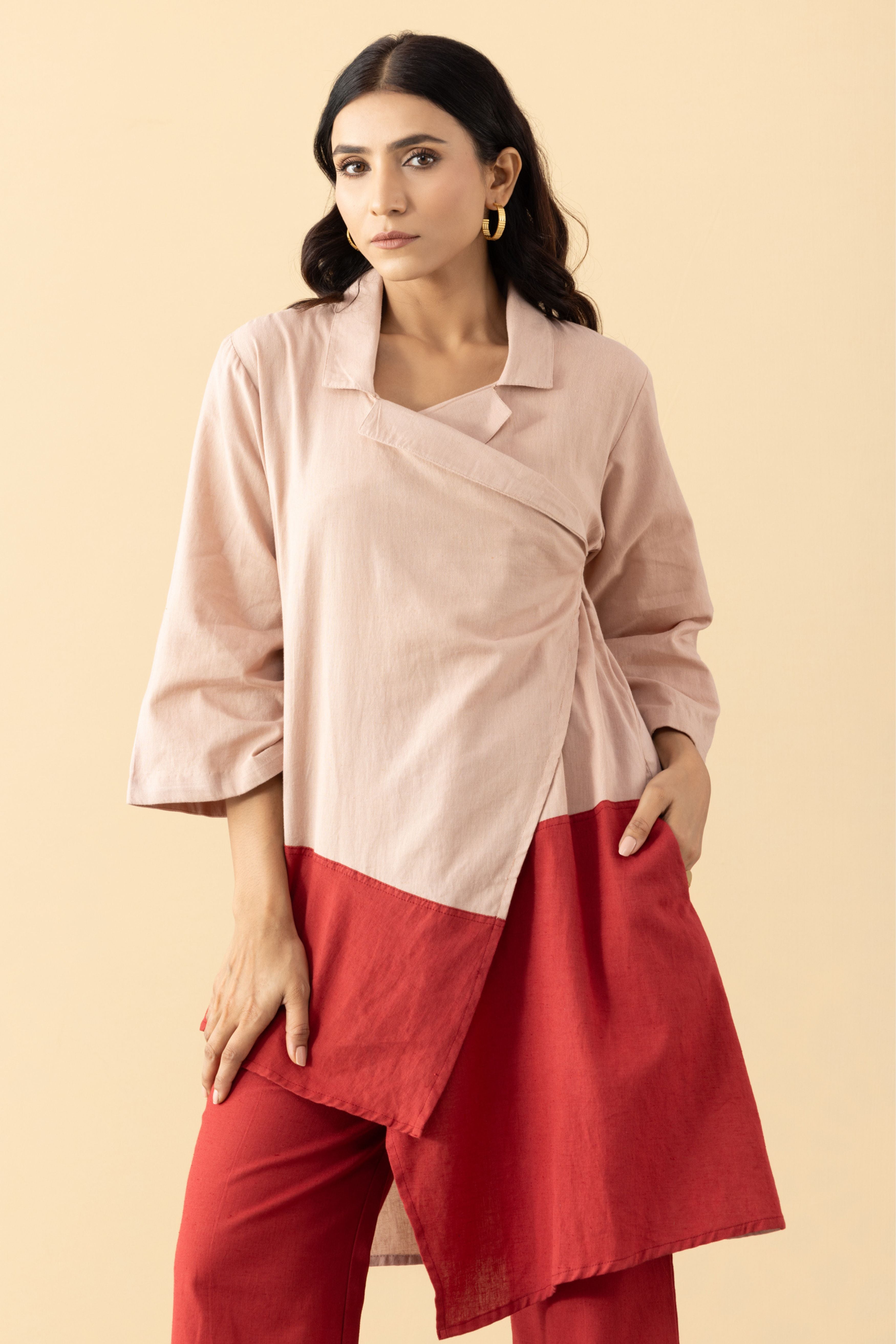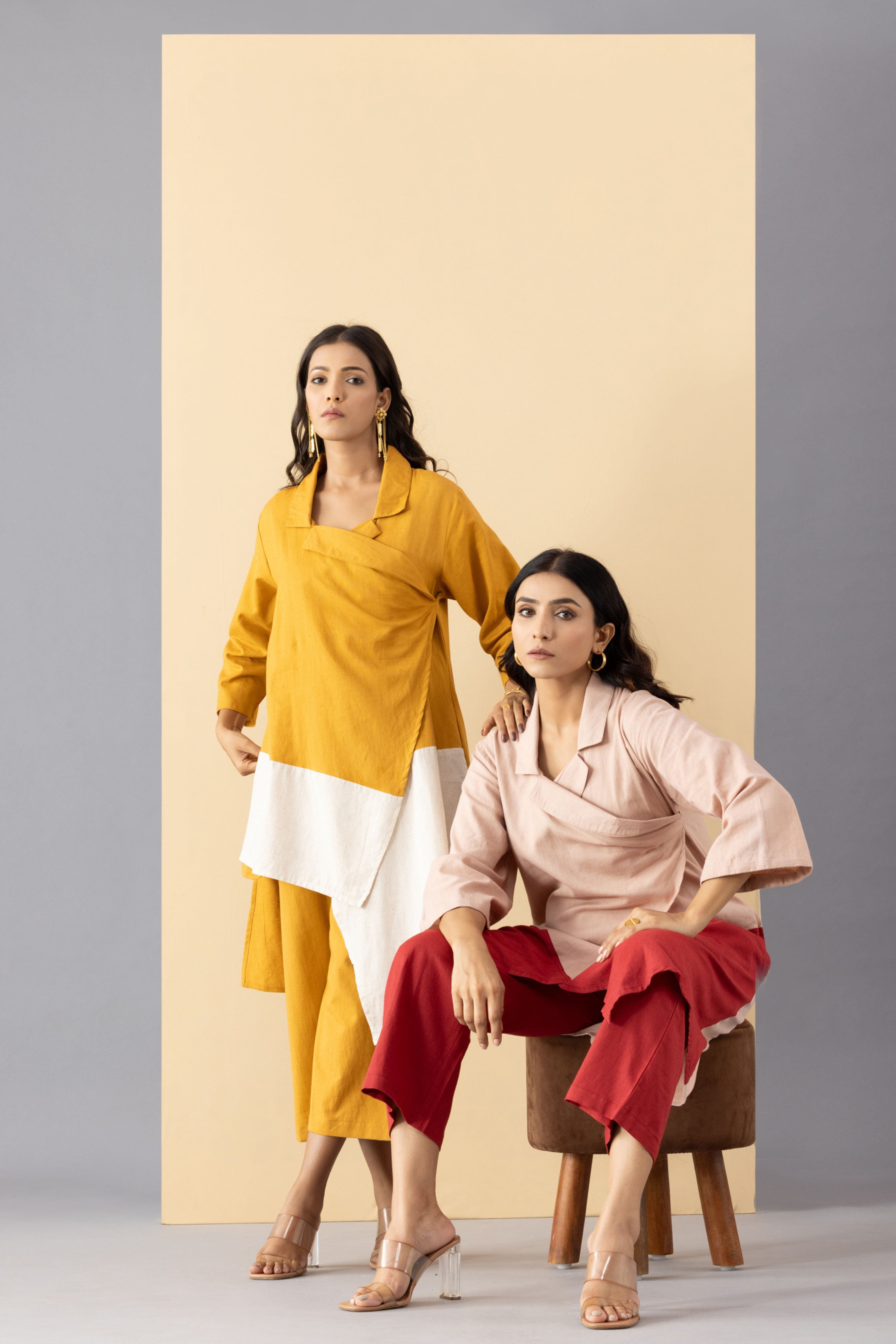 Ruhii coord set comprises of Ruhii Angrakha tunic crafted in light weight Cotton Khadi coordinated with scarlet khadi pants. This set is comfort lifestyle inspired, easy breathable cottons. It is a perfect option for light festive wear or day to day wear. - High waist pants side zipper and back elastic - 2 tone angrakha style overlap tunic - Comfort fit - Model is wearing size S - This is a textile fabric. The subtle imperfections in the weave, texture and colors are a natural outcome of handcrafted textiles and not a defect.