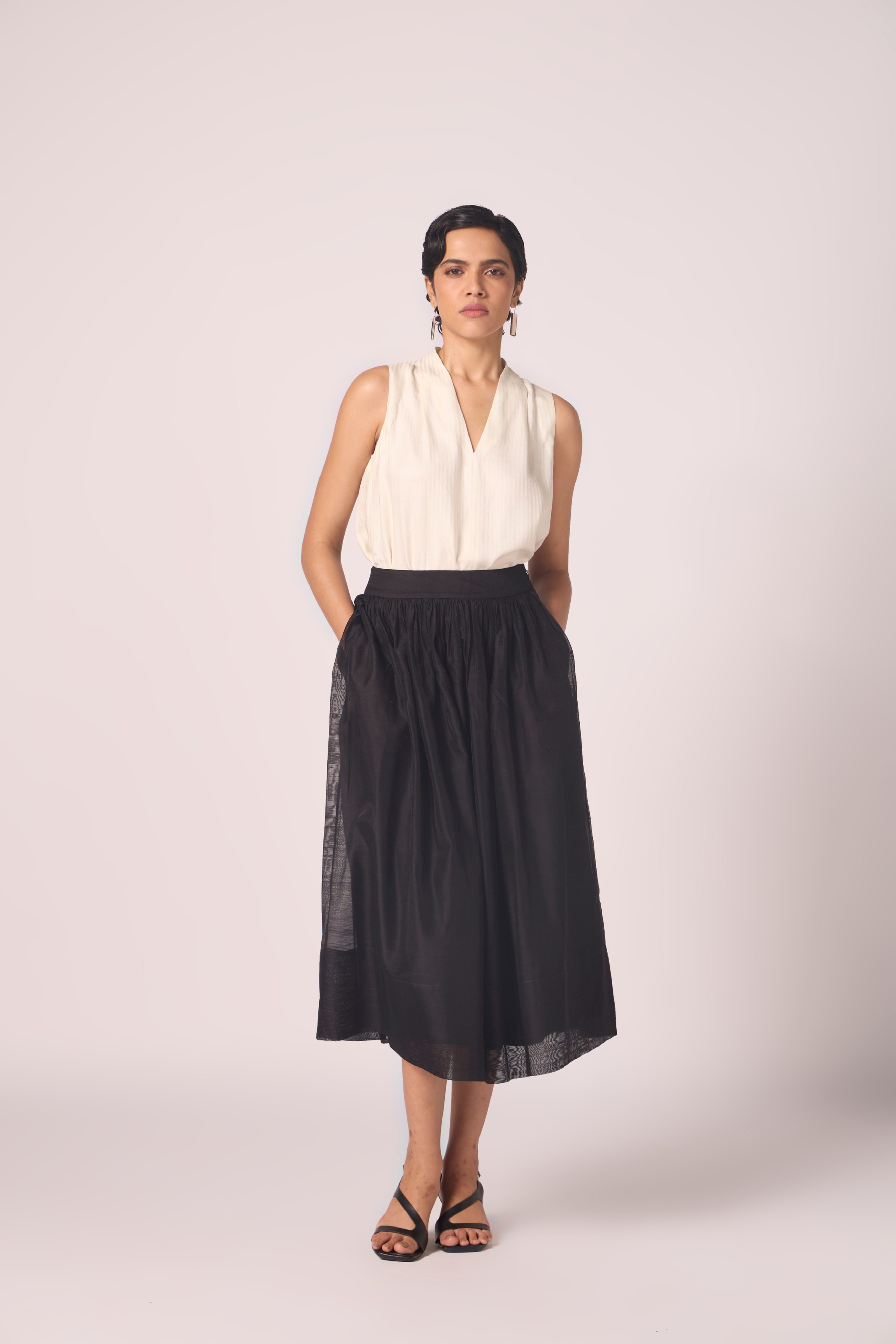 Handwoven Chanderi, this skirt gathers at the waist before flowing into measured fullness. Its construction ensures body and fall, while full lining lends depth to the silhouette. - Regular Fit - Anushka is 5'8 and wearing S . Her body measurements are Bust: 32", Waist: 29", Hips: 36" - Handwoven Chanderi with crisp texture - Gathered waistline - Concealed side zip fastening - In seam pockets - Fully lined for opacity and finish