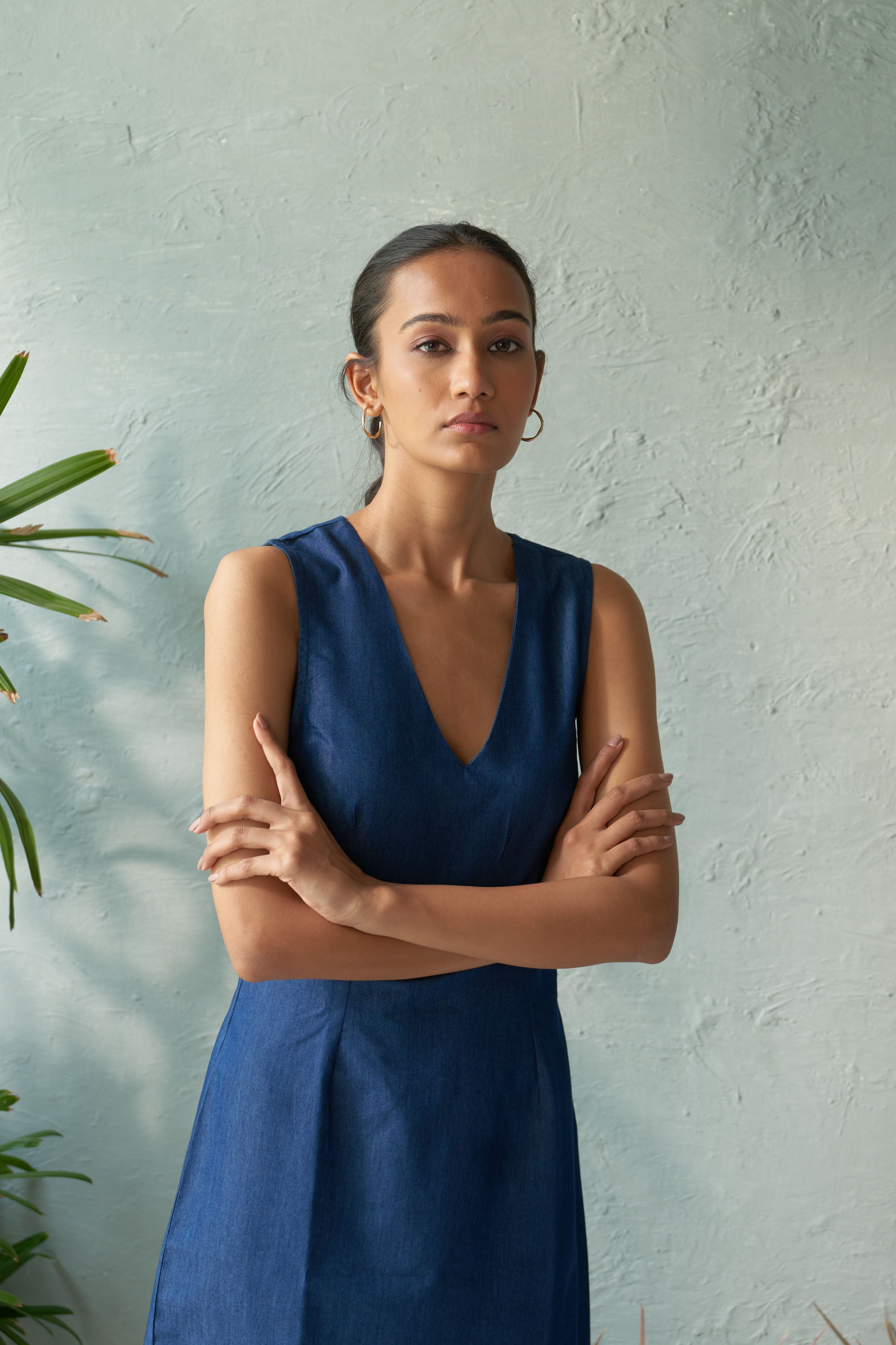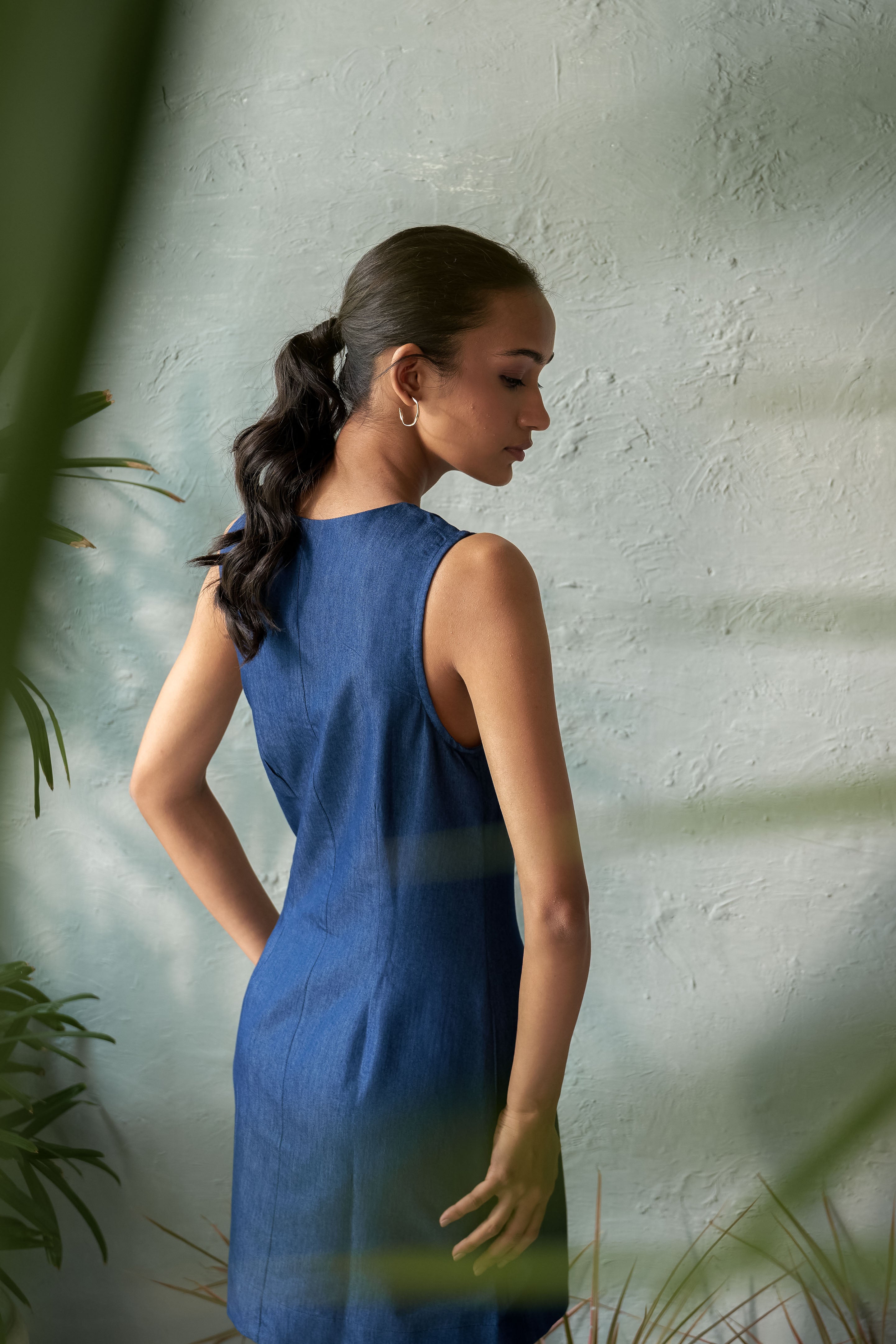 A short fitted dress with a BV (ballet) neck is a classic and flattering option that offers both comfort and elegance. The fitted silhouette accentuates the body's natural shape, while the ballet neckline provides a subtle and feminine touch. This dress can be styled for various occasions, from casual outings to more formal events, making it a versatile addition to any wardrobe. Pair it with heels for a sophisticated look, or dress it down with sneakers or flats for a more relaxed vibe. Accessories can further elevate the outfit, whether it’s a statement necklace or a chic belt. Note: Denim may exhibit natural distress marks due to the fabric's weave.