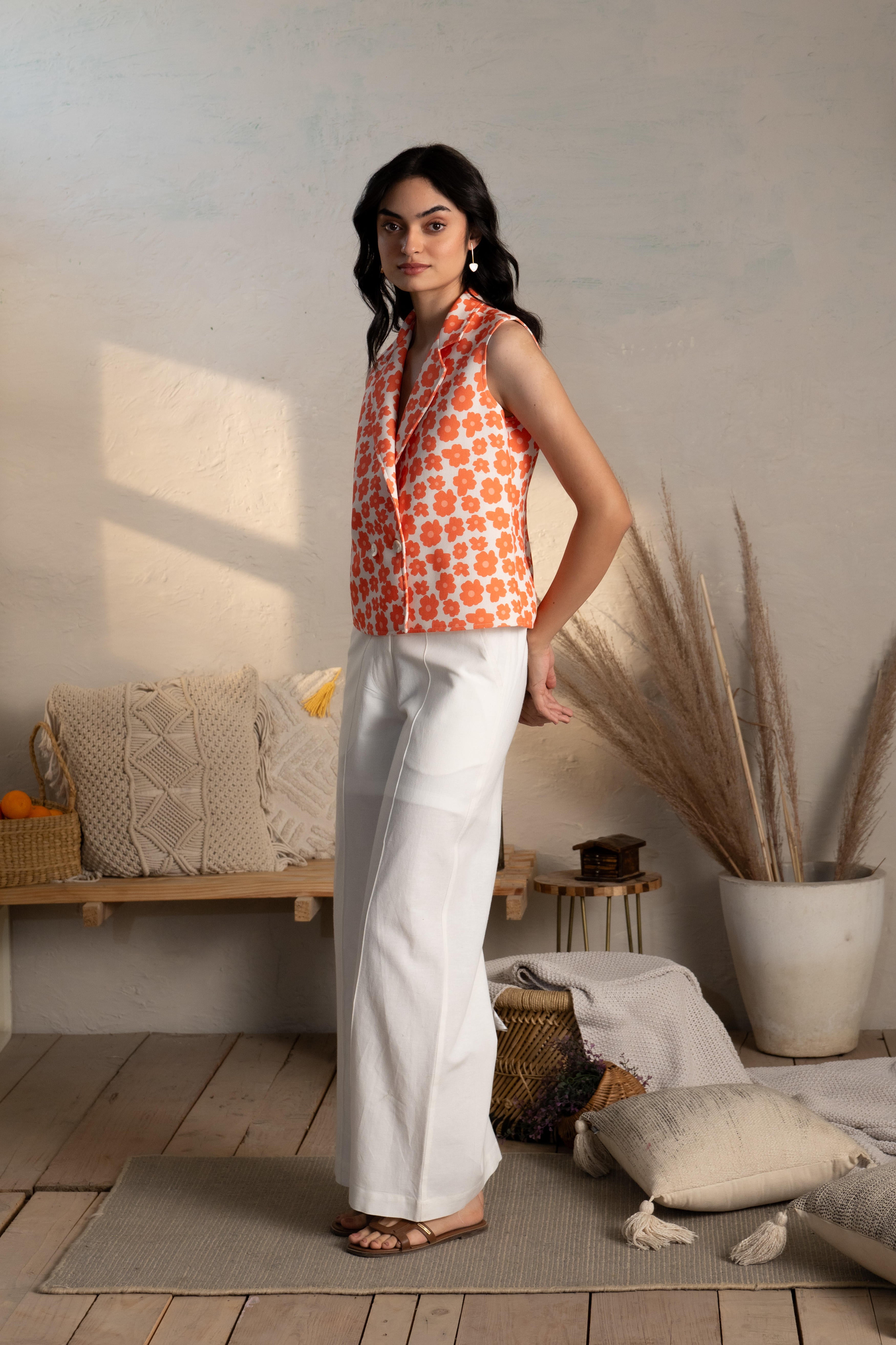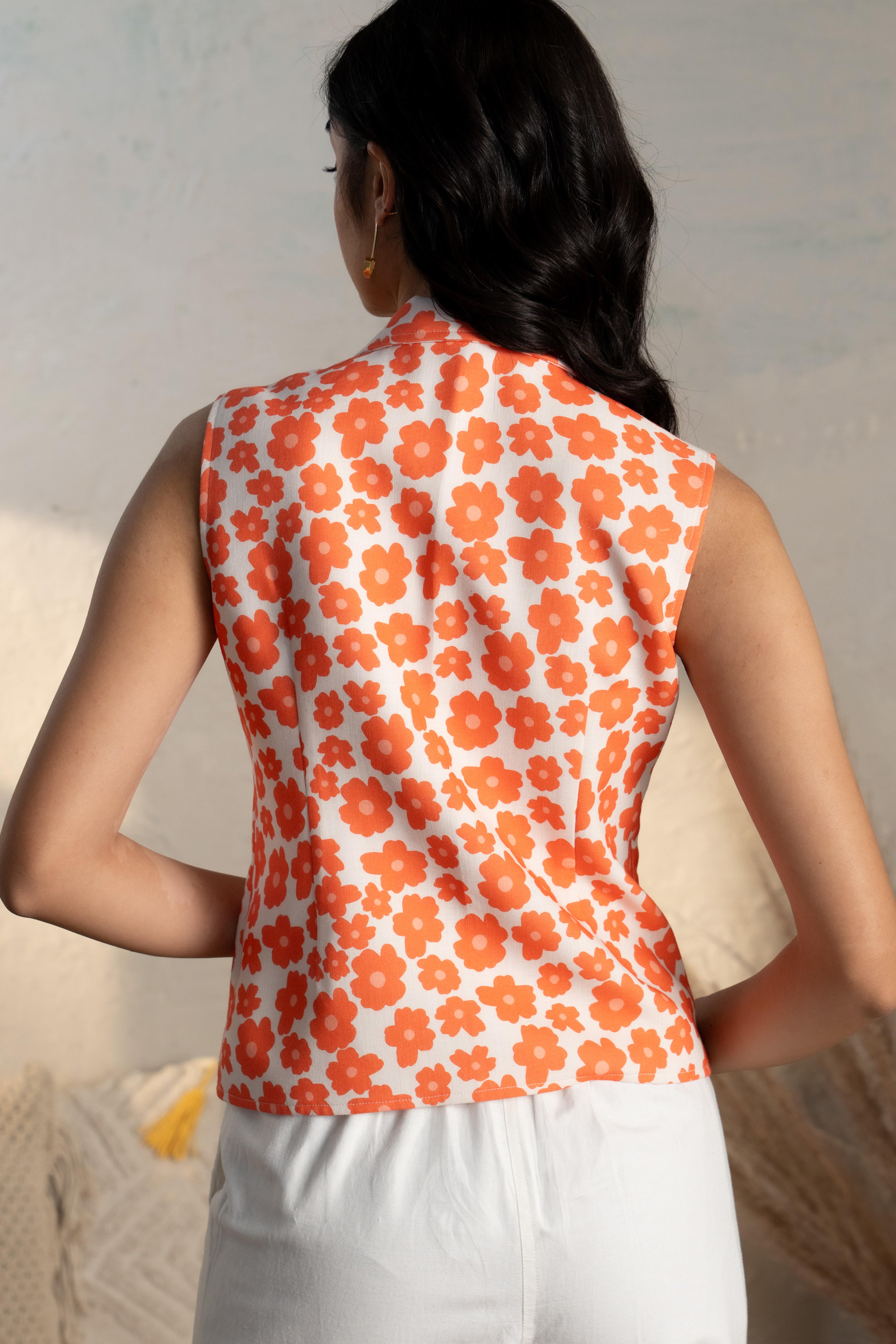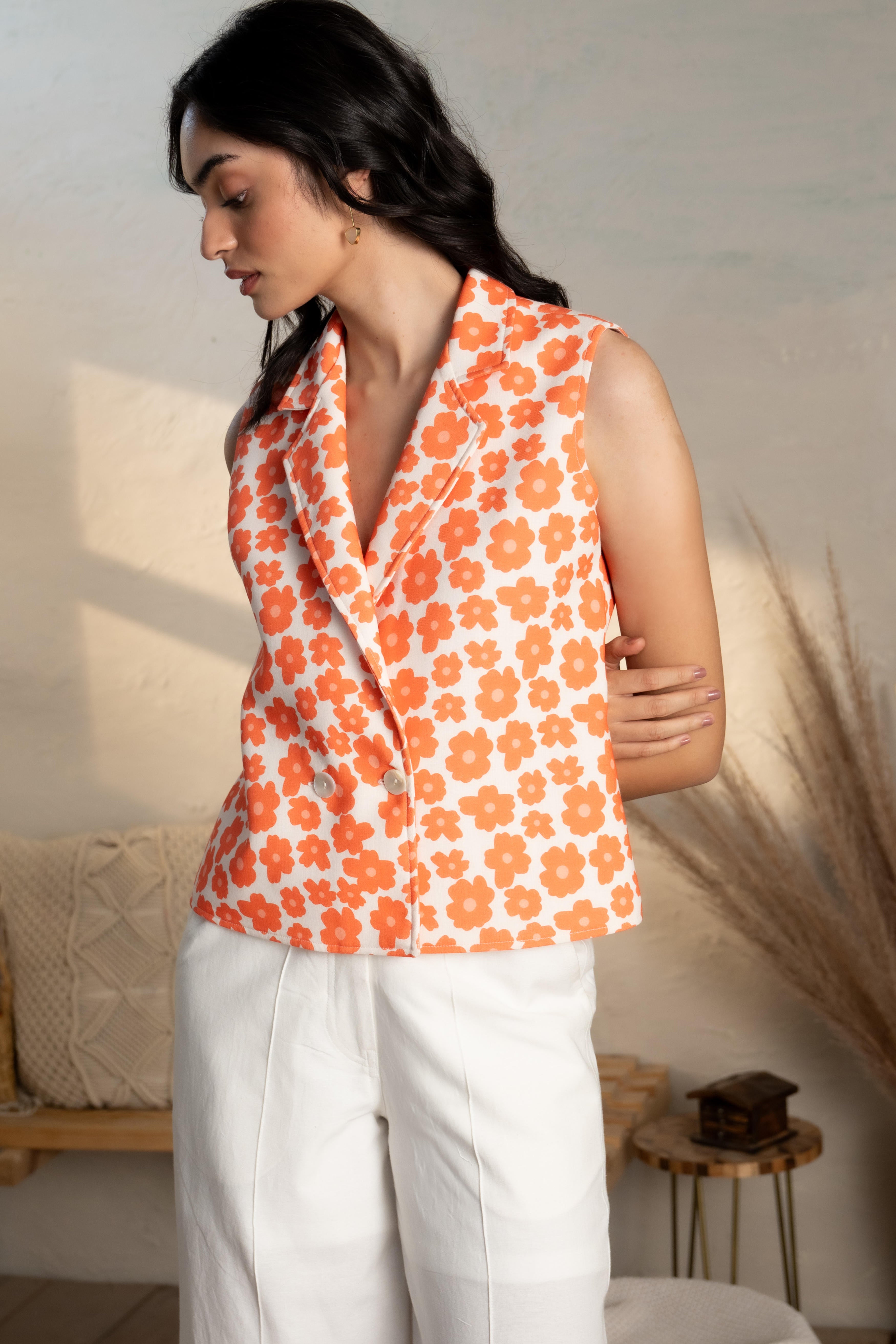 Elevate your wardrobe with the Savanna Glow Waistcoat, a sleeveless top in a captivating floral print. This waistcoat-style design features a chic double-buttoned front for a tailored yet effortlessly stylish look. Structured with a soft cotton lining, it combines sophistication and comfort, making it a versatile piece for layering or wearing on its own.