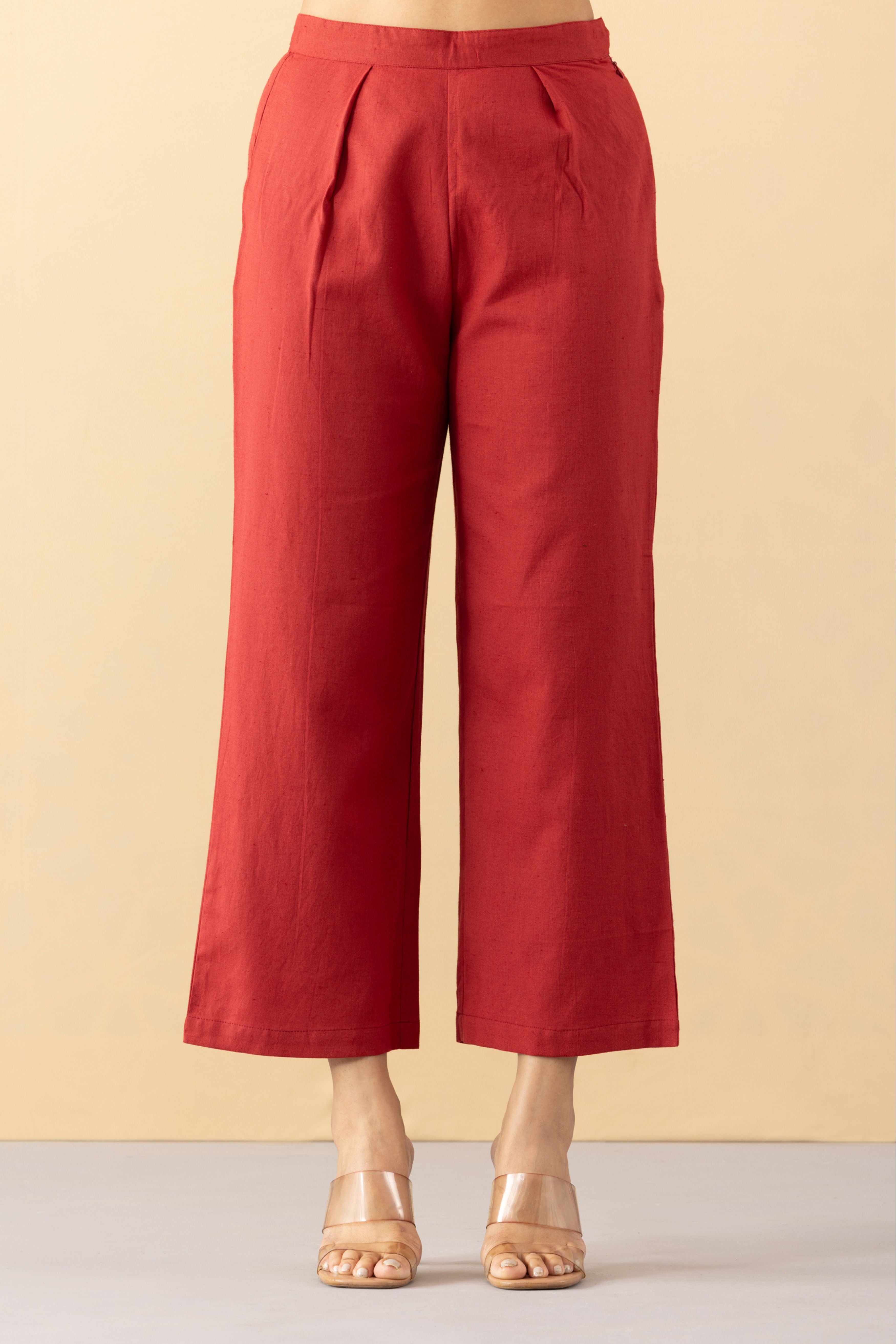 These High waist scarlet colored pants are perfect to pair with your tunics or kurtis. These pants are comfort lifestyle inspired, they come in various colours. - Side zip opening and back elastic - Comfort fit - Model is wearing size S - This is a textile fabric. The subtle imperfections in the weave, texture and colors are a natural outcome of handcrafted textiles and not a defect.