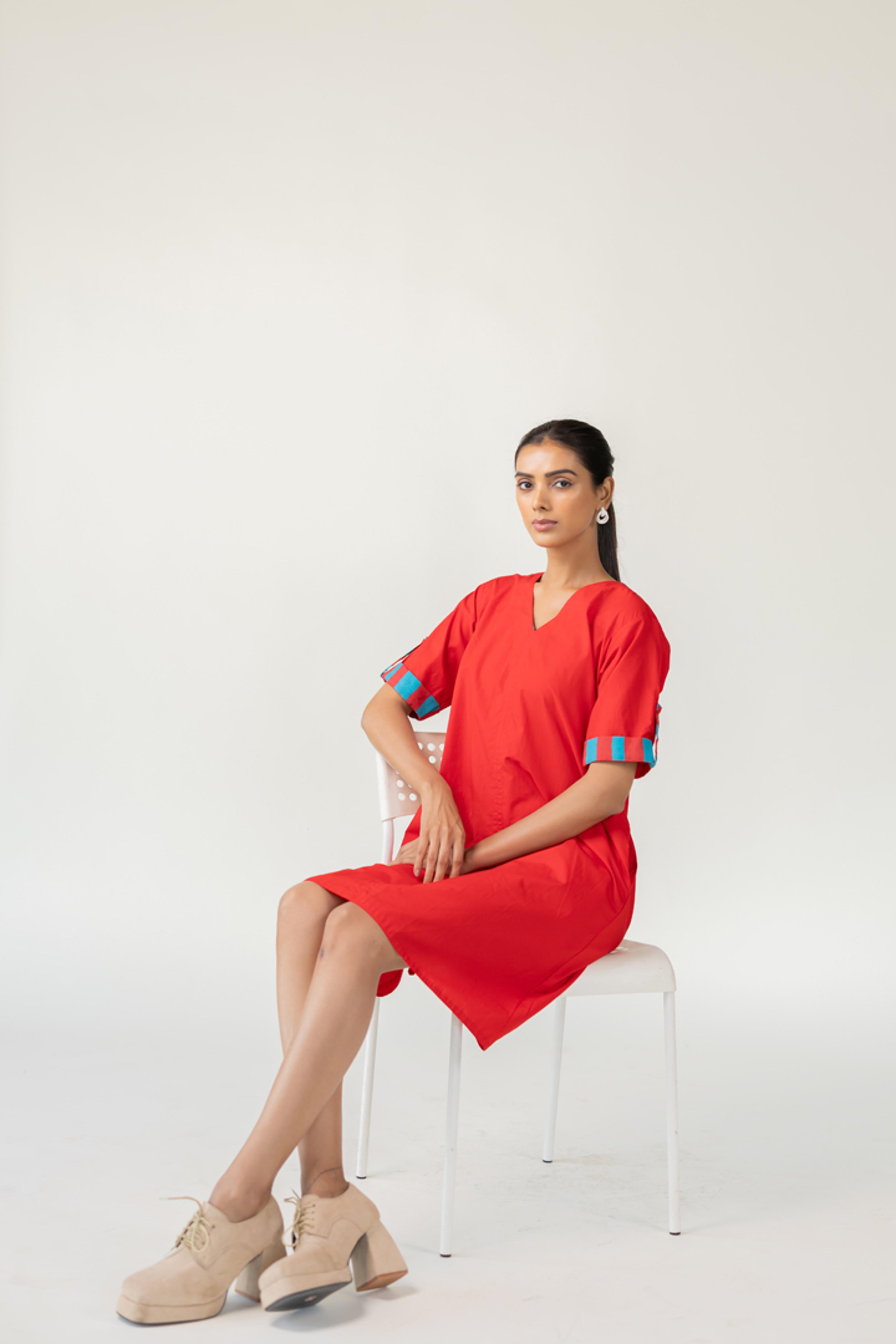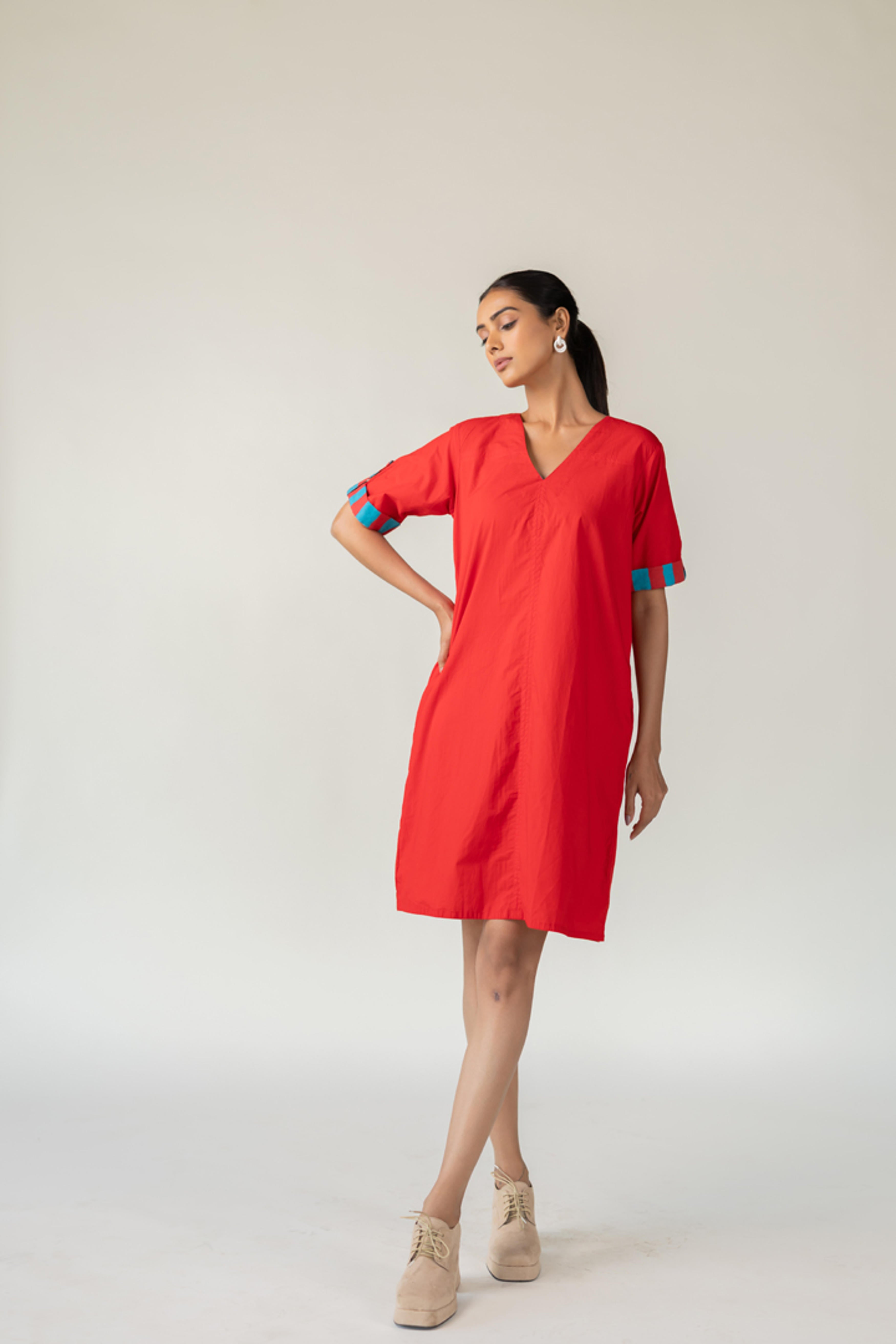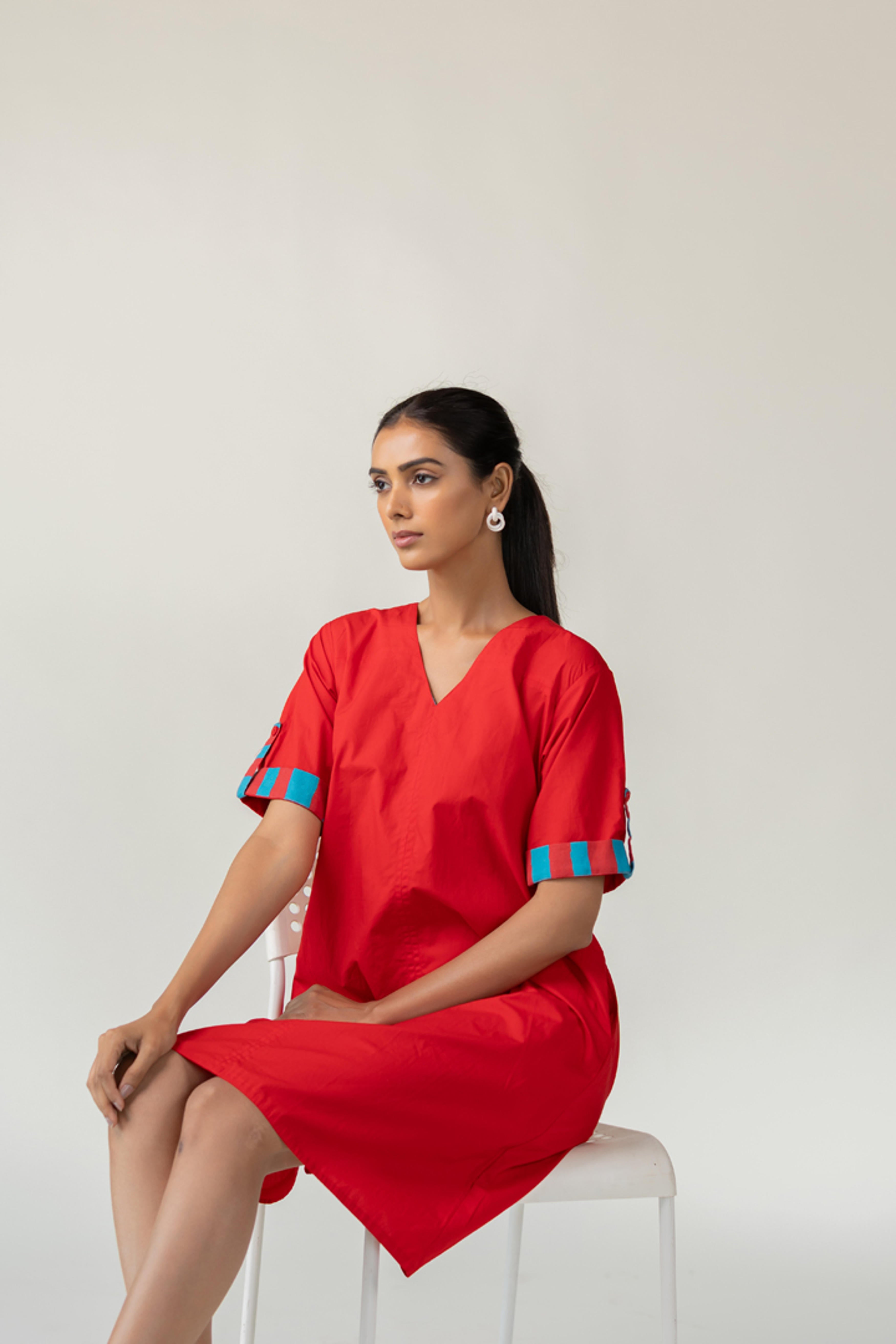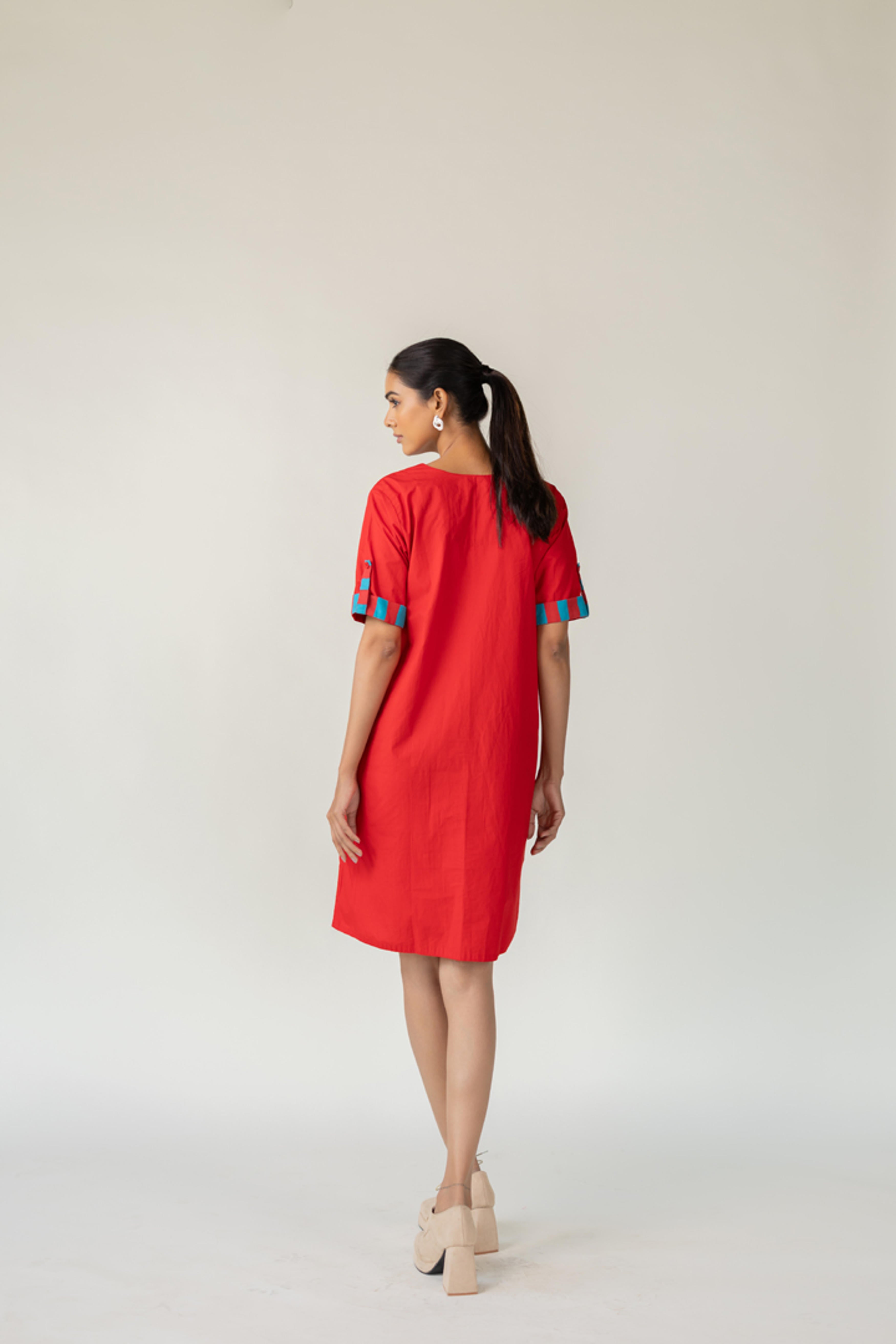 The Scarlet Pop Shift Dress delivers an instant burst of color and cool. Crafted in a bold red cotton, this easy-fit shift dress features a flattering V-neckline and short sleeves. What sets it apart is the vibrant pop of turquoise detail on the sleeve cuffs?a playful nod to contrast. This dress is perfect for effortless dressing with a standout twist. Length dress - 38"