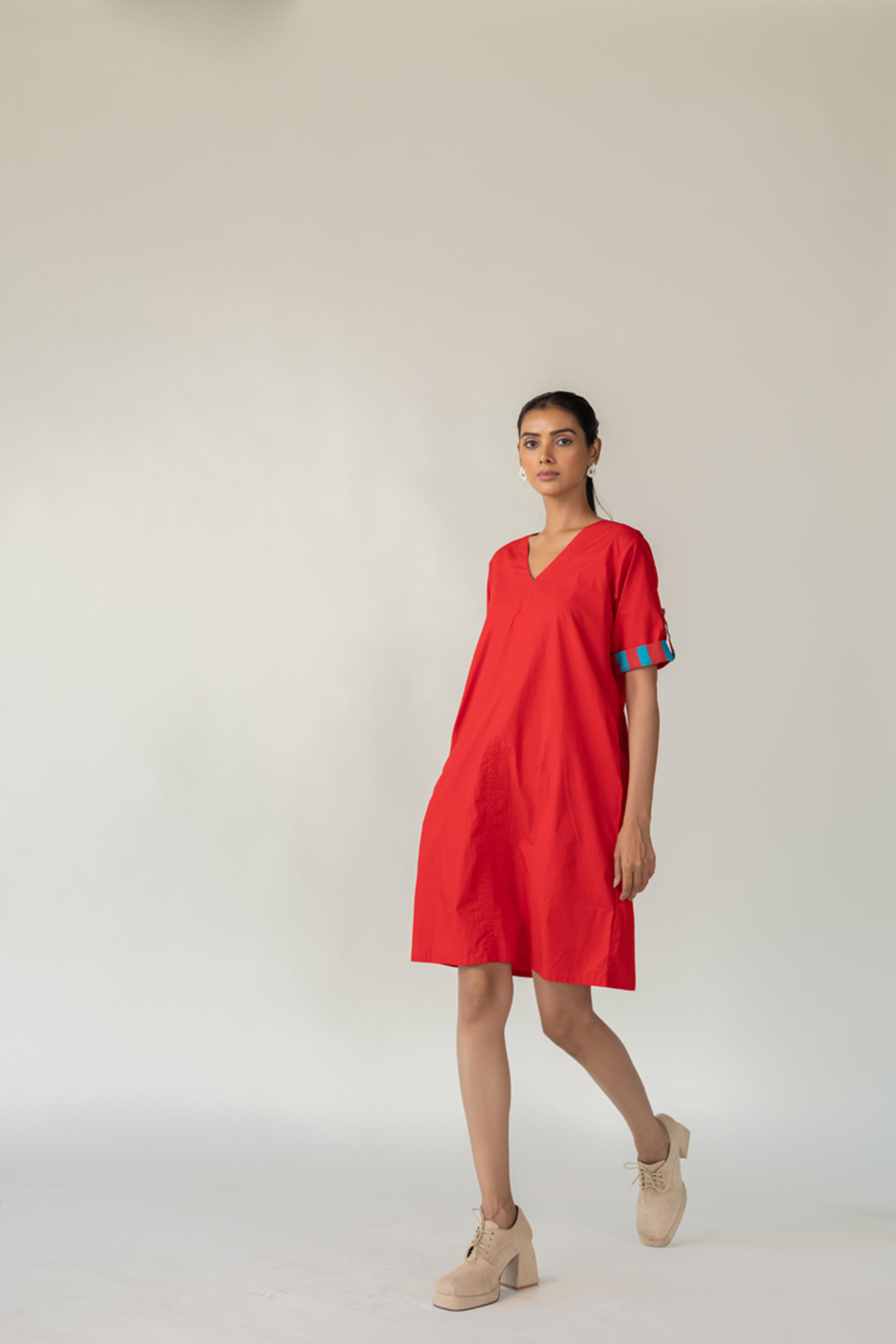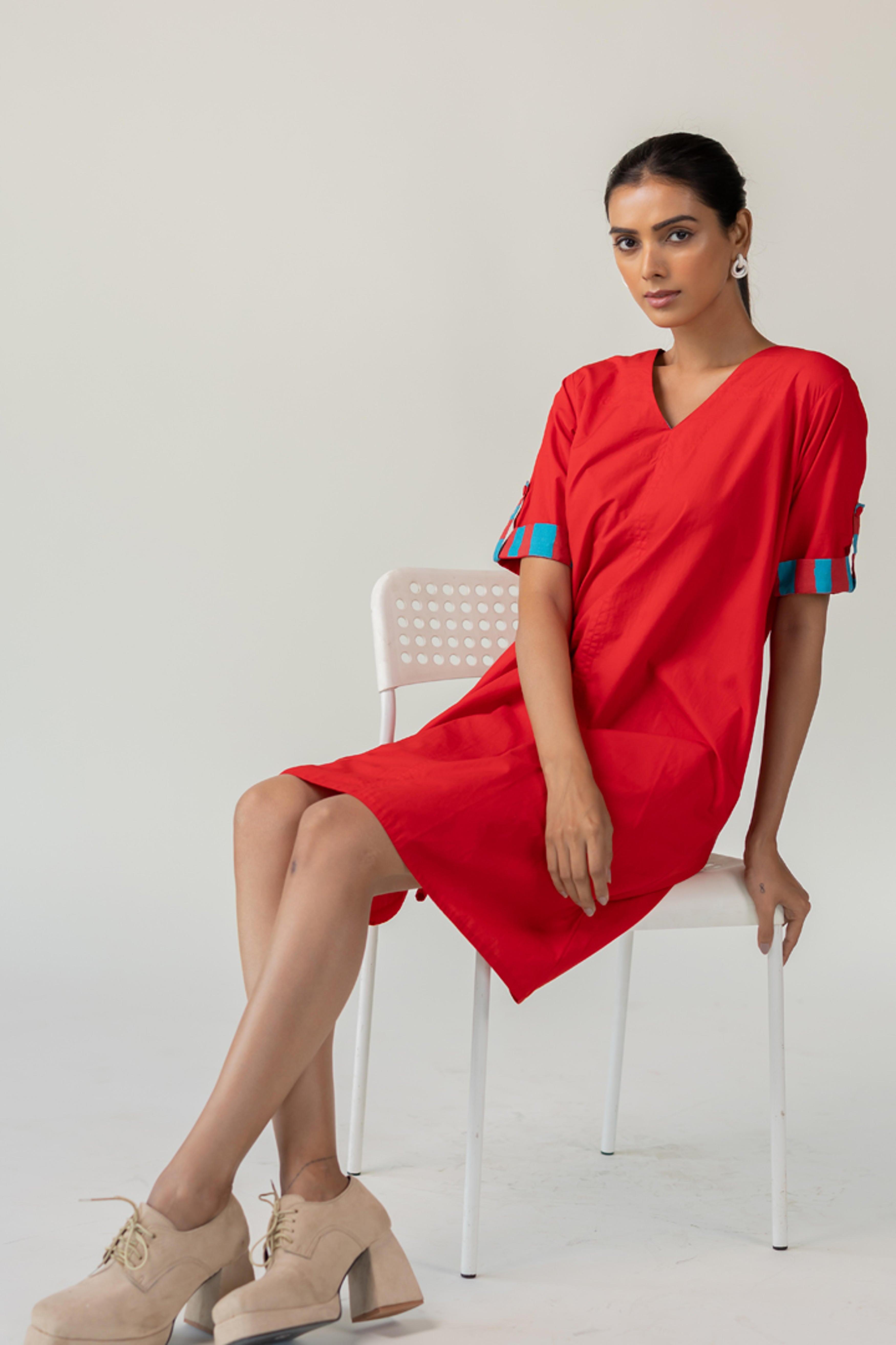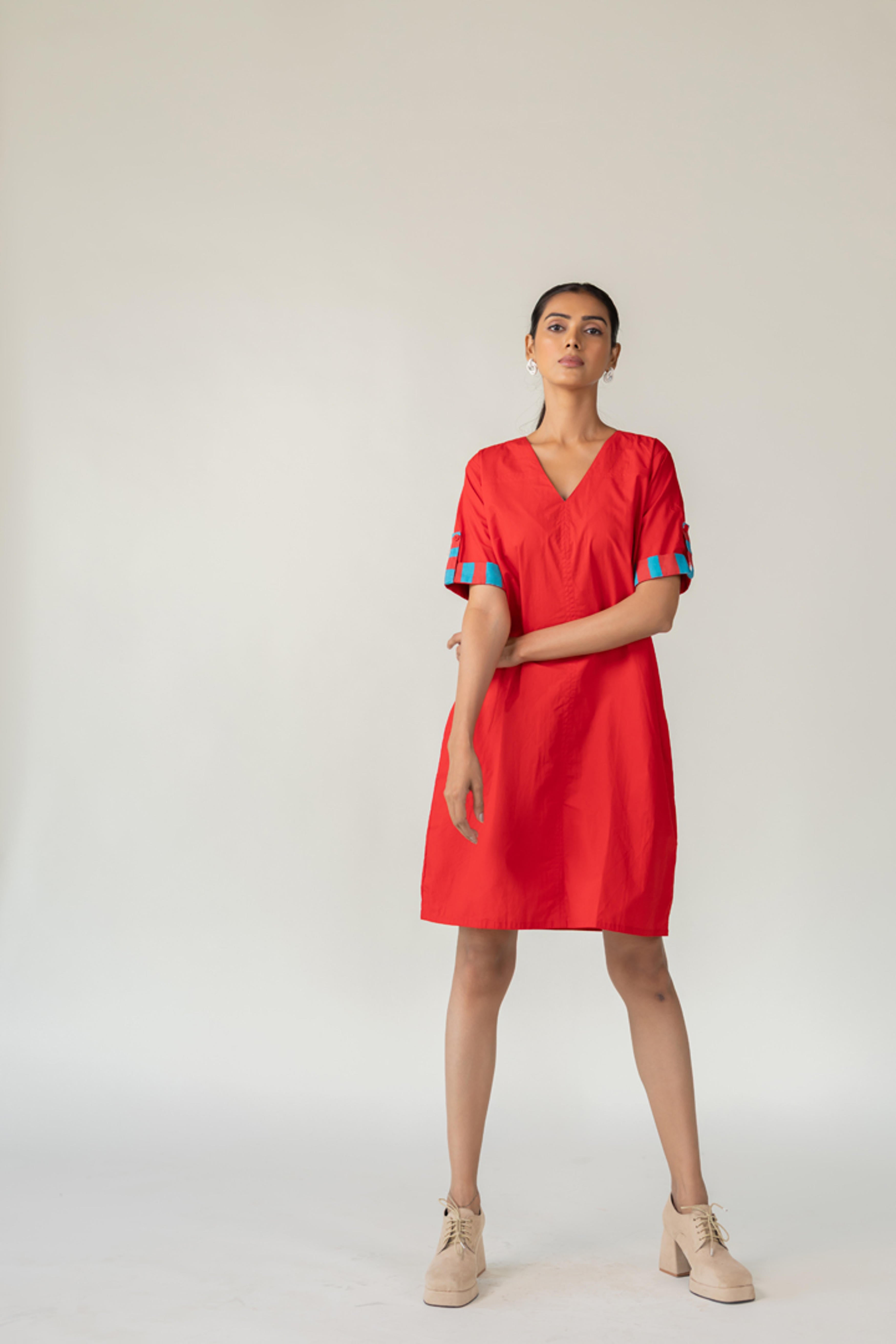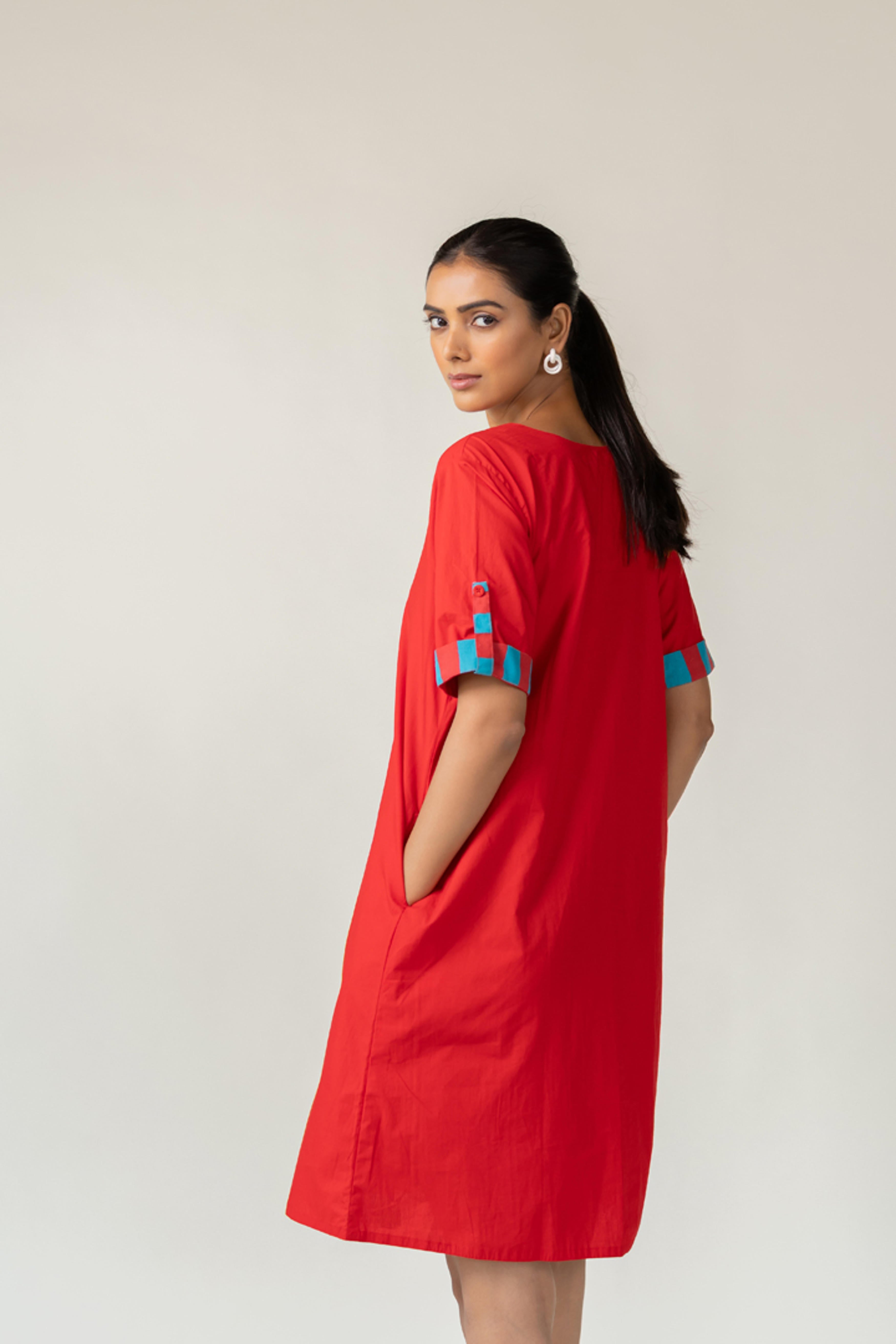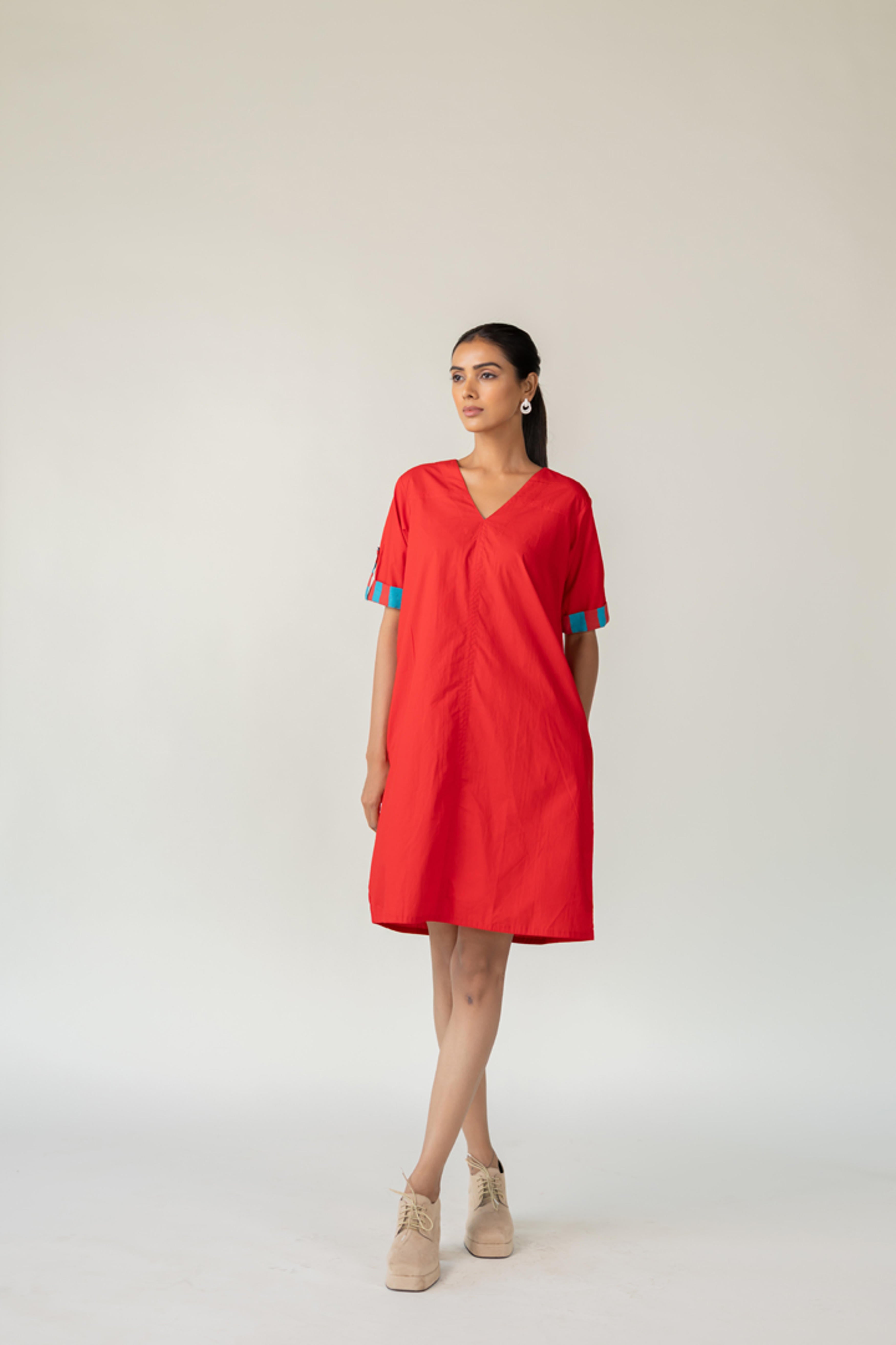 The Scarlet Pop Shift Dress delivers an instant burst of color and cool. Crafted in a bold red cotton, this easy-fit shift dress features a flattering V-neckline and short sleeves. What sets it apart is the vibrant pop of turquoise detail on the sleeve cuffs?a playful nod to contrast. This dress is perfect for effortless dressing with a standout twist. Length dress - 38"