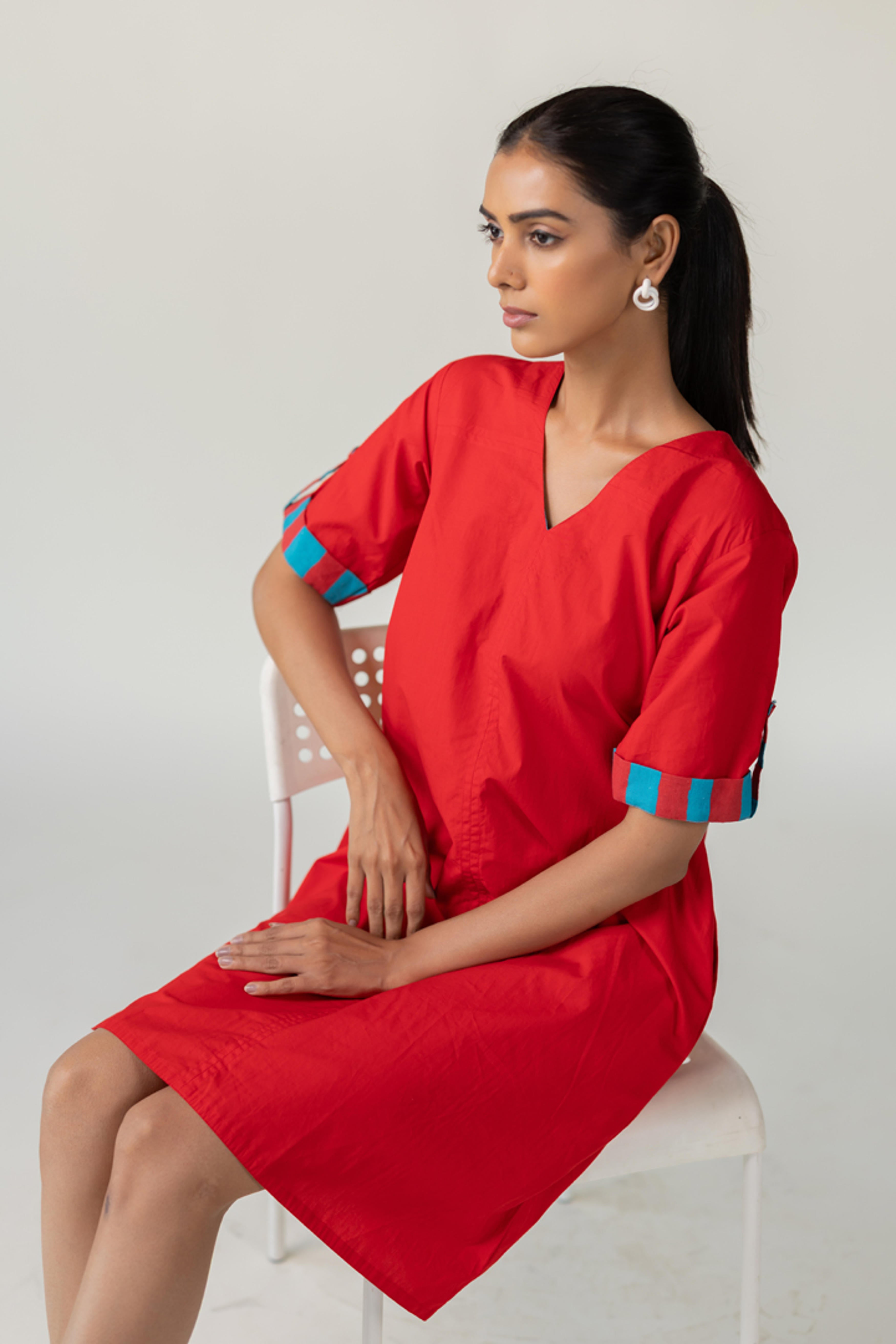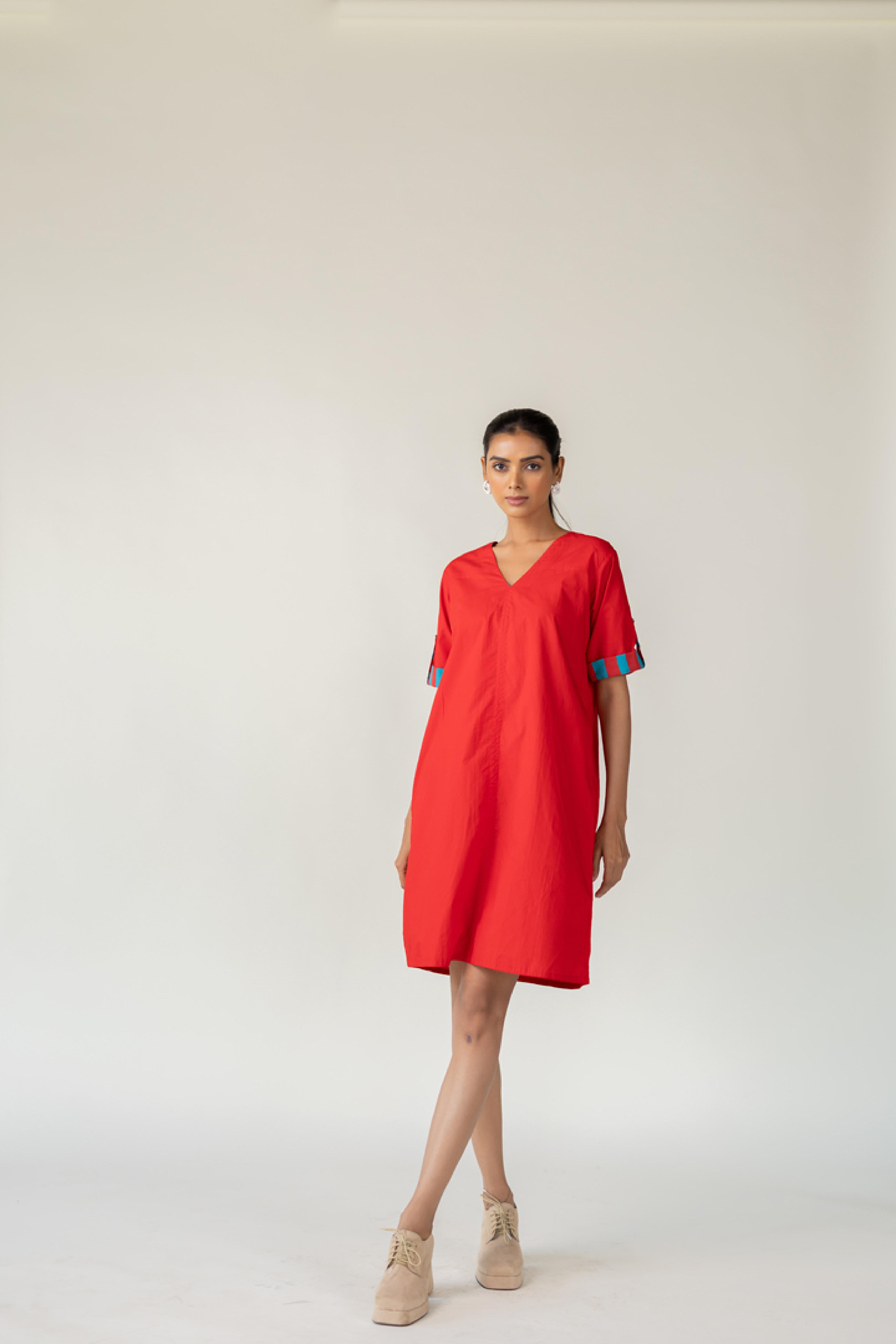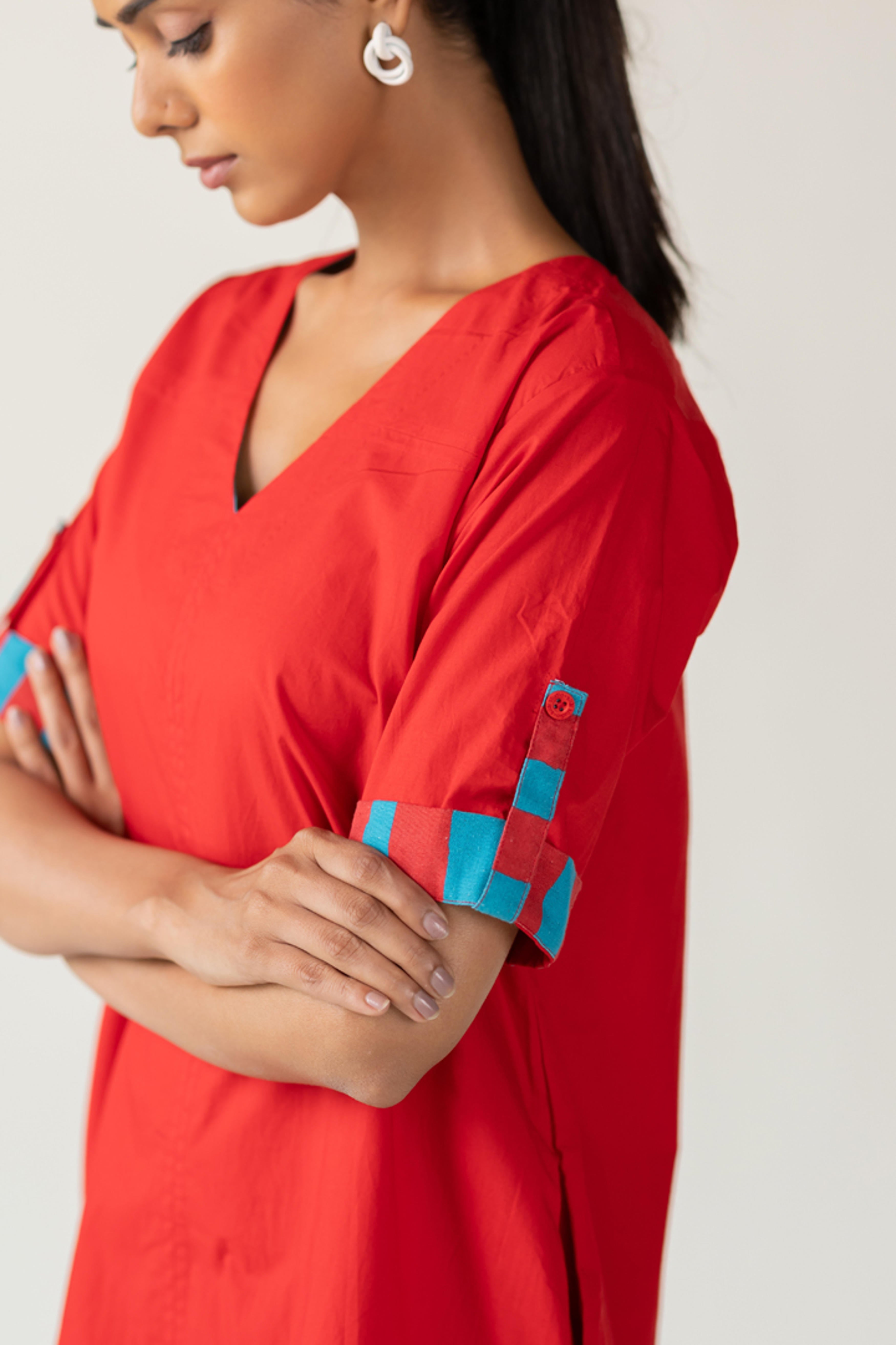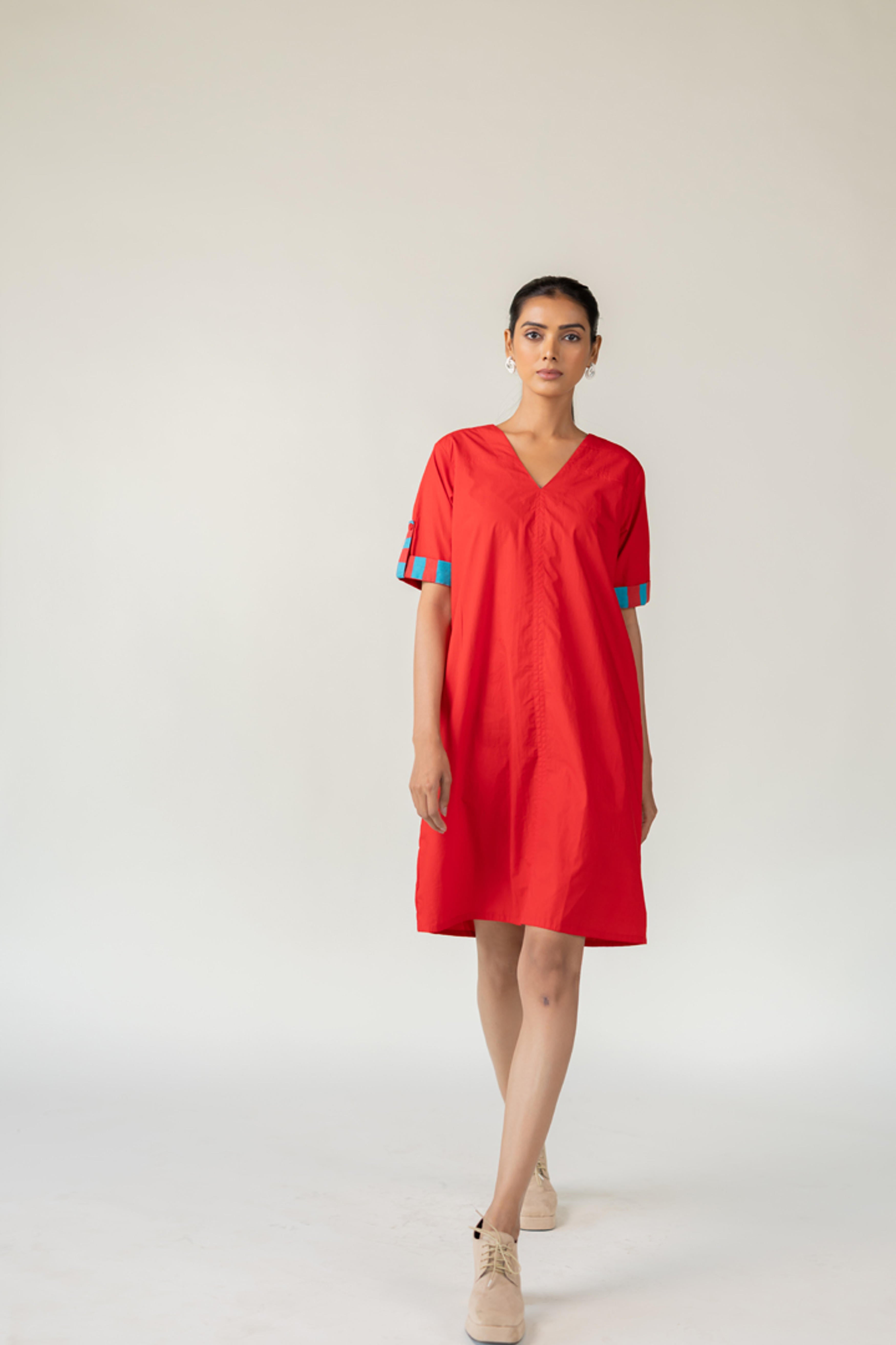 The Scarlet Pop Shift Dress delivers an instant burst of color and cool. Crafted in a bold red cotton, this easy-fit shift dress features a flattering V-neckline and short sleeves. What sets it apart is the vibrant pop of turquoise detail on the sleeve cuffs?a playful nod to contrast. This dress is perfect for effortless dressing with a standout twist. Length dress - 38"
