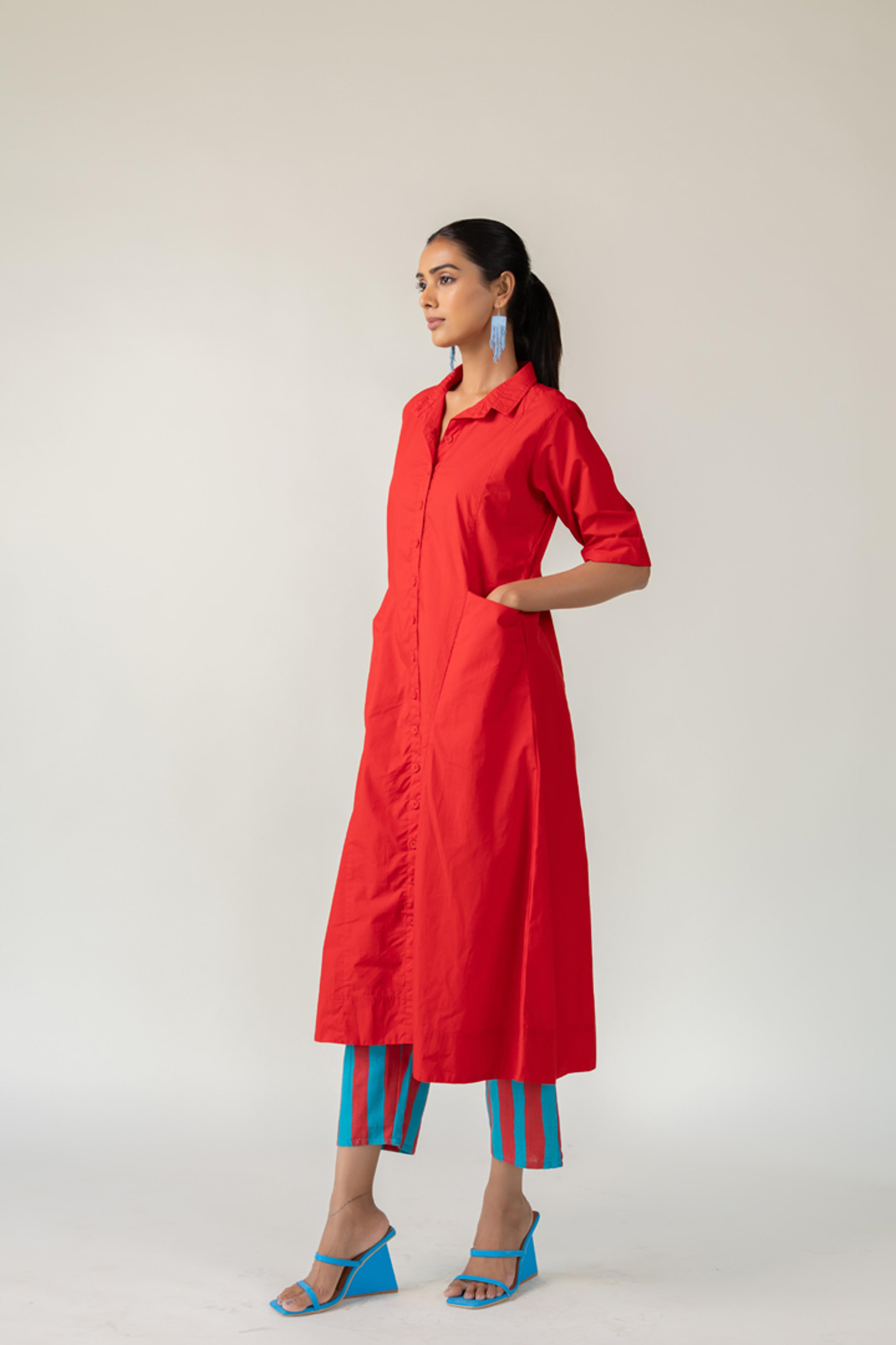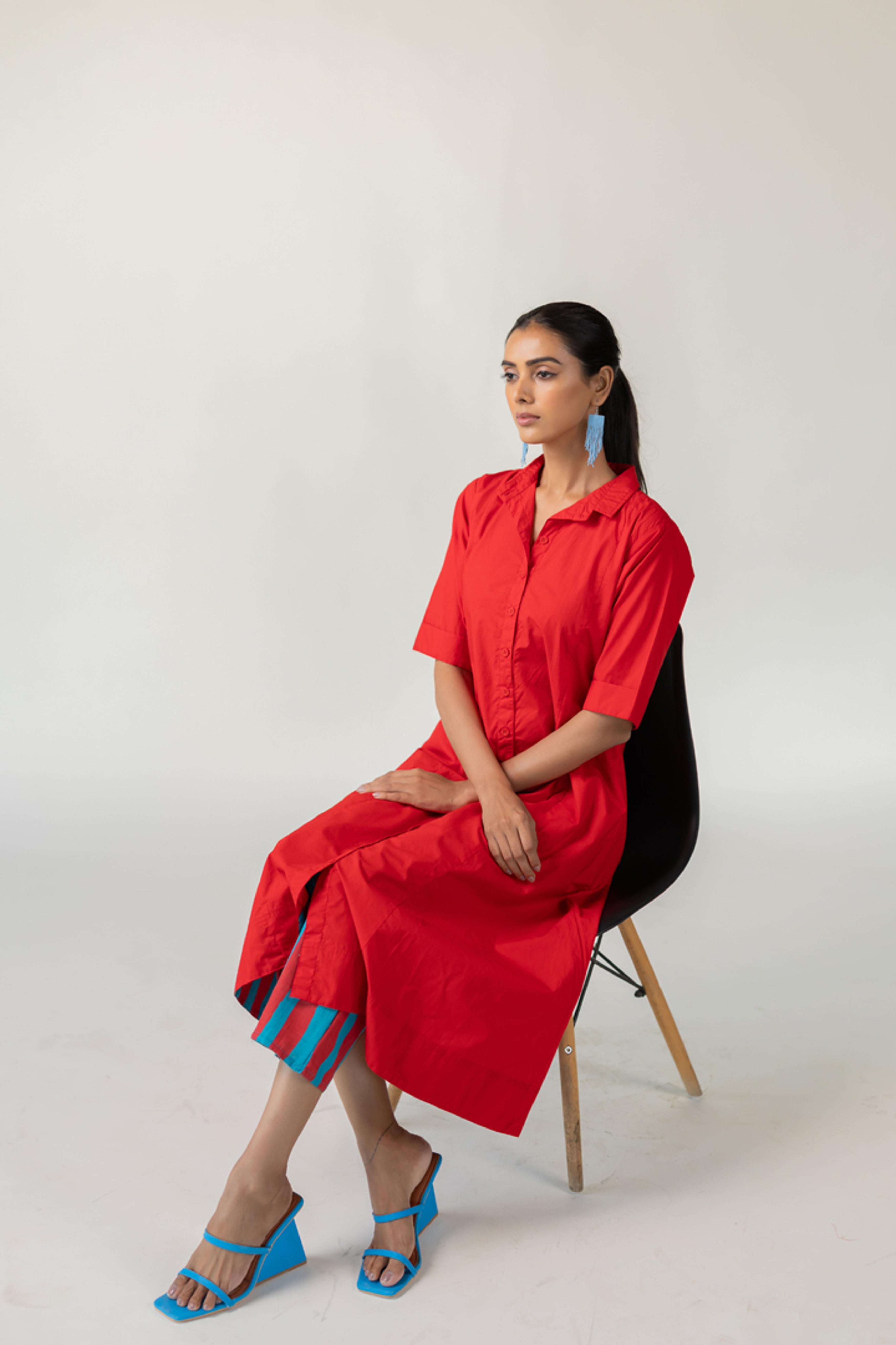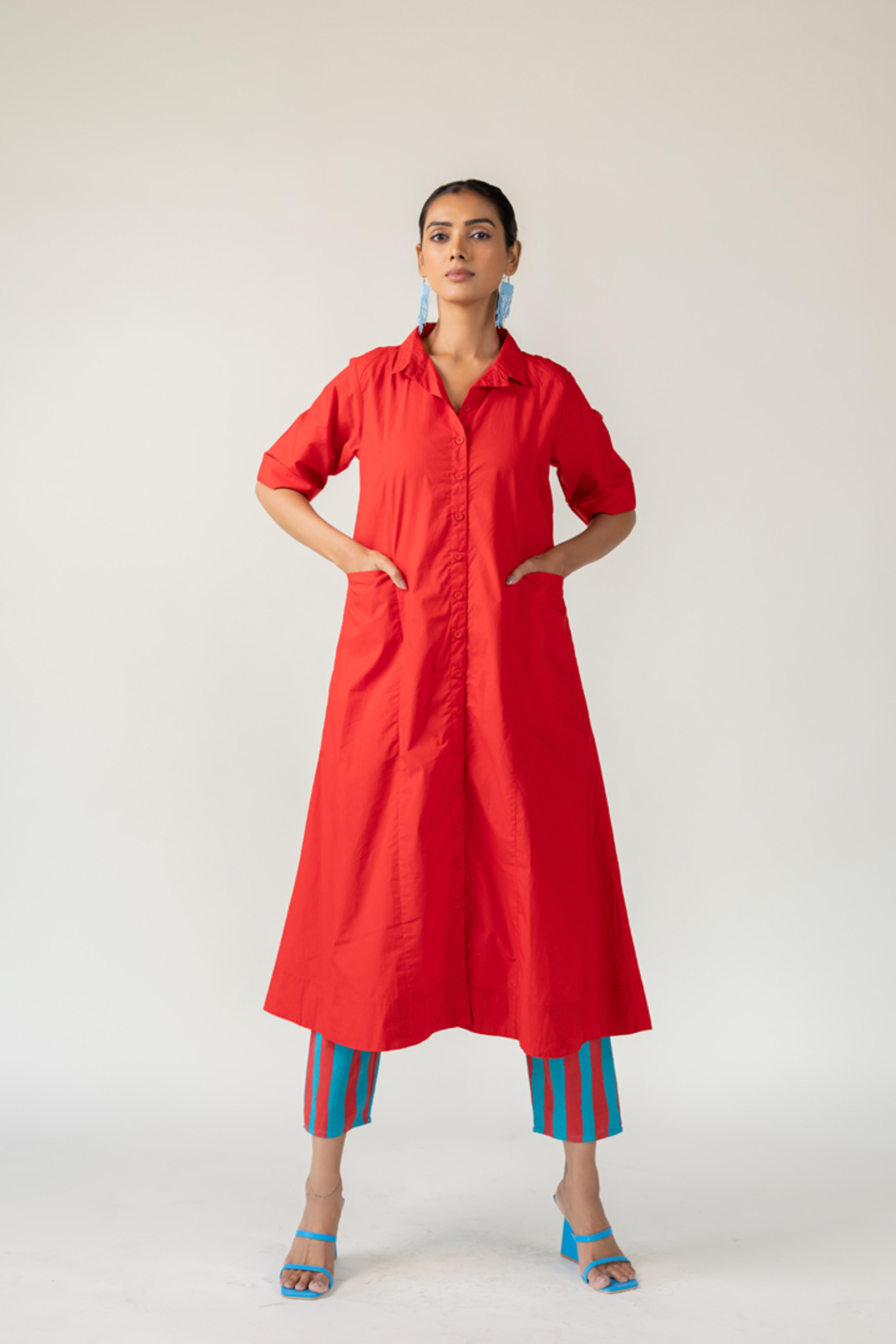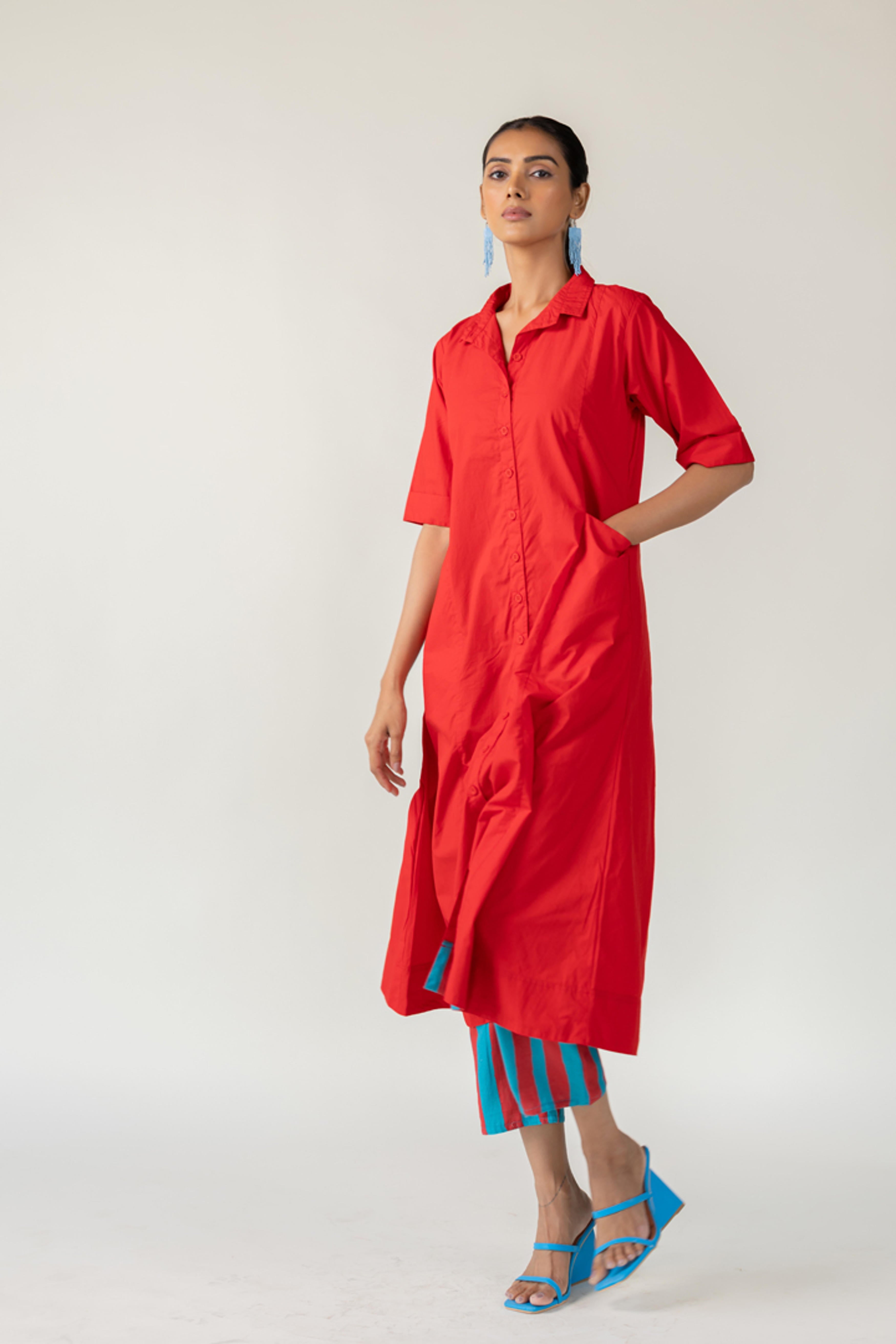 Bold yet refined, the Scarlet Stride Shirt Dress is a modern take on the classic shirt dress silhouette. Featuring a crisp button-down shirt dress in vibrant scarlet. The cuffed three-quarter sleeves and side pockets add structure and ease. Length Kurta - 48"