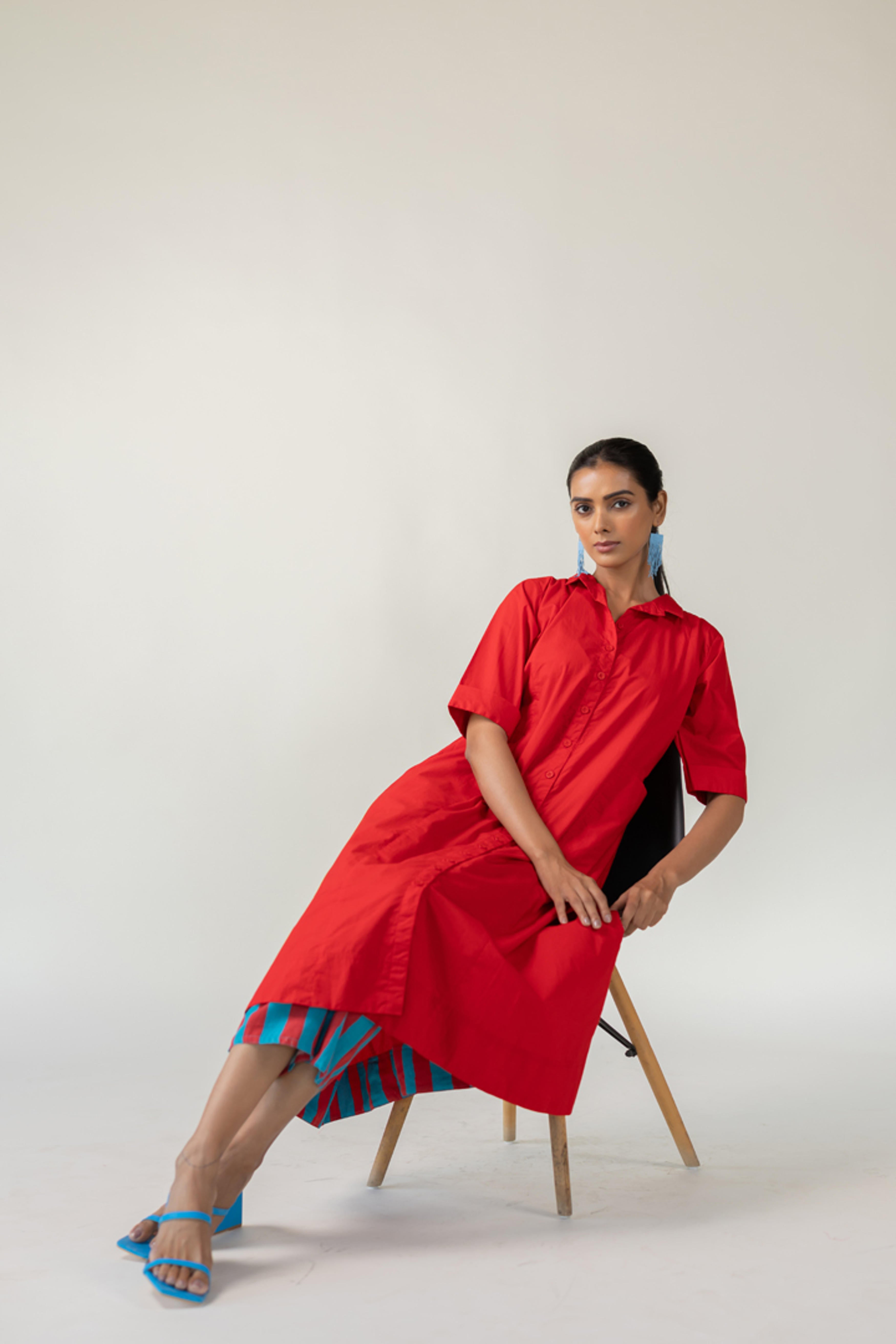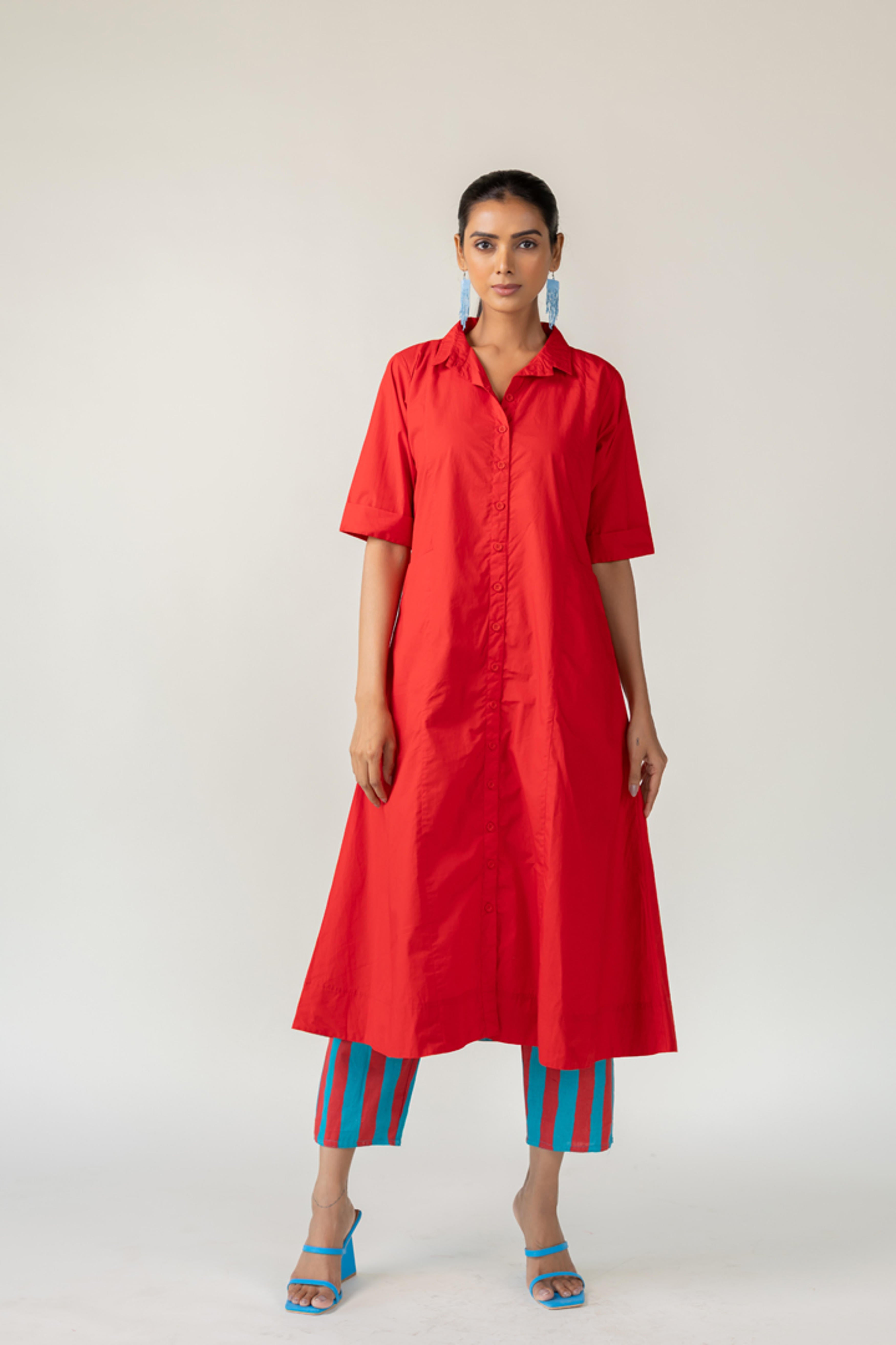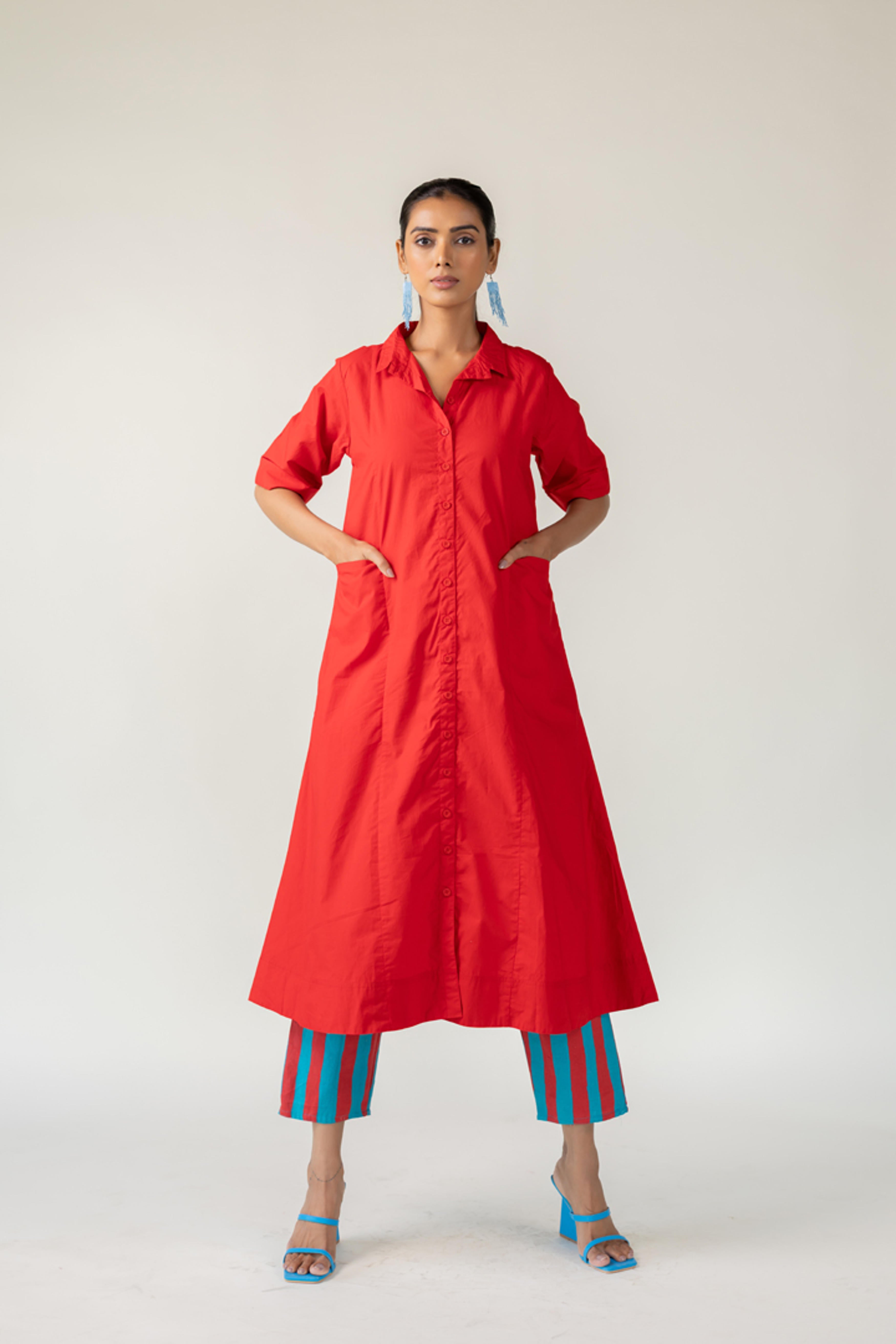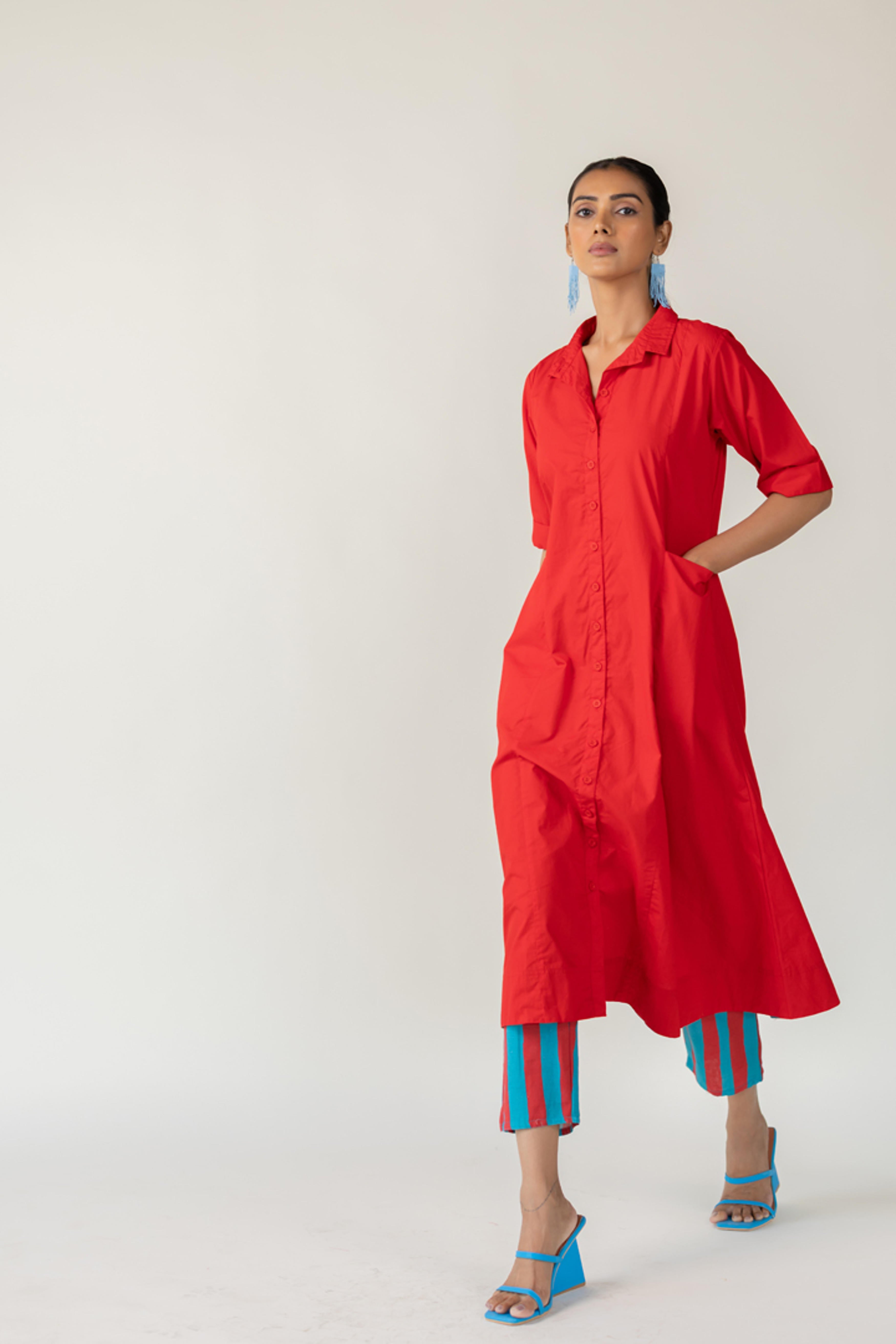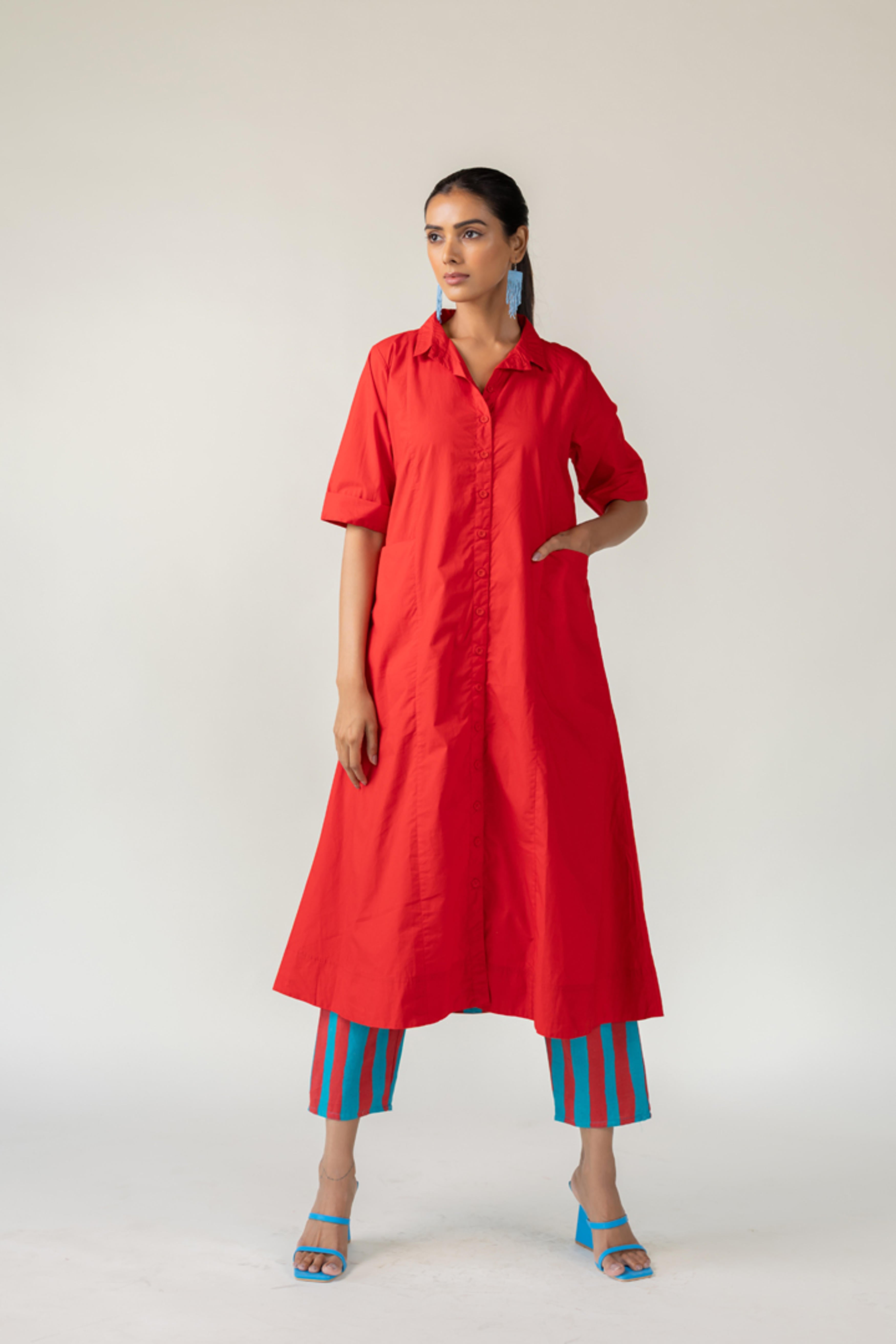 Bold yet refined, the Scarlet Stride Shirt Dress is a modern take on the classic shirt dress silhouette. Featuring a crisp button-down shirt dress in vibrant scarlet. The cuffed three-quarter sleeves and side pockets add structure and ease. Length Kurta - 48"