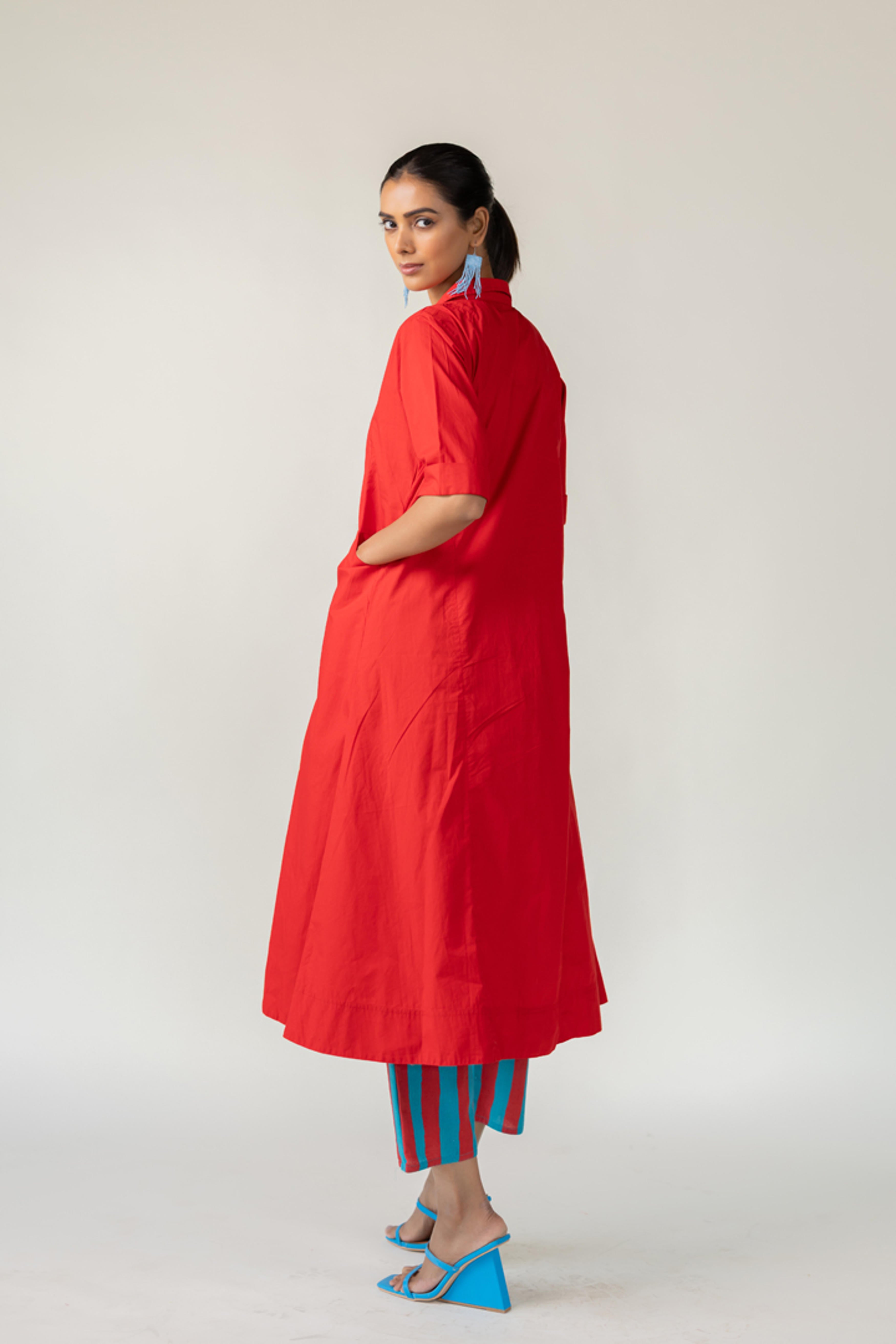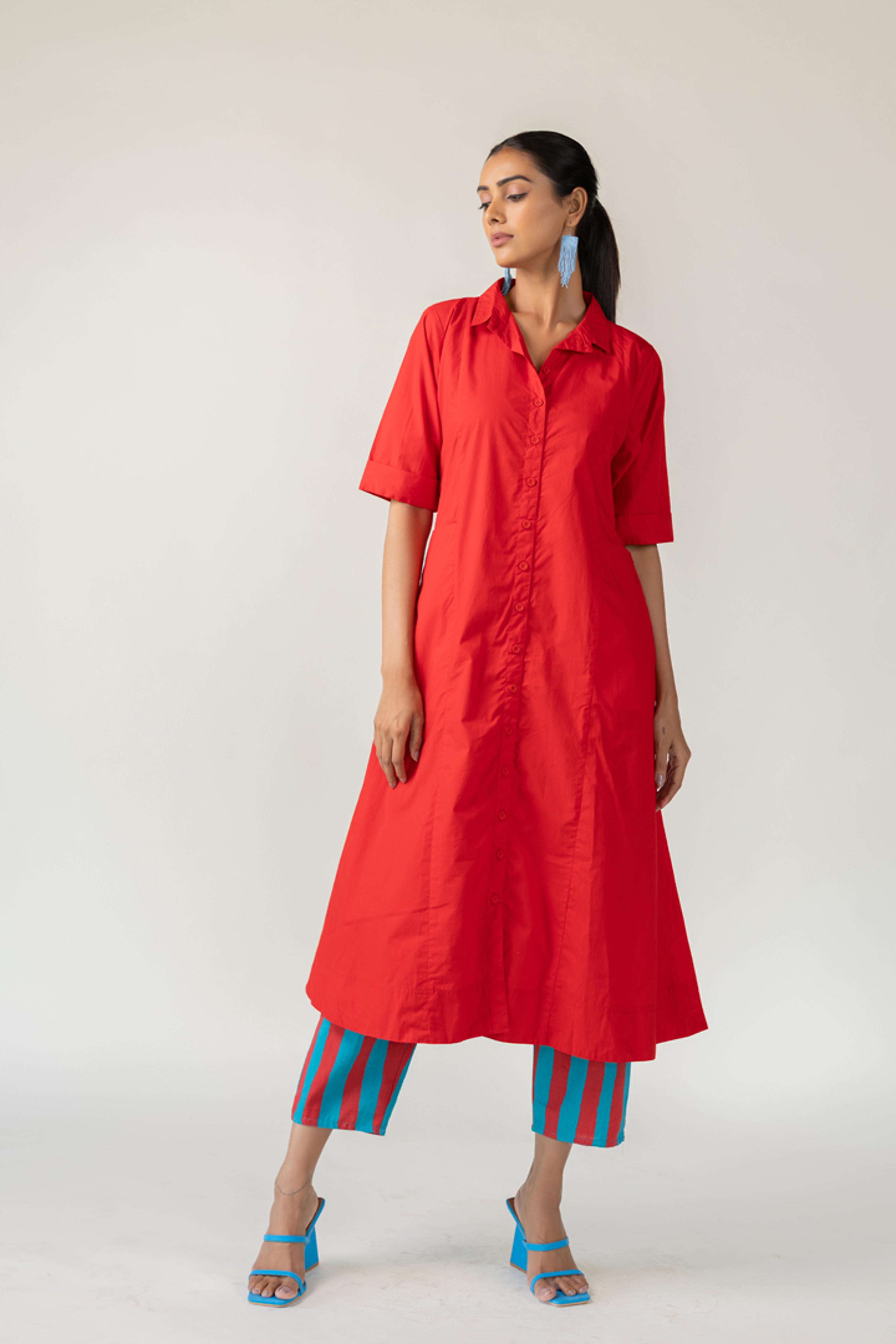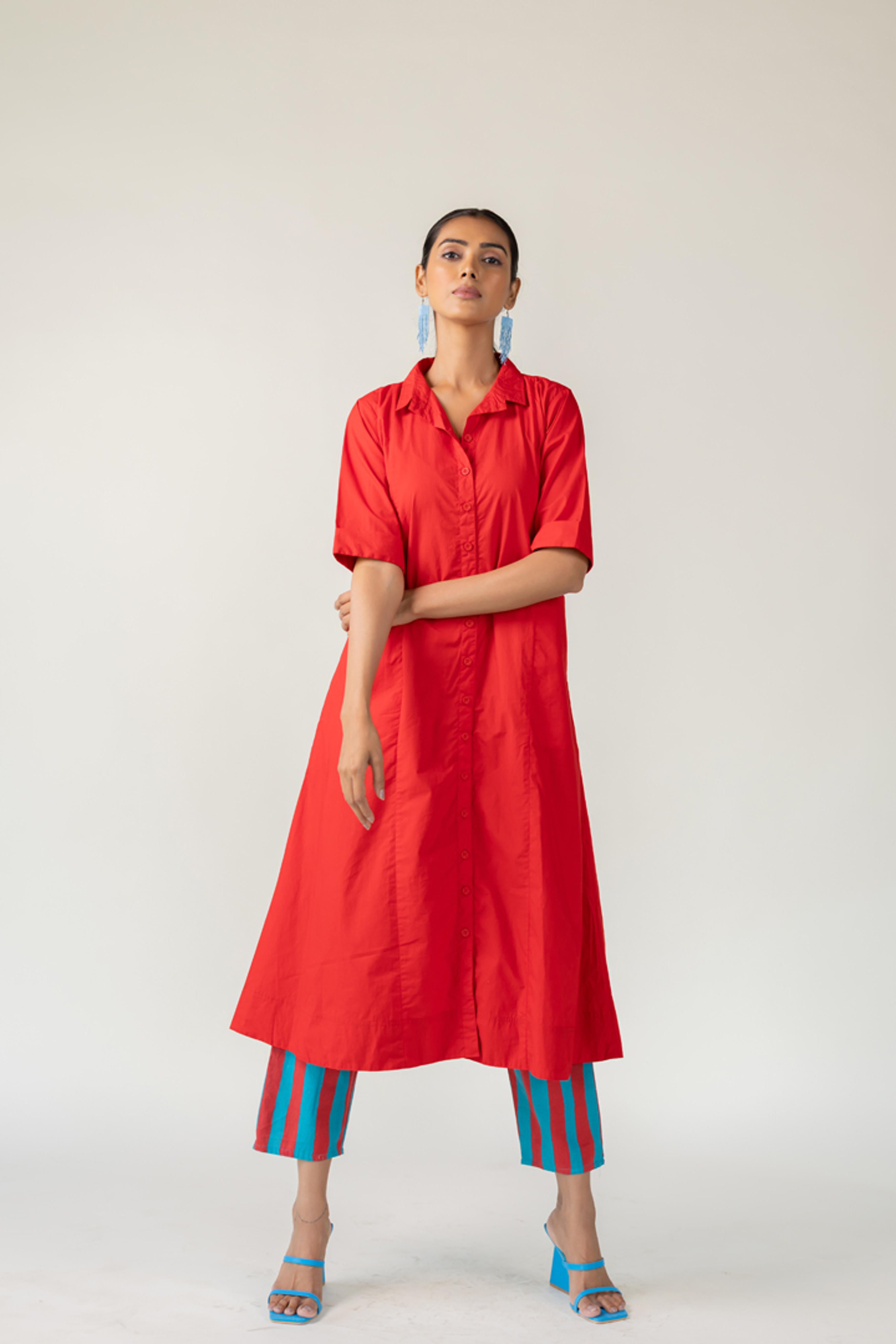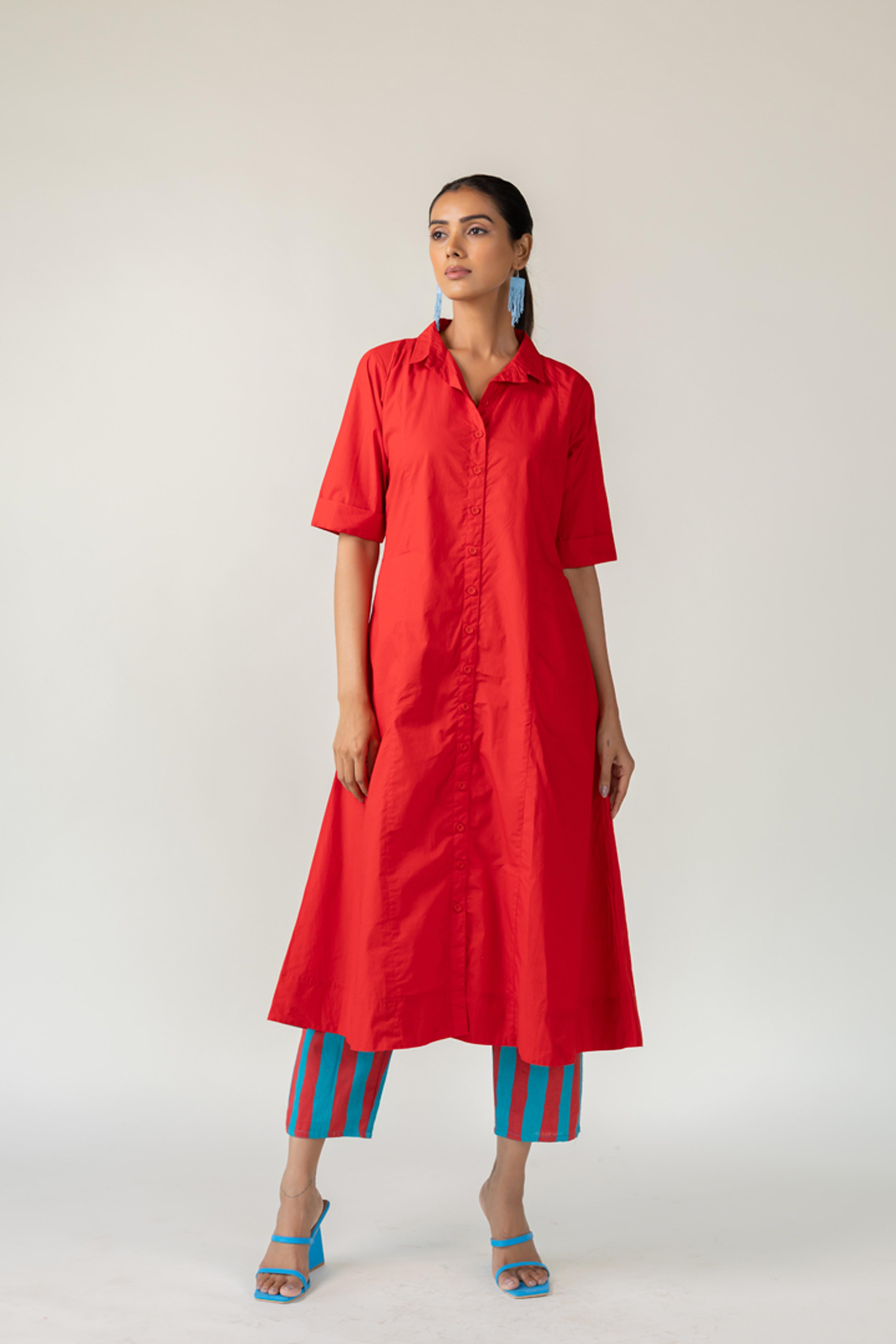 Bold yet refined, the Scarlet Stride Shirt Dress is a modern take on the classic shirt dress silhouette. Featuring a crisp button-down shirt dress in vibrant scarlet. The cuffed three-quarter sleeves and side pockets add structure and ease. Length Kurta - 48"