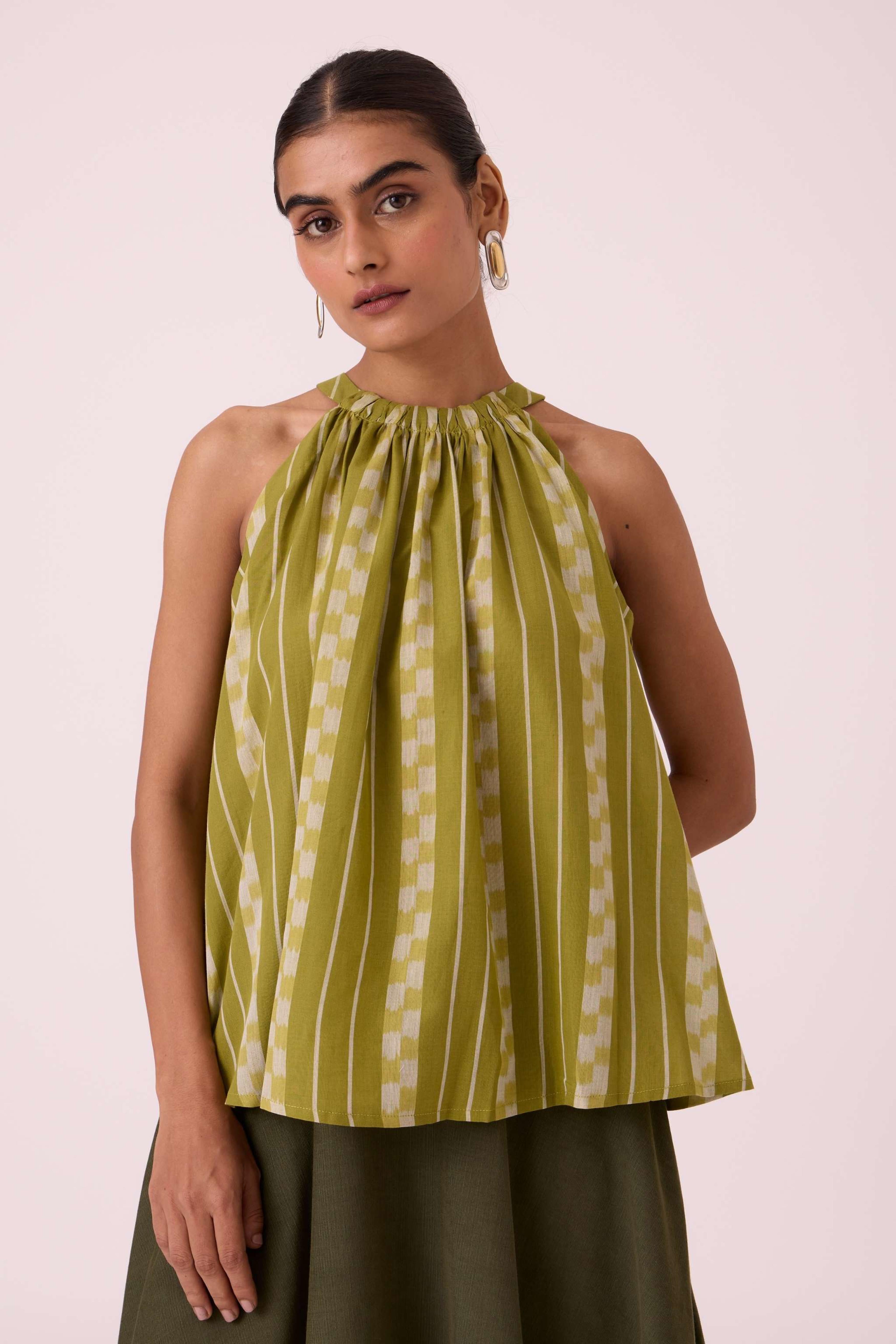 This *sleeveless, easy-fit halter neck top* features soft gathers at the neckline and a tie-up detail at the back. It is made from a studio-developed *Ikat design* that is *handwoven by artisans in Telangana*. The text notes that any slight irregularities in the fabric are a natural characteristic of the handmade process. For sizing, the model Chhavi, who is 5'6", is wearing an XS.