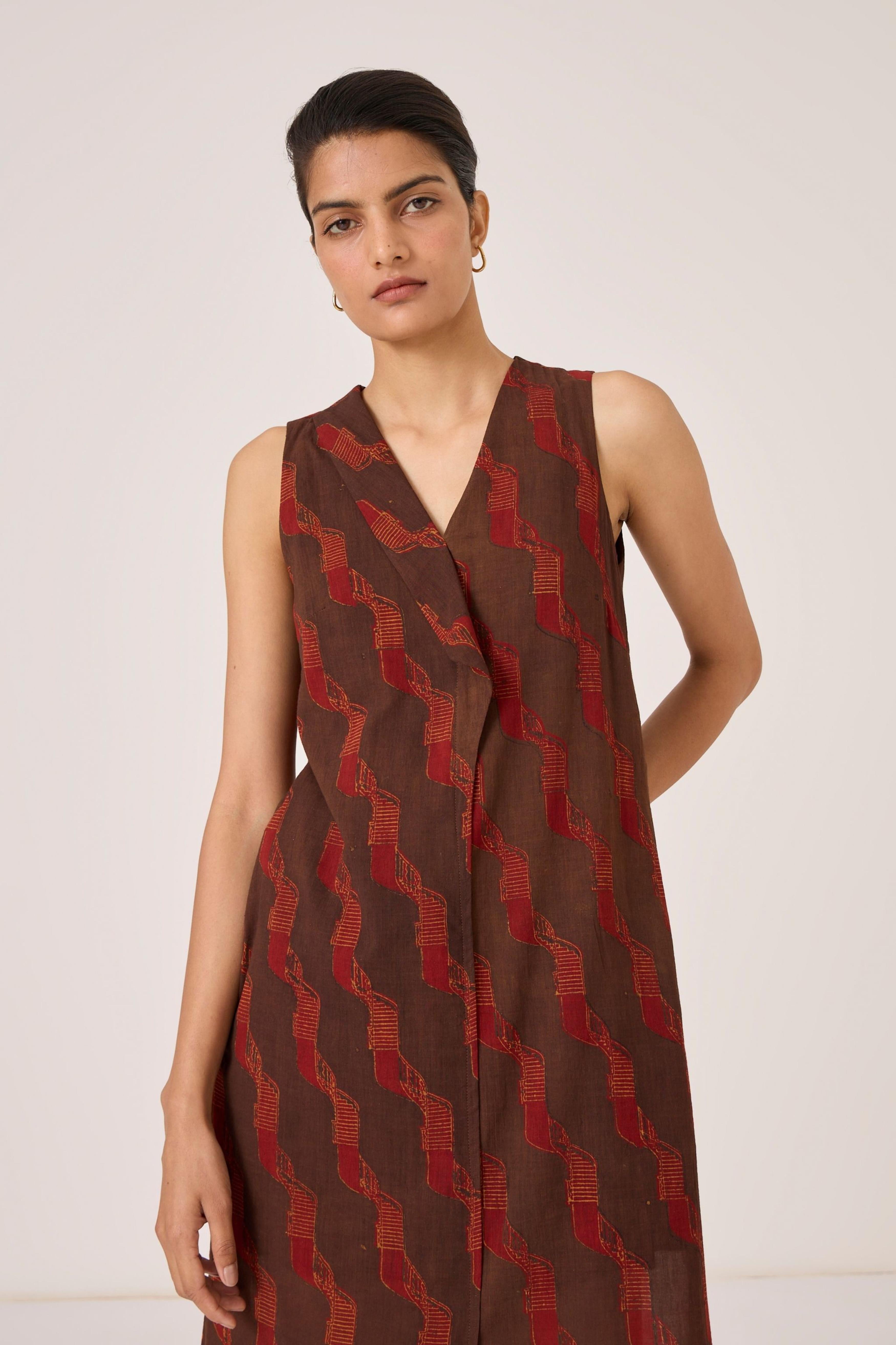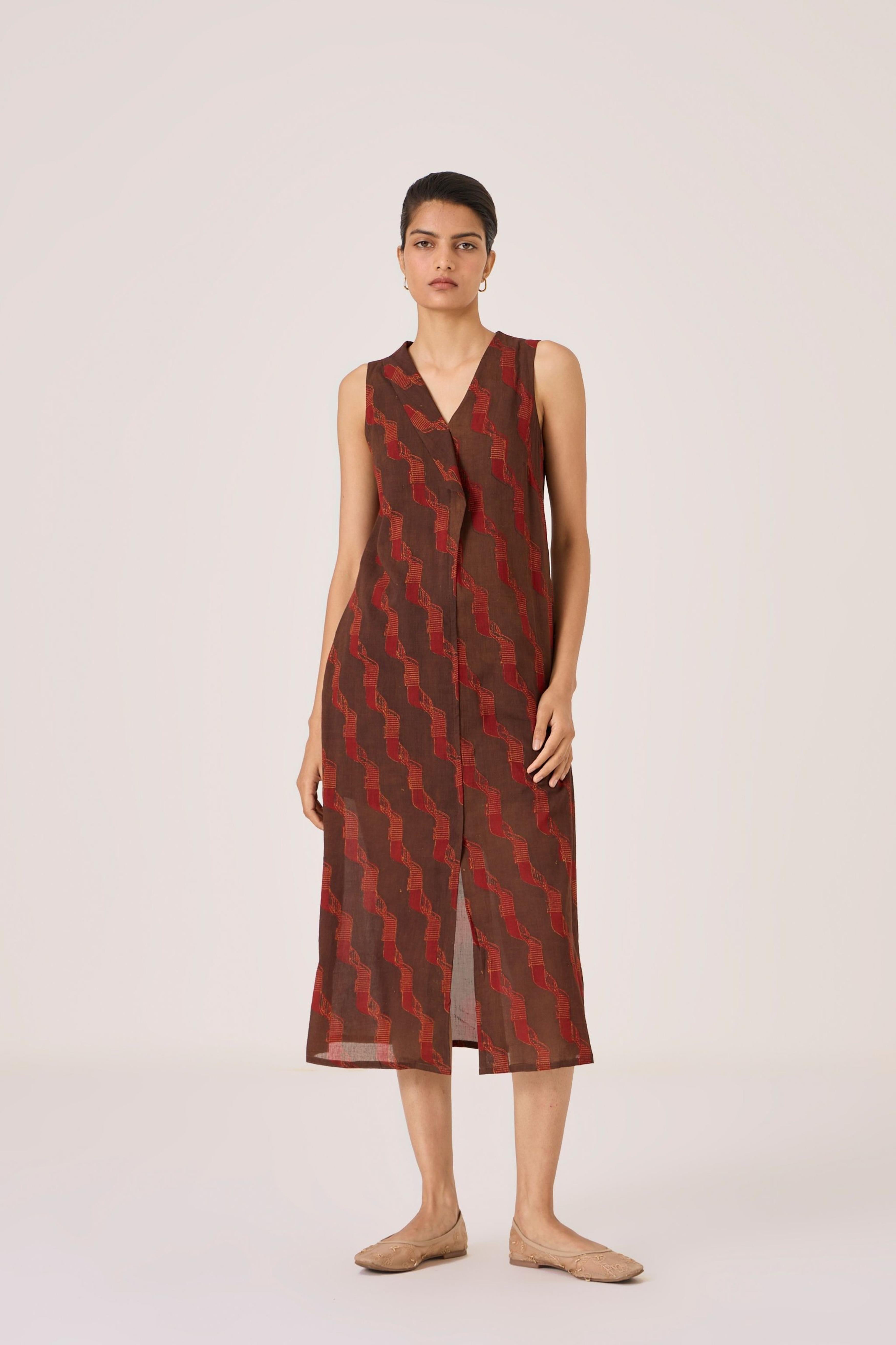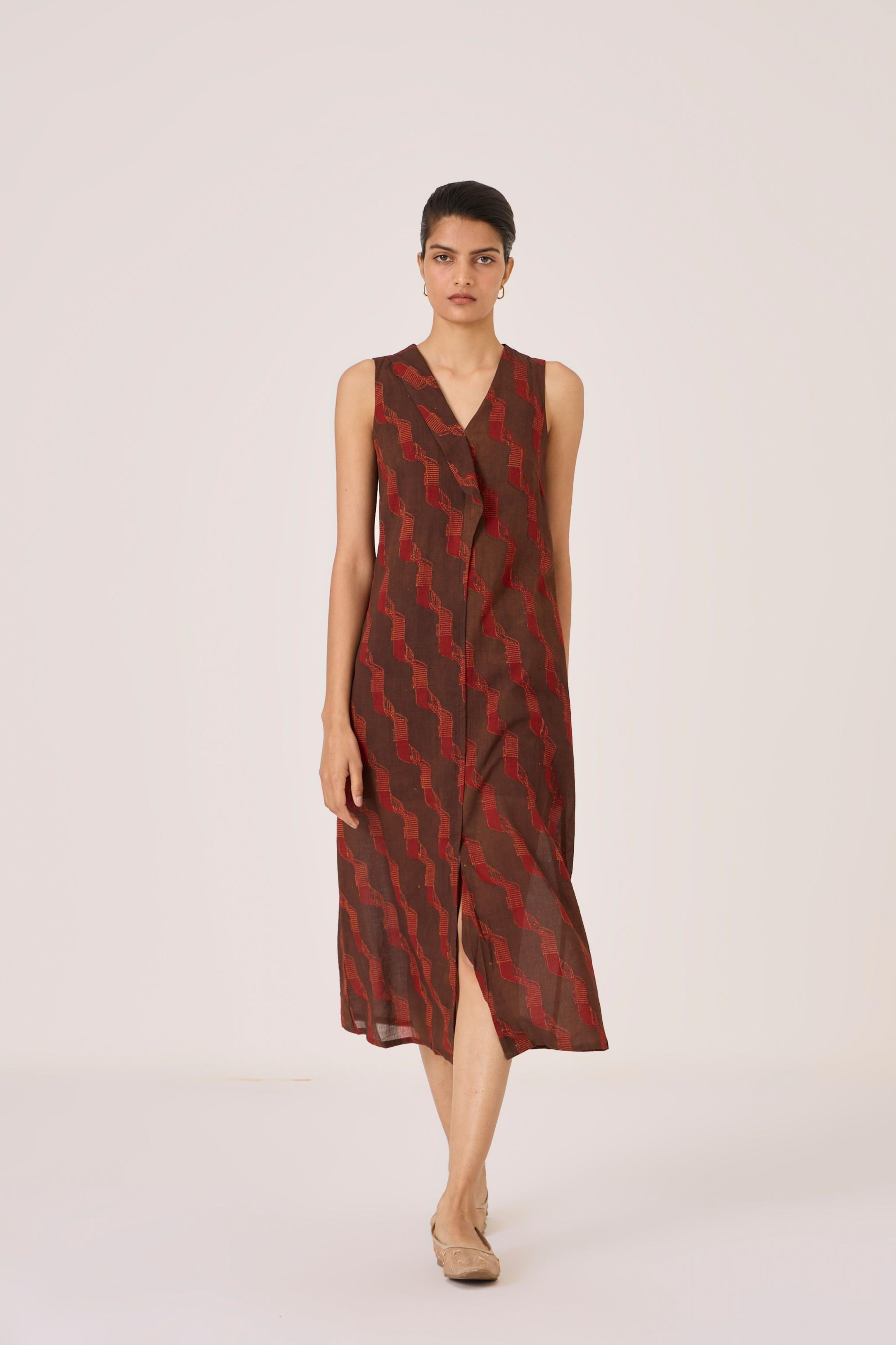 - Overlap dress - Signature print - Draped collar - Front centre slit - This dress is shipped with a slip This signature ajrakh block print is designed in our studio and hand block printed by traditional artisans in Gujarat. Print placement may vary from garment to garment. Slight irregularities in print are common and speak to the hand processes involved.