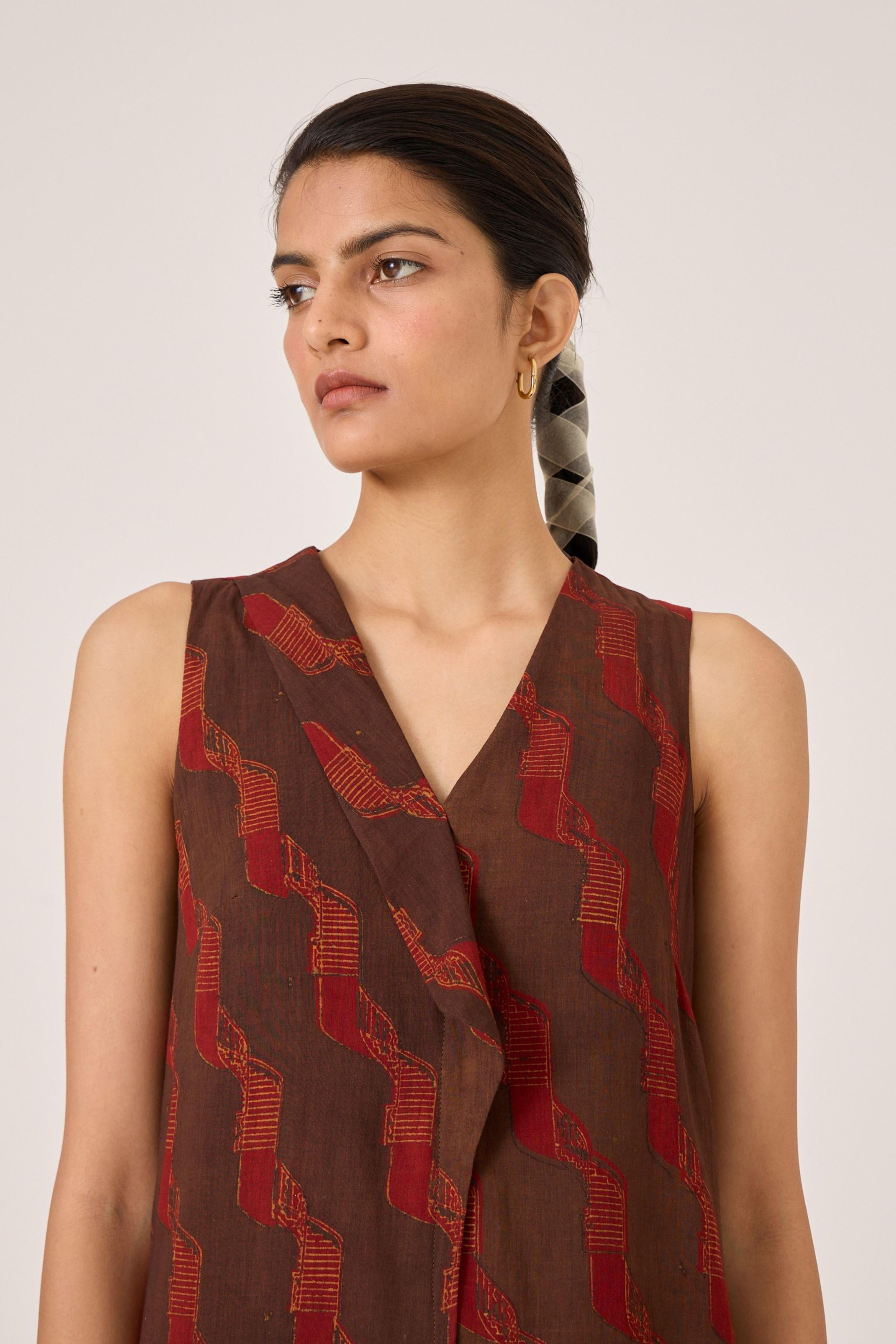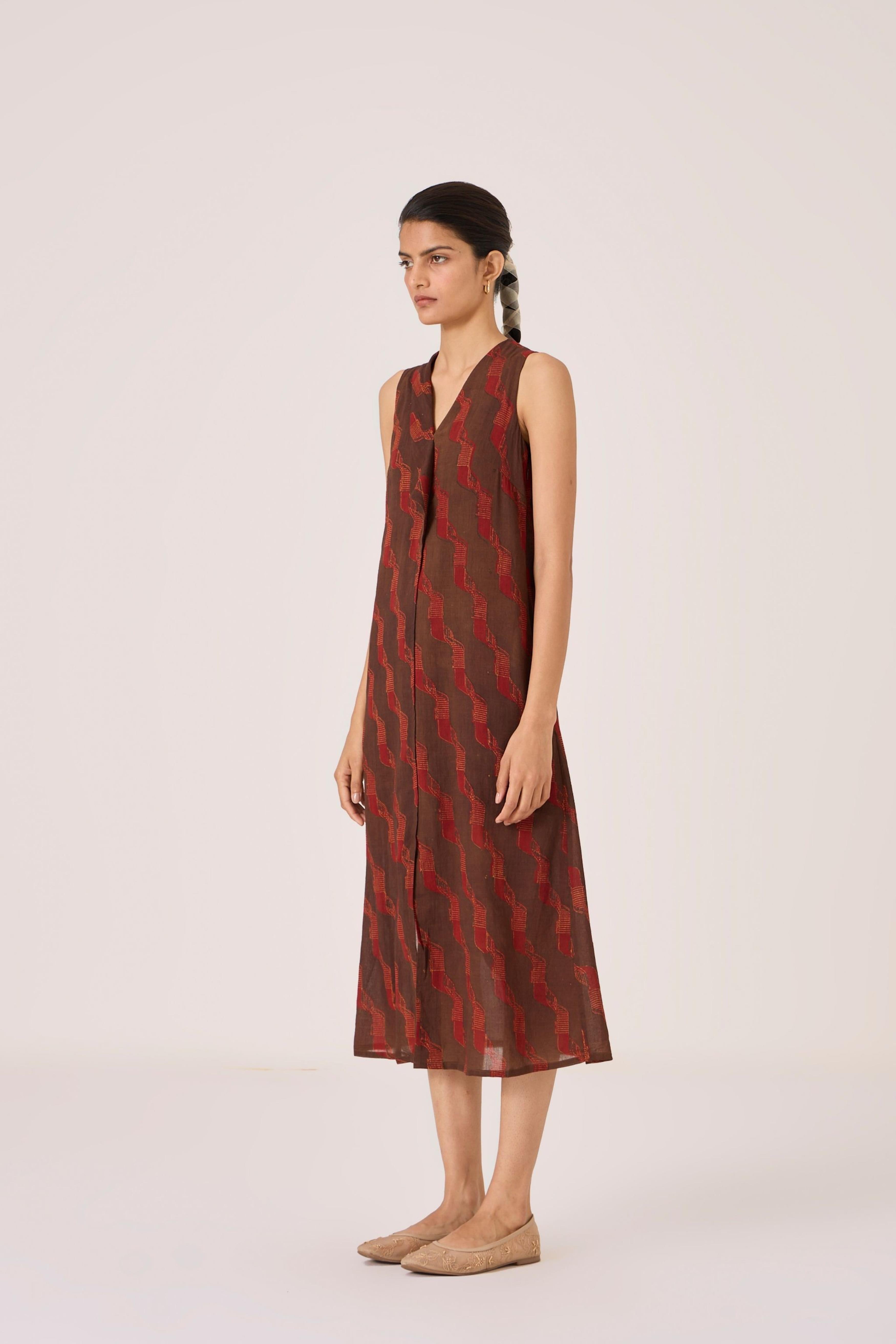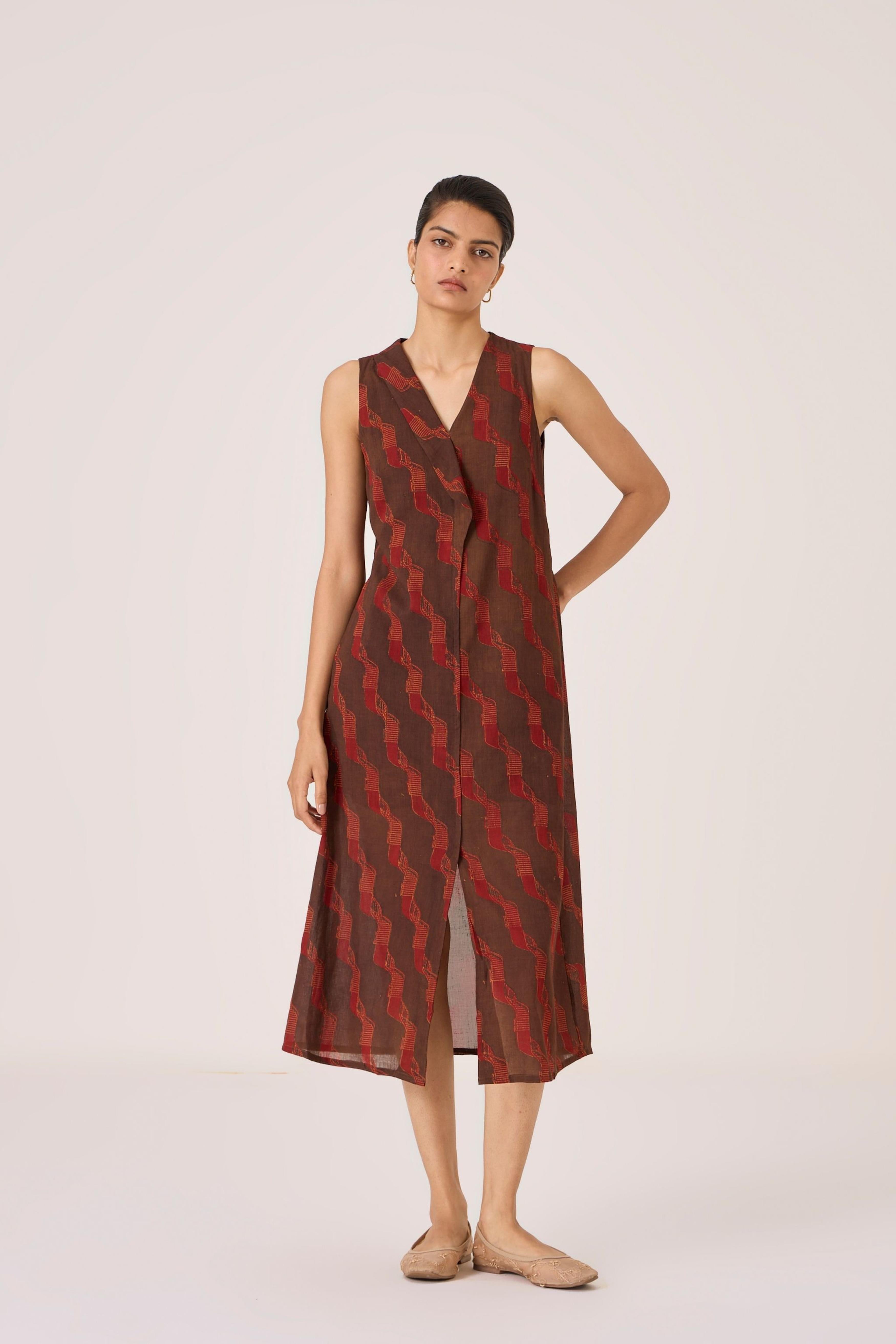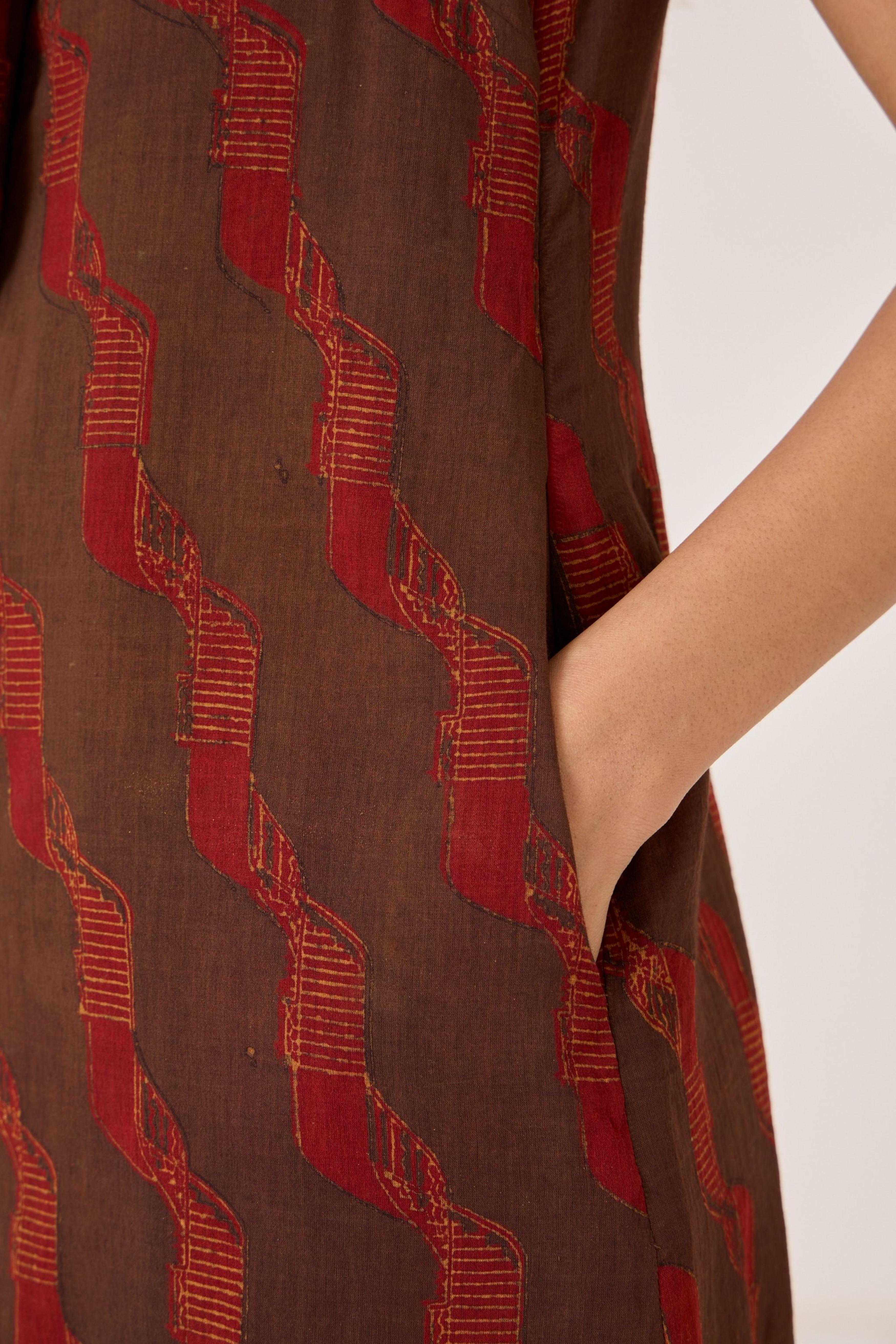 - Overlap dress - Signature print - Draped collar - Front centre slit - This dress is shipped with a slip This signature ajrakh block print is designed in our studio and hand block printed by traditional artisans in Gujarat. Print placement may vary from garment to garment. Slight irregularities in print are common and speak to the hand processes involved.