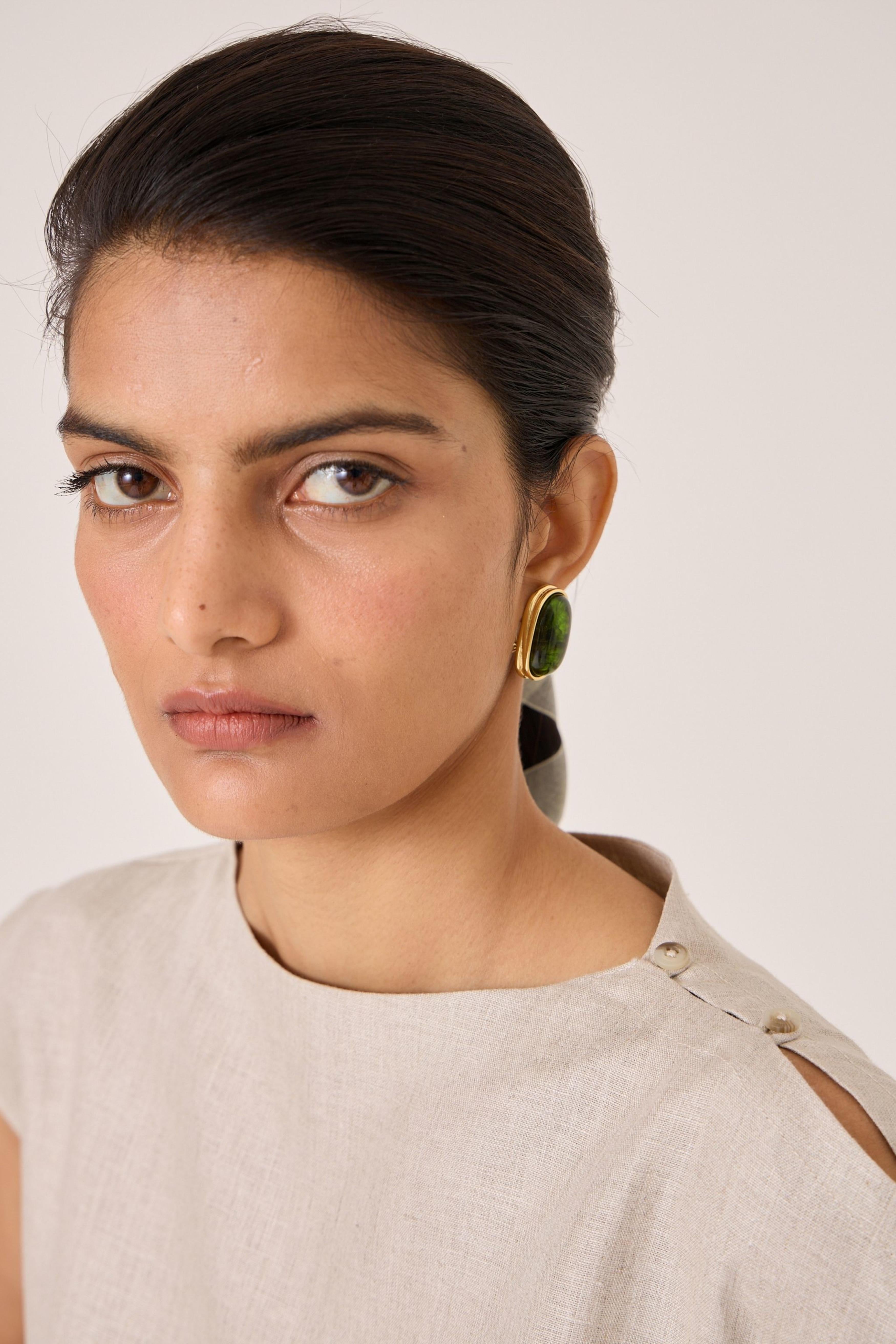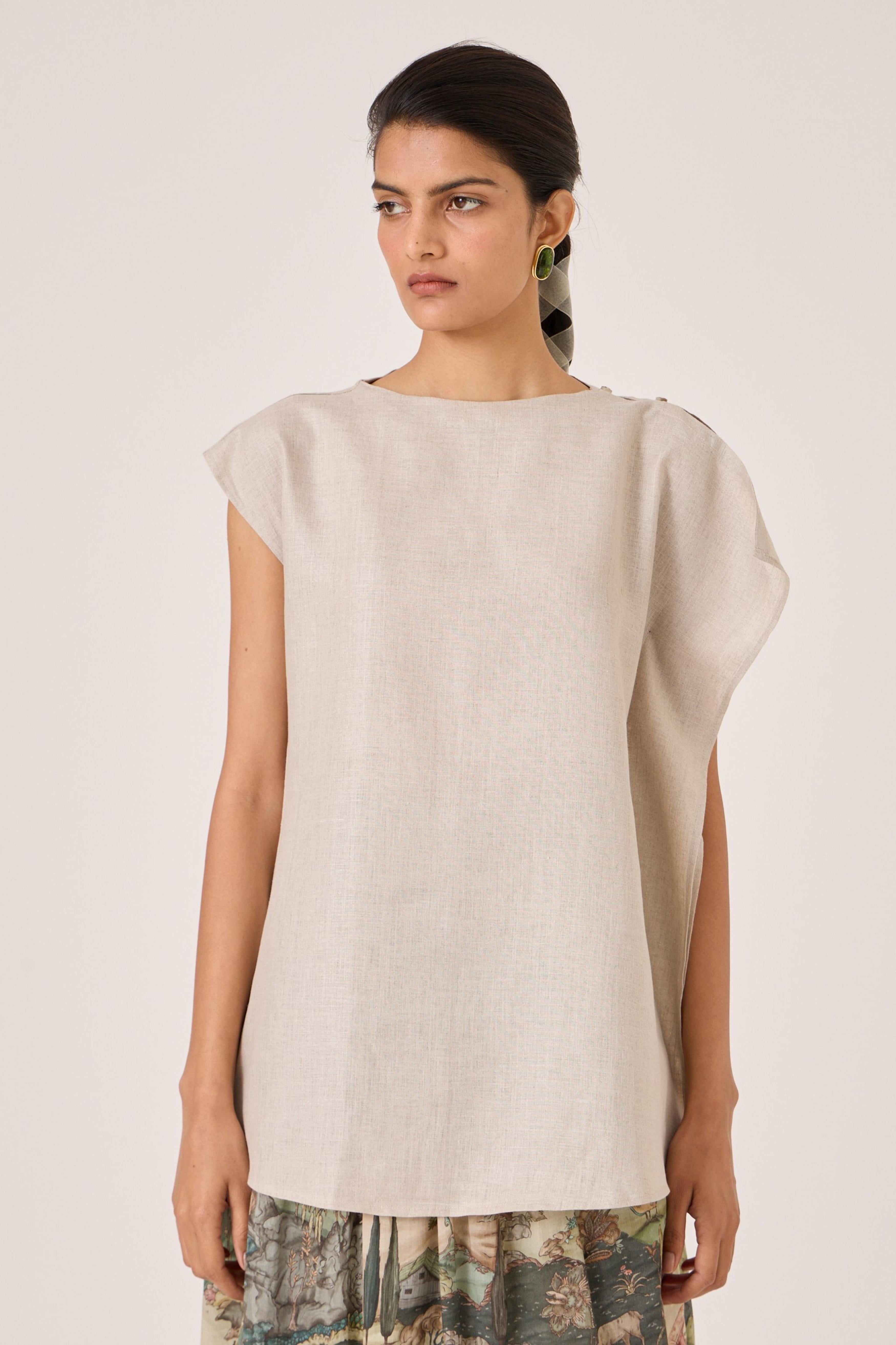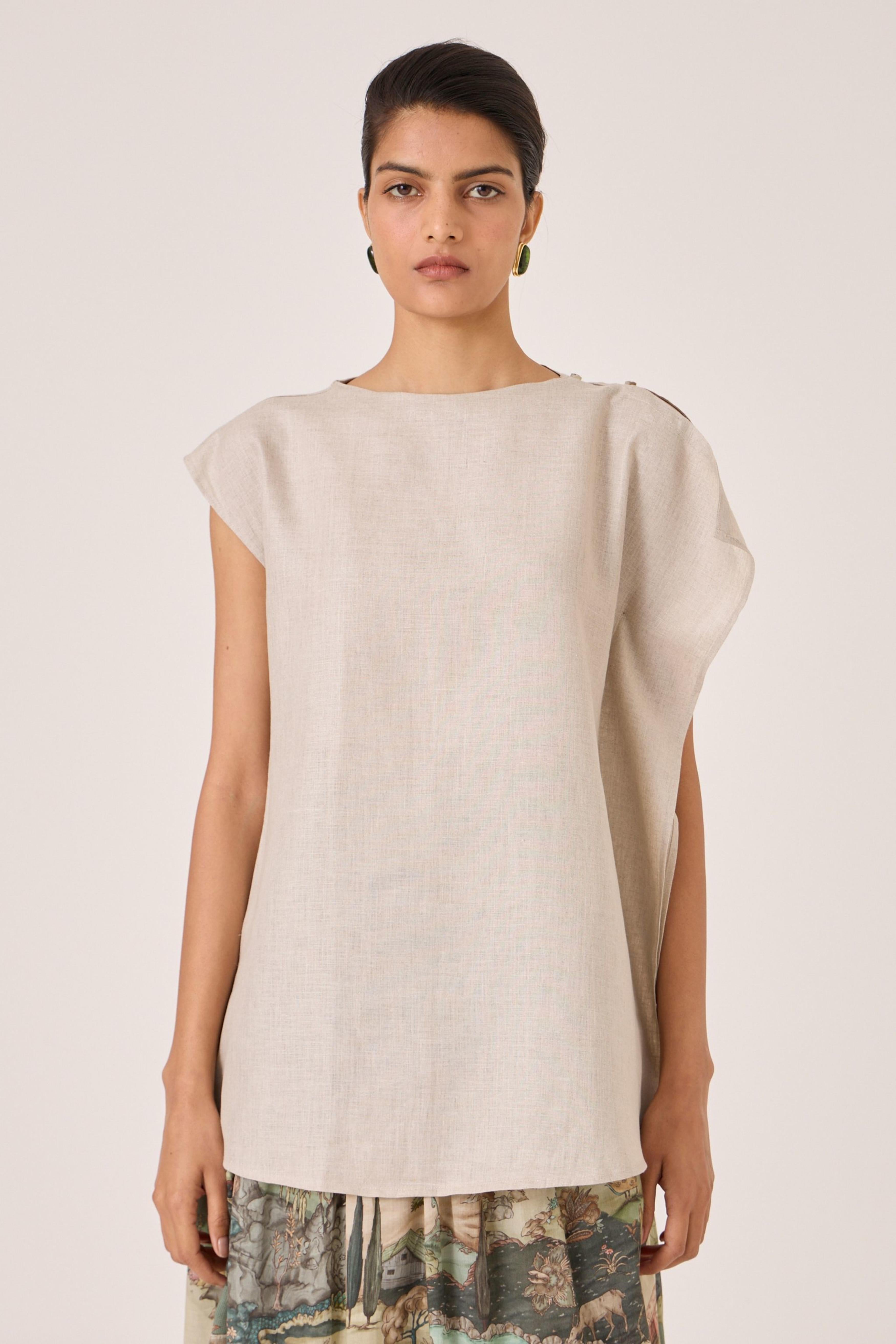 - Draped linen top - Drop shoulder - Button closure on one sleeve