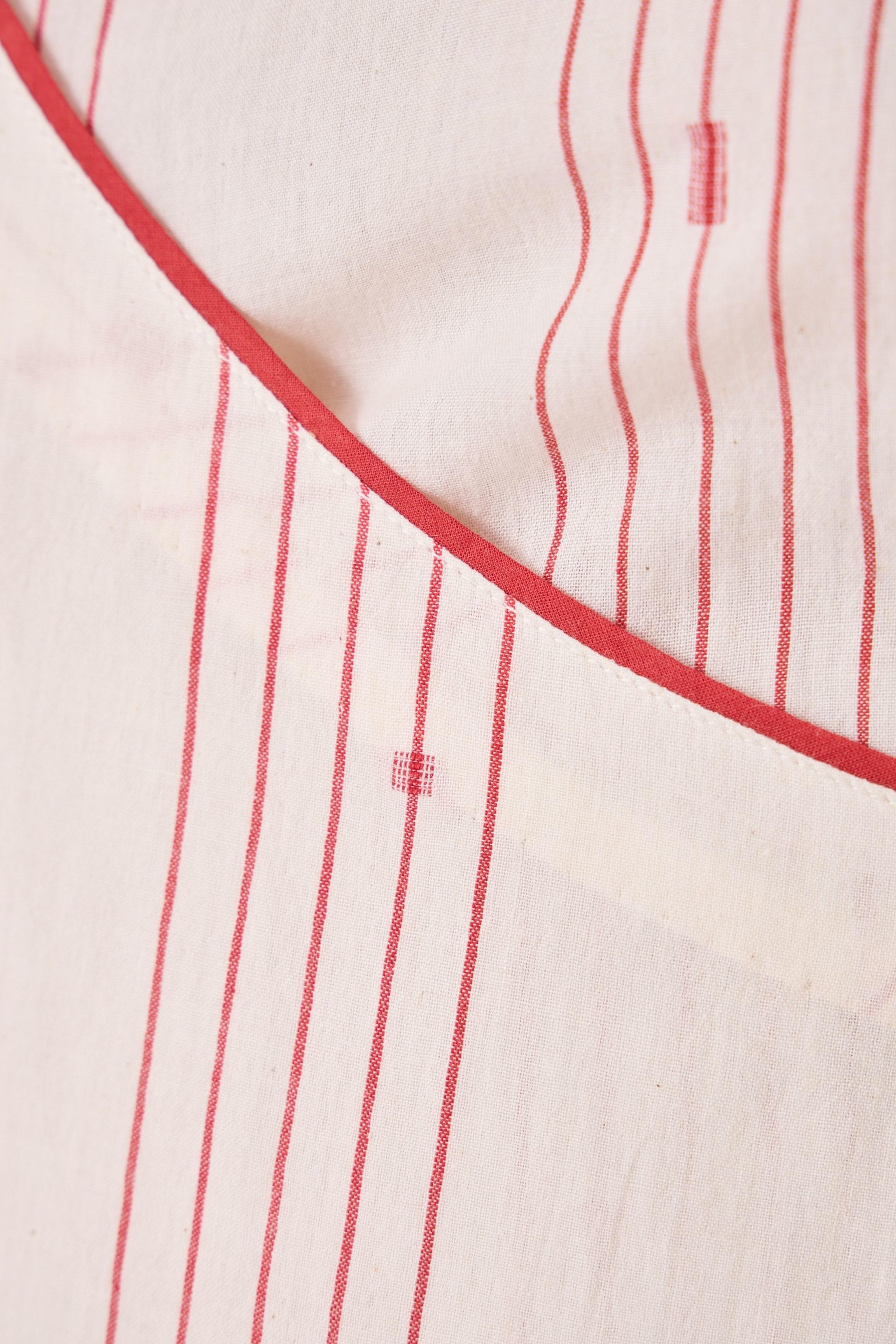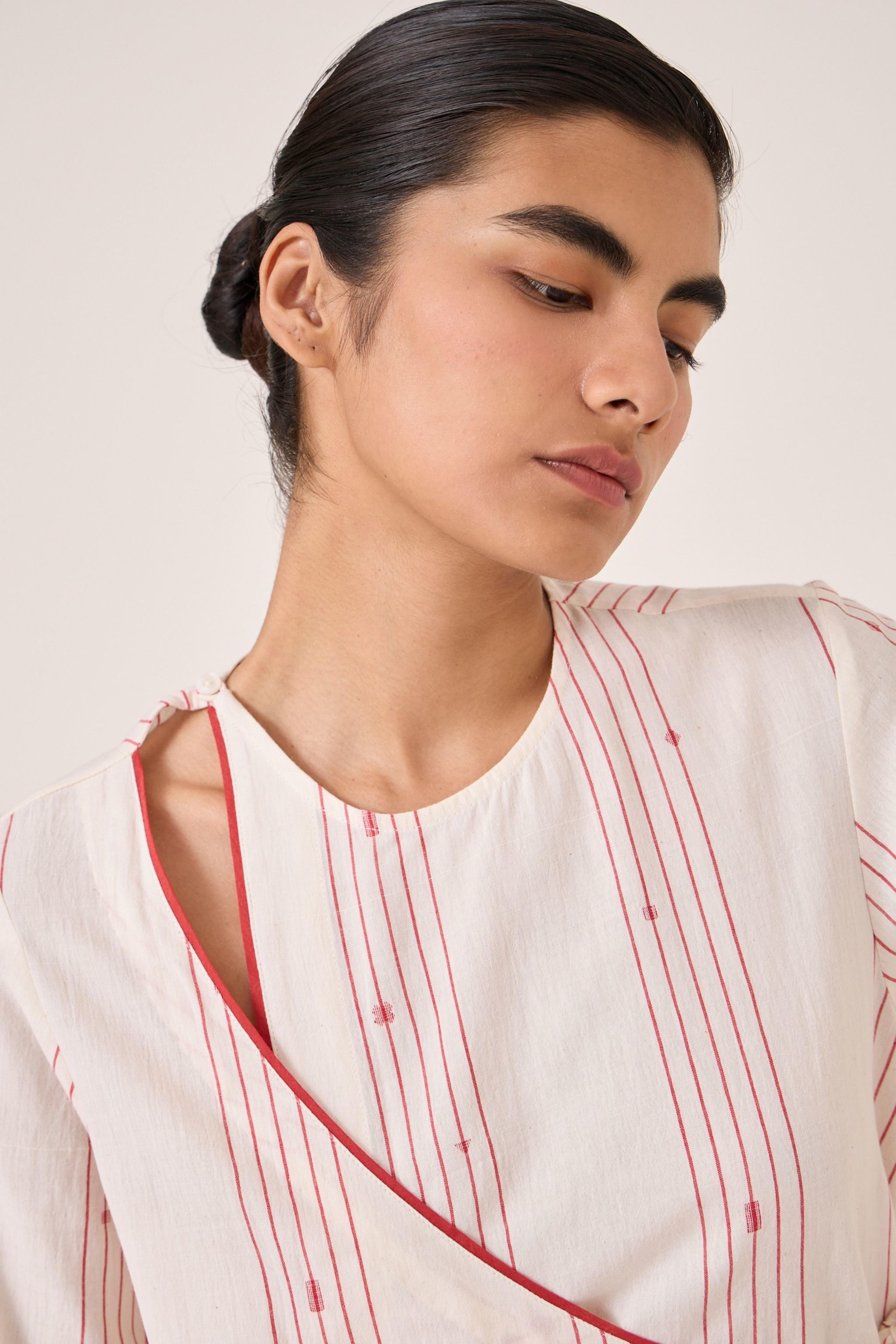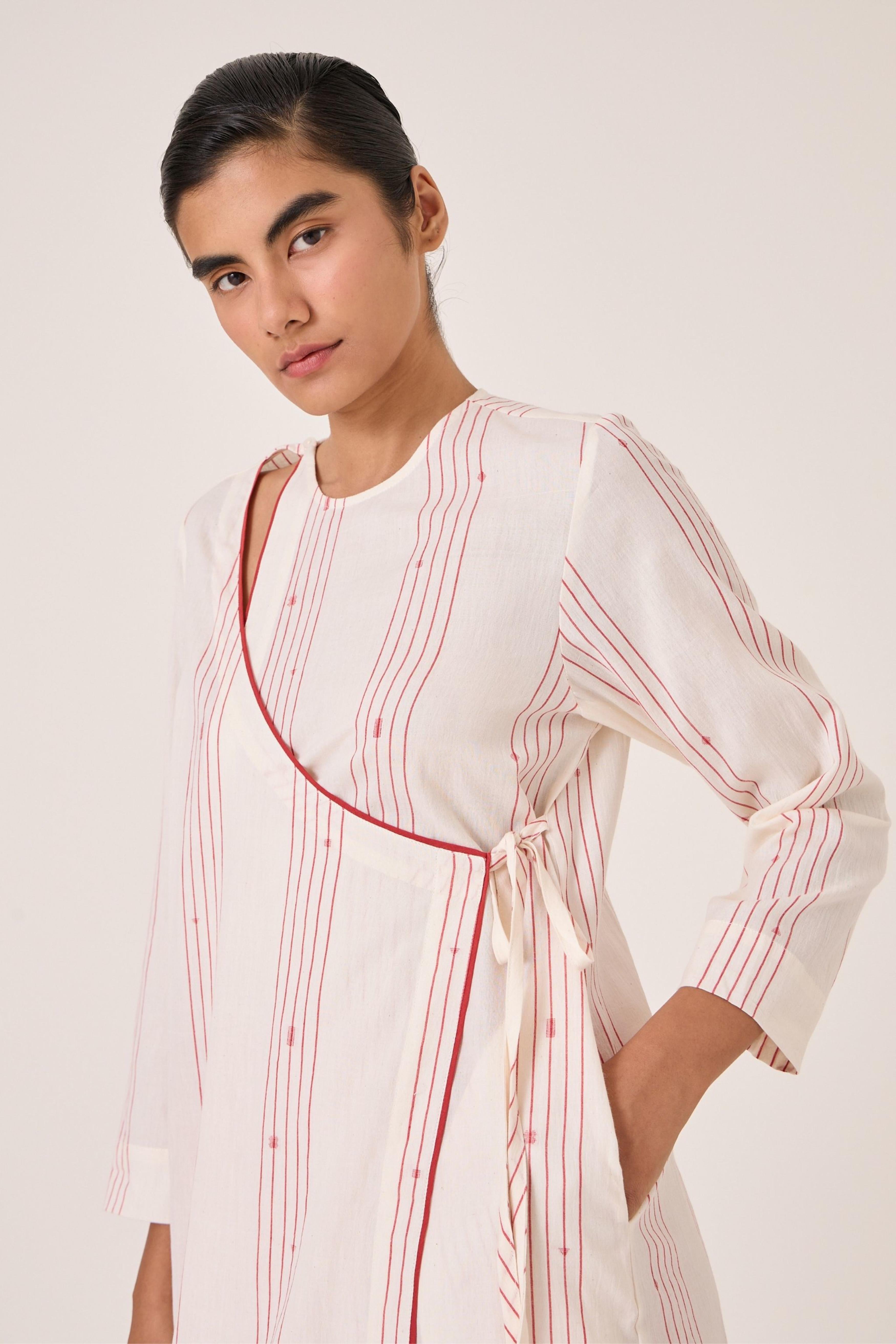Wrap tunic that combines elegance with modern flair, crafted from fine Jamdani cotton. Features piping detail, 3/4th length sleeves and a single loop button fastening on the shoulder.